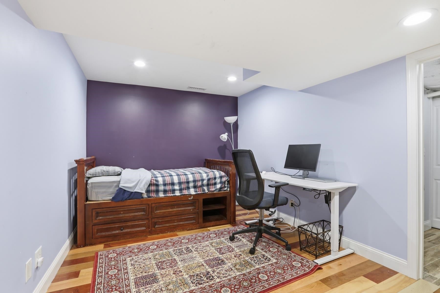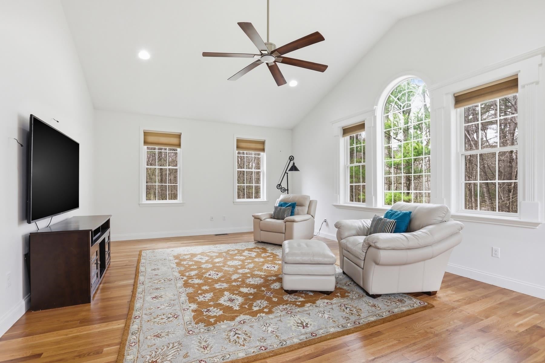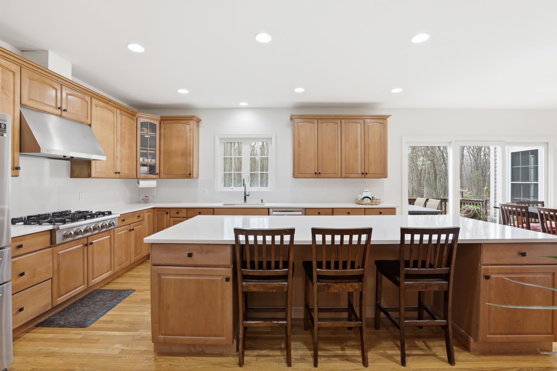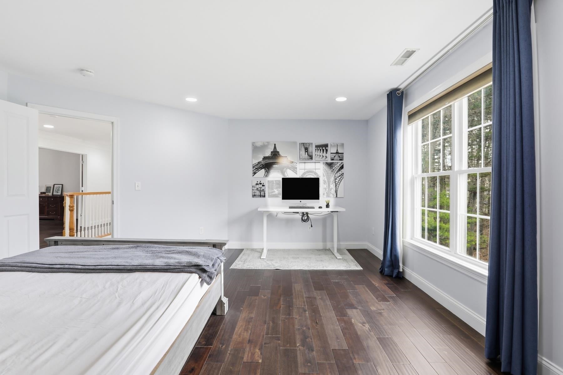 Set back from the main road, this stately Robbins Mill Colonial stands proud on one of the best lots in the neighborhood abutting conservation land and with lawn enough for field sports plus a future pool. A dramatic two-story foyer with an elegant crystal chandelier welcomes you to this open floor plan with flexible spaces. The gourmet kitchen impresses with a large island, quartz countertops and backsplash, and an easy flow into back yard or the family room with its stone fireplace and coffered ceiling. Dedicated entertaining and office space, plus a 1st floor bonus room for work, play or hobbies complete the 1st floor. Upstairs, the primary suite offers generous closet space, a spa-like bath, and sitting area or extra office, plus there are 3 additional bedrooms with ensuite or shared bath. The lower level adds 2,300 SF including a theater room, Bose sound, bath, and potential for a home gym or in-law suite. Fresh paint, updated counters & faucets, plus owned solar panels.