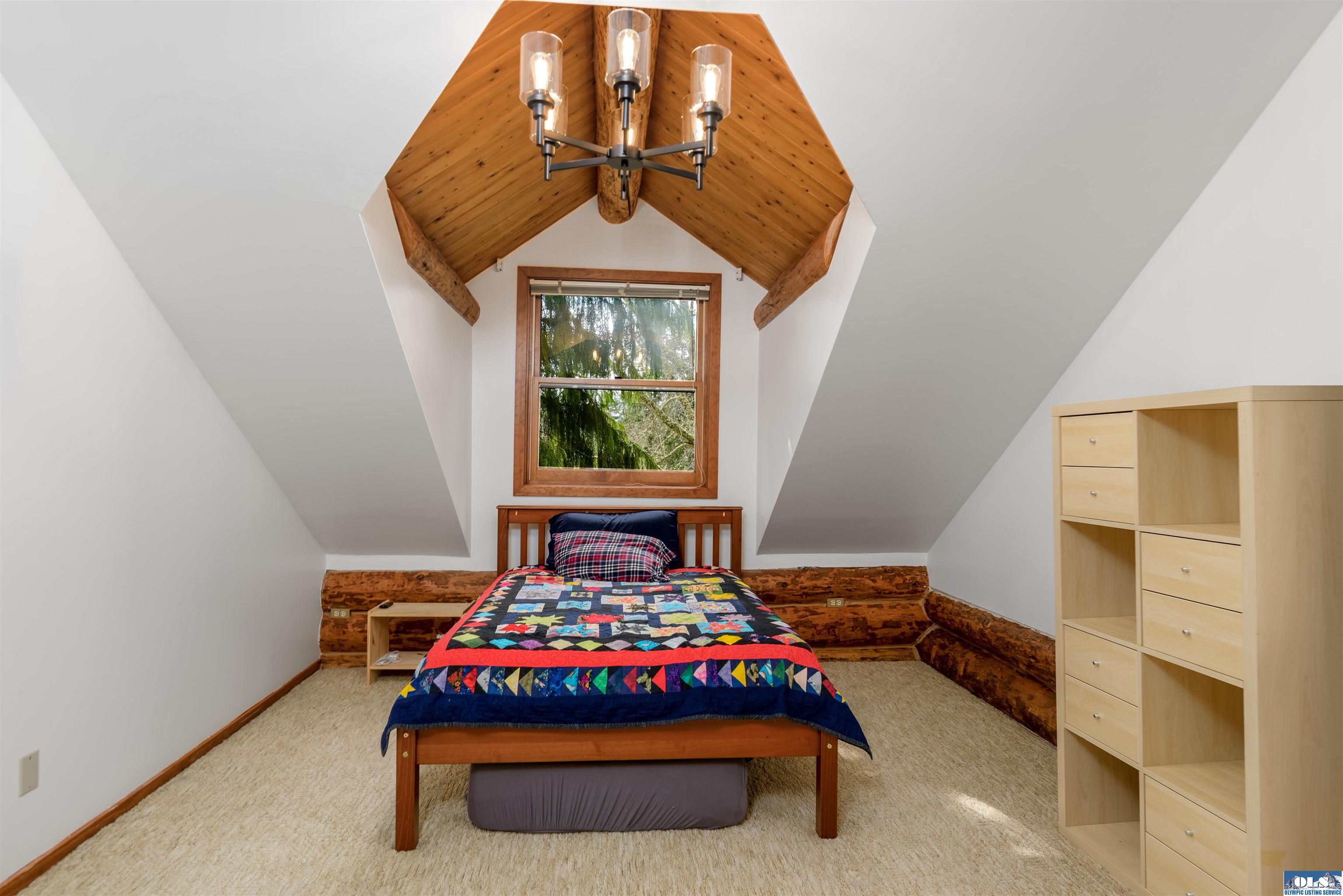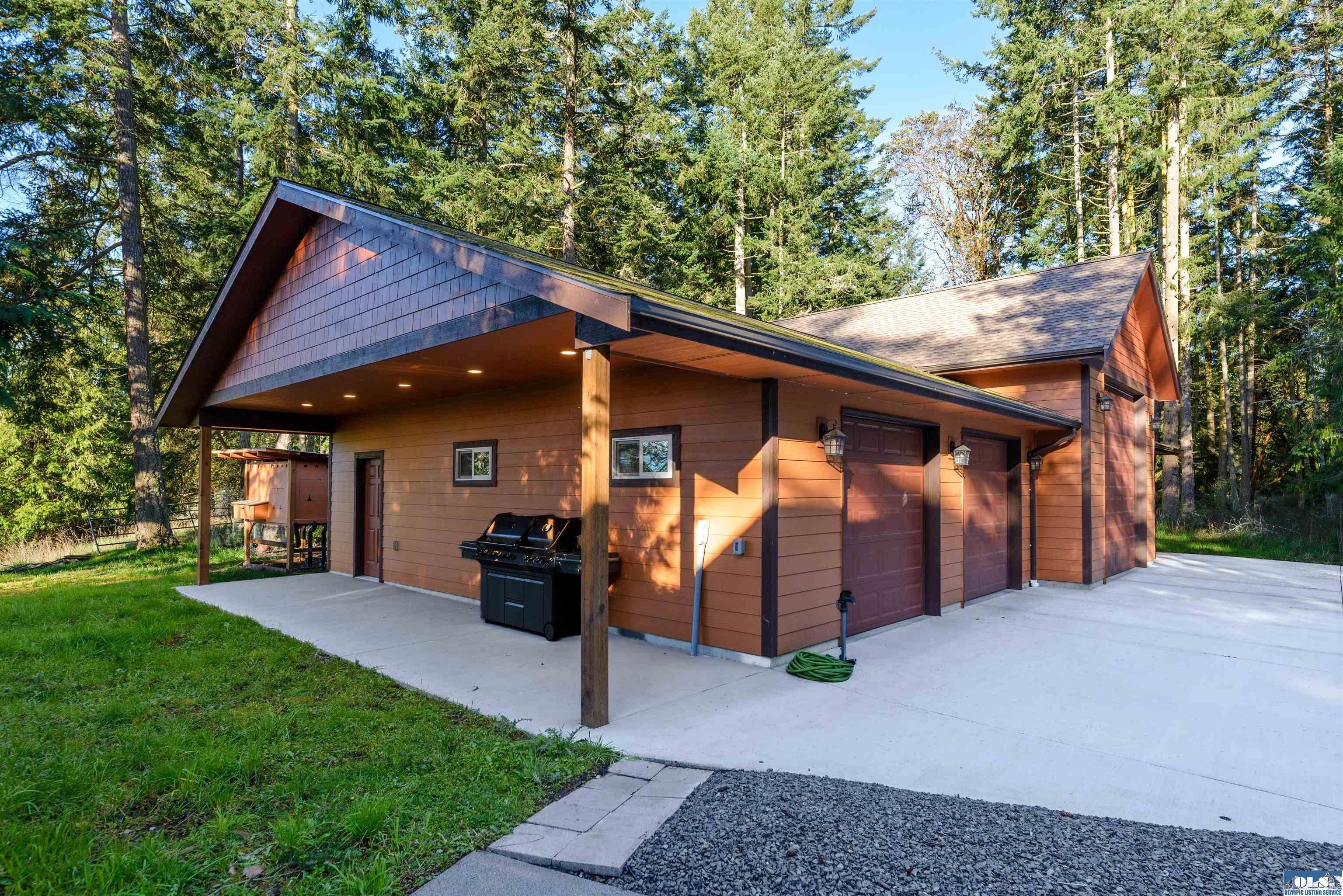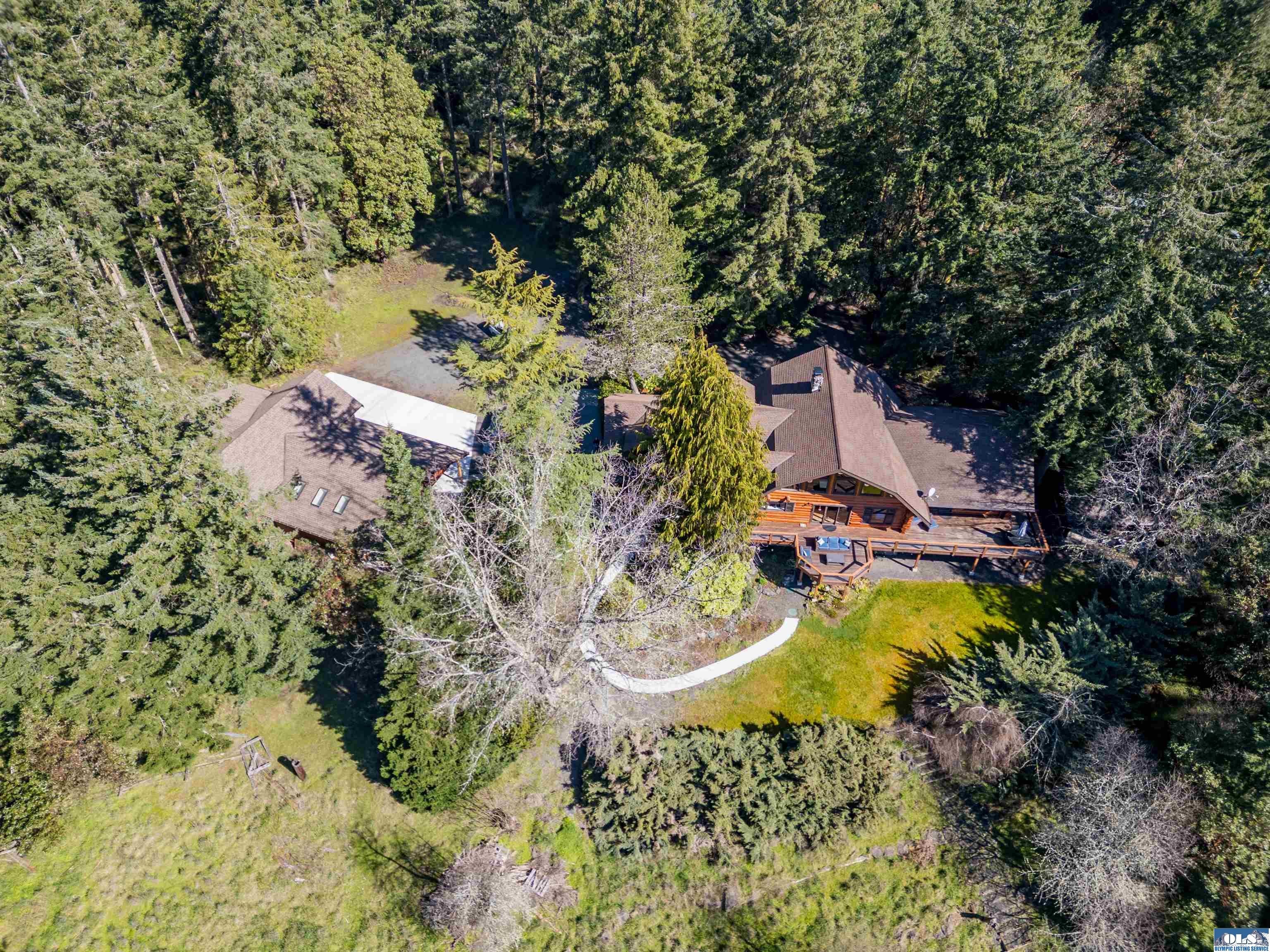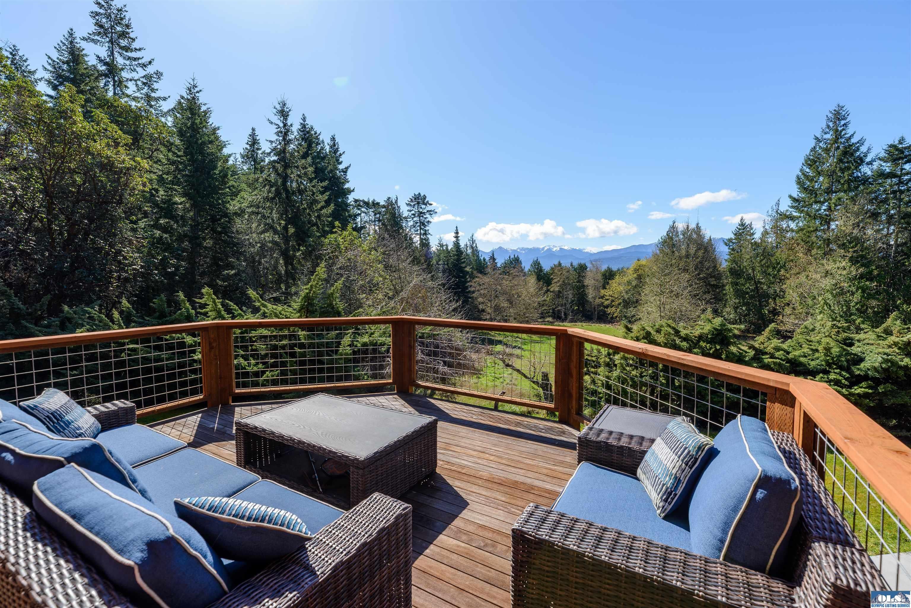 PNW dream property w/gorgeous multi-generational mountain view log home on 5 private acres located in Sequims blue hole. Recently remodeled combining modern luxury and quality with unmatched natural beauty. The original structure is an incredible log home that has been meticulously cared for and was built with a high level of craftsmanship. The recent remodel compliments the natural beauty with a luxurious modern style and convenience that was painstakingly planned and executed. Two brand new kitchens - one for the main home and another for the lower level apartment highlight the exquisite remake of this classic PNW home. The main level features a wall of windows looking out to your own pasture and forest and the Olympic Mountain range beyond. A large living room area with vaulted ceilings, gorgeous logs and woodwork with a door out to a gorgeous deck made of Ipe wood from Brazil that will outlast us all. A stunning new kitchen w/large Quartz island, blue ceramic sink, slate like porcelain floor and new S/S appliances. New woodstove with river rock surround adds to the beauty and warmth. The primary suite is tucked on the east side of the home with a large sitting area which opens to a private covered deck to sit and enjoy the spectacular natural surroundings and views. The primary bath is an absolute dream with porcelain tile floors and shower, cast iron claw foot tub and gorgeous counters. Also on the main level is a handsome office/library off of the entry and laundry room. Upstairs is an airy loft area that has been used as an office and cozy reading space as well as 2 more bedrooms and a full bath. The lower level which is accessed by a curved concrete walkway (or stairs and a lockable door direct from the main level) is a newly remodeled, fully equipped mother-in-law apartment. Enter into a light and bright living room space with views to the back yard and mountains. The new kitchen is spectacular with quartz counters and a bright tile backsplash with all new custom cabinets and new appliances. The new bathroom is again an absolute gem highlighted by a gorgeous tile shower. There are 2 BRs downstairs plus a large craft/game room and plenty of cold storage space. The garage spaces are substantial with an attached 2 car garage (gym equipment can convey) and a newly constructed, 1522 SF, 3 bay RV garage that can accommodate up to 4 more cars. The bigger 3rd bay is 36 feet deep with a 12 foot high door. There are covered carports on either side with concrete pads adding another 788 SF of covered space. Additionally there is a brilliantly constructed chicken coop with a fenced and covered free range area for them to roam. (Can be removed - negotiable). Additionally there is a covered firewood shelter on the east side of the home. Professional Napolean BBQ, sauna and gym equipment are all negotiable. Set in one of the best locations in Sequim just minutes from town, yet at the end of a private road with absolute privacy, mountain views and ample southern exposure. This is a truly special property.