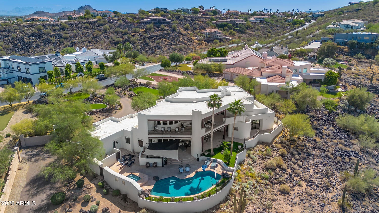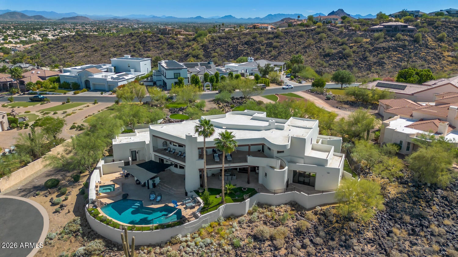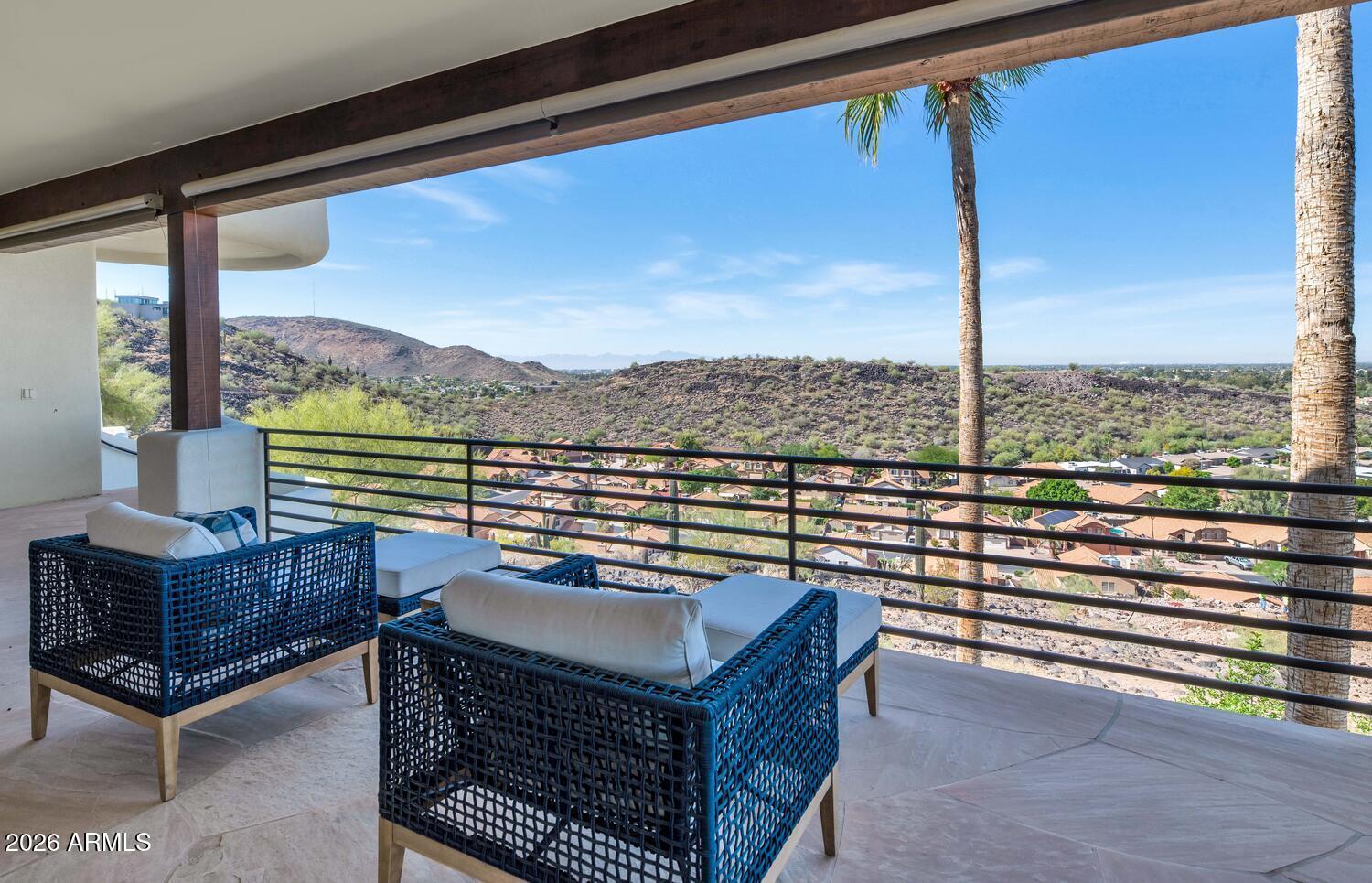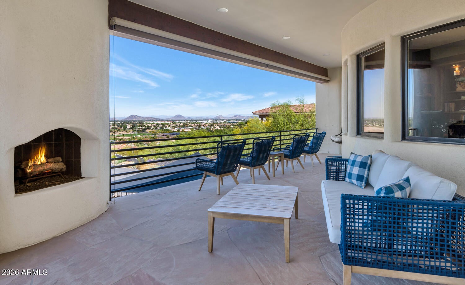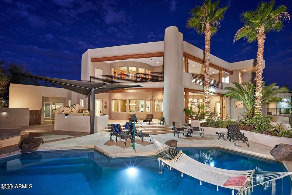Perched high in the guard-gated Coral Gables Estates, this stunning Santa Barbara-style hillside home delivers unforgettable panoramic Valley views, glowing sunsets, and twinkling city lights. Tucked along a winding drive, the home welcomes you with a charming paver courtyard and grand double iron doors that open to a striking rotunda foyer with soaring ceilings. Thoughtfully updated with elegant finishes and soft architectural curves, the downstairs features 3 bedrooms, 4 bathrooms, and a versatile flex room designed as an entertainers dream--complete with surround sound, shiplap walls, and a bar area with fridge and sink, perfect for movie nights. Upstairs, escape to a stunning primary suite along with an additional flex space ideal for a home office, all complemented by an expansive balcony showcasing breathtaking views. Designed for both relaxation and entertaining, enjoy two expansive wraparound covered patios with gas fireplaces overlooking a sparkling pebble-tec pool, spa, BBQ area, and tranquil water feature. Experience elevated Arizona living at its finest. Just minutes from the Moon Valley Country club to enjoy golf, pickleball, tennis and fitness!