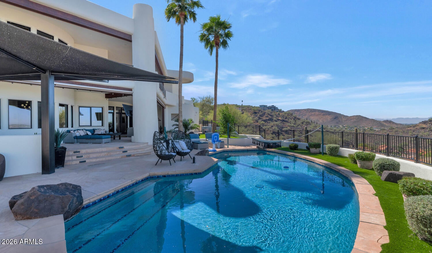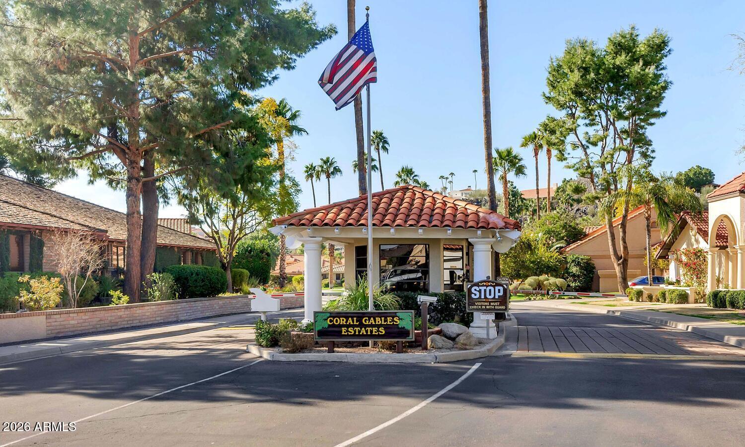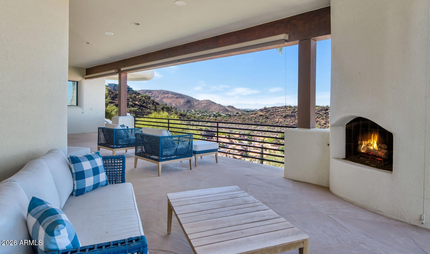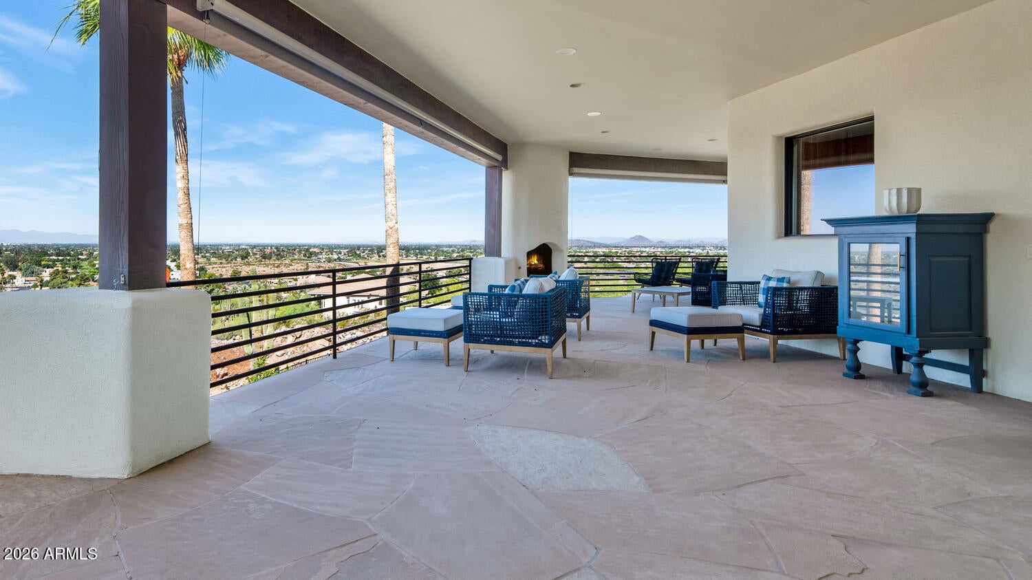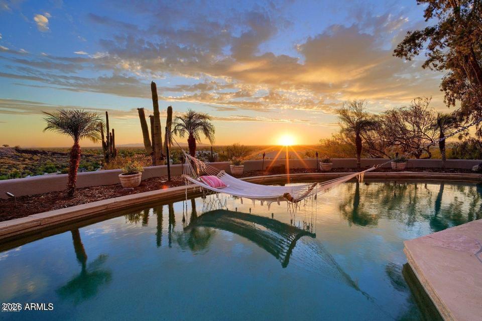 Perched high in the guard-gated Coral Gables Estates, this stunning Santa Barbara-style hillside home delivers unforgettable panoramic Valley views, glowing sunsets, and twinkling city lights. Tucked along a winding drive, the home welcomes you with a charming paver courtyard and grand double iron doors that open to a striking rotunda foyer with soaring ceilings. Thoughtfully updated with elegant finishes and soft architectural curves, the downstairs features 3 bedrooms, 4 bathrooms, and a versatile flex room designed as an entertainers dream--complete with surround sound, shiplap walls, and a bar area with fridge and sink, perfect for movie nights. Upstairs, escape to a stunning primary suite along with an additional flex space ideal for a home office, all complemented by an expansive balcony showcasing breathtaking views. Designed for both relaxation and entertaining, enjoy two expansive wraparound covered patios with gas fireplaces overlooking a sparkling pebble-tec pool, spa, BBQ area, and tranquil water feature. Experience elevated Arizona living at its finest. Just minutes from the Moon Valley Country club to enjoy golf, pickleball, tennis and fitness!