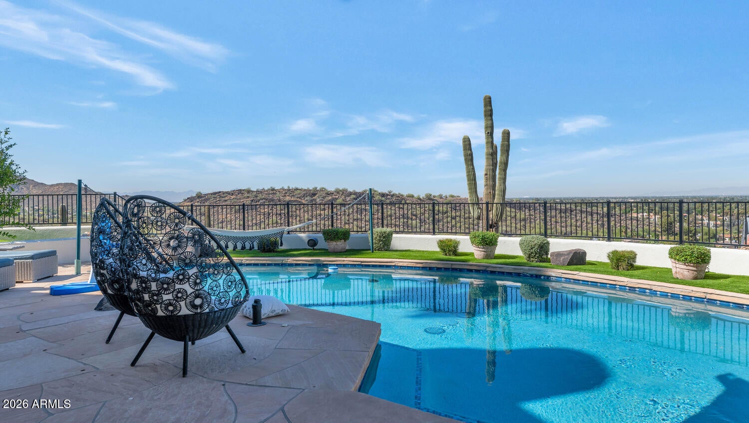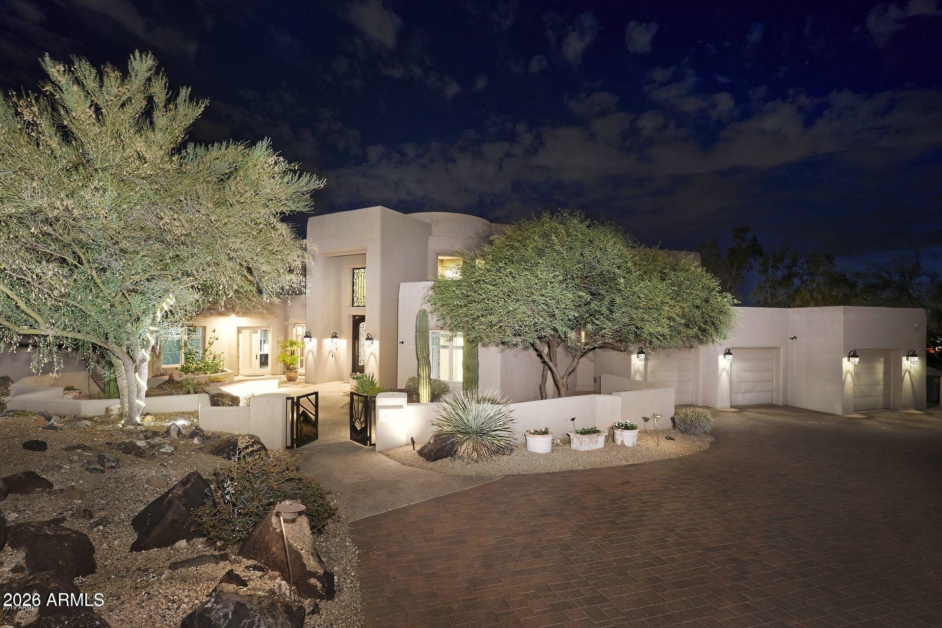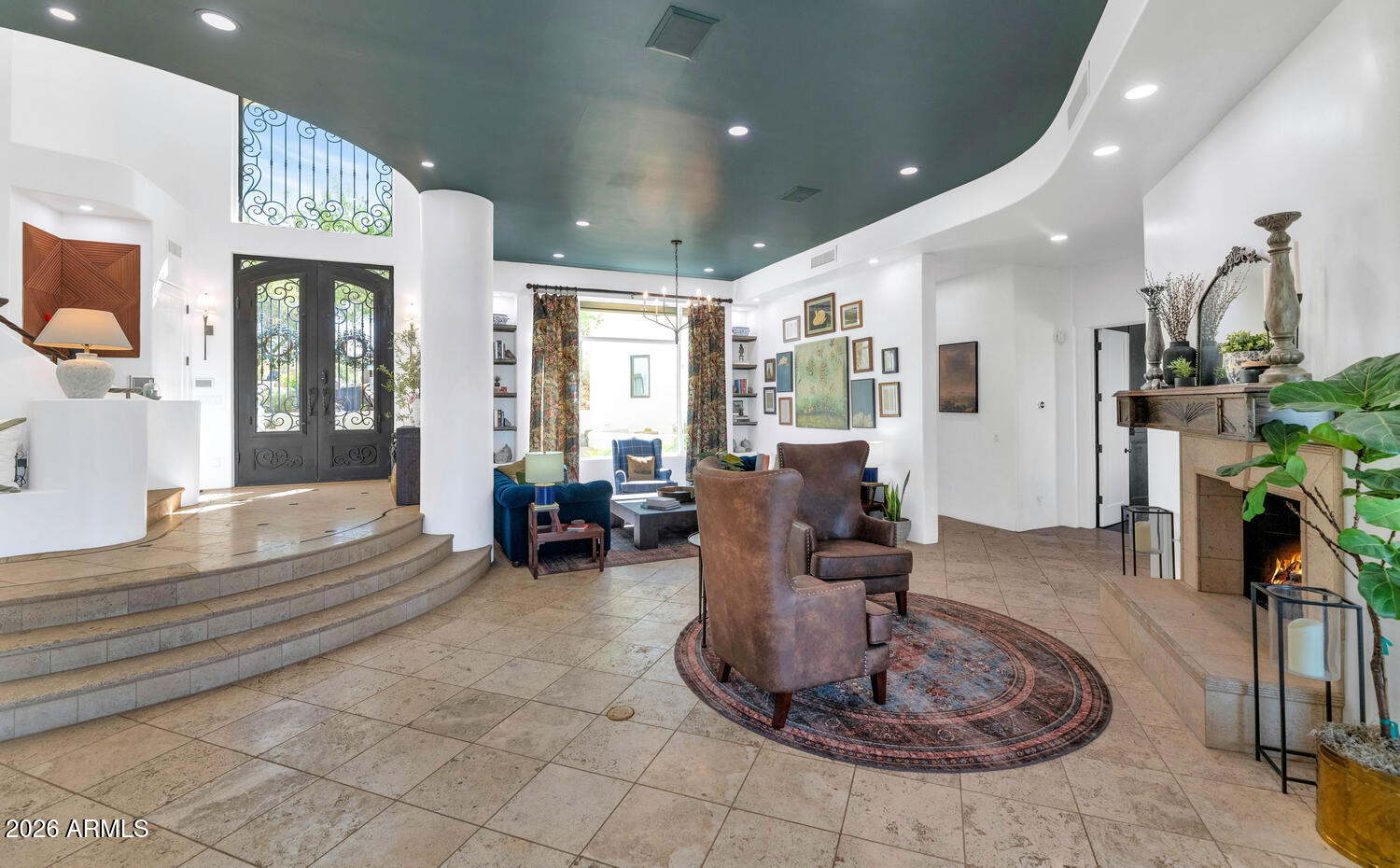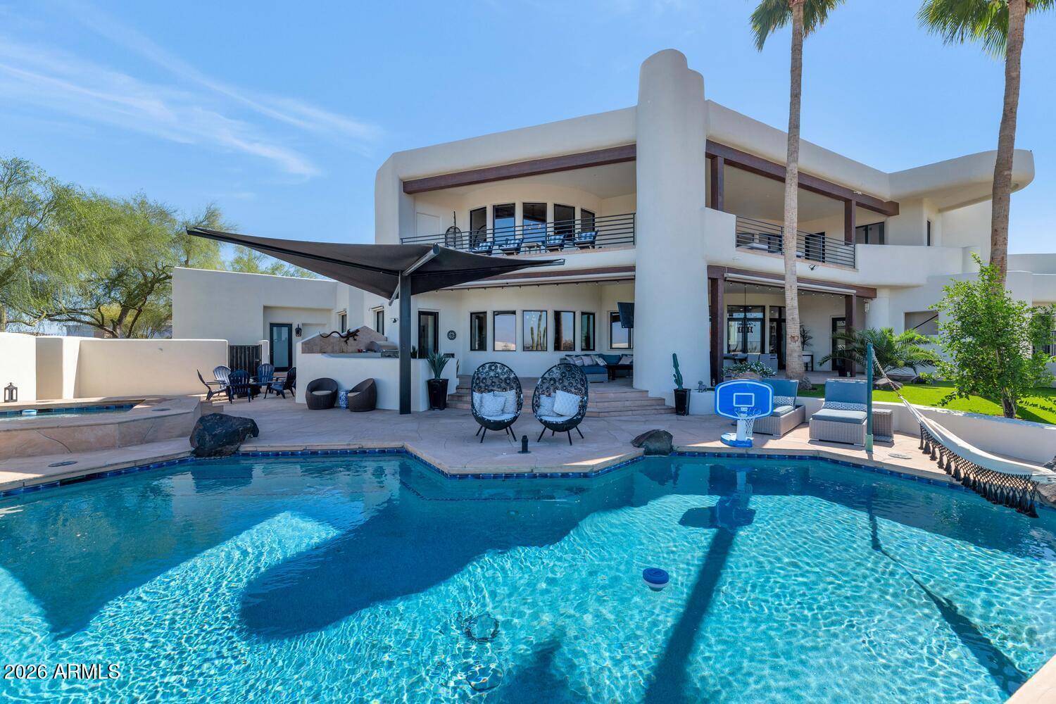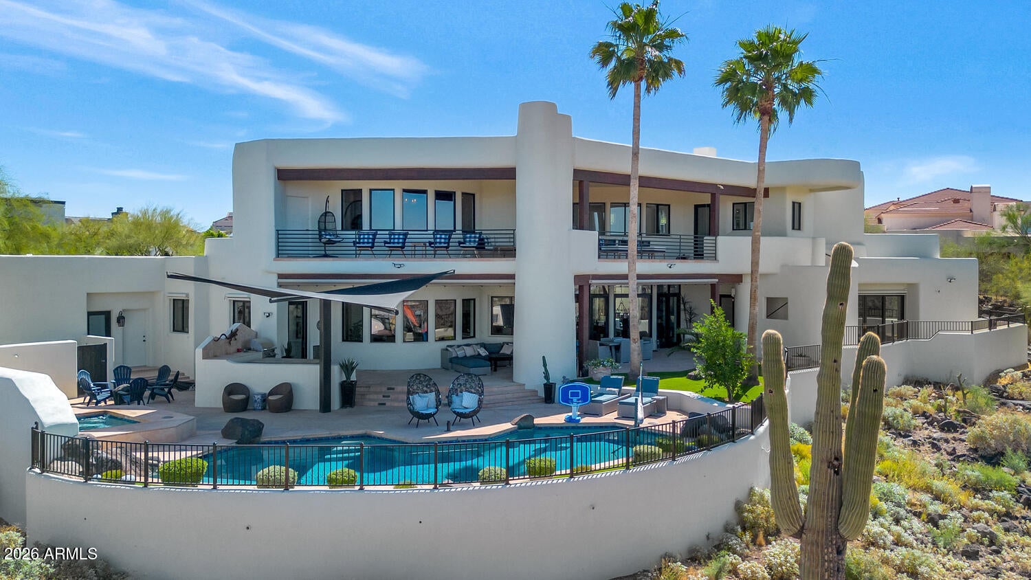 Perched high in the guard-gated Coral Gables Estates, this stunning Santa Barbara-style hillside home delivers unforgettable panoramic Valley views, glowing sunsets, and twinkling city lights. Tucked along a winding drive, the home welcomes you with a charming paver courtyard and grand double iron doors that open to a striking rotunda foyer with soaring ceilings. Thoughtfully updated with elegant finishes and soft architectural curves, the downstairs features 3 bedrooms, 4 bathrooms, and a versatile flex room designed as an entertainers dream--complete with surround sound, shiplap walls, and a bar area with fridge and sink, perfect for movie nights. Upstairs, escape to a stunning primary suite along with an additional flex space ideal for a home office, all complemented by an expansive balcony showcasing breathtaking views. Designed for both relaxation and entertaining, enjoy two expansive wraparound covered patios with gas fireplaces overlooking a sparkling pebble-tec pool, spa, BBQ area, and tranquil water feature. Experience elevated Arizona living at its finest. Just minutes from the Moon Valley Country club to enjoy golf, pickleball, tennis and fitness!
