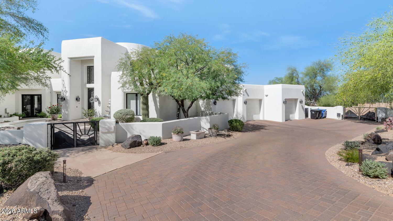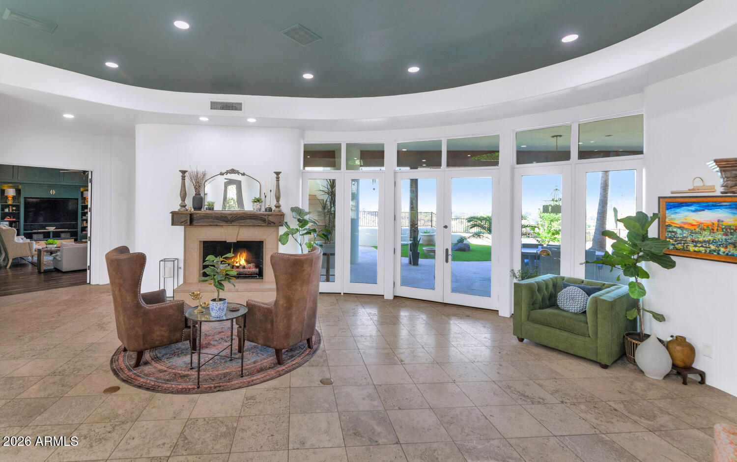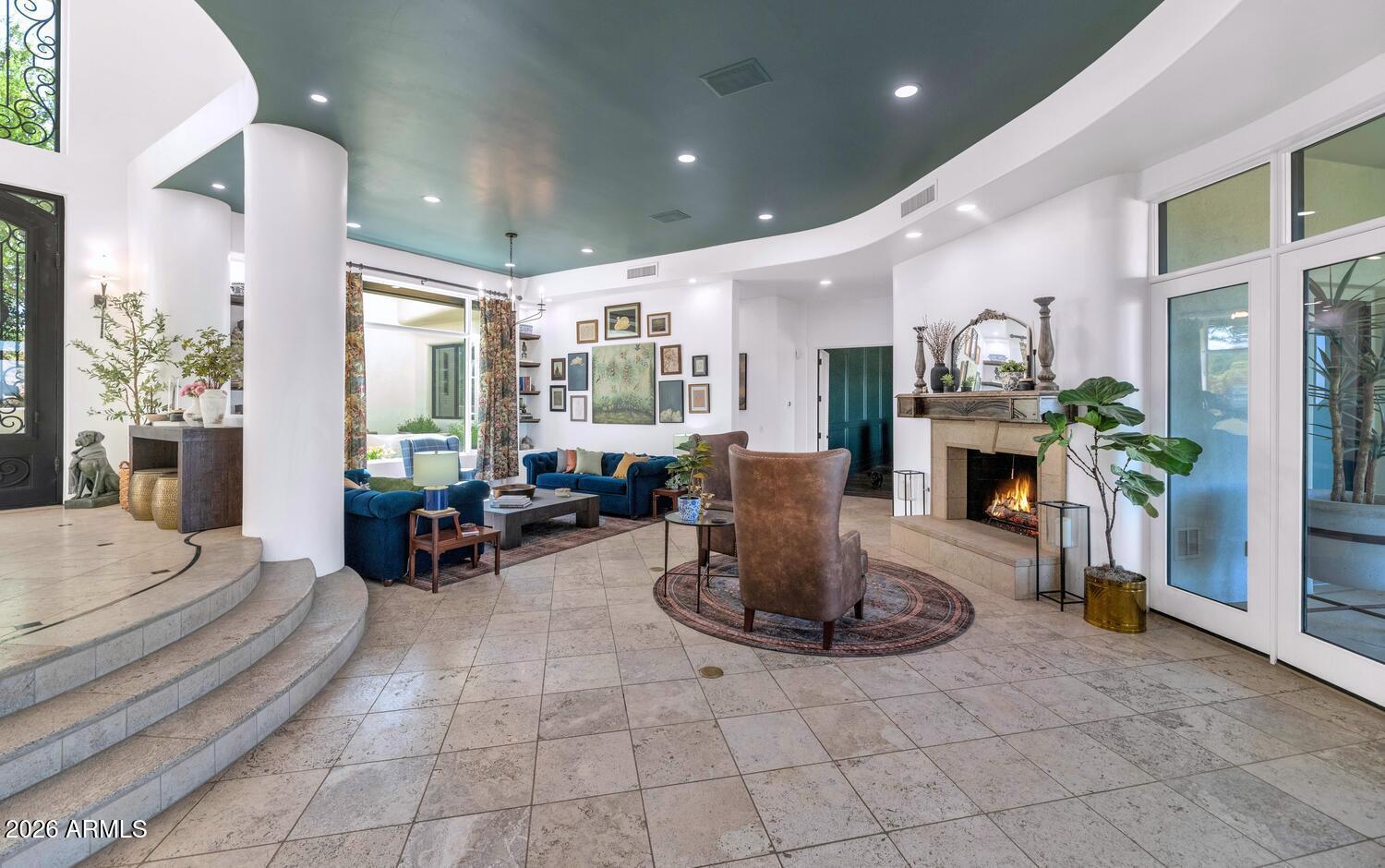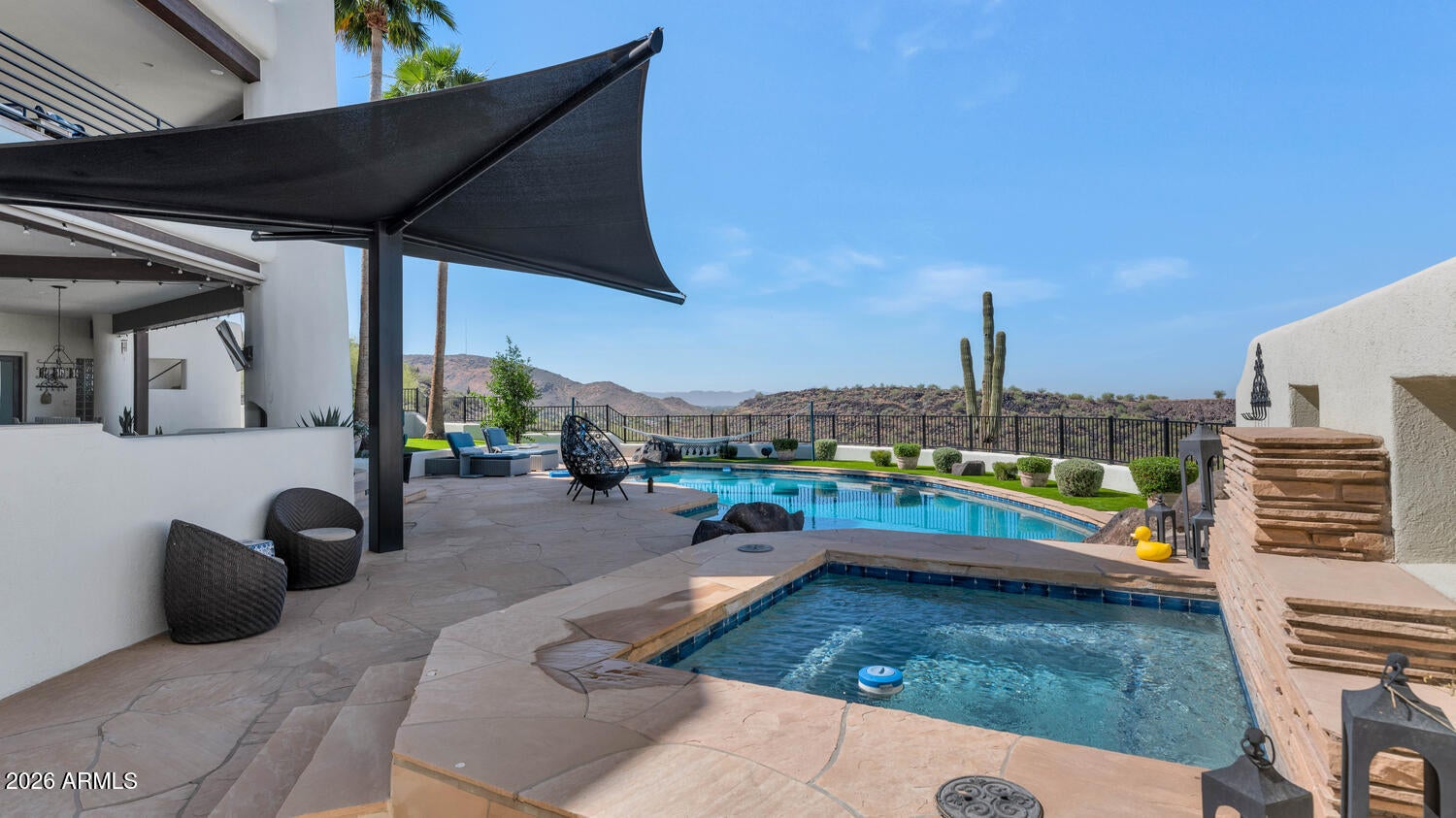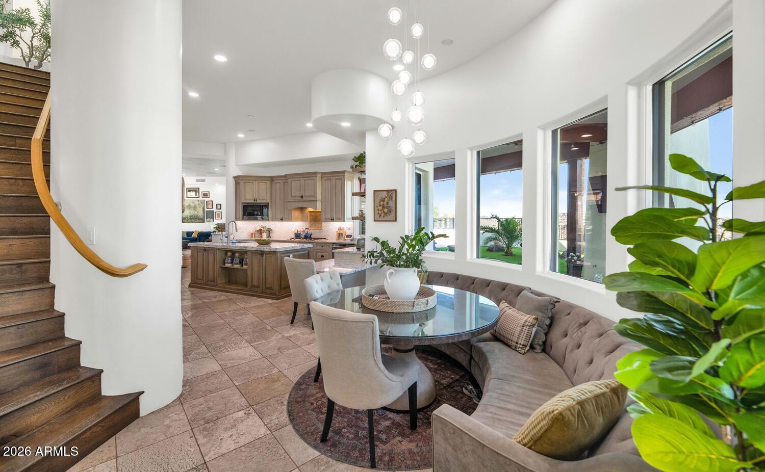 Perched high in the guard-gated Coral Gables Estates, this stunning Santa Barbara-style hillside home delivers unforgettable panoramic Valley views, glowing sunsets, and twinkling city lights. Tucked along a winding drive, the home welcomes you with a charming paver courtyard and grand double iron doors that open to a striking rotunda foyer with soaring ceilings. Thoughtfully updated with elegant finishes and soft architectural curves, the downstairs features 3 bedrooms, 4 bathrooms, and a versatile flex room designed as an entertainers dream--complete with surround sound, shiplap walls, and a bar area with fridge and sink, perfect for movie nights. Upstairs, escape to a stunning primary suite along with an additional flex space ideal for a home office, all complemented by an expansive balcony showcasing breathtaking views. Designed for both relaxation and entertaining, enjoy two expansive wraparound covered patios with gas fireplaces overlooking a sparkling pebble-tec pool, spa, BBQ area, and tranquil water feature. Experience elevated Arizona living at its finest. Just minutes from the Moon Valley Country club to enjoy golf, pickleball, tennis and fitness!