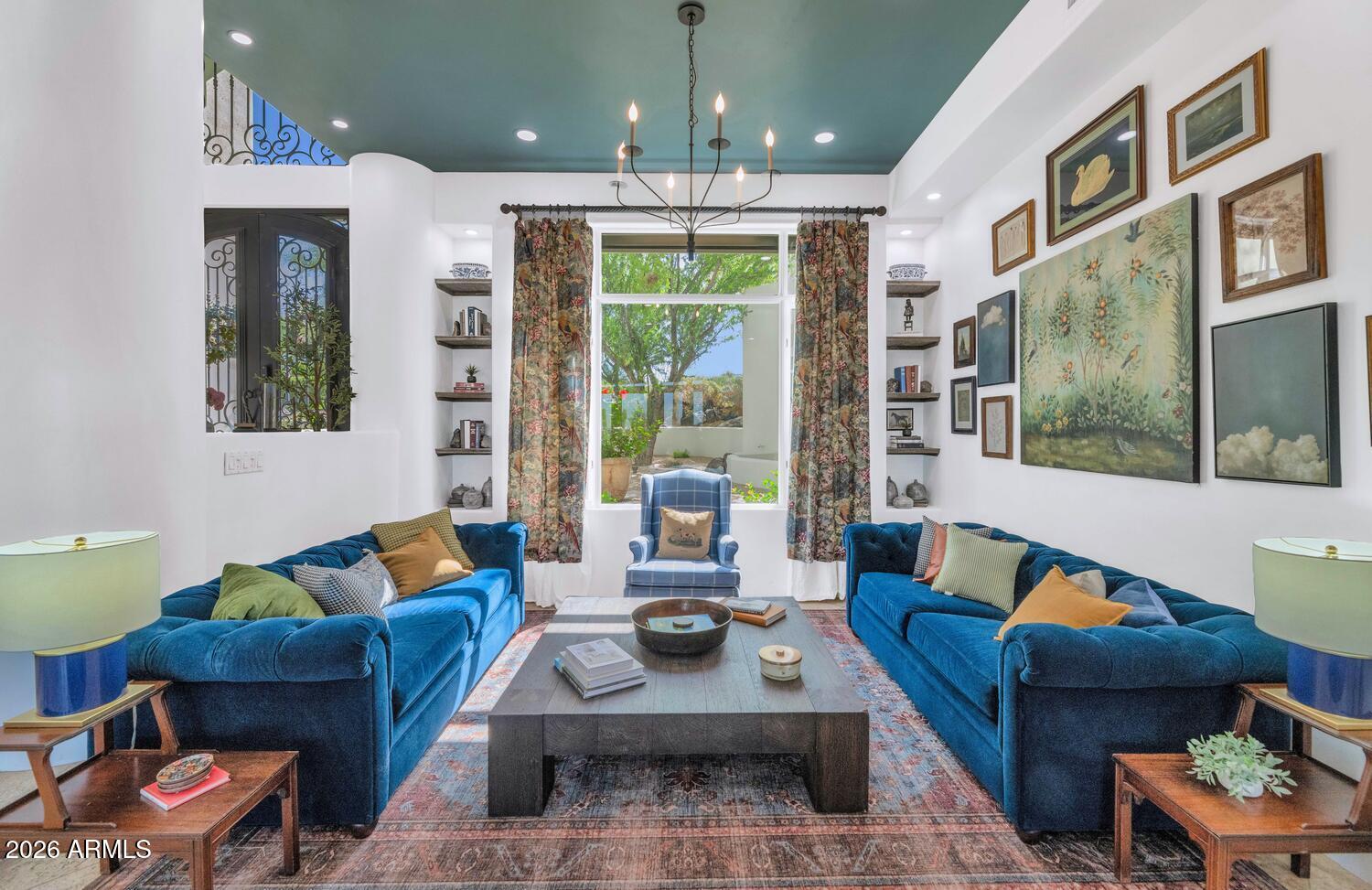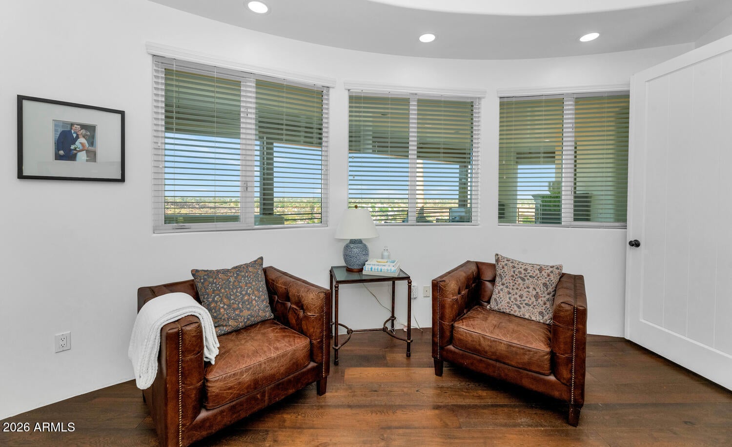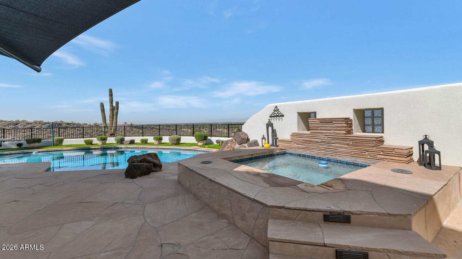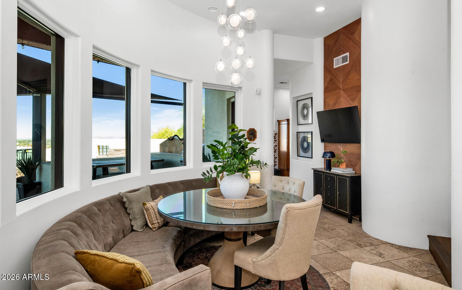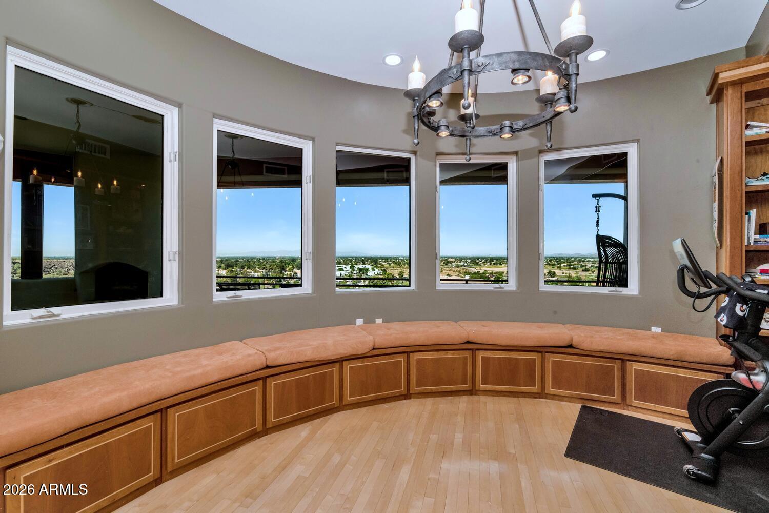 Perched high in the guard-gated Coral Gables Estates, this stunning Santa Barbara-style hillside home delivers unforgettable panoramic Valley views, glowing sunsets, and twinkling city lights. Tucked along a winding drive, the home welcomes you with a charming paver courtyard and grand double iron doors that open to a striking rotunda foyer with soaring ceilings. Thoughtfully updated with elegant finishes and soft architectural curves, the downstairs features 3 bedrooms, 4 bathrooms, and a versatile flex room designed as an entertainers dream--complete with surround sound, shiplap walls, and a bar area with fridge and sink, perfect for movie nights. Upstairs, escape to a stunning primary suite along with an additional flex space ideal for a home office, all complemented by an expansive balcony showcasing breathtaking views. Designed for both relaxation and entertaining, enjoy two expansive wraparound covered patios with gas fireplaces overlooking a sparkling pebble-tec pool, spa, BBQ area, and tranquil water feature. Experience elevated Arizona living at its finest. Just minutes from the Moon Valley Country club to enjoy golf, pickleball, tennis and fitness!