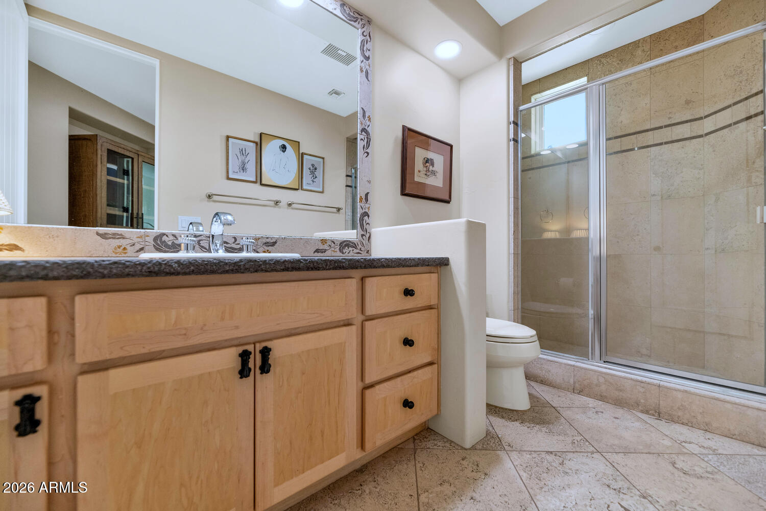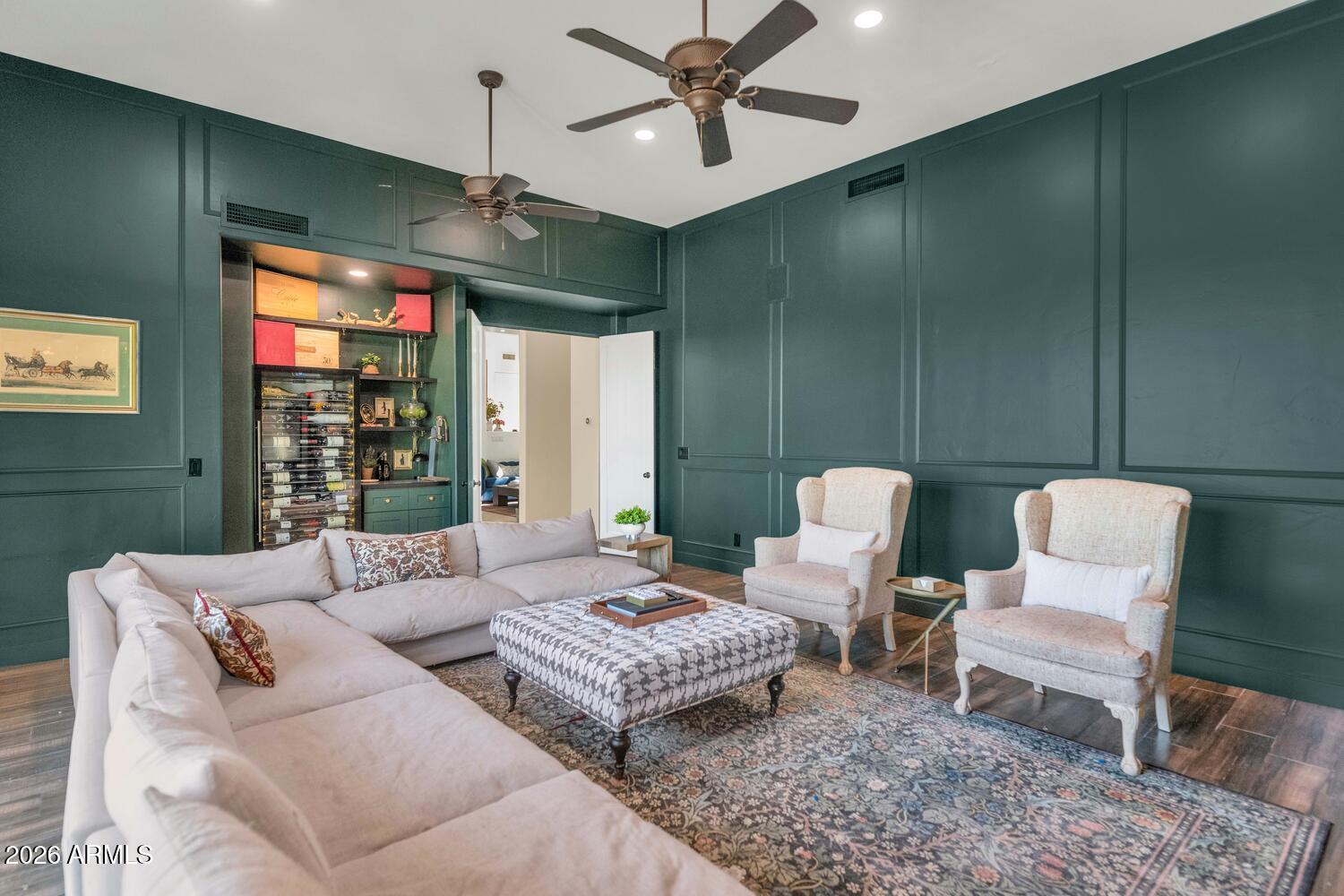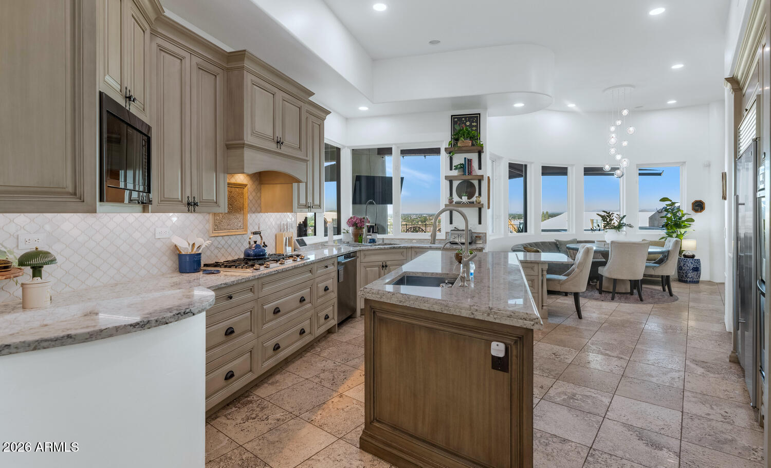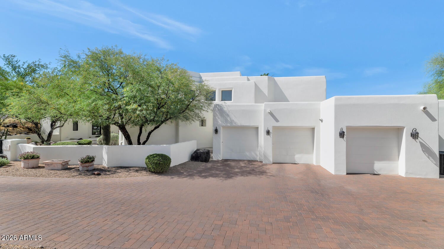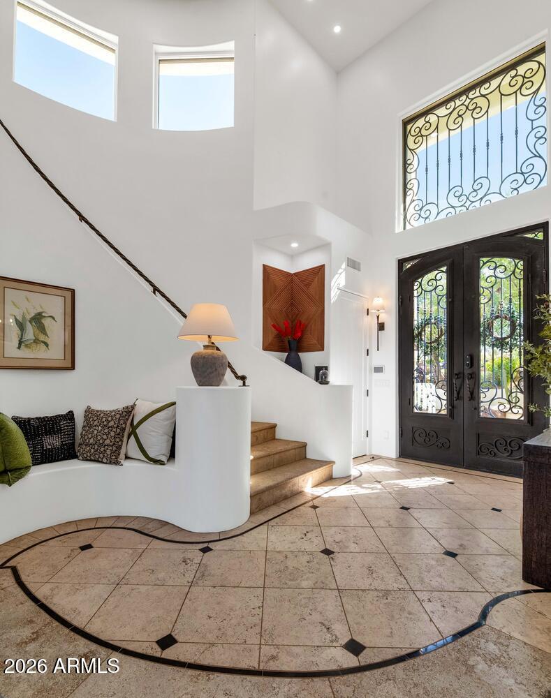 Perched high in the guard-gated Coral Gables Estates, this stunning Santa Barbara-style hillside home delivers unforgettable panoramic Valley views, glowing sunsets, and twinkling city lights. Tucked along a winding drive, the home welcomes you with a charming paver courtyard and grand double iron doors that open to a striking rotunda foyer with soaring ceilings. Thoughtfully updated with elegant finishes and soft architectural curves, the downstairs features 3 bedrooms, 4 bathrooms, and a versatile flex room designed as an entertainers dream--complete with surround sound, shiplap walls, and a bar area with fridge and sink, perfect for movie nights. Upstairs, escape to a stunning primary suite along with an additional flex space ideal for a home office, all complemented by an expansive balcony showcasing breathtaking views. Designed for both relaxation and entertaining, enjoy two expansive wraparound covered patios with gas fireplaces overlooking a sparkling pebble-tec pool, spa, BBQ area, and tranquil water feature. Experience elevated Arizona living at its finest. Just minutes from the Moon Valley Country club to enjoy golf, pickleball, tennis and fitness!