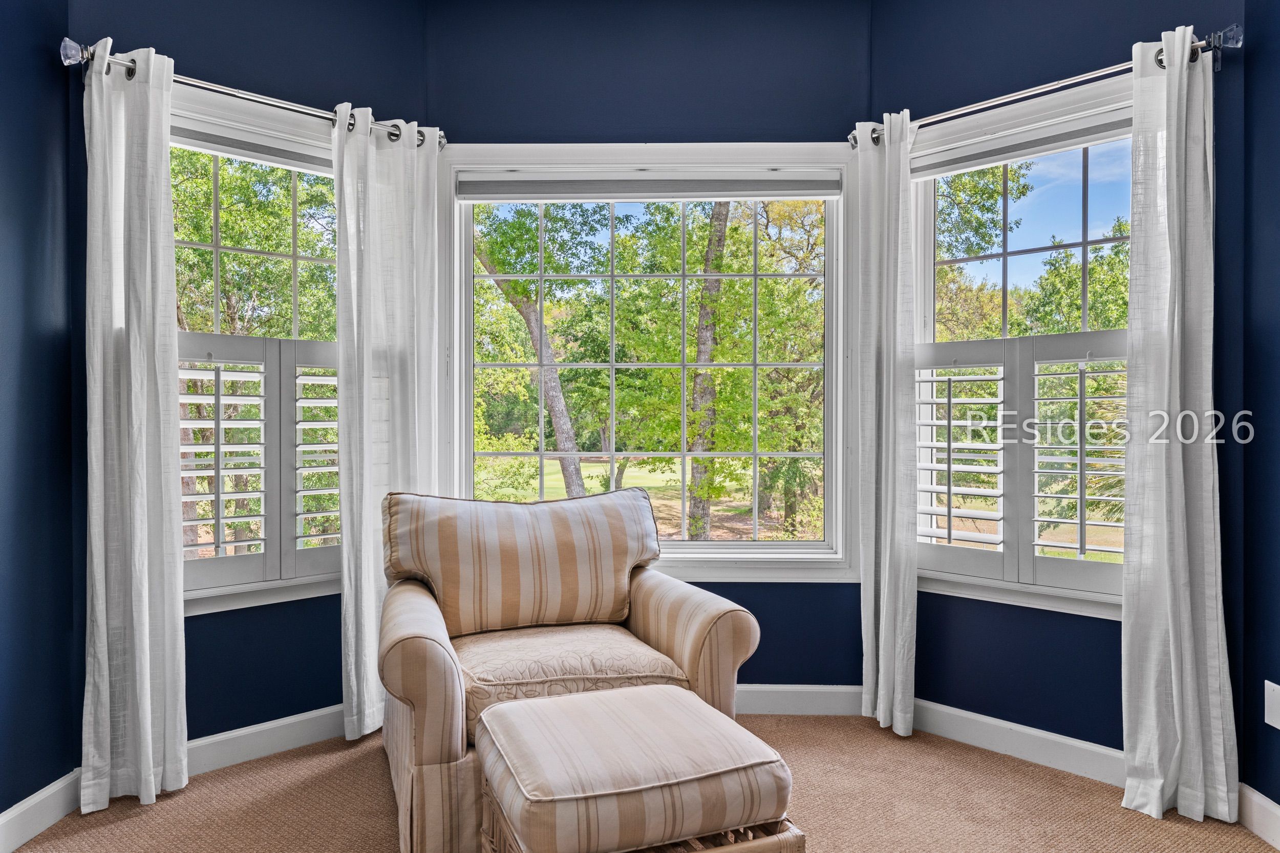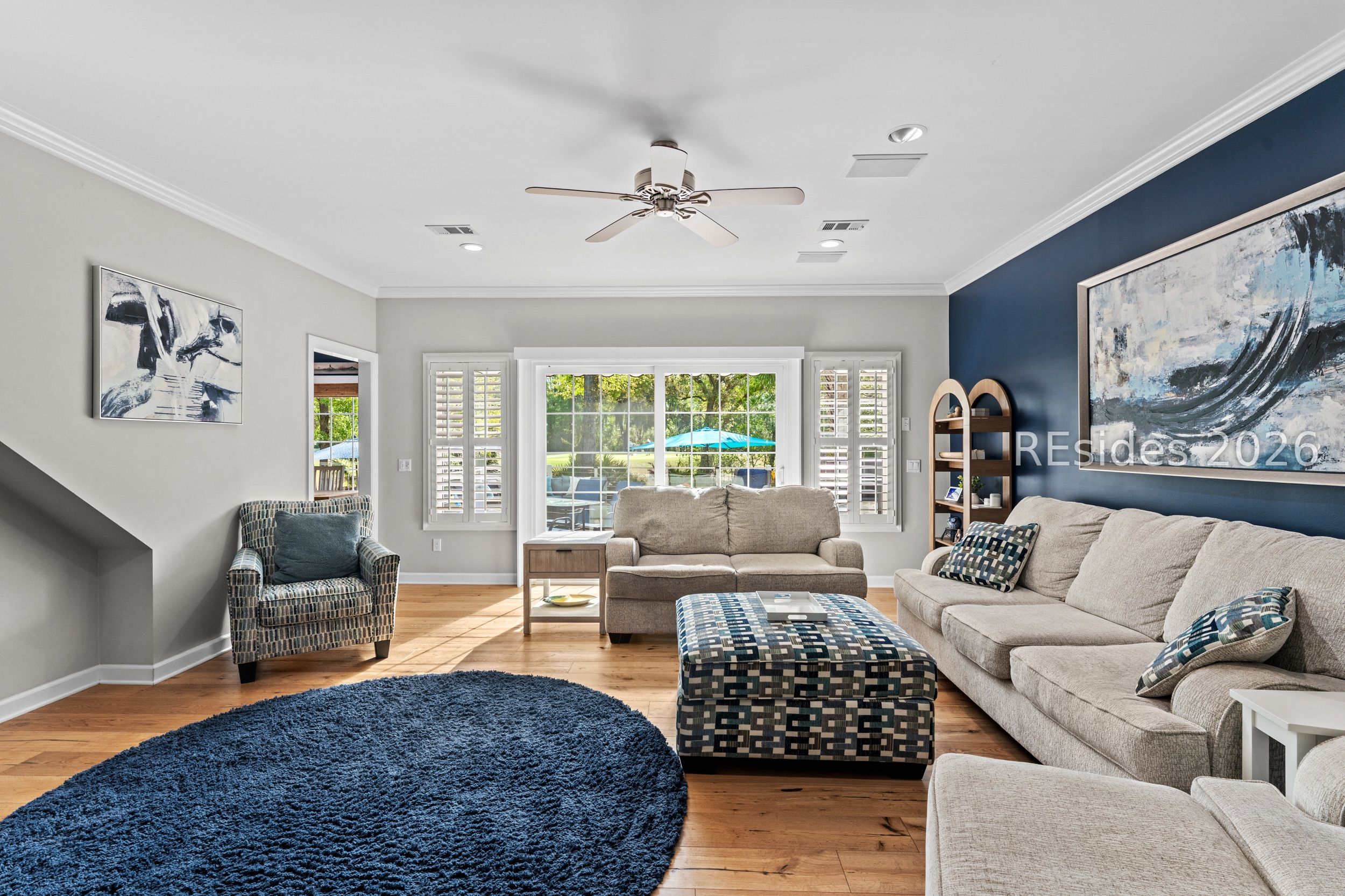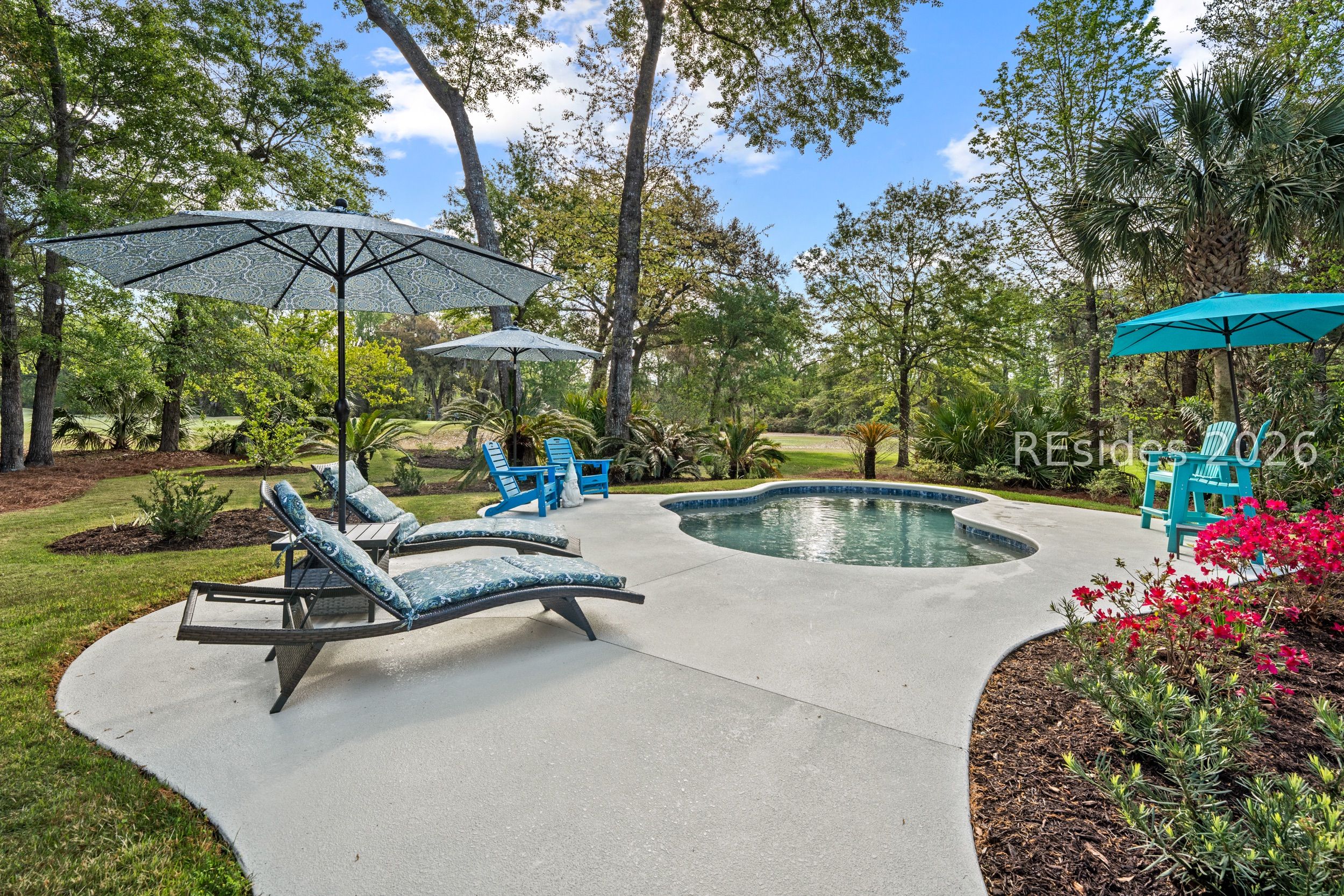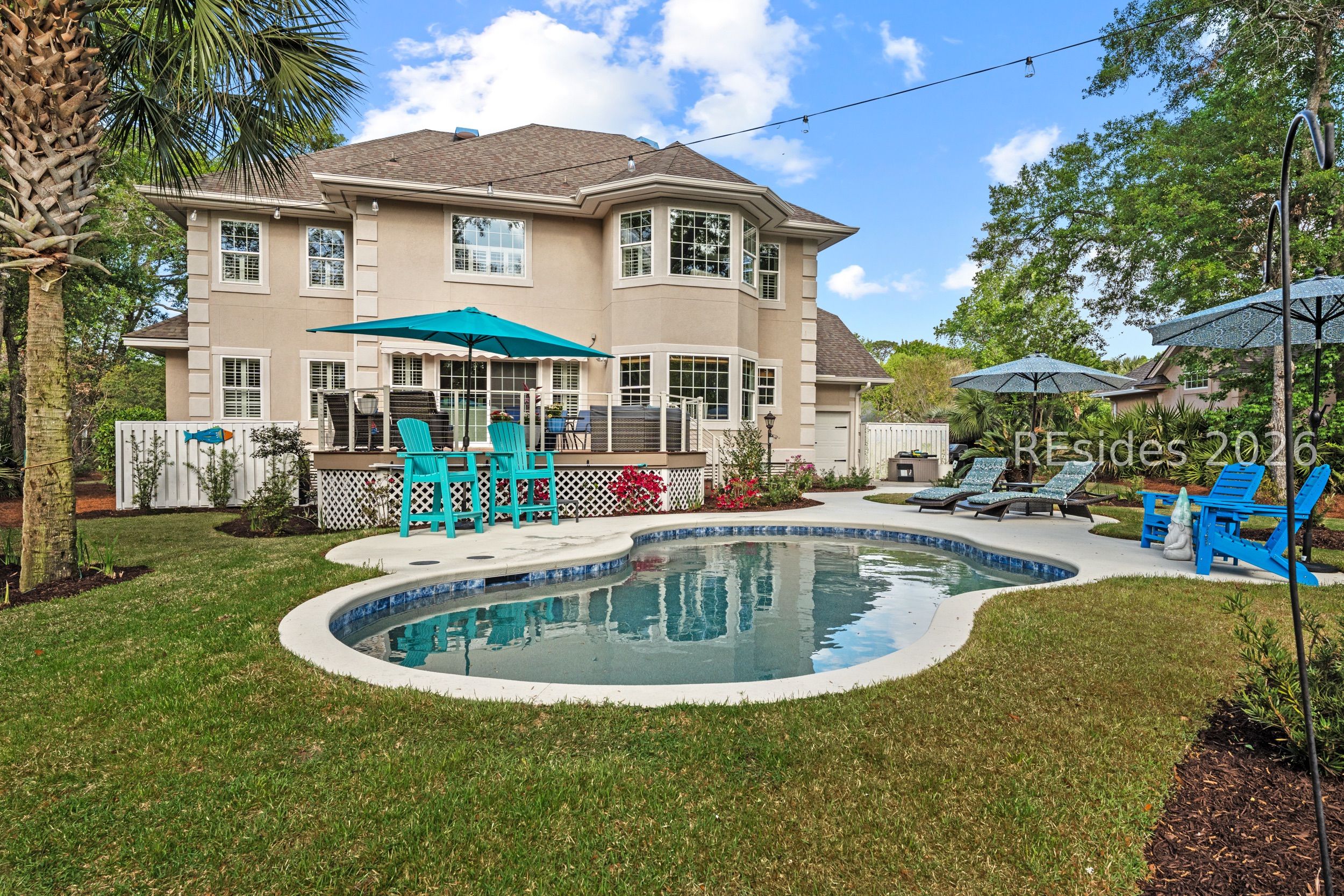 Set on a large, beautifully landscaped lot with a unique circular drive offering ample parking, this stunning Hilton Head Island home is perfectly positioned near the 7th green of the Arthur Hills Course in the sought-after Palmetto Hall community-now featuring a newly revamped clubhouse. This exceptional property offers serene golf course vistas alongside views of your own private pool, perfectly blending thoughtful upgrades with effortless Lowcountry living. The backyard is a true retreat, showcasing lush, professional landscaping and a stunning new pool completed in late 2024-ideal for relaxing or entertaining while overlooking the course. A motorized shaded awning enhances the patio, creating a comfortable outdoor living space year-round. Inside, the home features five spacious bedrooms and four full baths, with a layout designed for both functionality and comfort. The large living room provides a warm and inviting gathering space, while a generous bonus/flex room upstairs offers endless possibilities as a media room, playroom, or additional living area. The primary suite is well-sized and inviting, complemented by abundant storage throughout, including attic access via a permanent staircase. Recent updates include two refreshed upstairs bathrooms, adding a modern touch. Additional highlights include a two-car garage plus a dedicated golf cart bay, along with an EV charger