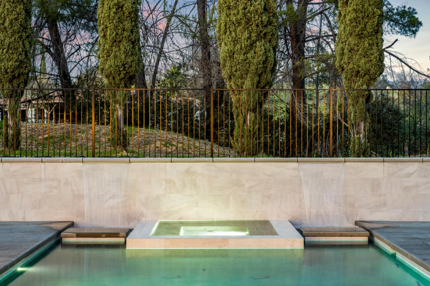 Perched high in the guard-gated Coral Gables Estates, this stunning Santa Barbara-style hillside home delivers unforgettable panoramic Valley views, glowing sunsets, and twinkling city lights. Tucked along a winding drive, the home welcomes you with a charming paver courtyard and grand double iron doors that open to a striking rotunda foyer with soaring ceilings.