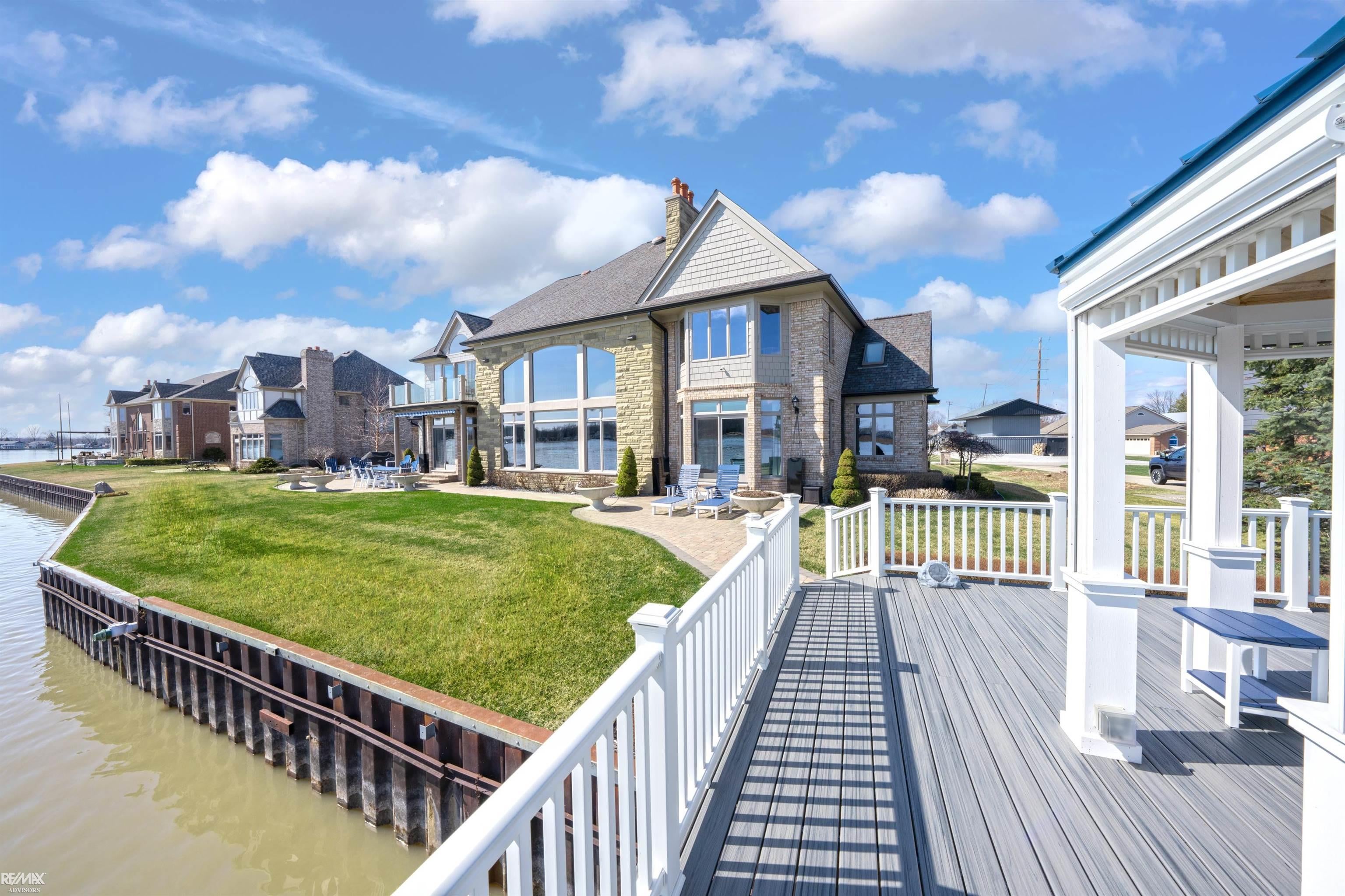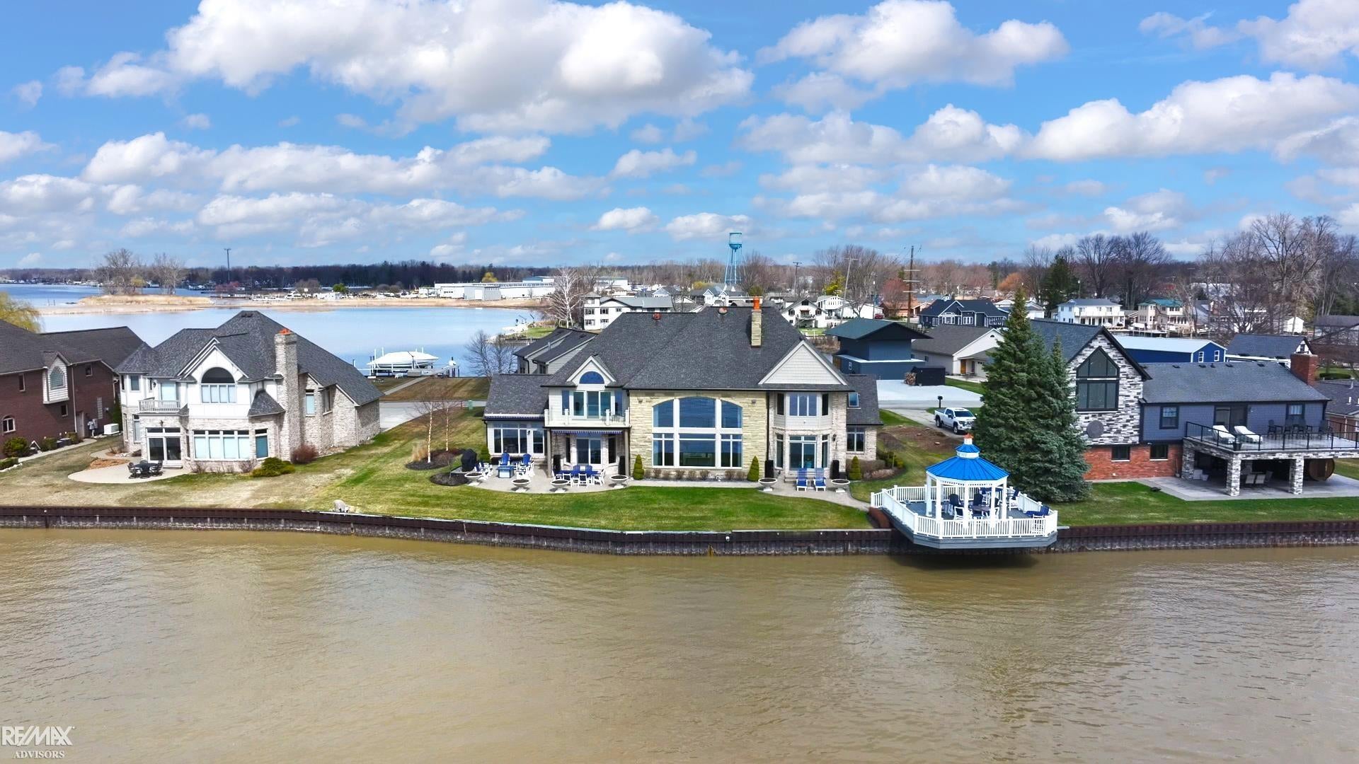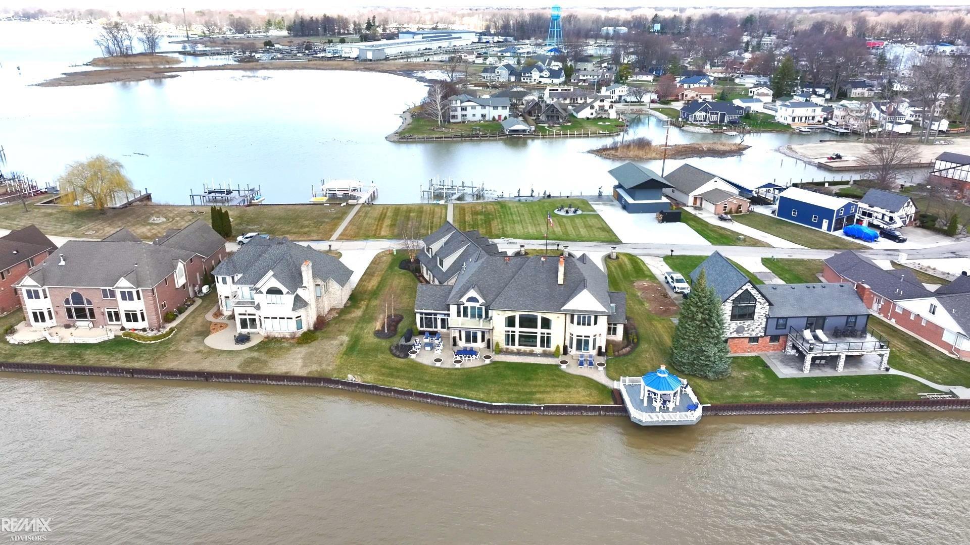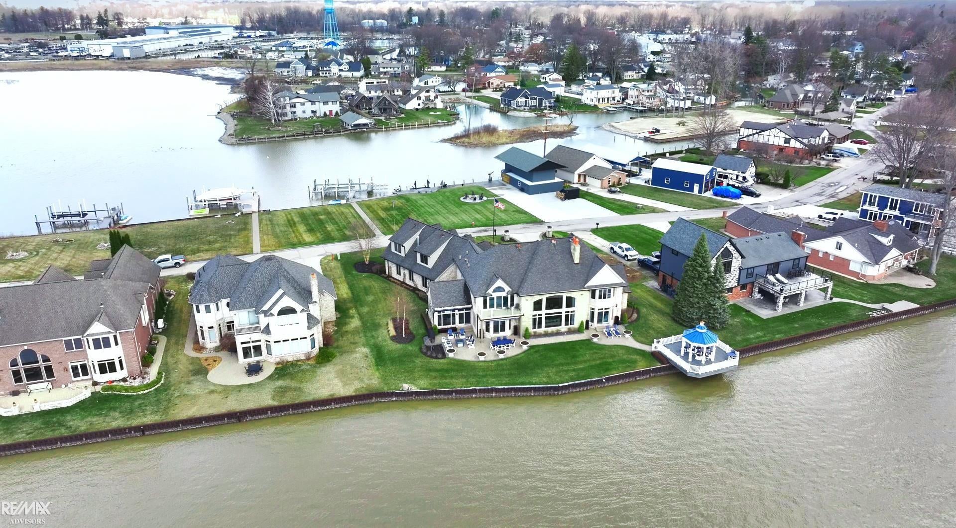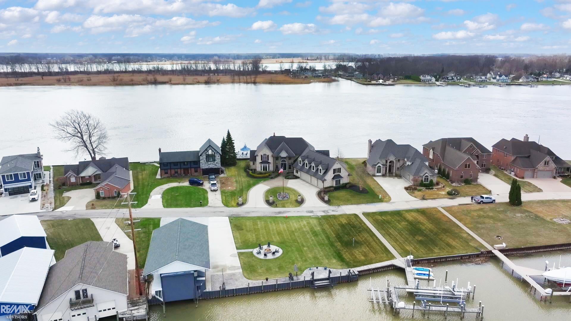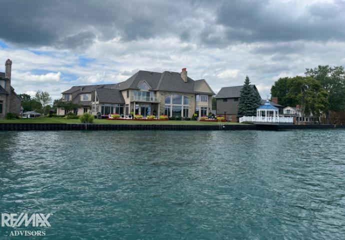 Welcome to an extraordinary waterfront peninsula estate on the North Channel of the St. Clair River in Algonac. Set on nearly an acre and surrounded by panoramic water on multiple sides, this rare property offers breathtaking sunrise and sunset views in every direction-creating a truly one-of-a-kind setting where water, sky, and light come together. This expansive, remodeled home offers approximately 6,700 sq ft of living space with 4 bedrooms and 4 bathrooms, designed for both everyday comfort and luxury entertaining. The open layout is complemented by large windows that capture stunning water views throughout the home. Outdoor living is unmatched, featuring a gazebo extending over the rivers edge-perfect for morning coffee or evening cocktails while enjoying passing boats, sailboats, and freighters along the channel. The property includes approximately 134 feet of North Channel/St. Clair River frontage plus an additional approximately 120 feet of protected harbor frontage, offering ideal conditions for boating enthusiasts. Boating features include steel seawalls on both the river and boat-well sides, multiple boat wells, and hoists accommodating vessels up to approximately 40 feet, along with a tri-toon hoist and additional well space. Whether for leisure or serious boating, this property is fully equipped. Additional highlights include a 4-car heated garage, extensive landscaping with custom architectural cement planters, and retractable awnings enhancing the outdoor patio space. Located in a desirable waterfront community, this property offers a rare combination of privacy, space, and access to open water, all within close proximity to local amenities, marinas, and dining. This is a unique opportunity to own one of the most distinctive waterfront properties on the North Channel. Some measurements and details are approximate and should be independently verified.