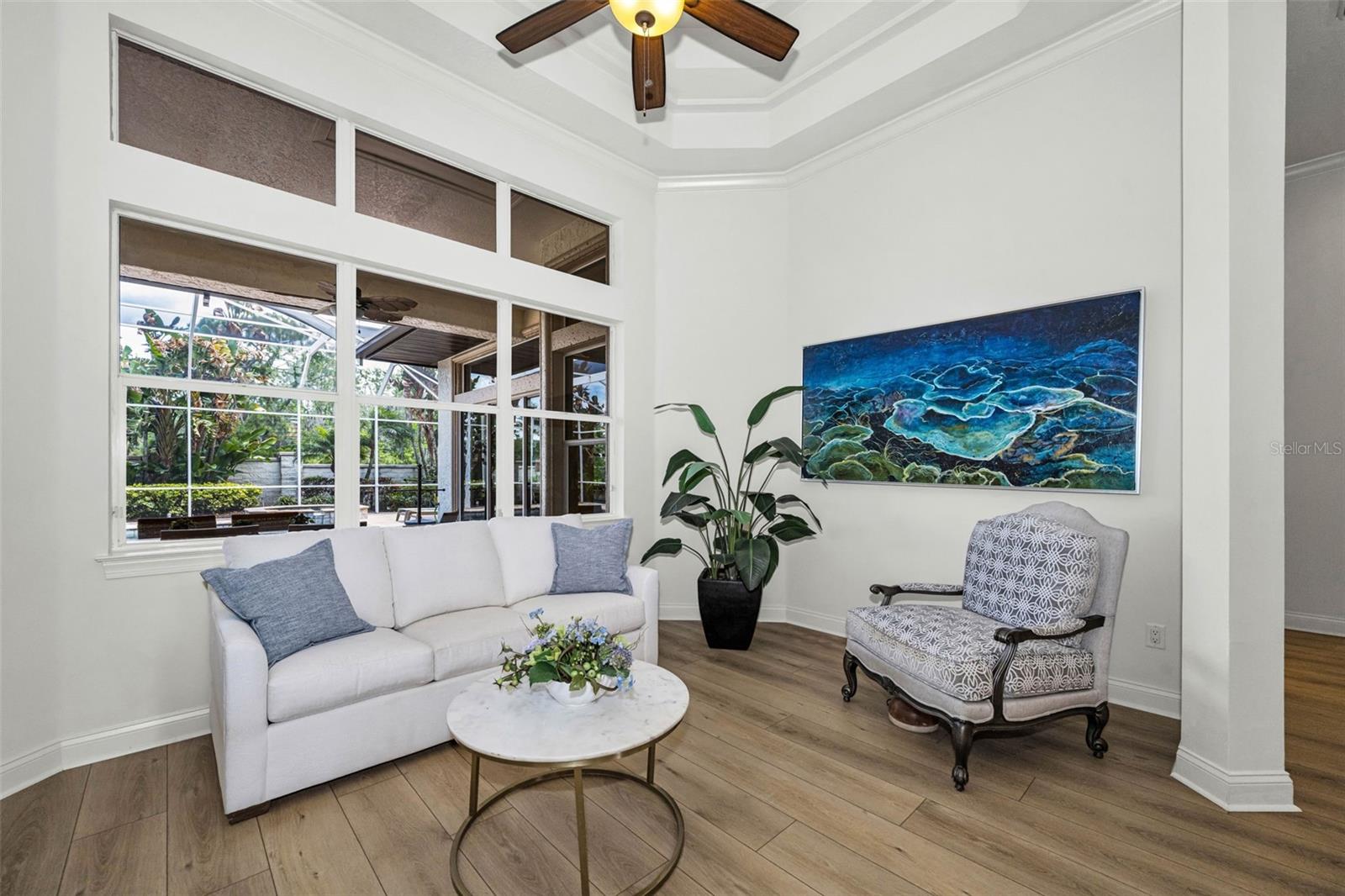 One of the best advantages of this first-floor home is its great location . The unit is located next to the beautiful, landscaped pool. Tiburon community is an exclusive community. The unit is a ready-to-move-in retreat. The kitchen boasts a center island and a walk-in pantry for added convenience. The generous primary suite features a spacious walk-in closet, dual sinks, an expansive tiled shower, a soothing soaking tub, and glass block windows that let in natural light while ensuring privacy. Enjoy the outdoors on the large lanai, surrounded by lush landscaping and picturesque preserve views, creating a peaceful oasis. Additionally, the property includes a two-car attached garage with epoxy flooring. Living in Tiburon provides exclusive access to a world-class 36-hole golf course designed by Greg Norman and managed by Troon, which hosts annual PGA and LPGA events. The community also offers an upscale Ritz-Carlton resort complete with multiple waterslides, a lazy river, and a poolside bar and grill. Other highlights include transportation to Vanderbilt Beach, access to a breathtaking 2700-square-foot Mediterranean-style clubhouse, reciprocal Troon privileges, spa services, a state-of-the-art fitness center, tennis courts, and a golf simulator. Experience the ultimate in luxury golf living at Tiburon, where memberships are optional