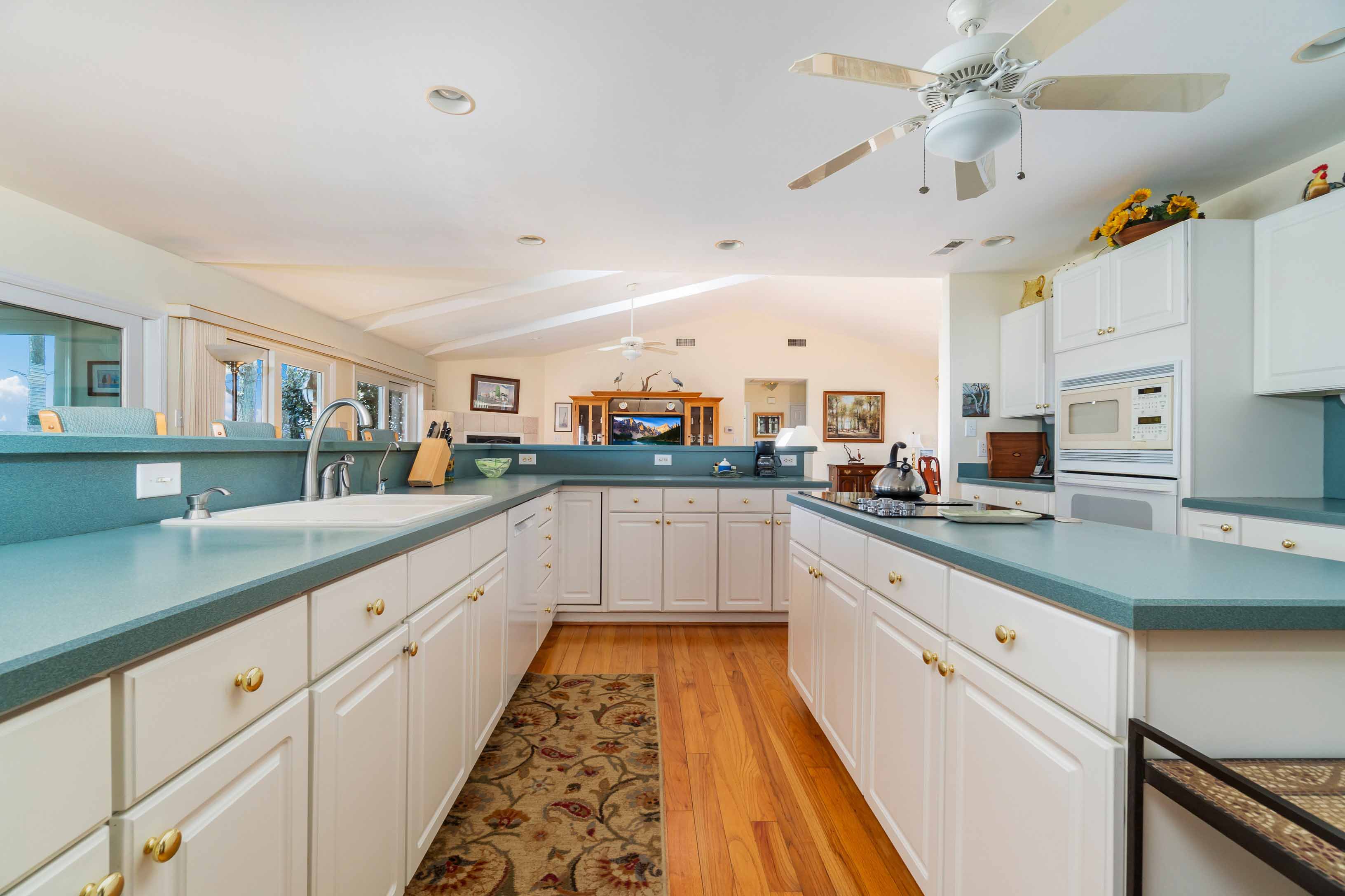 Tucked away on a cul-de-sac in the sought-after Four Oaks community, this stunning ranch-style home offers over 4,000 square feet of finished living space designed for everyday comfort and effortless entertaining. With 4 spacious bedrooms and 3.5 baths, this thoughtfully designed home delivers generous space and incredible versatility throughout. Step inside to find multiple living areas both upstairs and down, perfect for gatherings, game nights, or cozy evenings by the fire. The living room features brand new carpet, giving the space a fresh, move-in-ready feel you'll notice the moment you walk in. The dual fireplaces - one on the main level and another in the finished basement - create inviting spaces to unwind year-round. The front office has been thoughtfully updated with new carpet and stylish sliding doors, offering the privacy of a true home office without sacrificing the open feel of the floor plan. The heart of the home is the upgraded kitchen, featuring generous cabinet storage, expansive counter space, dual ovens, and modern finishes to satisfy any home chef. Whether hosting or meal prepping, this kitchen works as hard as it shines. Downstairs, the finished basement offers incredible flexibility - home theater, rec room, workout zone - the possibilities are endless. Outside, the backyard is a showstopper, backing up to a serene pond for peaceful views and no rear neighbors. Enjoy evenings on the patio taking in the tranquility of the water. As part of the Four Oaks HOA, residents enjoy amenities including a community pool, playground, walking trails, and a pond with a dock just steps away.