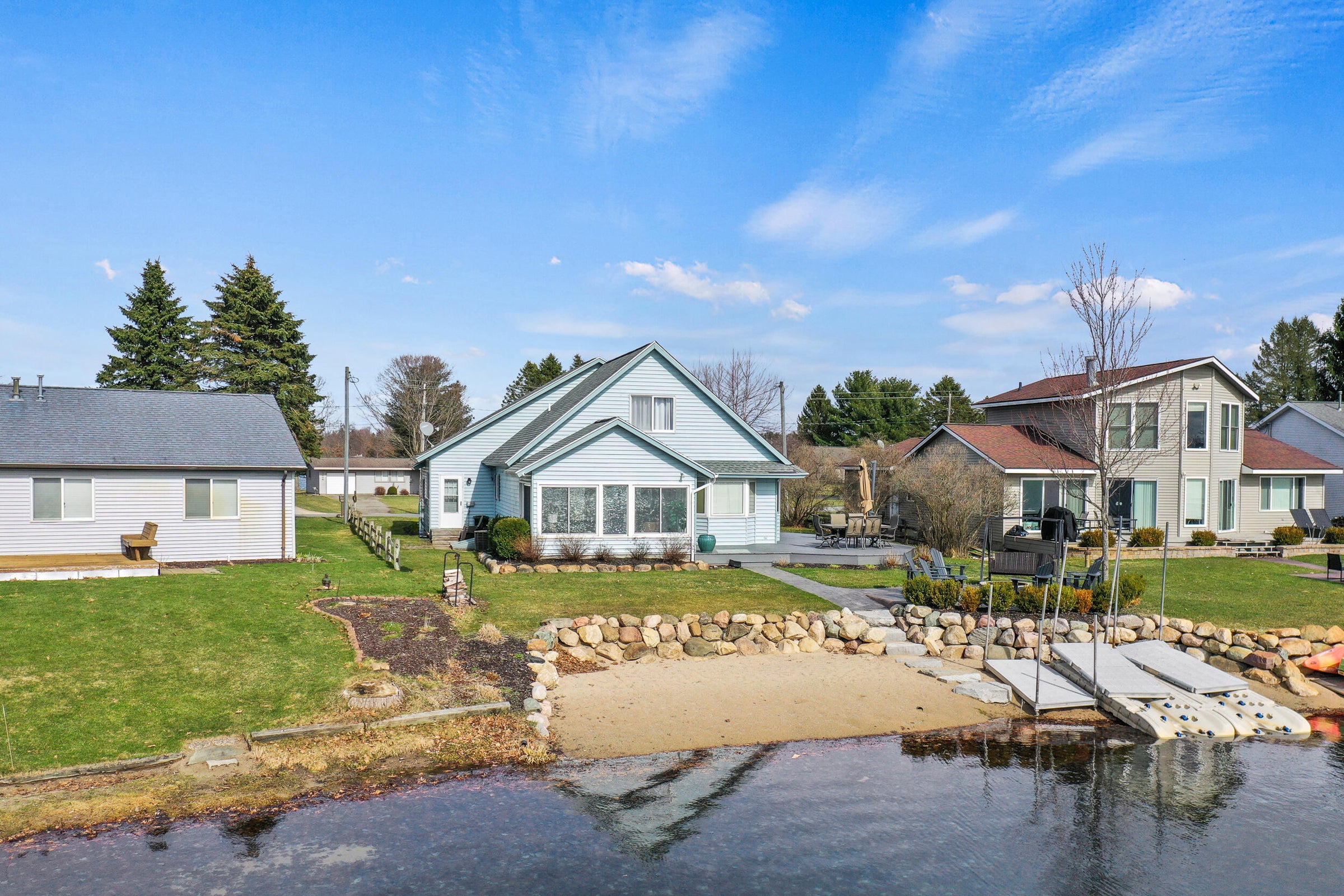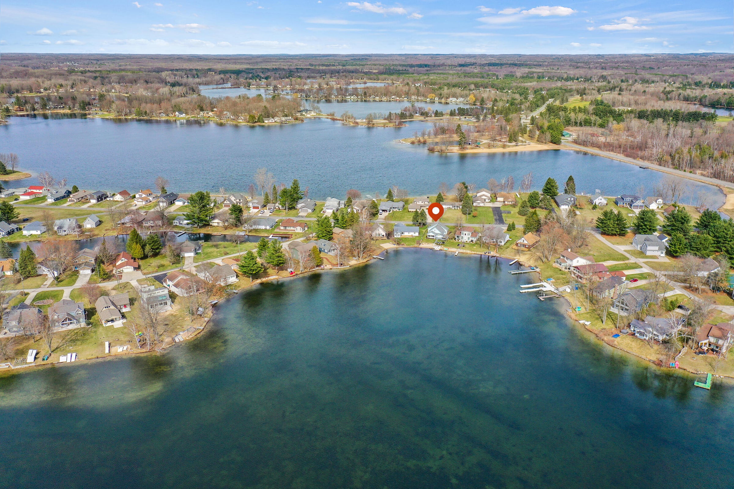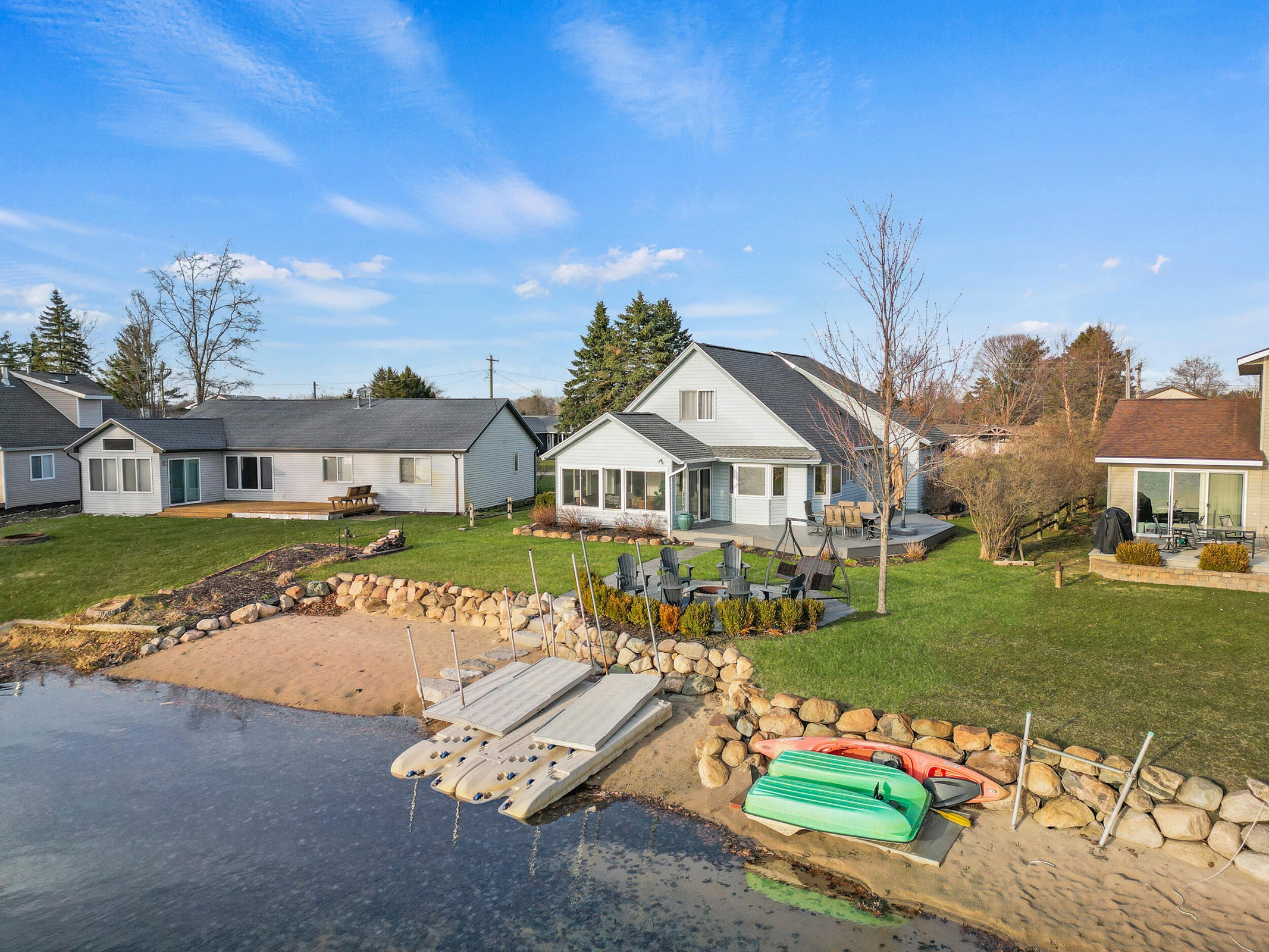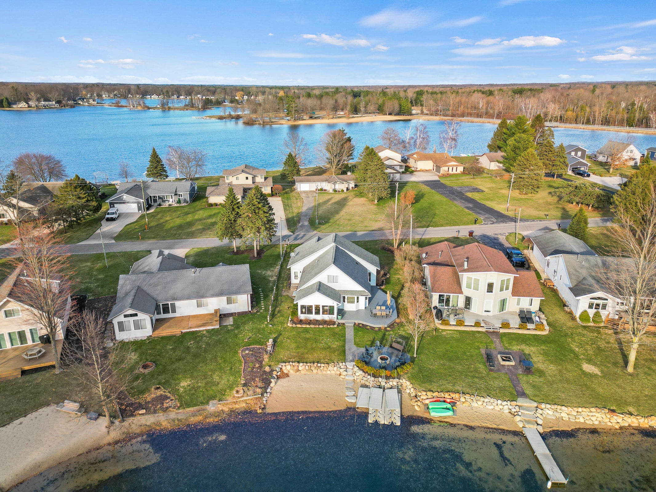 Prime waterfront in the heart of the Canadian Lakes resort. Located in west central Michigan and private to members and their guests, this home is ideally located between the Canadian Lakes shopping area and Tullymore Golf Resort. Originally built in 1986 with updates in 1990 and a complete overhaul from 2023-2025, this classic chalet blends timeless character with a clean, contemporary feel. Main level living is a plus with a primary bedroom and laundry. The upper level boasts two large bedrooms and a spacious second bathroom making this ideal for guests. Large and deep closets offer the always important storage.A four-season sunroom captures panoramic water views while the home sits on a quiet, no-wake stretch with all-sports activity just around the peninsula. The kitchen shines with quartzite tops, center island, and Bosch and Samsung appliances. LVP flooring and Berber carpet throughout add style. Exterior highlights include a massive 1,000 sq ft deck, stamped concrete patio, fire pit, and beautifully landscaped shoreline with boulders and flagstone steps leading to your sandy beach. This is potentially a turn-key opportunity for the right buyer. Just pack your suitcase, head north and enjoy! Experience all that Canadian Lakes offers--54 holes of golf, clubhouses, dining, and more. Some amenities are inclusive with membership and so inquire within.