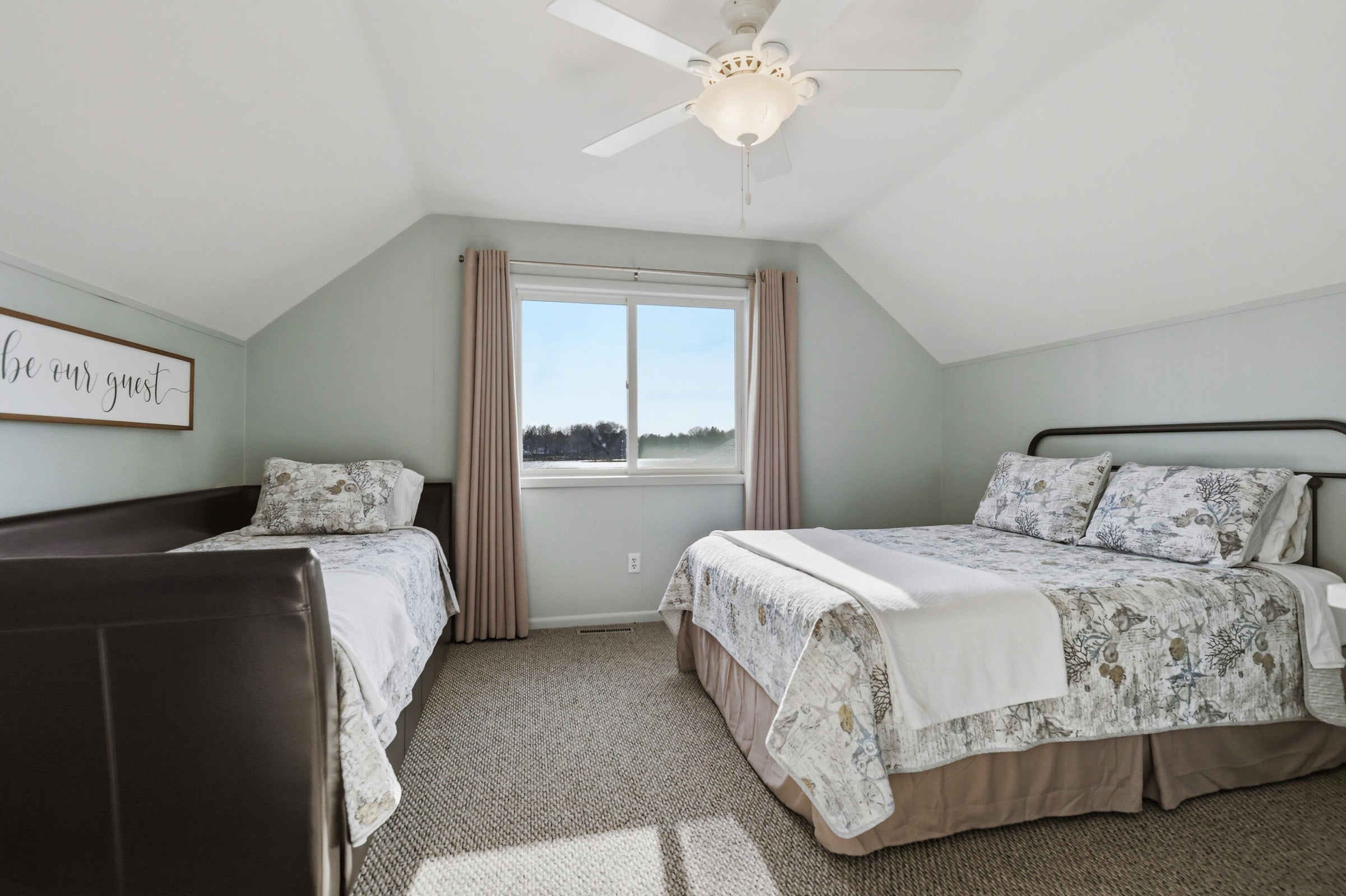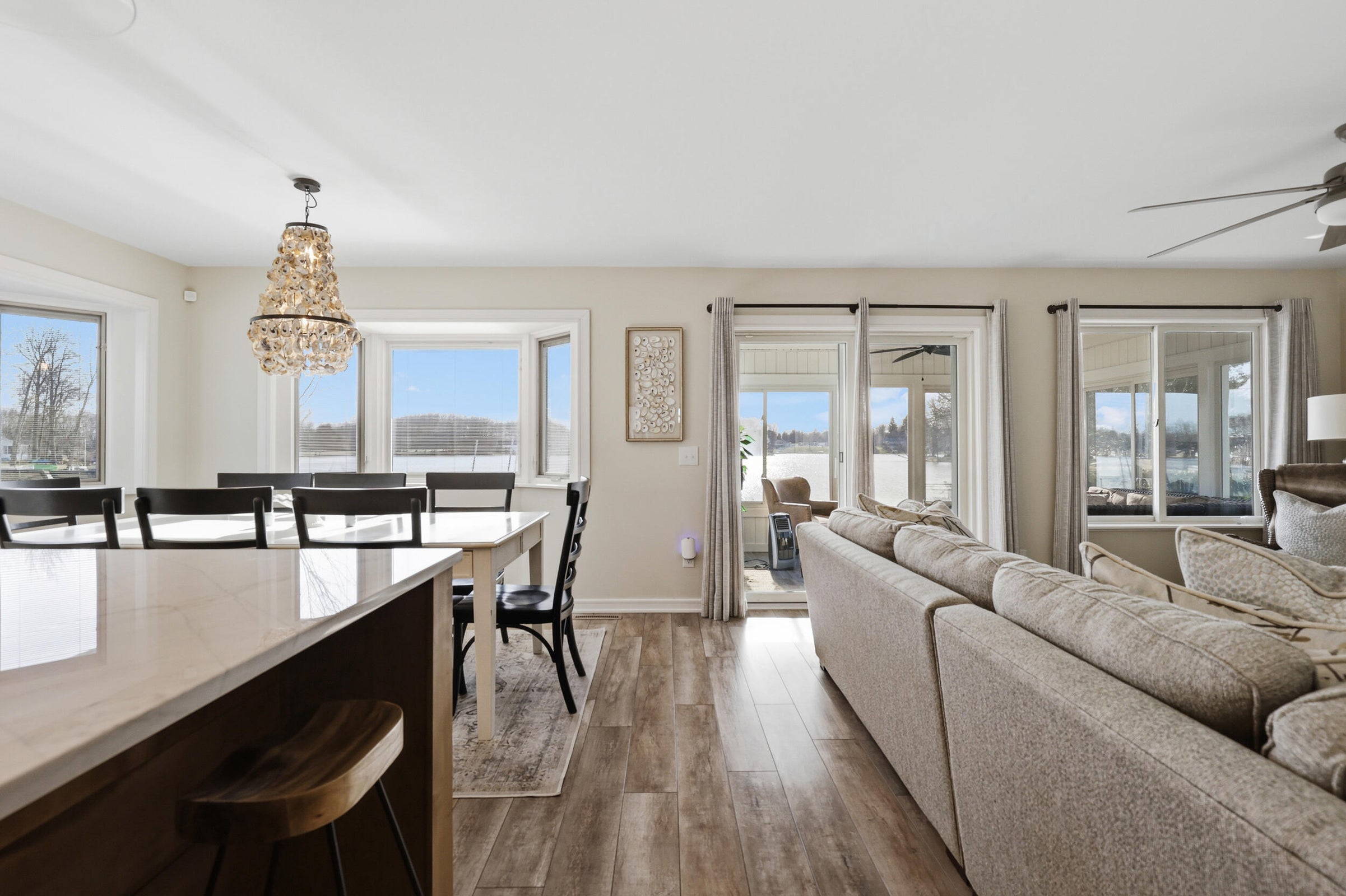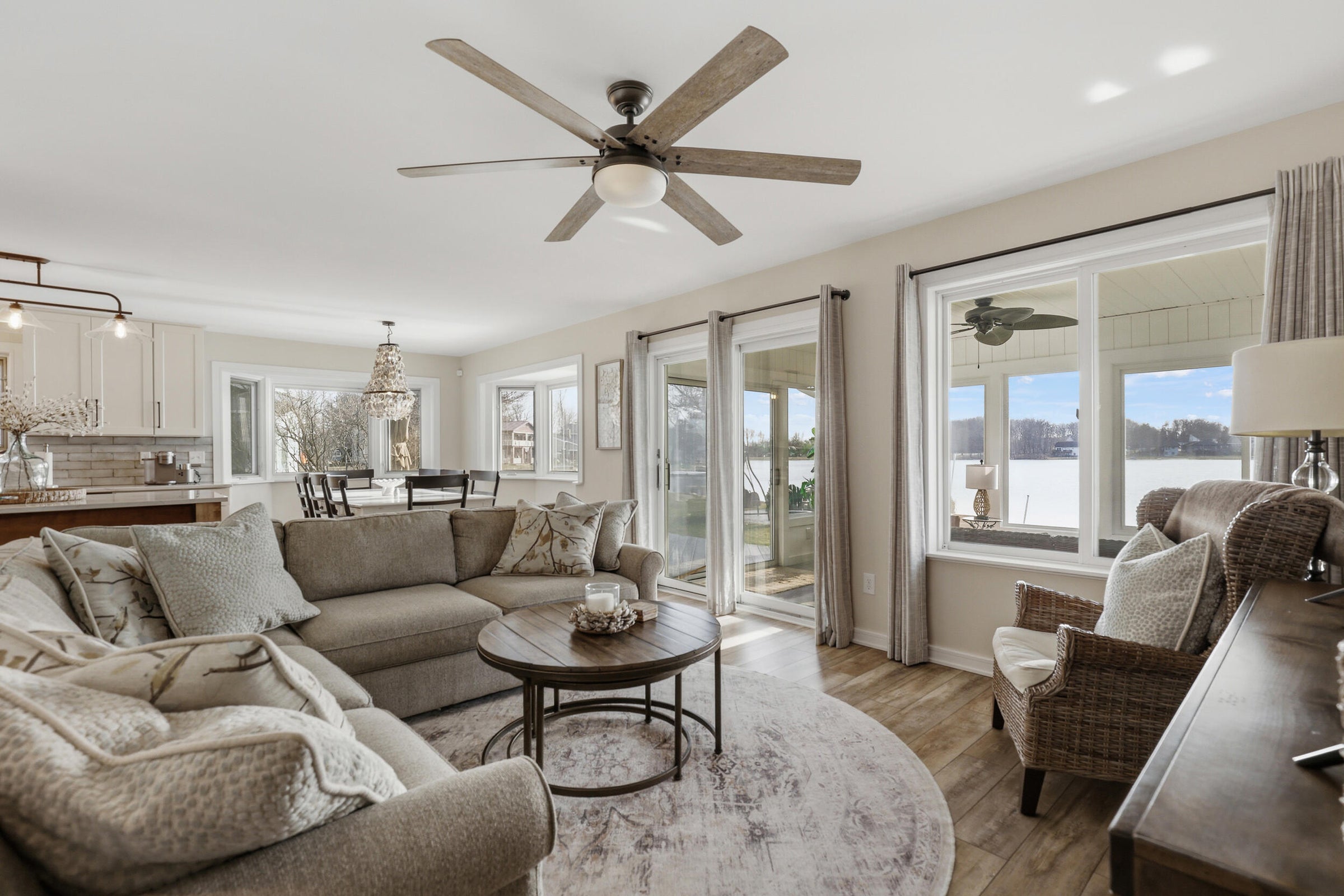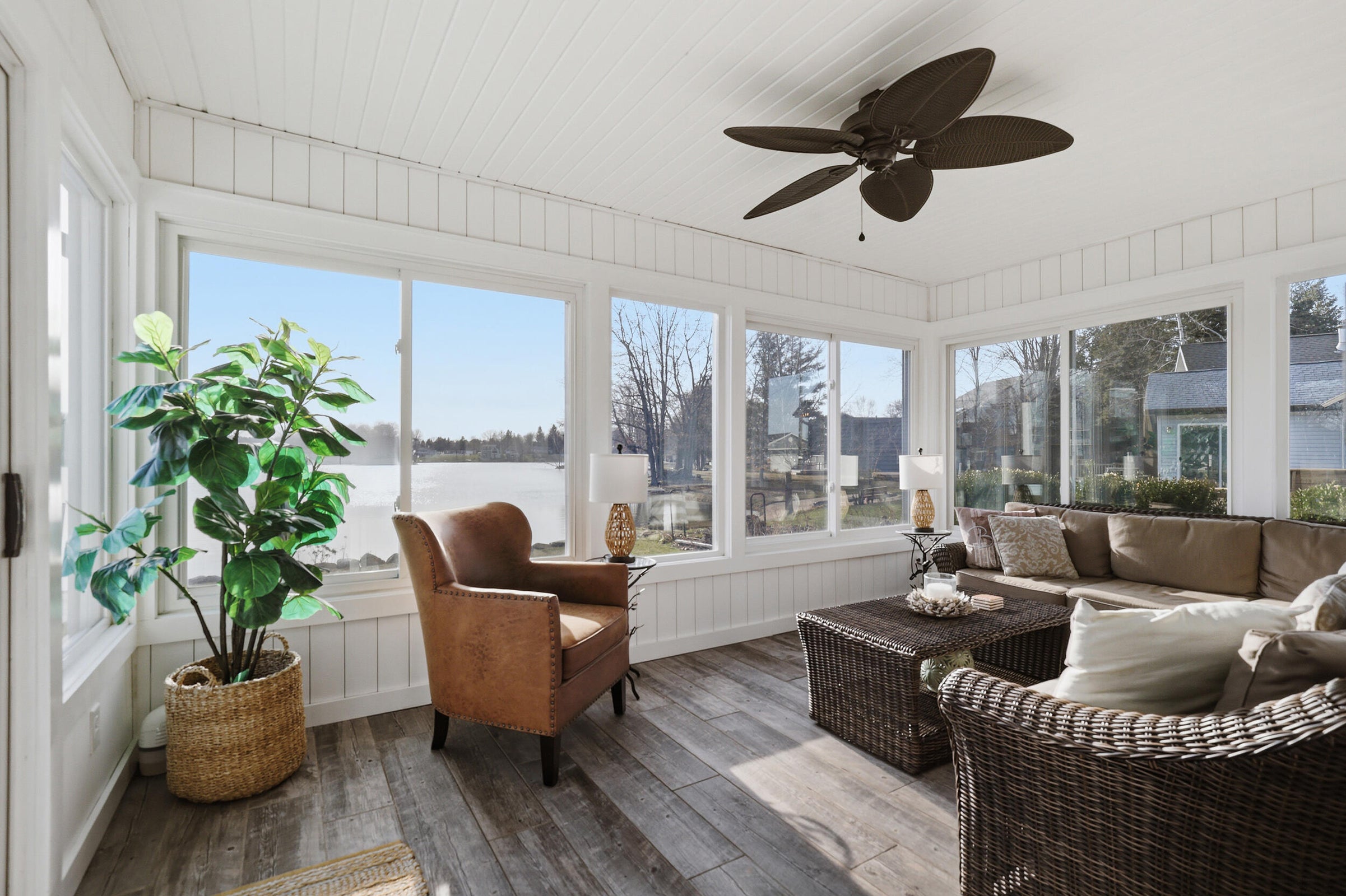 Prime waterfront in the heart of the Canadian Lakes resort. Located in west central Michigan and private to members and their guests, this home is ideally located between the Canadian Lakes shopping area and Tullymore Golf Resort. Originally built in 1986 with updates in 1990 and a complete overhaul from 2023-2025, this classic chalet blends timeless character with a clean, contemporary feel. Main level living is a plus with a primary bedroom and laundry. The upper level boasts two large bedrooms and a spacious second bathroom making this ideal for guests. Large and deep closets offer the always important storage.A four-season sunroom captures panoramic water views while the home sits on a quiet, no-wake stretch with all-sports activity just around the peninsula. The kitchen shines with quartzite tops, center island, and Bosch and Samsung appliances. LVP flooring and Berber carpet throughout add style. Exterior highlights include a massive 1,000 sq ft deck, stamped concrete patio, fire pit, and beautifully landscaped shoreline with boulders and flagstone steps leading to your sandy beach. This is potentially a turn-key opportunity for the right buyer. Just pack your suitcase, head north and enjoy! Experience all that Canadian Lakes offers--54 holes of golf, clubhouses, dining, and more. Some amenities are inclusive with membership and so inquire within.