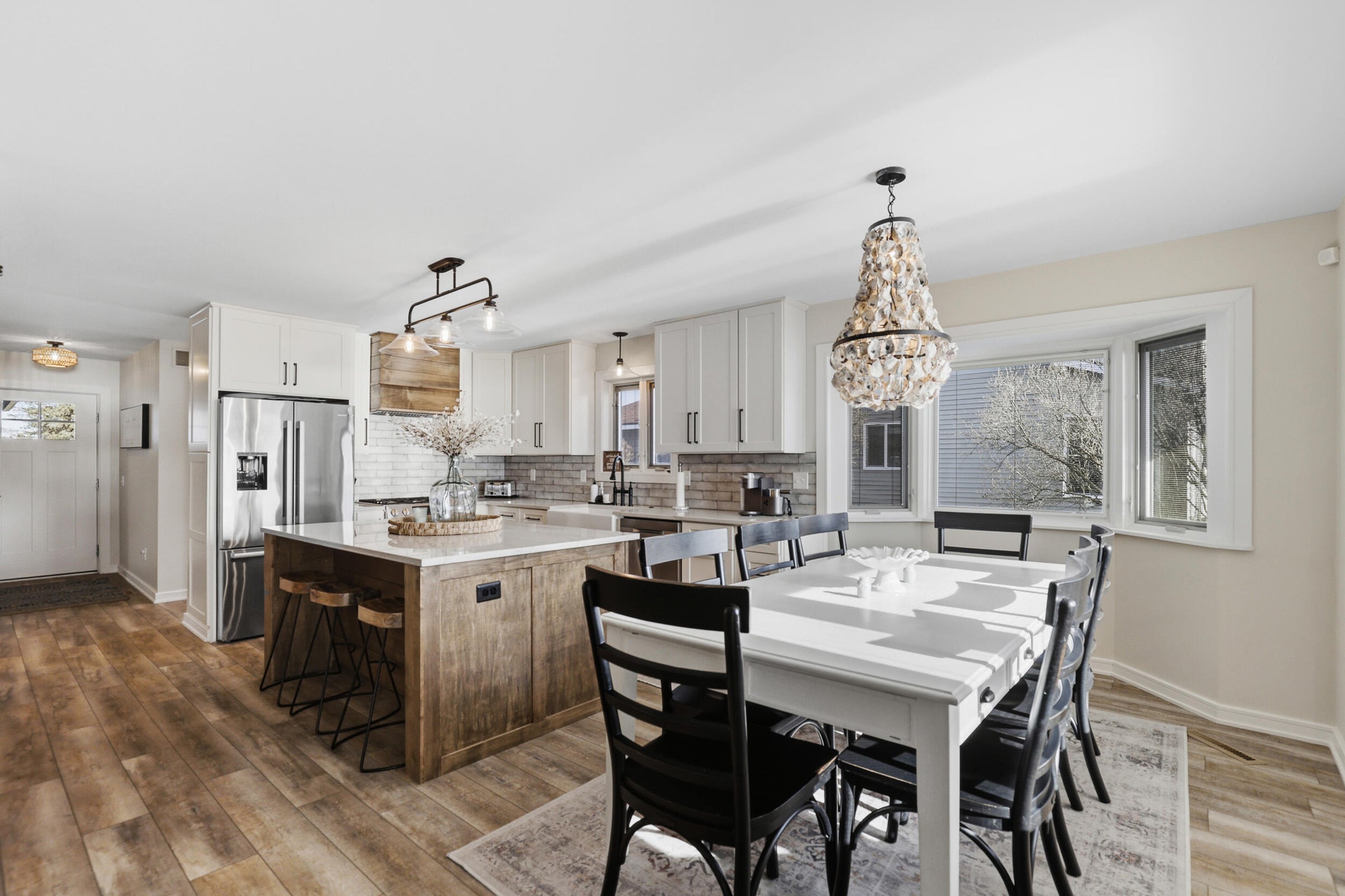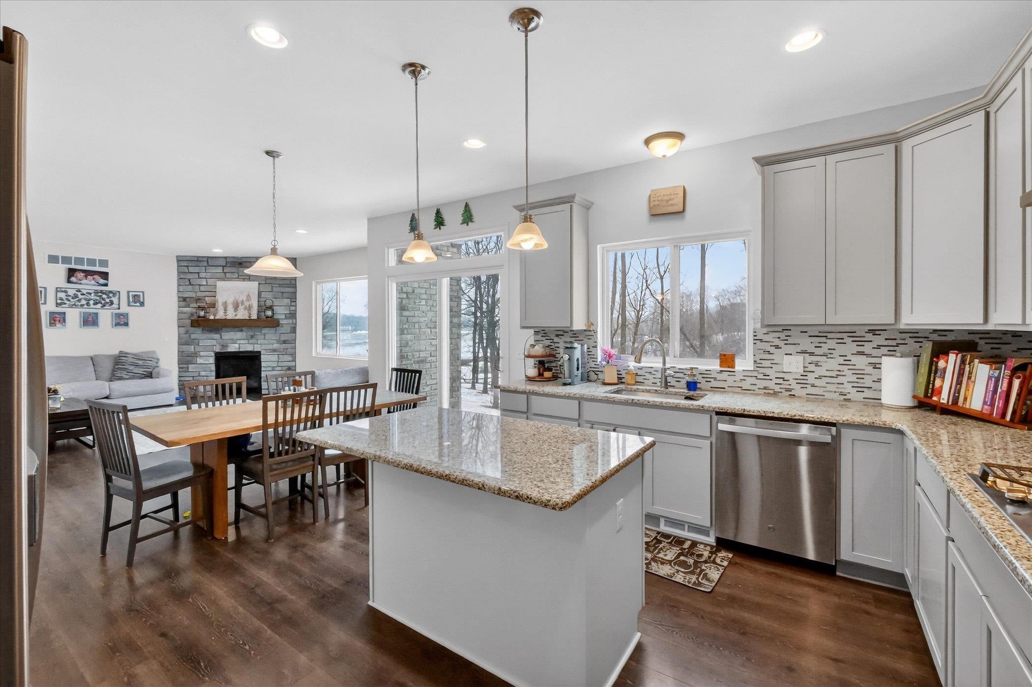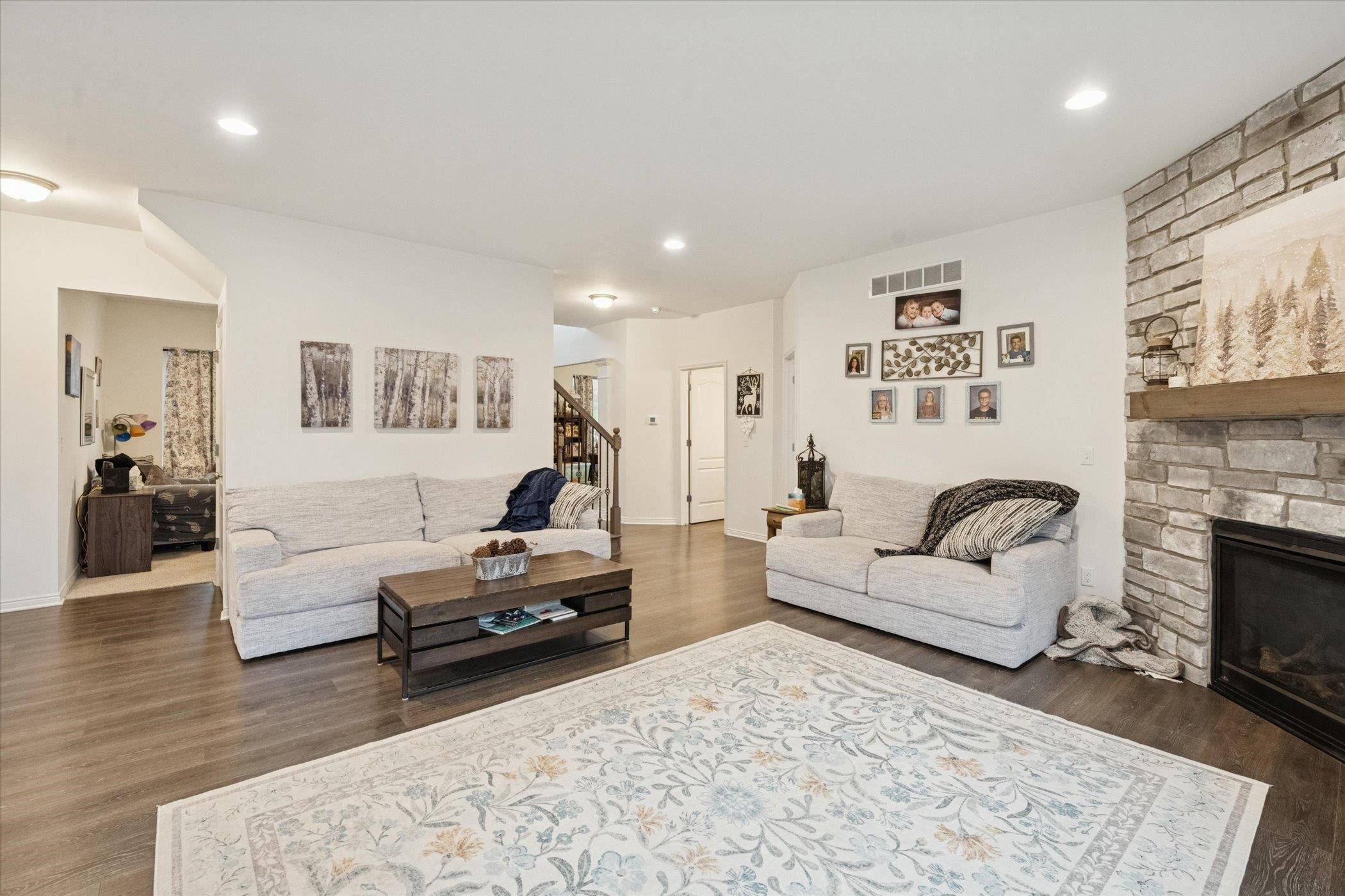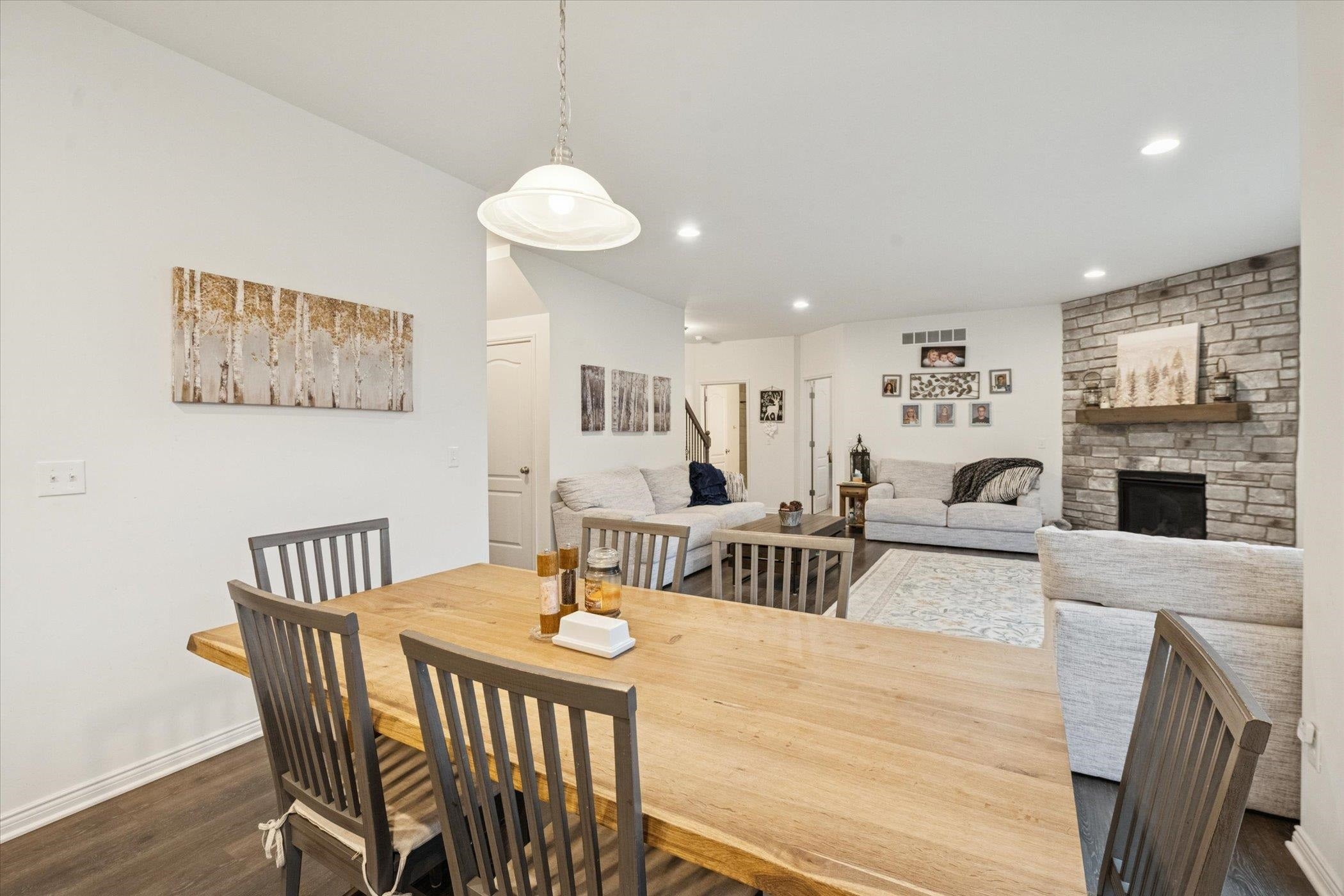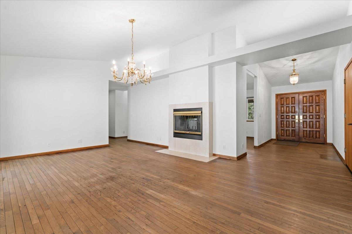 Room for the whole family! This beautifully designed home features rich wood flooring throughout and a stunning double-sided fireplace that anchors both the living and dining rooms. The updated chefs kitchen is a true centerpiece, showcasing gorgeous countertops, newer appliances, a built-in refrigerator, Wolf gas cooktop, and a spacious island perfect for gathering and entertaining.