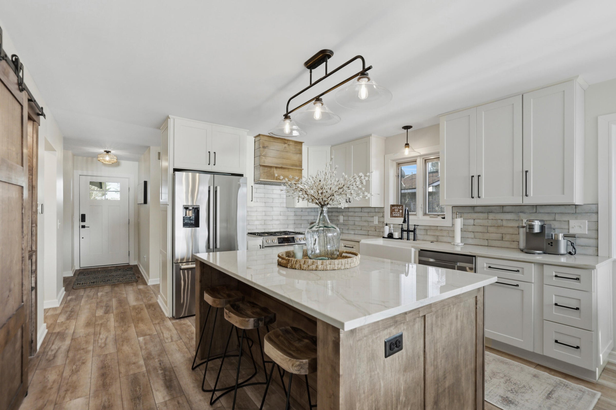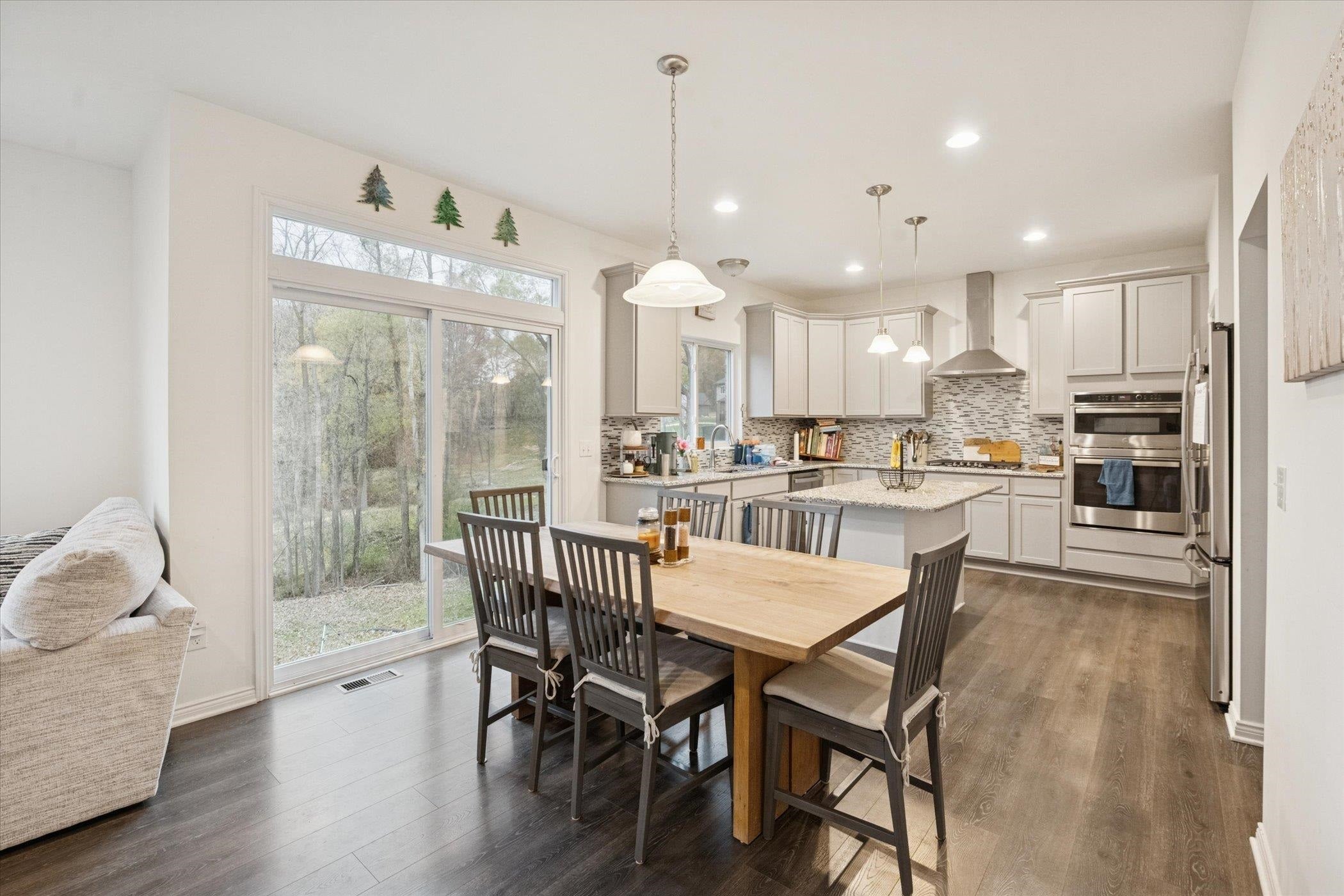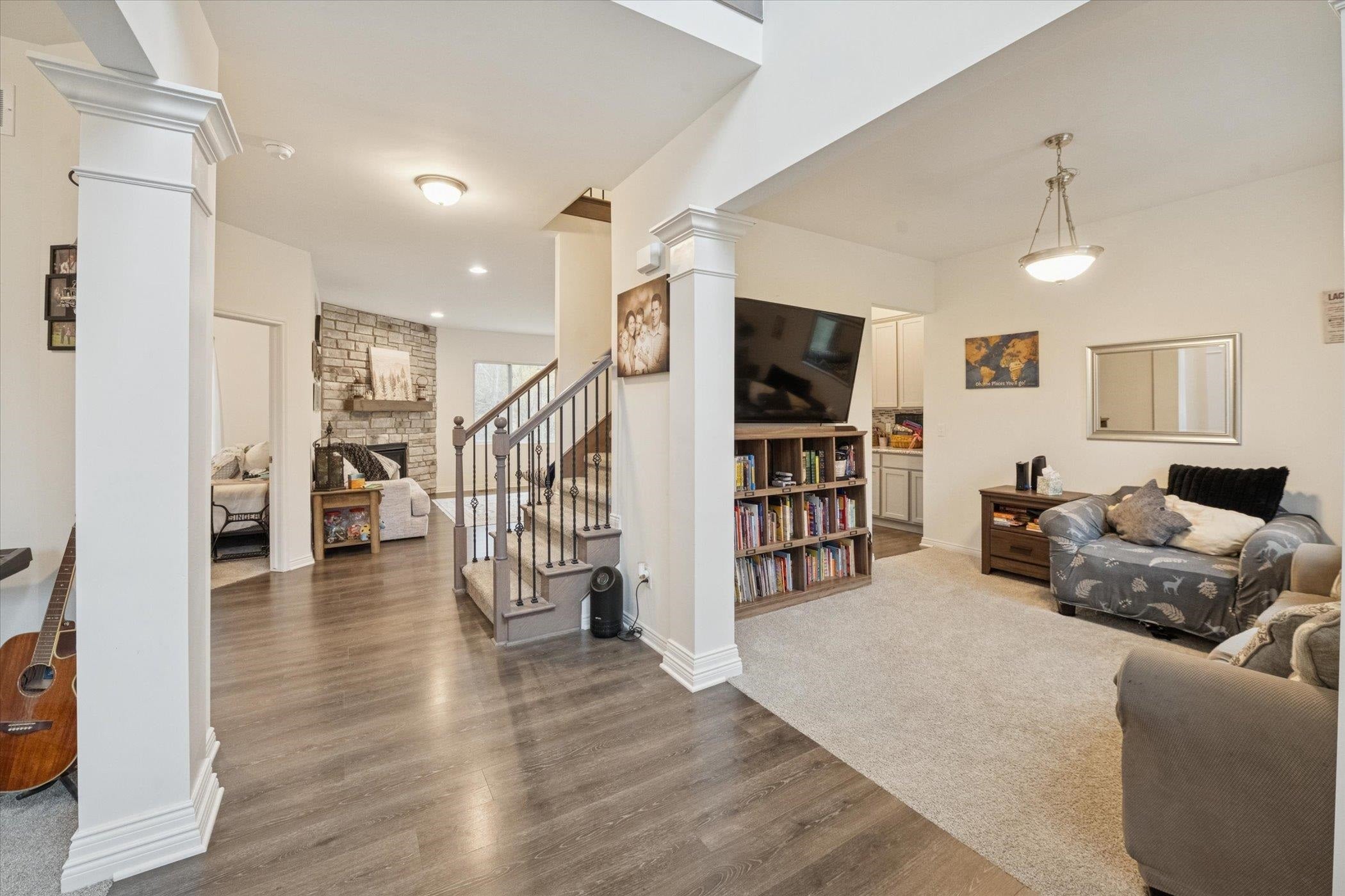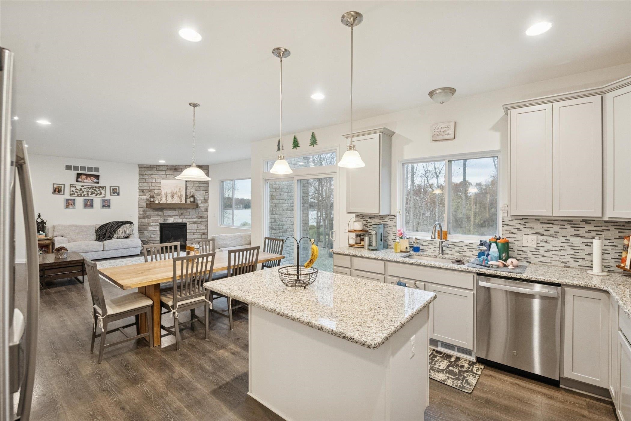 Room for the whole family! This beautifully designed home features rich wood flooring throughout and a stunning double-sided fireplace that anchors both the living and dining rooms. The updated chefs kitchen is a true centerpiece, showcasing gorgeous countertops, newer appliances, a built-in refrigerator, Wolf gas cooktop, and a spacious island perfect for gathering and entertaining.