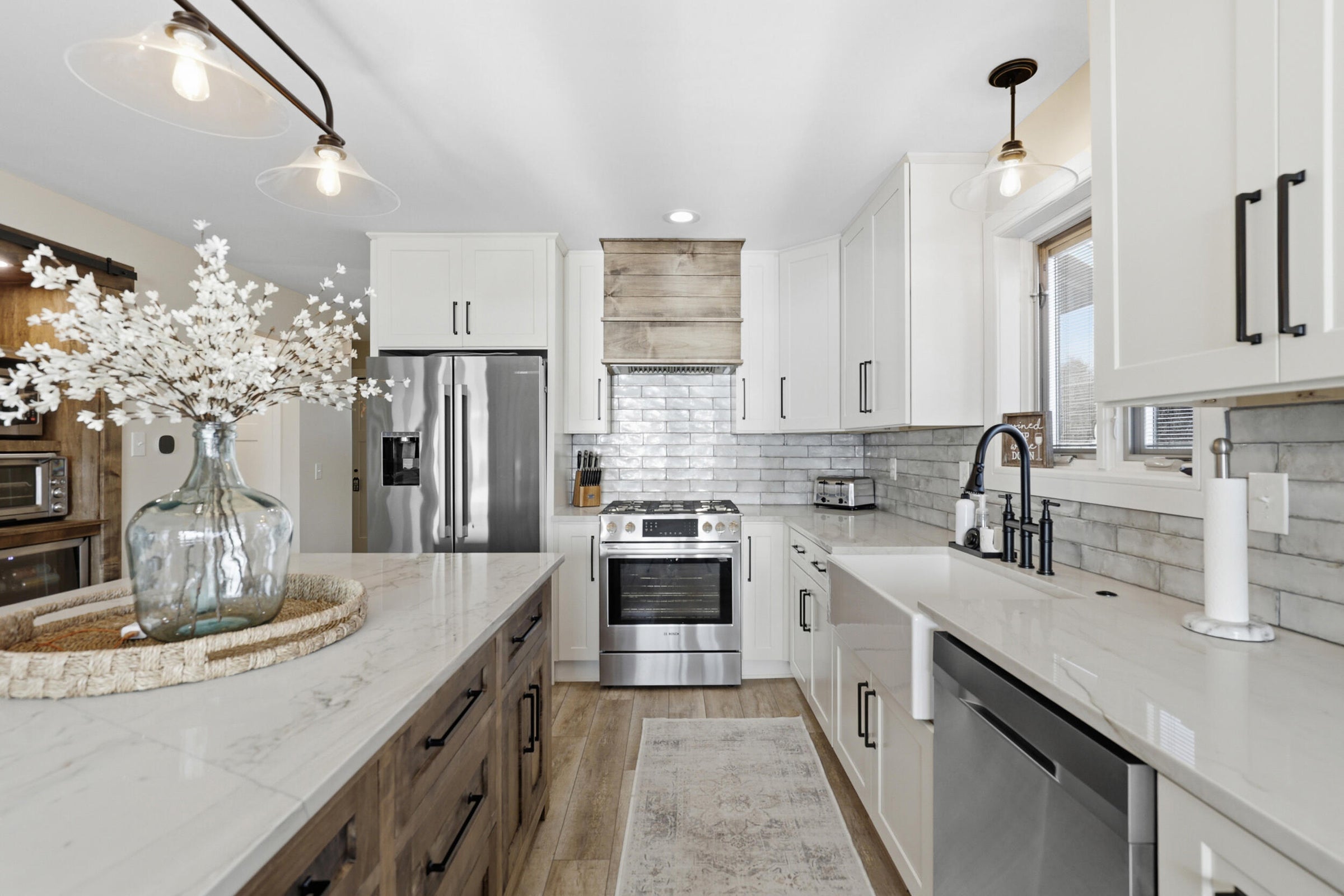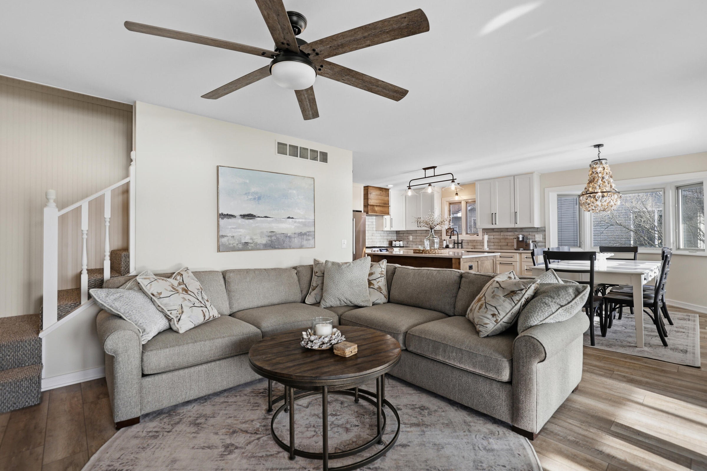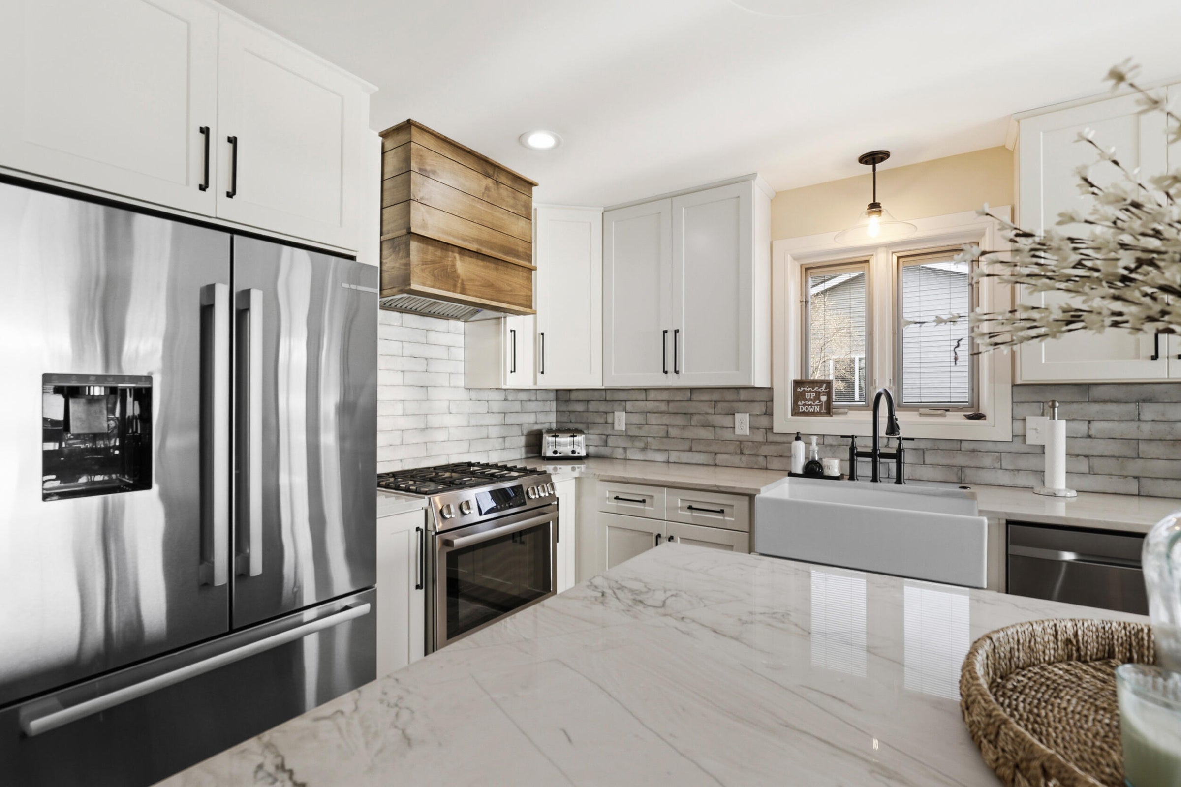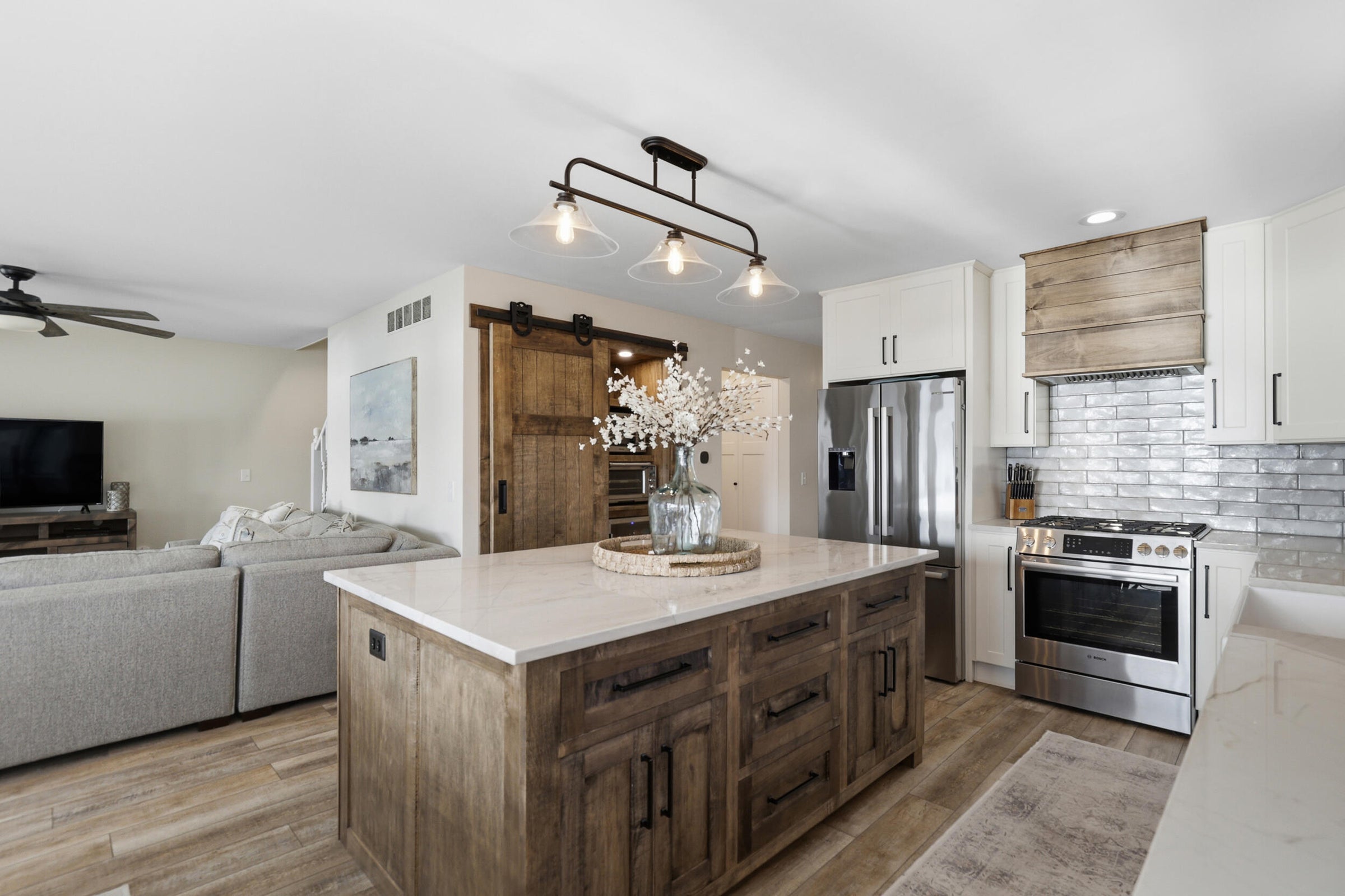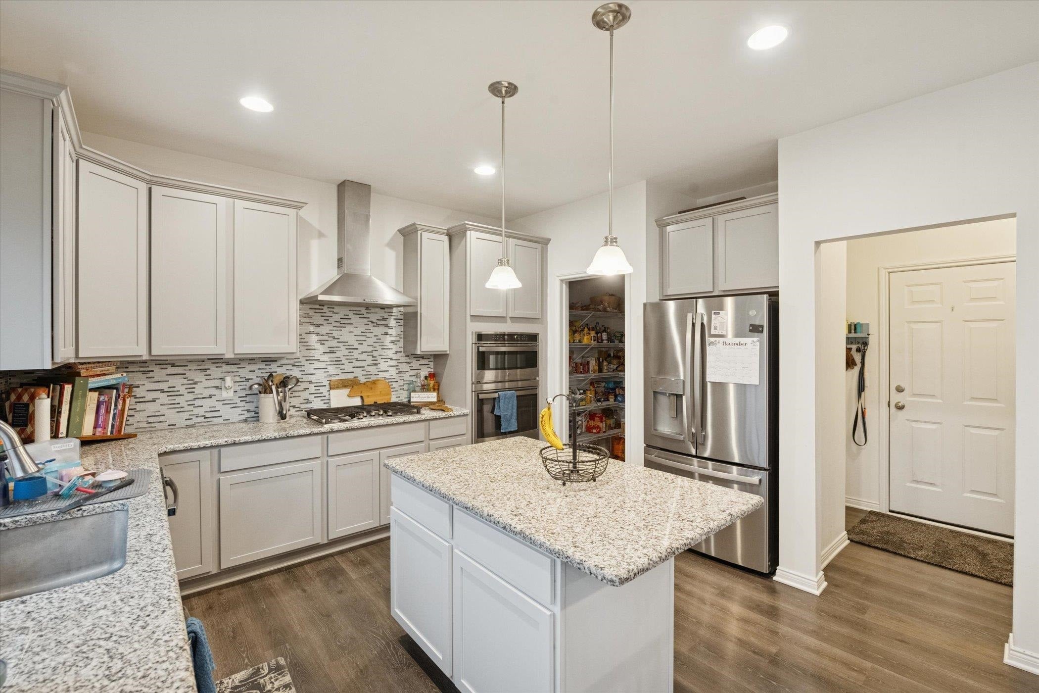 Room for the whole family! This beautifully designed home features rich wood flooring throughout and a stunning double-sided fireplace that anchors both the living and dining rooms. The updated chefs kitchen is a true centerpiece, showcasing gorgeous countertops, newer appliances, a built-in refrigerator, Wolf gas cooktop, and a spacious island perfect for gathering and entertaining.