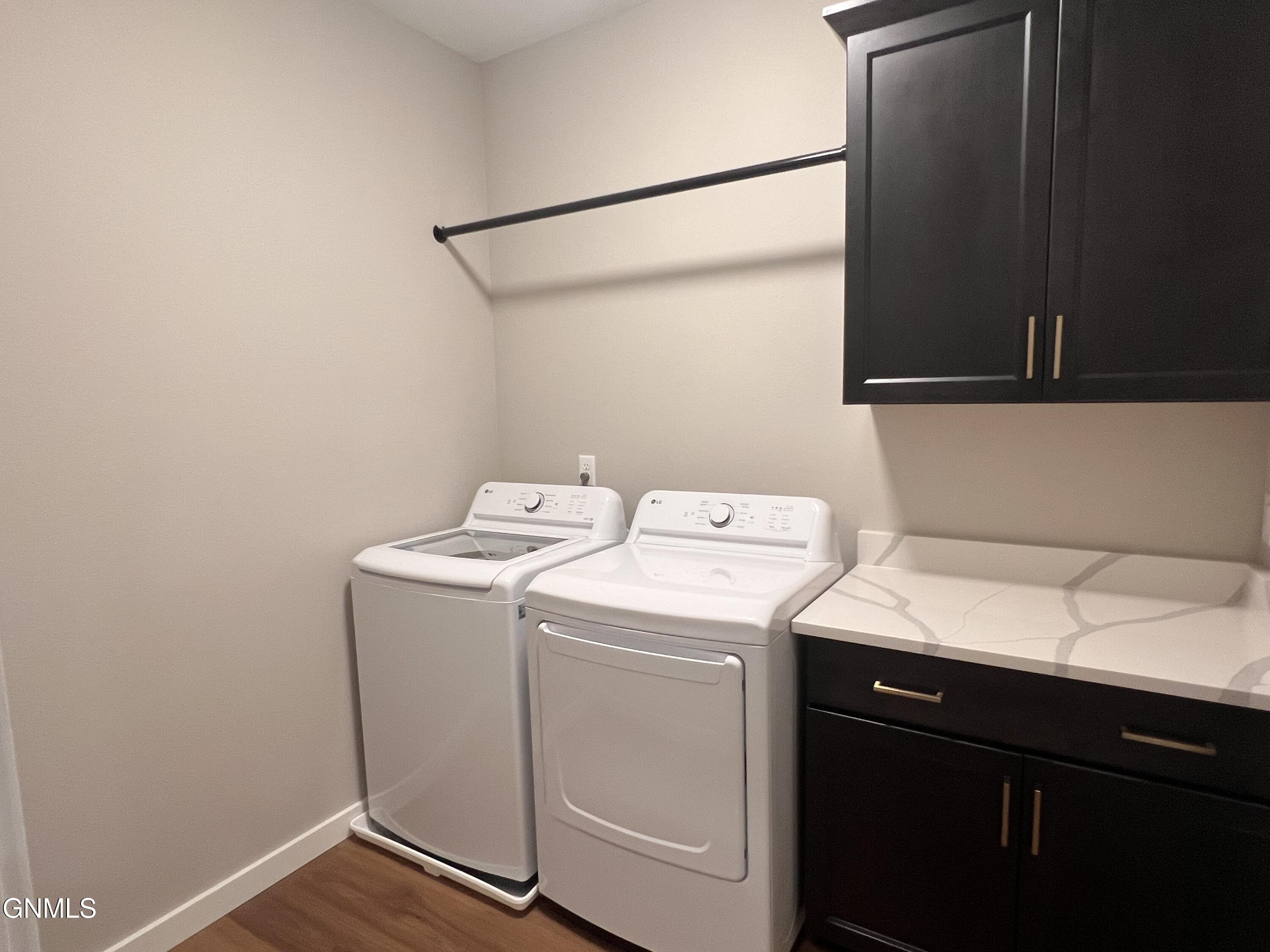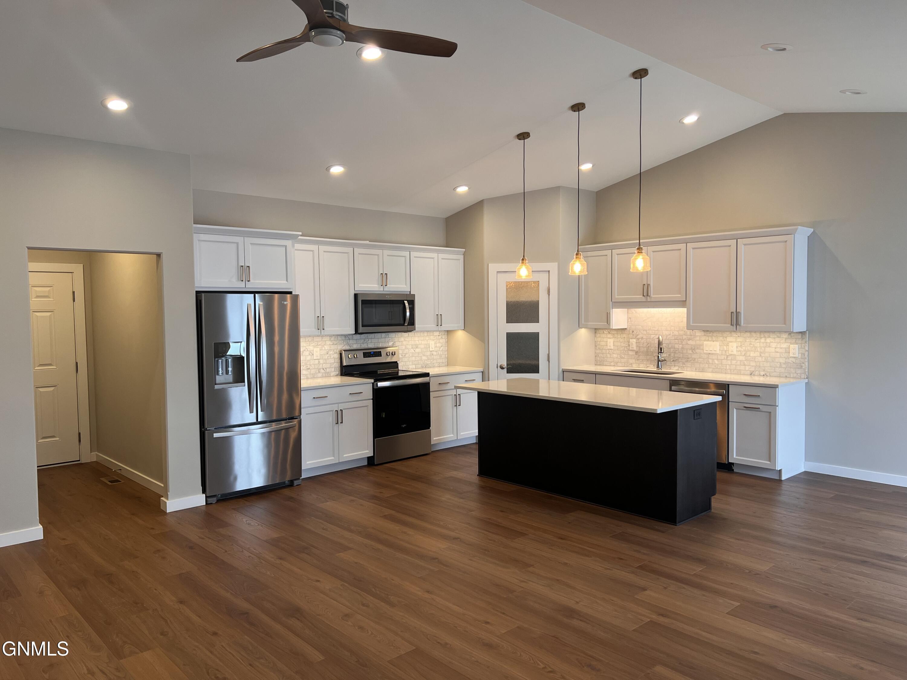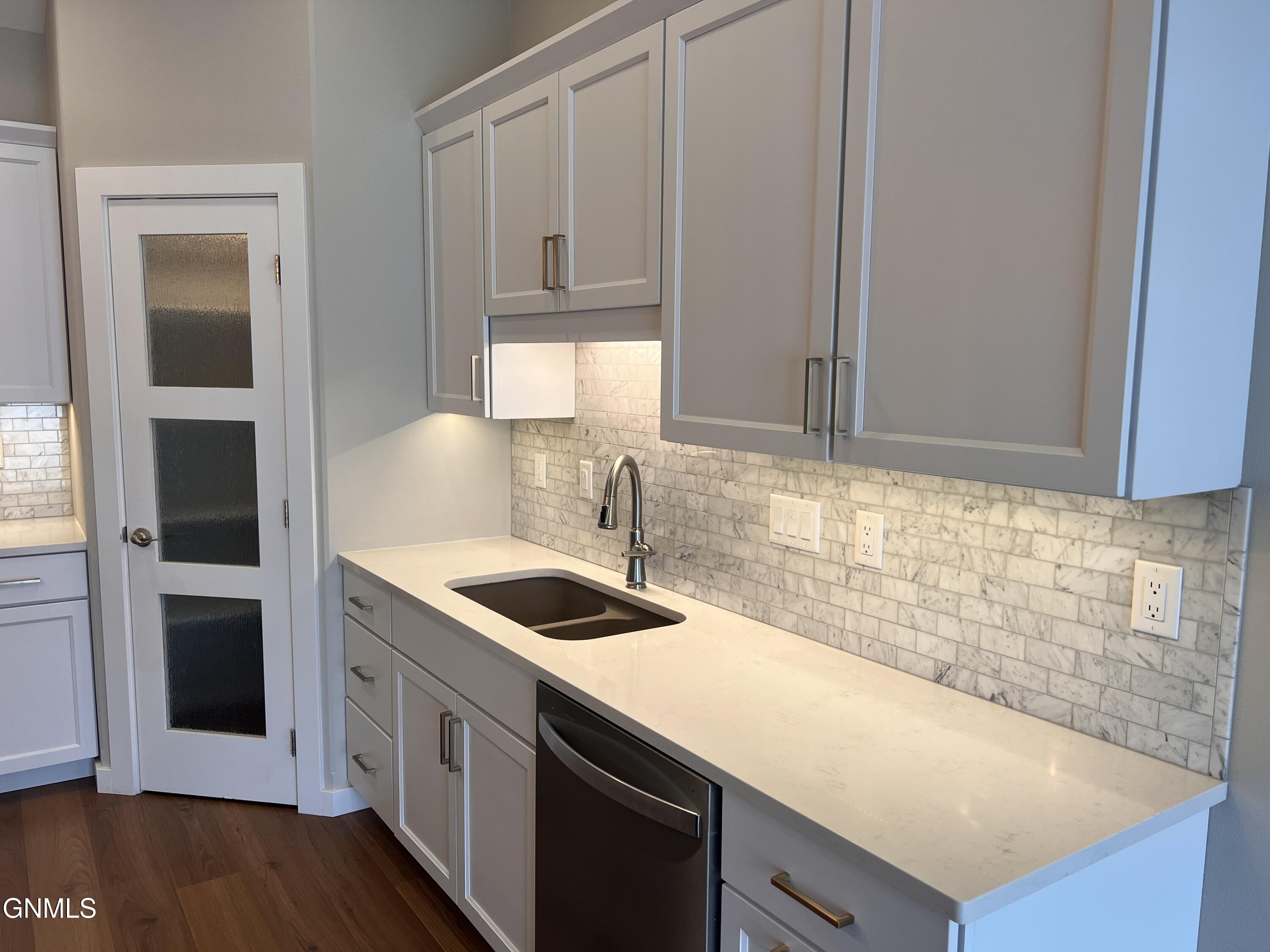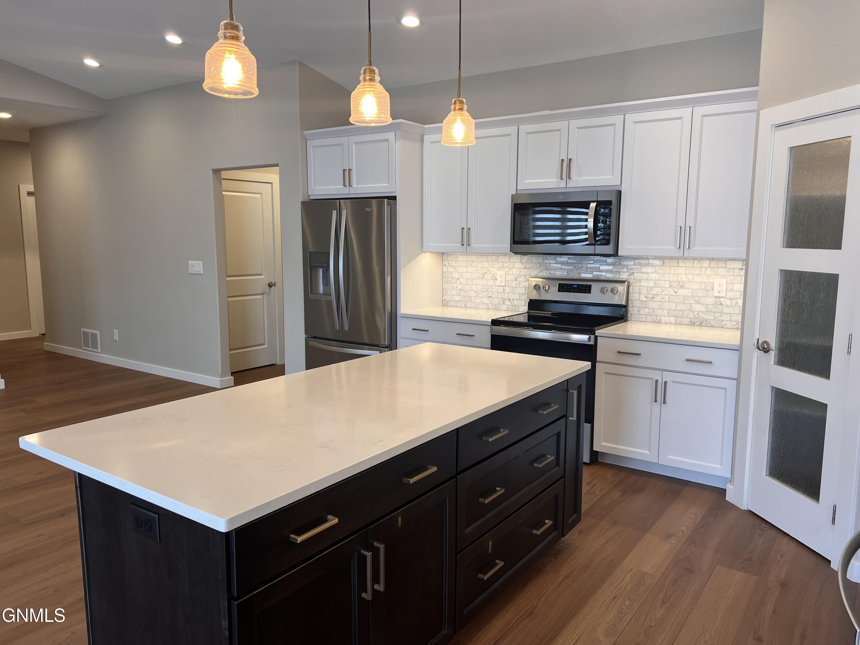 Patio home with no steps, located in north Bismarck. This maintenance free townhome community is for residents 55 & older. The homeowners association takes care of snow removal & lawn maintenance. The kitchen features include white cabinets, stone countertops, tile backsplash, under cabinet lighting, pantry, & a large island with seating & dark contrasting wood cabinets.