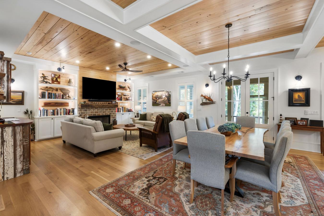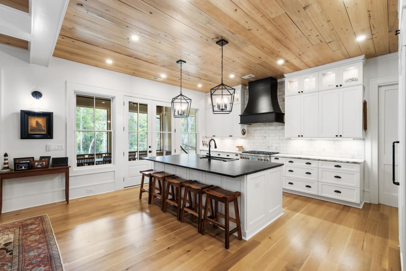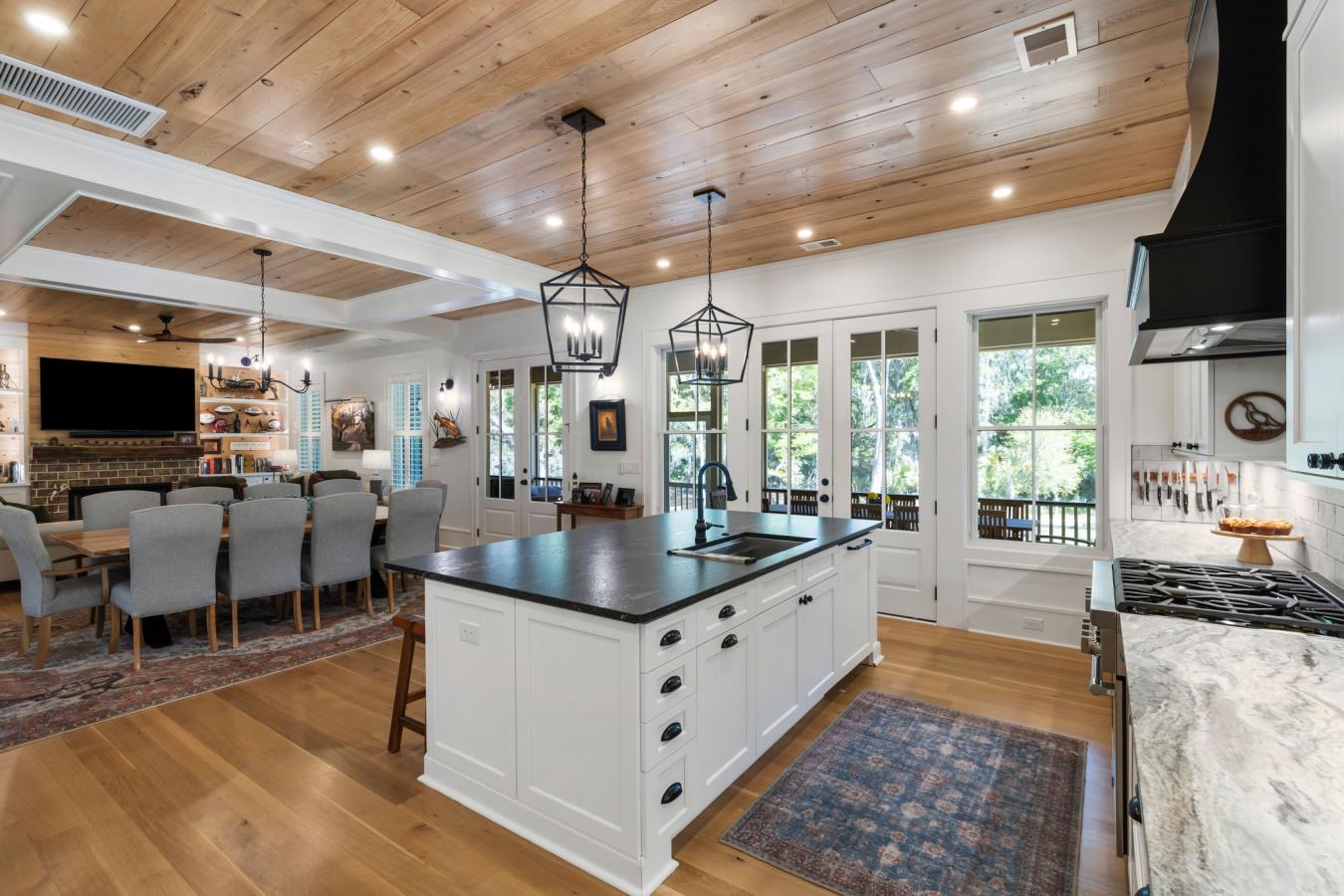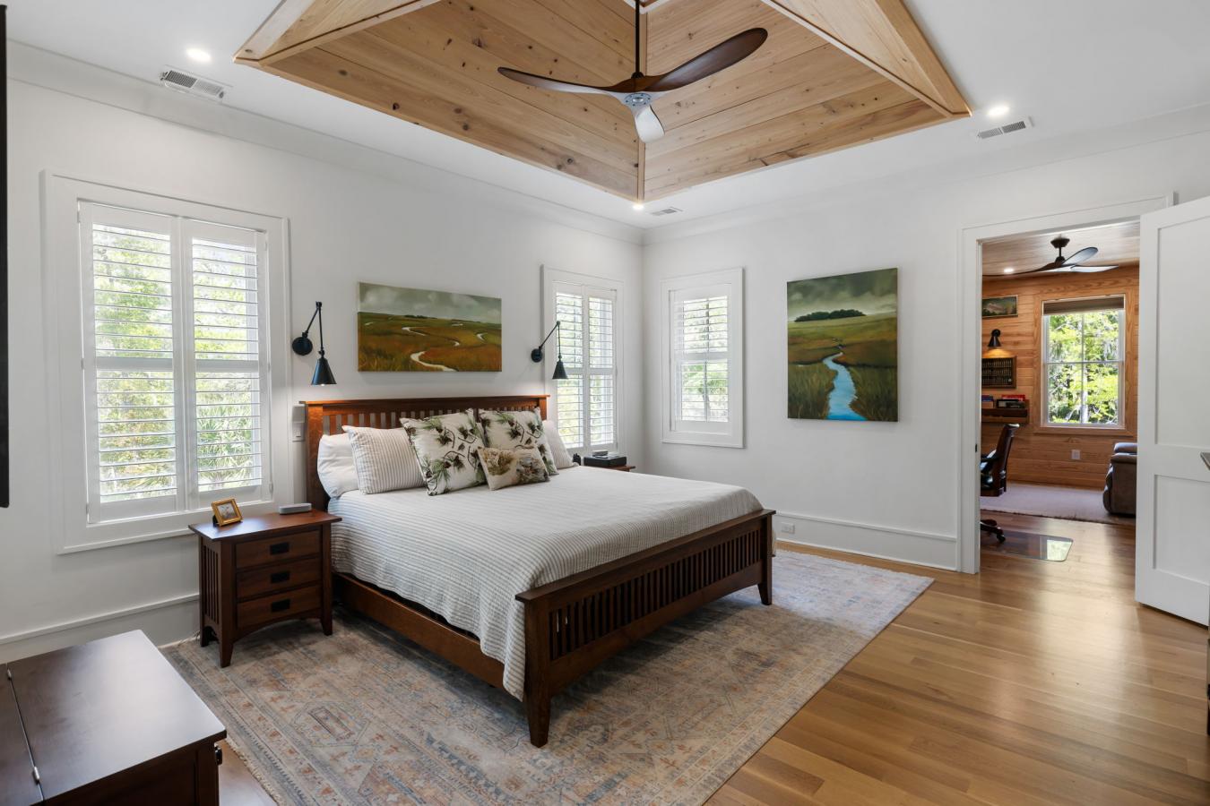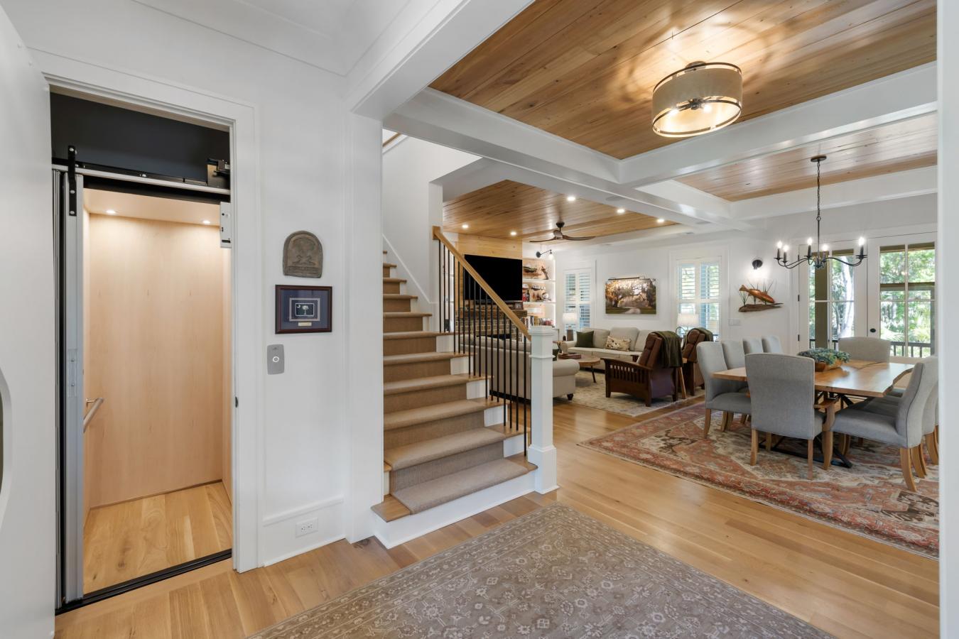 Classic Lowcountry, Briars Creek home situated on a very quiet, private cul de sac, overlooking fabulous views of Lake Sharon. This home has perfectly manicured landscaping, lake views, large backyard with room for a pool, lake access with dock, direct access to the nature trail, and the property backs up to a maritime preserve for privacy in perpetuity. This elevated home has hardiplank siding, metal roof, custom gutters, whole house water filter, whole house generator, and elevator. The interior has a bright open floor plan with white oak floors, custom trim and millwork throughout, surround sound speakers, recessed lighting, custom lighting, and custom cabinetry. The Living Room, Dining Room, and Kitchen are all open to one another and feature spectacular coffered ceilings with.Cypress shiplapped ceilings. The Living area has a gas fireplace with brick surround, and is flanked by custom lighted, built-in bookshelves and cabinetry, with heart pine backing, and portrait lights. There are french doors and plantation shutters leading out to the large screened porch. The kitchen has custom cabinetry to the ceiling, under cabinet lighting, leathered granite countertops, large kitchen island with lantern pendant lighting, marble subway tile backsplash, Thermador 6-burner gas range with custom hood, Thermador custom-paneled refrigerator. This kitchen has a ton of storage and is perfect for entertaining. There is a walk-in pantry with custom shelving, and a large laundry room just off the kitchen, with granite countertops, utility sink, Speed Queen washer and dryer, custom cabinetry, and under cabinet lighting. The laundry room has access to the back deck making it function like a mudroom. Also on the first floor is a utility room for extra storage and second refrigerator. The primary suite is located on the first floor and has a beautifully vaulted ceiling with Cypress shiplapping. The primary bathroom has dual vanities with quartz countertops, large "shower room" with windows for natural light, two separate shower heads and controls, and room for a free standing tub. There is a private water closet and linen closet as well. There is a private office that is part of the primary suite that features handsome, heart Pine shiplapping throughout. There is a guest suite on the first floor, with en suite bathroom with quartz countertops and tiled shower. Upstairs there are two guest bedrooms with their own en suite bathrooms as well as a media room and upstairs landing area that can also be used as an upstairs den. This home has incredible outdoor living spaces. It has a spacious screened porch that has beadboard ceiling, outdoor speakers, a living area with TV, dining area, hammock spot, and grilling area, all overlooking the perfectly landscaped backyard and Lake Sharon views. Underneath the back deck is a large covered patio for additional lounge spaces. There is a dedicated fire pit area and plenty of room to add a pool. There is a pathway to the Lake and dock as well as a fun sitting area with Adirondack chairs overlooking the Lake. This home has a tankless water heater and whole house generator has a 1,000 gallon buried propane tank. The garage is completely enclosed and temperature controlled with capability to add a shower or pool bath, and plenty of room for storage and a workshop. This home is a classic for Briars Creek living!