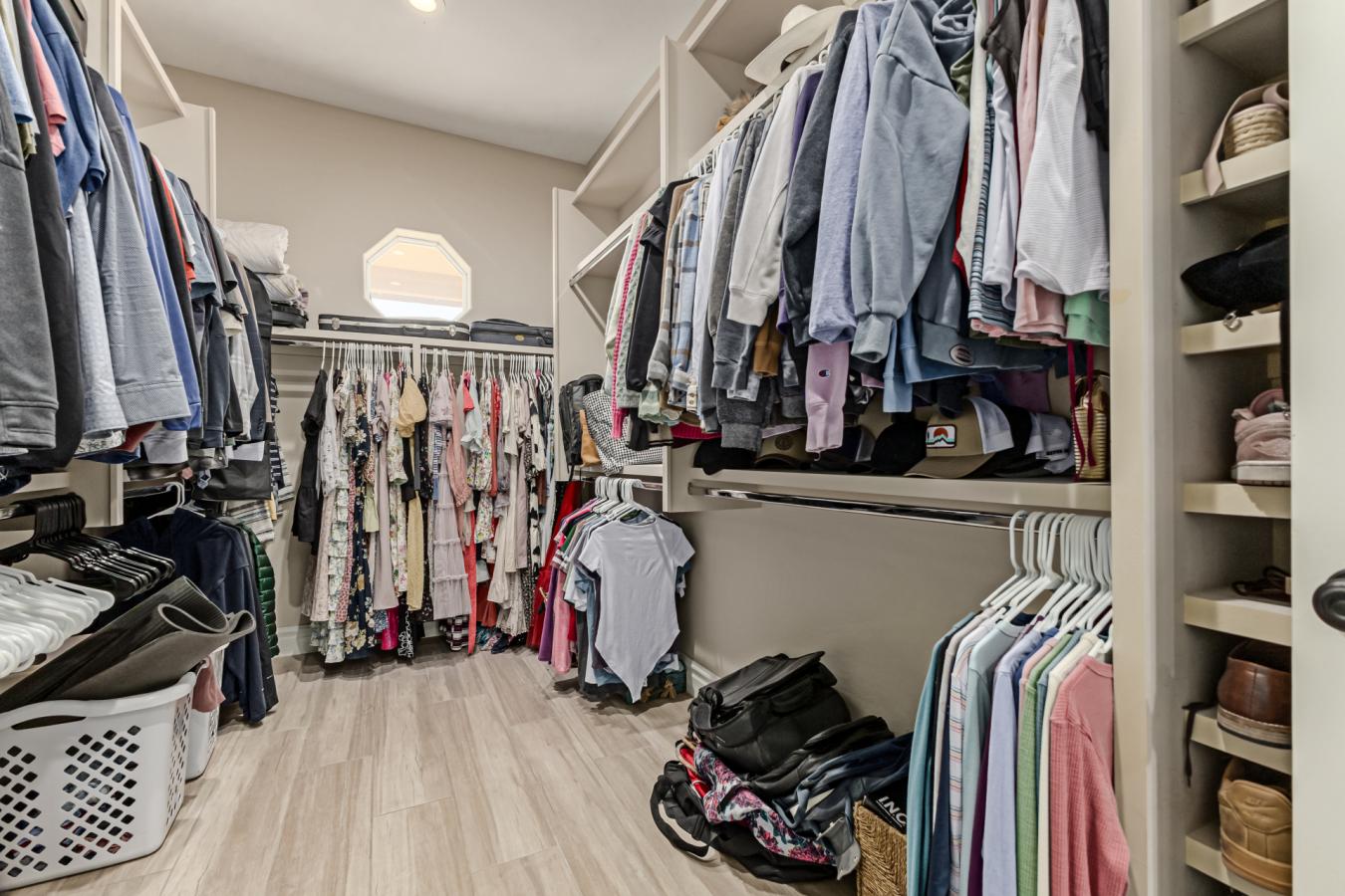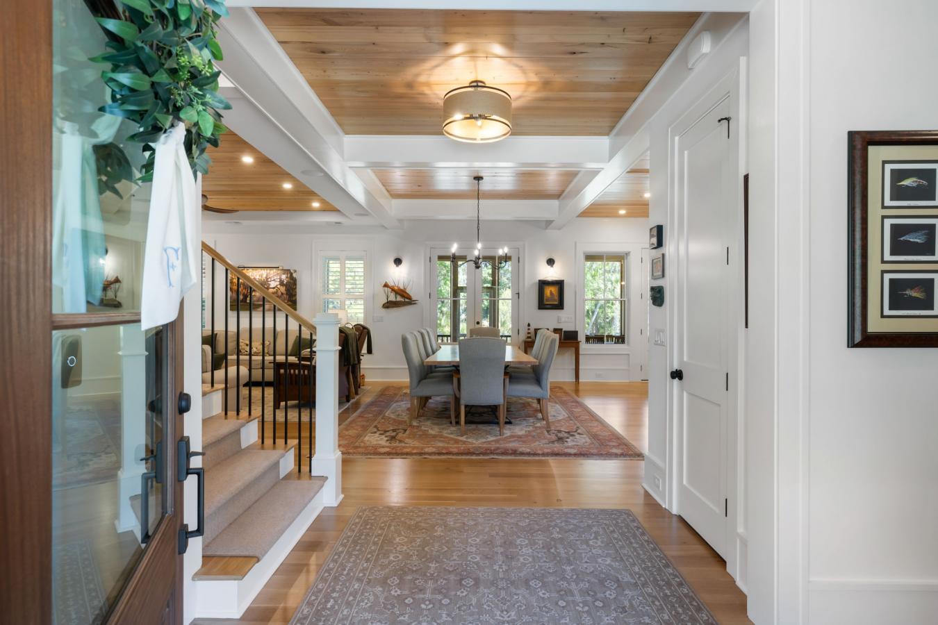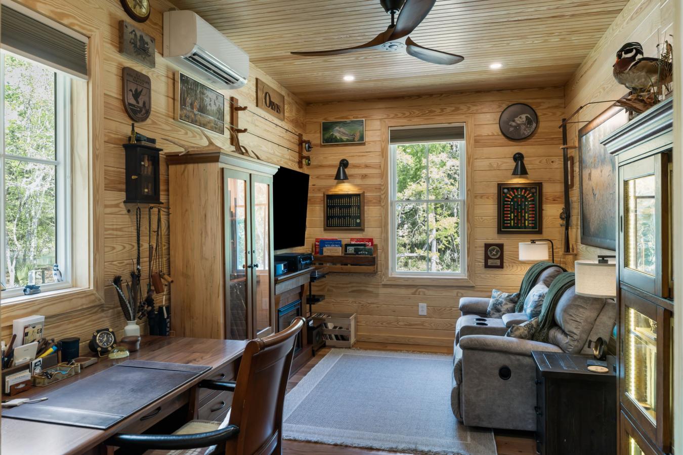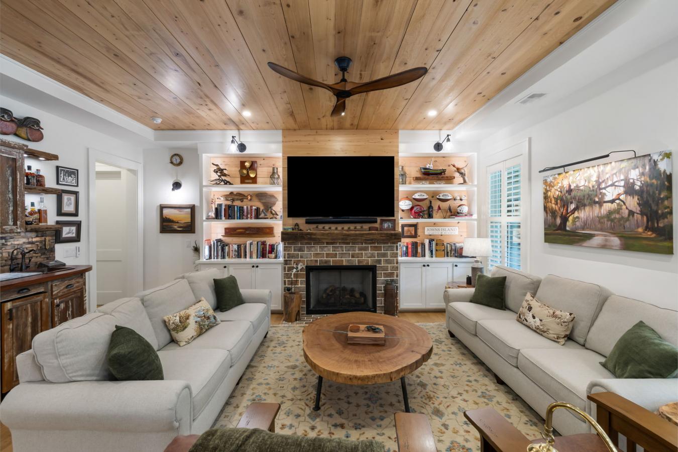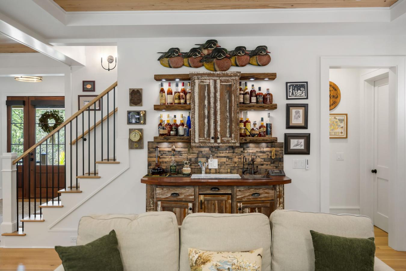 Classic Lowcountry, Briars Creek home situated on a very quiet, private cul de sac, overlooking fabulous views of Lake Sharon. This home has perfectly manicured landscaping, lake views, large backyard with room for a pool, lake access with dock, direct access to the nature trail, and the property backs up to a maritime preserve for privacy in perpetuity. This elevated home has hardiplank siding, metal roof, custom gutters, whole house water filter, whole house generator, and elevator. The interior has a bright open floor plan with white oak floors, custom trim and millwork throughout, surround sound speakers, recessed lighting, custom lighting, and custom cabinetry. The Living Room, Dining Room, and Kitchen are all open to one another and feature spectacular coffered ceilings with.Cypress shiplapped ceilings. The Living area has a gas fireplace with brick surround, and is flanked by custom lighted, built-in bookshelves and cabinetry, with heart pine backing, and portrait lights. There are french doors and plantation shutters leading out to the large screened porch. The kitchen has custom cabinetry to the ceiling, under cabinet lighting, leathered granite countertops, large kitchen island with lantern pendant lighting, marble subway tile backsplash, Thermador 6-burner gas range with custom hood, Thermador custom-paneled refrigerator. This kitchen has a ton of storage and is perfect for entertaining. There is a walk-in pantry with custom shelving, and a large laundry room just off the kitchen, with granite countertops, utility sink, Speed Queen washer and dryer, custom cabinetry, and under cabinet lighting. The laundry room has access to the back deck making it function like a mudroom. Also on the first floor is a utility room for extra storage and second refrigerator. The primary suite is located on the first floor and has a beautifully vaulted ceiling with Cypress shiplapping. The primary bathroom has dual vanities with quartz countertops, large "shower room" with windows for natural light, two separate shower heads and controls, and room for a free standing tub. There is a private water closet and linen closet as well. There is a private office that is part of the primary suite that features handsome, heart Pine shiplapping throughout. There is a guest suite on the first floor, with en suite bathroom with quartz countertops and tiled shower. Upstairs there are two guest bedrooms with their own en suite bathrooms as well as a media room and upstairs landing area that can also be used as an upstairs den. This home has incredible outdoor living spaces. It has a spacious screened porch that has beadboard ceiling, outdoor speakers, a living area with TV, dining area, hammock spot, and grilling area, all overlooking the perfectly landscaped backyard and Lake Sharon views. Underneath the back deck is a large covered patio for additional lounge spaces. There is a dedicated fire pit area and plenty of room to add a pool. There is a pathway to the Lake and dock as well as a fun sitting area with Adirondack chairs overlooking the Lake. This home has a tankless water heater and whole house generator has a 1,000 gallon buried propane tank. The garage is completely enclosed and temperature controlled with capability to add a shower or pool bath, and plenty of room for storage and a workshop. This home is a classic for Briars Creek living!