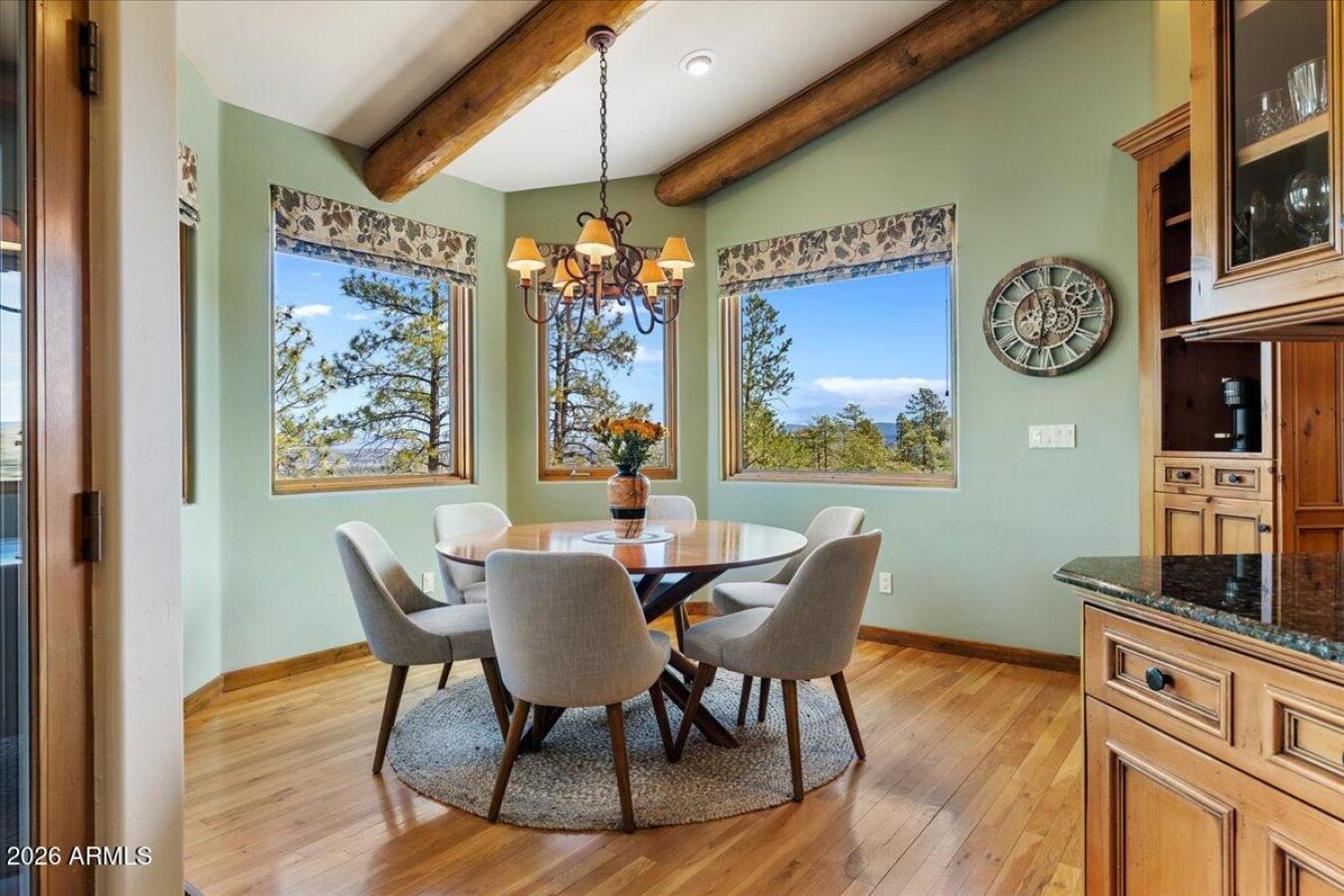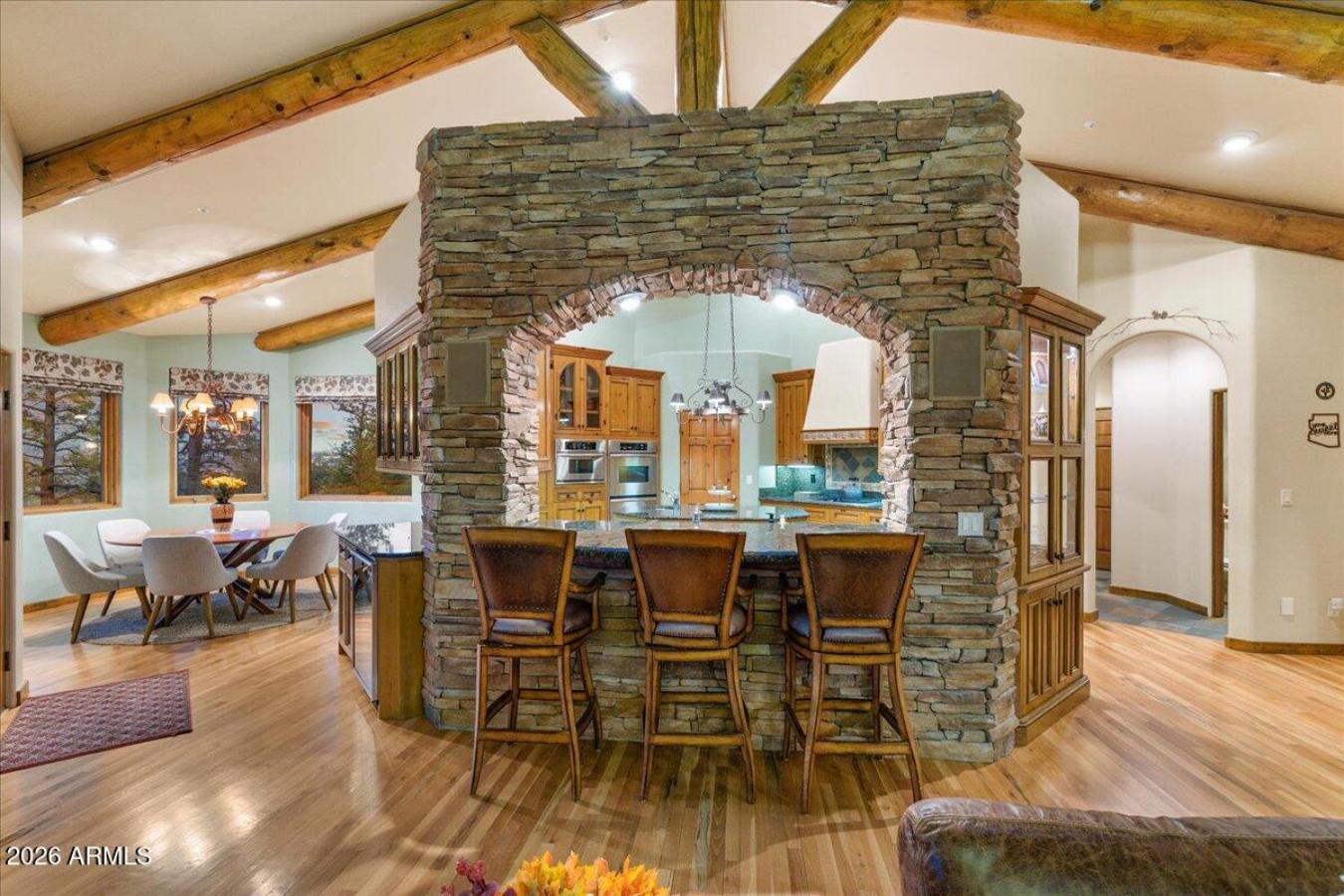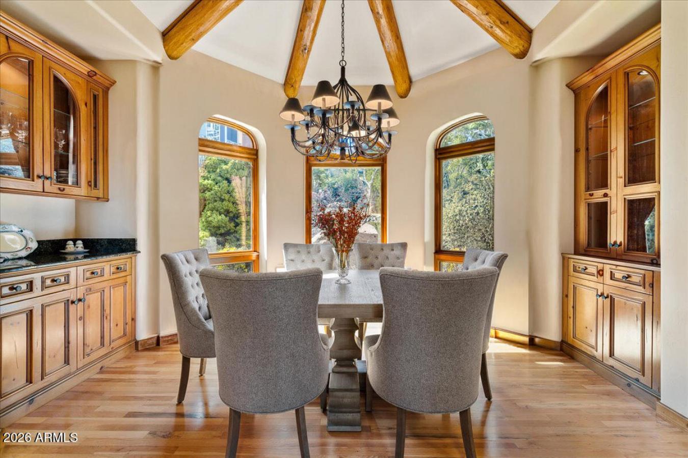 Tucked behind the main gates of the prestigious Hassayampa Village Community, this beautifully crafted mountain retreat rests on a private .60-acre homesite embraced by towering pines and striking granite boulders, with sweeping views of Thumb Butte and the distant San Francisco Peaks. Enhancing both privacy and opportunity, the adjacent .45-acre homesite to the east is being offered together with the property, while the parcel to the west is owned by the neighboring homeowner-creating a rare buffer of open space on both sides. A level driveway and an additional third parking space add everyday convenience, complementing the oversized two-car garage. The custom front door sets a welcoming tone, offering a glimpse of the warm, rustic elegance that continues throughout the home. Inside, the dramatic great room immediately captures attention with its soaring ceilings, exposed beams, expansive windows, and skylights that bathe the space in natural light while perfectly framing the surrounding mountain landscape. Rich hardwood floors, natural stone accents, and one of three impressive fireplaces create an inviting atmosphere that feels both grand and intimate, an ideal setting for cozy evenings or lively gatherings. The kitchen blends craftsmanship and function with abundant custom cabinetry, granite countertops, and premium appliances, including double ovens and a cabinet-front refrigerator/freezer for a seamless look. A spacious walk-in pantry provides ample storage, while the breakfast area and casual breakfast bar enjoy scenic views that make even everyday meals feel special. The formal dining room adds architectural character with its distinctive octagonal ceiling and peeled-pole beams, creating a warm, lodge-inspired ambiance perfect for intimate dinners and memorable celebrations. The primary suite offers a peaceful escape, featuring a vaulted, beamed ceiling and its own gas fireplace with a stone surround that enhances the rustic mountain charm. Large windows invite in serene views, while the spacious ensuite bath is thoughtfully appointed with a custom-tiled shower, dual vanities, a generous soaking tub, and dual walk-in closets complete with custom built-ins. On the main level, you will also find a second bedroom, an office with a beautifully crafted built-in desk, a powder room, and well-designed full bathrooms that reflect the homes consistent quality and attention to detail. The laundry room is both practical and convenient, featuring its own refrigerator and direct access to the deck. The lower level provides exceptional flexibility, making it well-suited for guests or multi-generational living. A comfortable family room with a wet bar and bar refrigerator offers the option for a convenient kitchenette setup. The adjoining bedroom includes an ensuite bath with a shower/tub combination and a travertine tile surround. Brand-new luxury vinyl flooring runs throughout the lower level, which also includes ample storage space. From the family room, step outside to a private patio nestled among the boulders, offering a quiet, sheltered outdoor retreat. Outdoor living is equally compelling. The expansive rear deck captures breathtaking 180-degree views and features both covered and open areas, a gas fireplace, a built-in BBQ, and a sunken spa, perfect for relaxing under crisp mountain skies. Located within walking distance of the Capital Canyon Clubhouse, restaurant, and golf course, this meticulously maintained Hassayampa home embodies refined mountain living, where privacy, craftsmanship, and unforgettable views come together in perfect harmony.