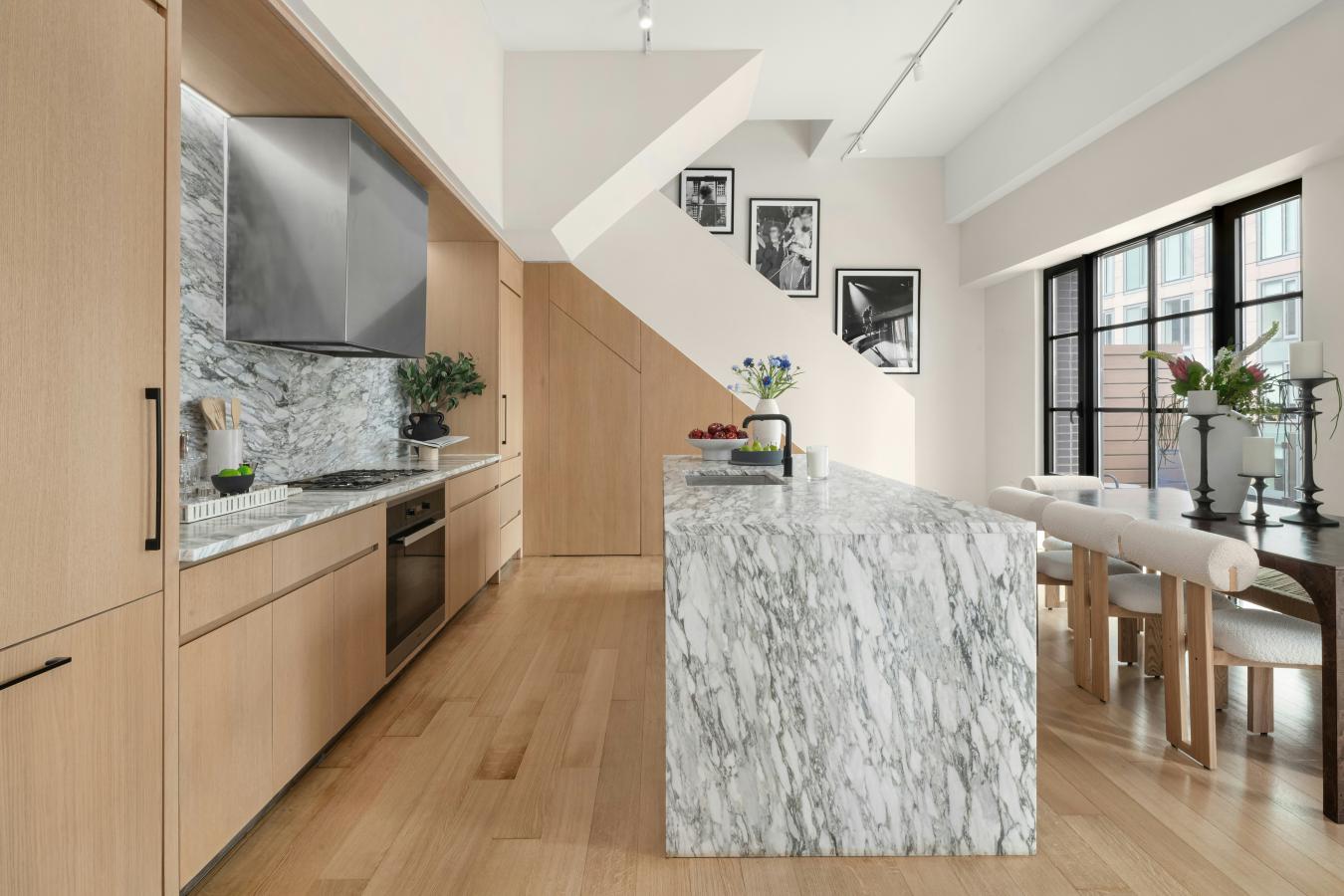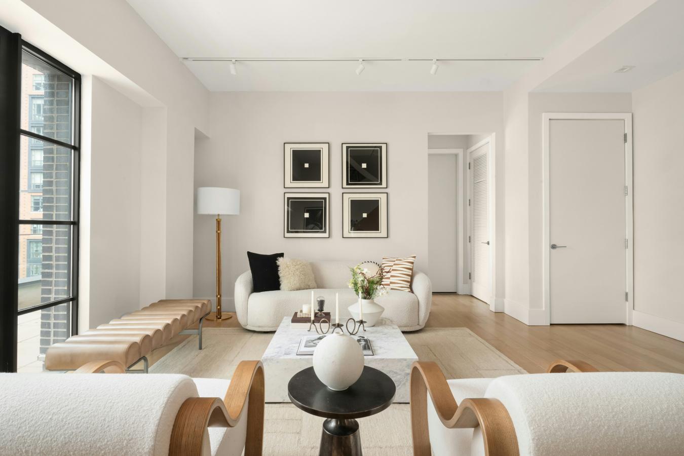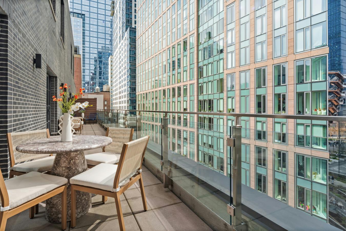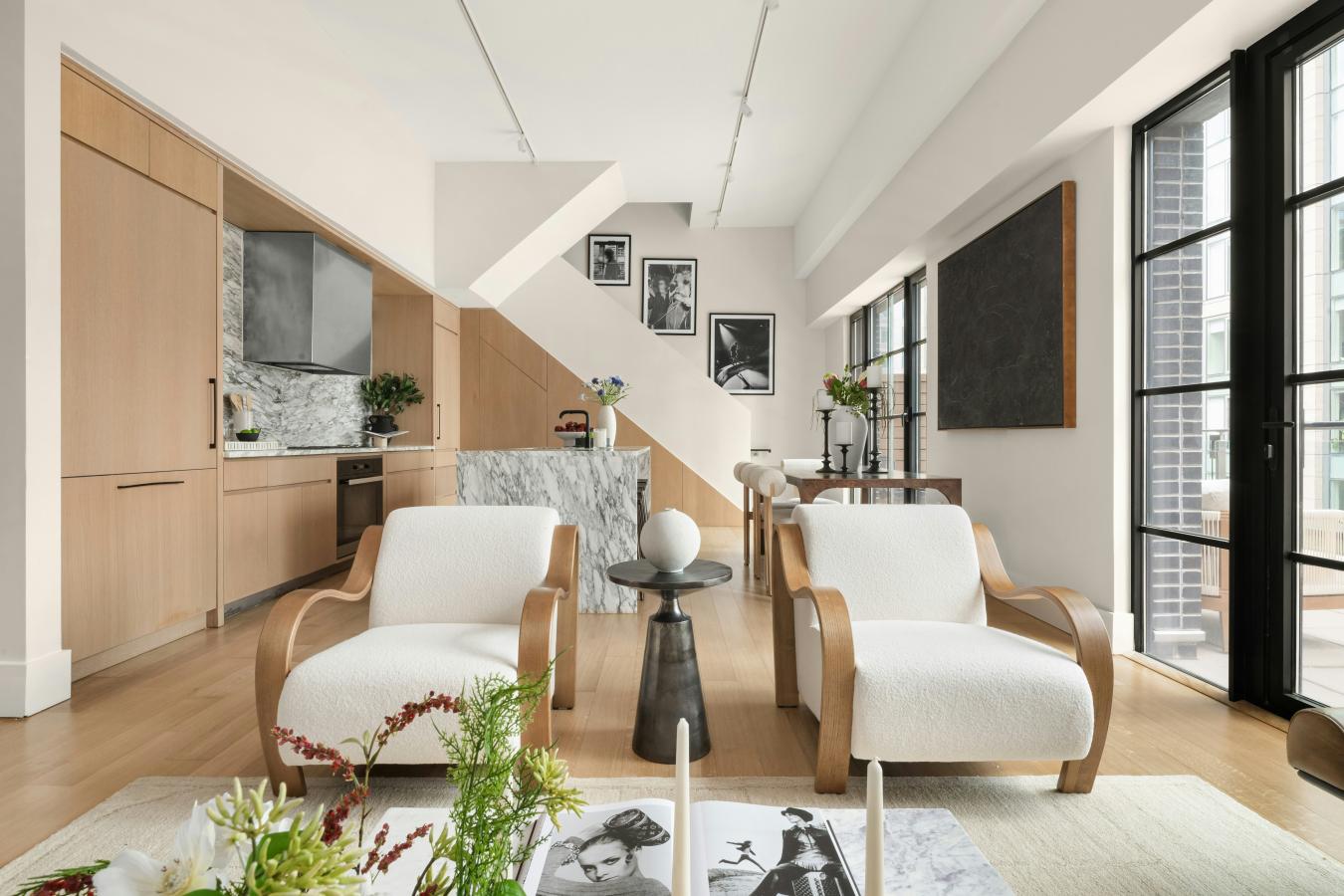 The Penthouse at 517 West 29th Street offers a rare combination of scale, design, and outdoor living, unfolding across a beautifully composed two-bedroom, two-bathroom duplex. With approximately 1,645 square feet of interior space and soaring 12-foot ceilings, this home has an airy, loft-like feel. Oversized windows capture sweeping skyline views and a direct vantage over the High Line. Two private terraces-totaling 685 square feet-create a seamless indoor-outdoor experience, ideal for entertaining or simply enjoying the city from above. The kitchen is both striking and functional, anchored by a dramatic 9-foot waterfall island finished in honed Arabescato Bluette marble and complemented by custom Italian cabinetry from Uno Contract. A full suite of Miele appliances includes a 36-inch natural gas five-burner cooktop, vented 36-inch slide-out range hood, and integrated wine storage with a 34-bottle XO glass-framed cooler. Throughout the residence, 6-inch-wide Russian white oak plank flooring and LED track lighting add warmth and a clean, modern continuity. Bathrooms are thoughtfully appointed with a refined mix of materials and finishes, featuring Waterworks fixtures, showers lined in Allure Gray marble tile with five-foot linear infinity drains, and walls wrapped in Pelle Grigio Vein marble. Custom vanities by Uno Contract are topped with Calacatta Lincoln marble, bringing a cohesive elegance to each space. The home also includes an LG ultra-large capacity smart Wi-Fi-enabled washer and a vented dryer. Residents of 517 West 29th Street enjoy a full-time attended lobby, a Jonathan Adler-designed Wi-Fi lounge, and a sunlit, fully equipped fitness center. Additional amenities include a landscaped courtyard with BBQ, lounge, and dining areas, as well as a rooftop sun deck with river views. Indoor and outdoor garage parking is available for purchase. Situated within a boutique 60-unit condominium, this striking new development places you moments from the High Line, Hudson Yards, and some of the citys best dining, shopping, and cultural destinations-delivering a polished, elevated take on modern Manhattan living.