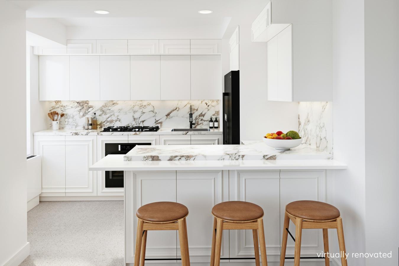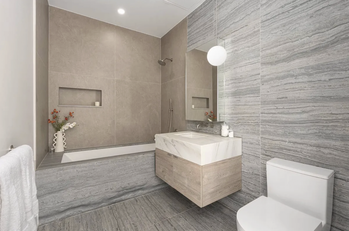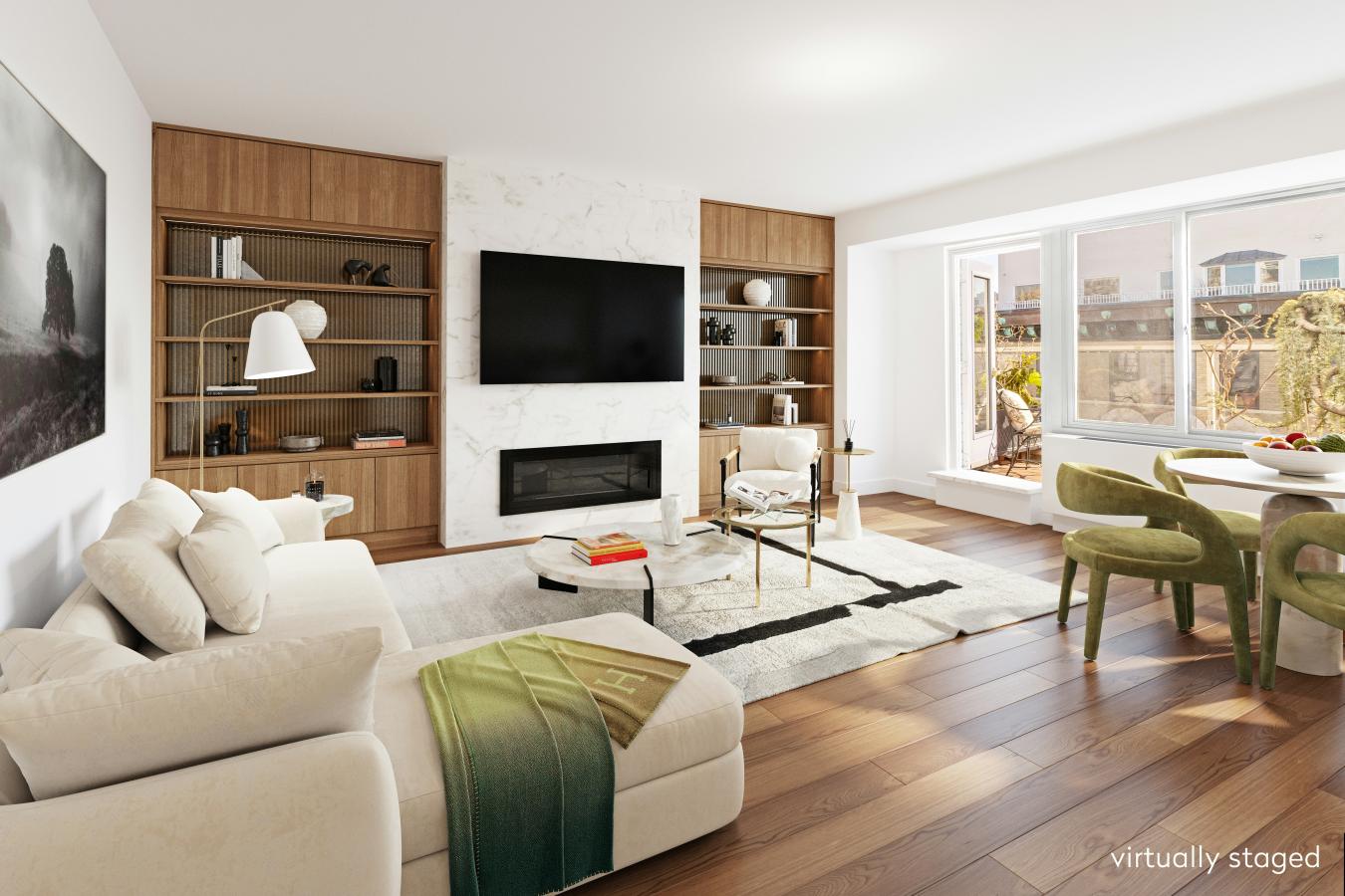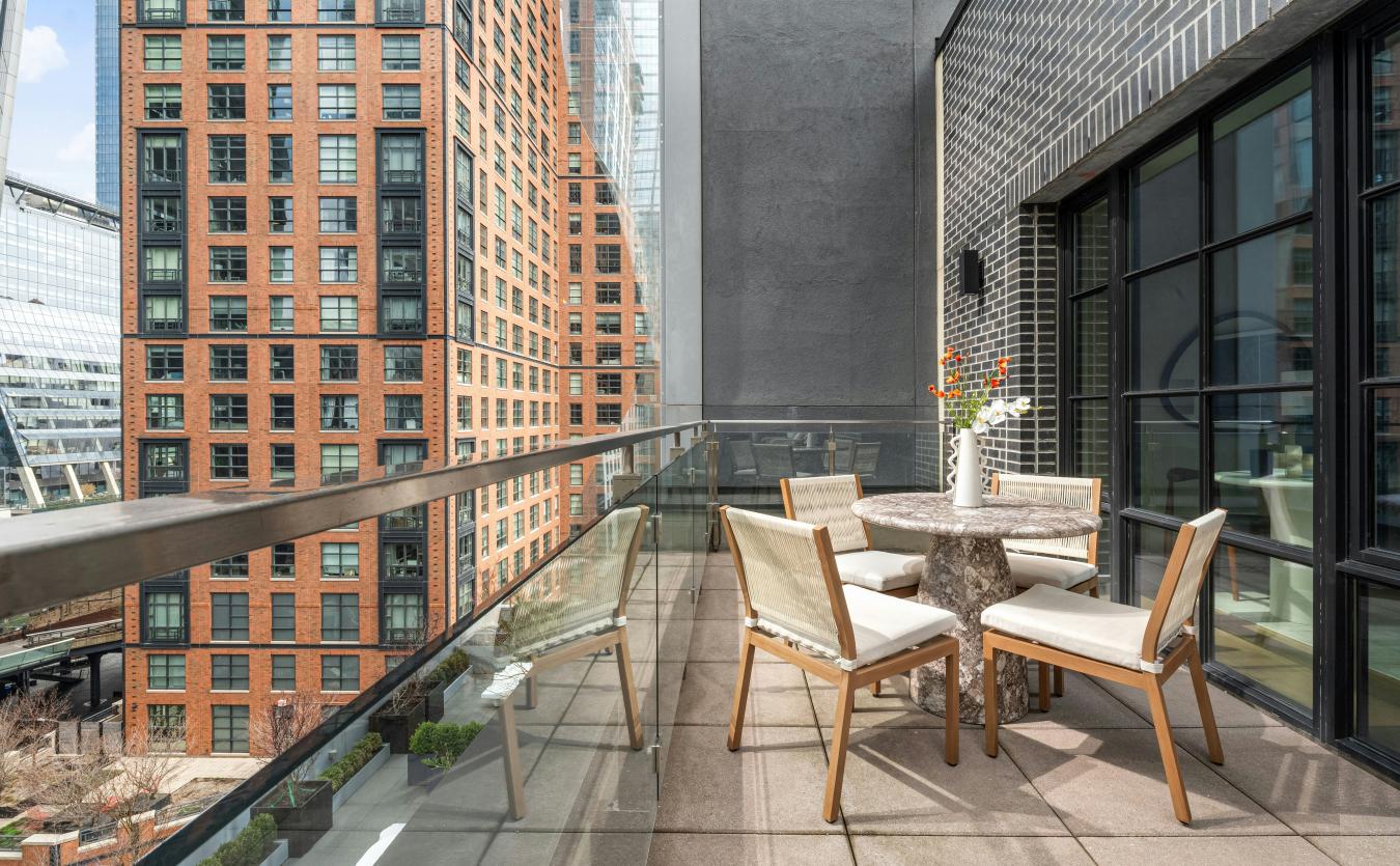 The Penthouse at 517 West 29th Street offers a rare combination of scale, design, and outdoor living, unfolding across a beautifully composed two-bedroom, two-bathroom duplex. With approximately 1,645 square feet of interior space and soaring 12-foot ceilings, this home has an airy, loft-like feel. Oversized windows capture sweeping skyline views and a direct vantage over the High Line. Two private terraces-totaling 685 square feet-create a seamless indoor-outdoor experience, ideal for entertaining or simply enjoying the city from above. The kitchen is both striking and functional, anchored by a dramatic 9-foot waterfall island finished in honed Arabescato Bluette marble and complemented by custom Italian cabinetry from Uno Contract. A full suite of Miele appliances includes a 36-inch natural gas five-burner cooktop, vented 36-inch slide-out range hood, and integrated wine storage with a 34-bottle XO glass-framed cooler. Throughout the residence, 6-inch-wide Russian white oak plank flooring and LED track lighting add warmth and a clean, modern continuity. Bathrooms are thoughtfully appointed with a refined mix of materials and finishes, featuring Waterworks fixtures, showers lined in Allure Gray marble tile with five-foot linear infinity drains, and walls wrapped in Pelle Grigio Vein marble. Custom vanities by Uno Contract are topped with Calacatta Lincoln marble, bringing a cohesive elegance to each space. The home also includes an LG ultra-large capacity smart Wi-Fi-enabled washer and a vented dryer. Residents of 517 West 29th Street enjoy a full-time attended lobby, a Jonathan Adler-designed Wi-Fi lounge, and a sunlit, fully equipped fitness center. Additional amenities include a landscaped courtyard with BBQ, lounge, and dining areas, as well as a rooftop sun deck with river views. Indoor and outdoor garage parking is available for purchase. Situated within a boutique 60-unit condominium, this striking new development places you moments from the High Line, Hudson Yards, and some of the citys best dining, shopping, and cultural destinations-delivering a polished, elevated take on modern Manhattan living.