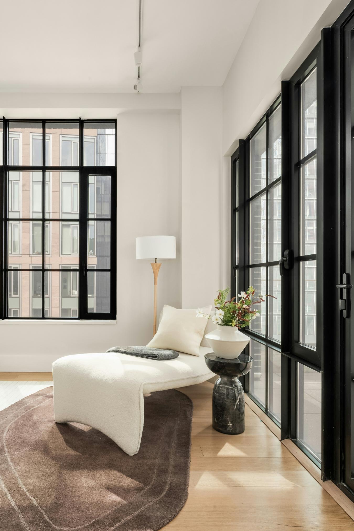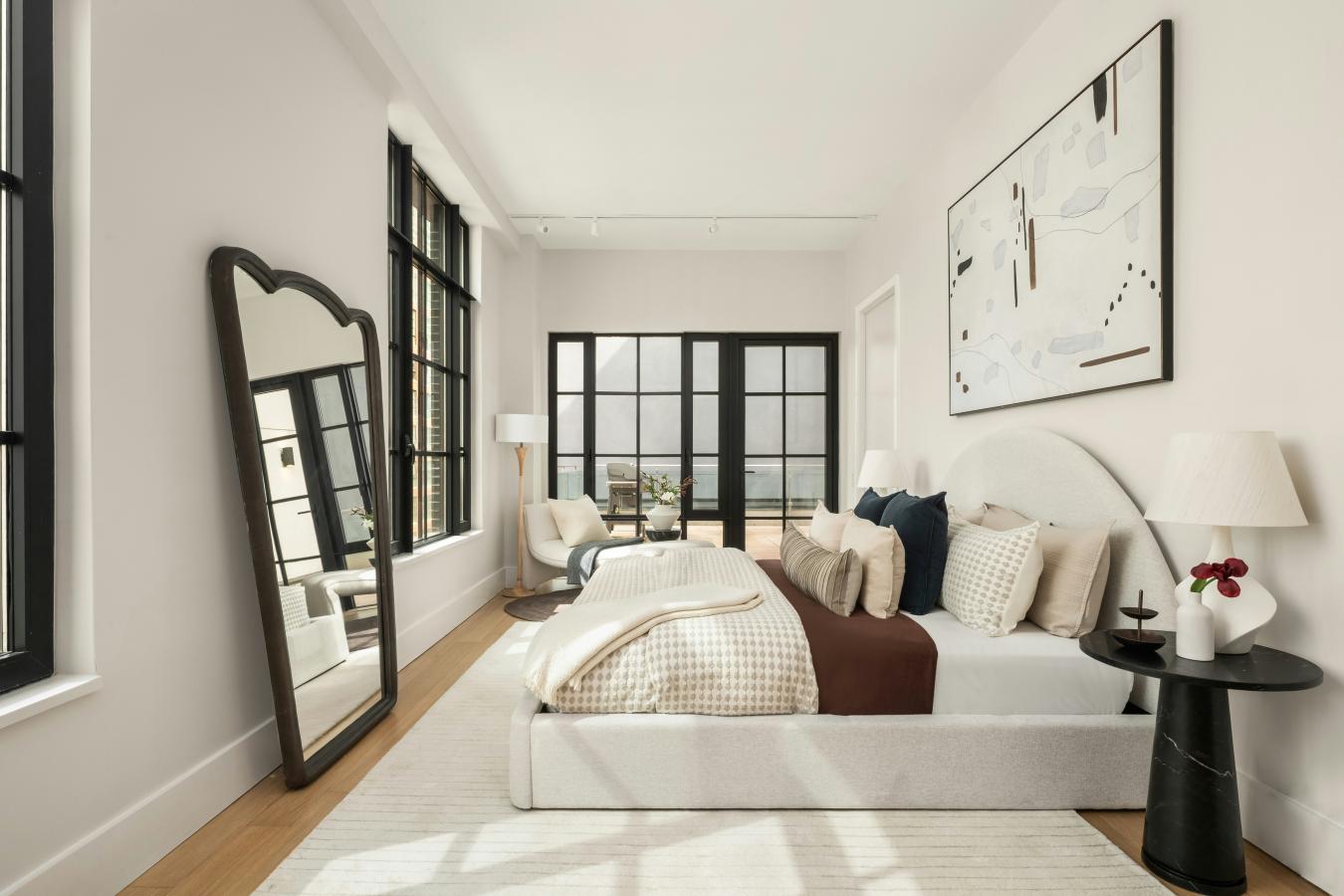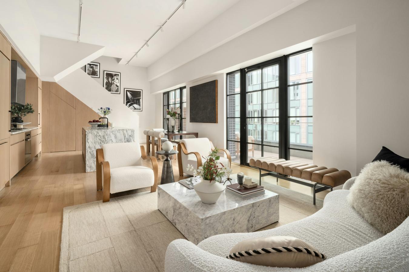 The Penthouse at 517 West 29th Street offers a rare combination of scale, design, and outdoor living, unfolding across a beautifully composed two-bedroom, two-bathroom duplex. With approximately 1,645 square feet of interior space and soaring 12-foot ceilings, this home has an airy, loft-like feel. Oversized windows capture sweeping skyline views and a direct vantage over the High Line.