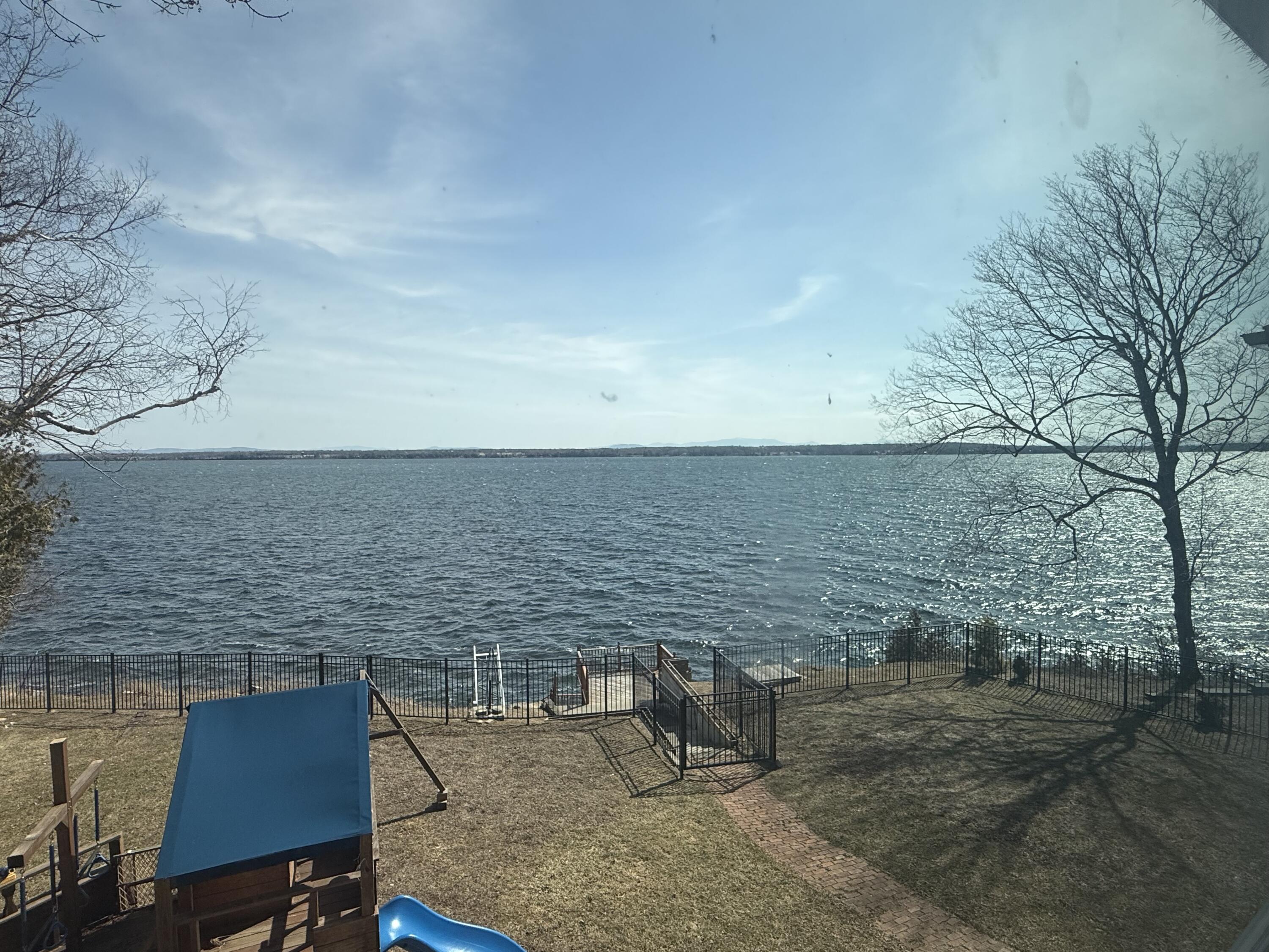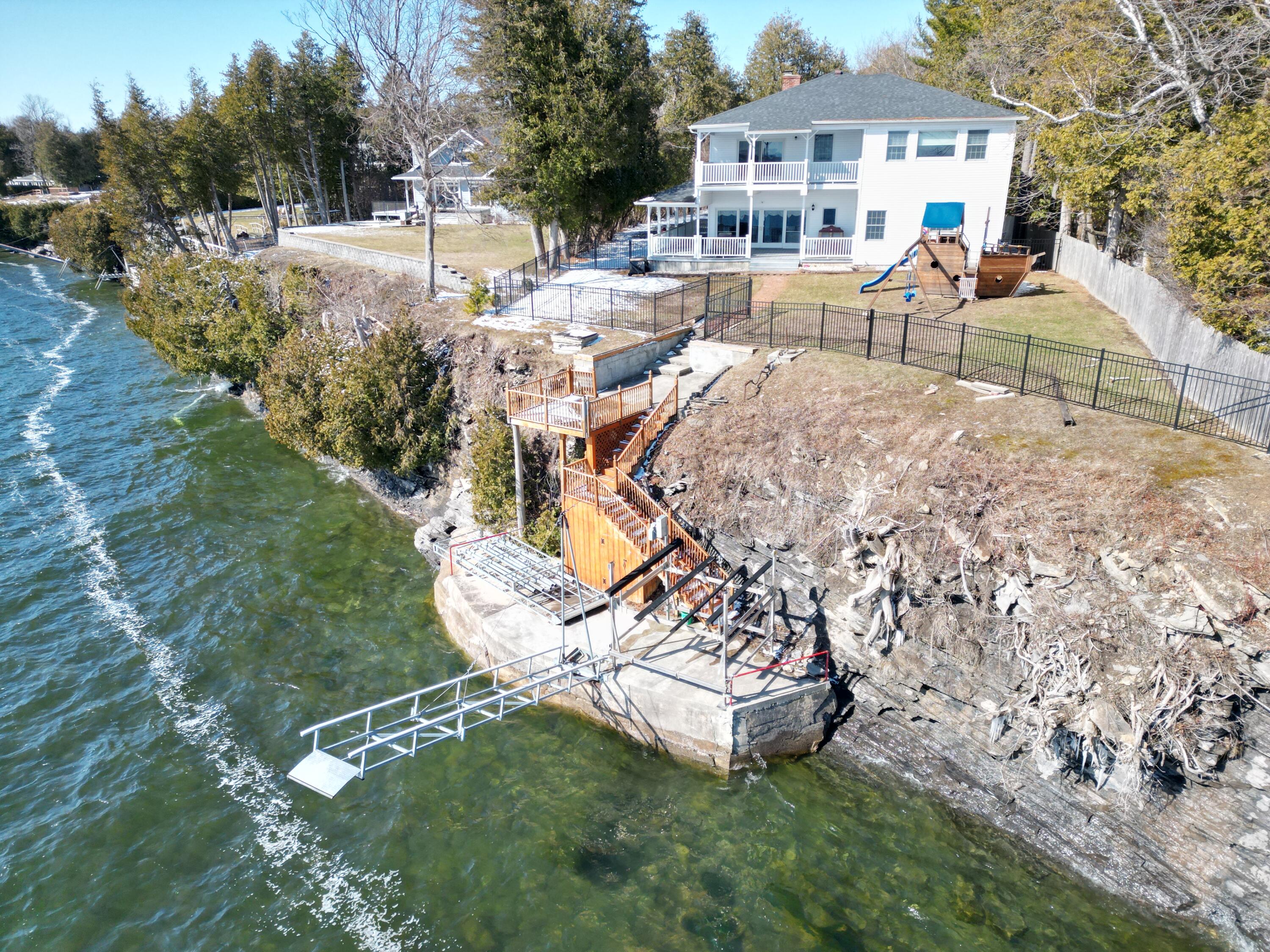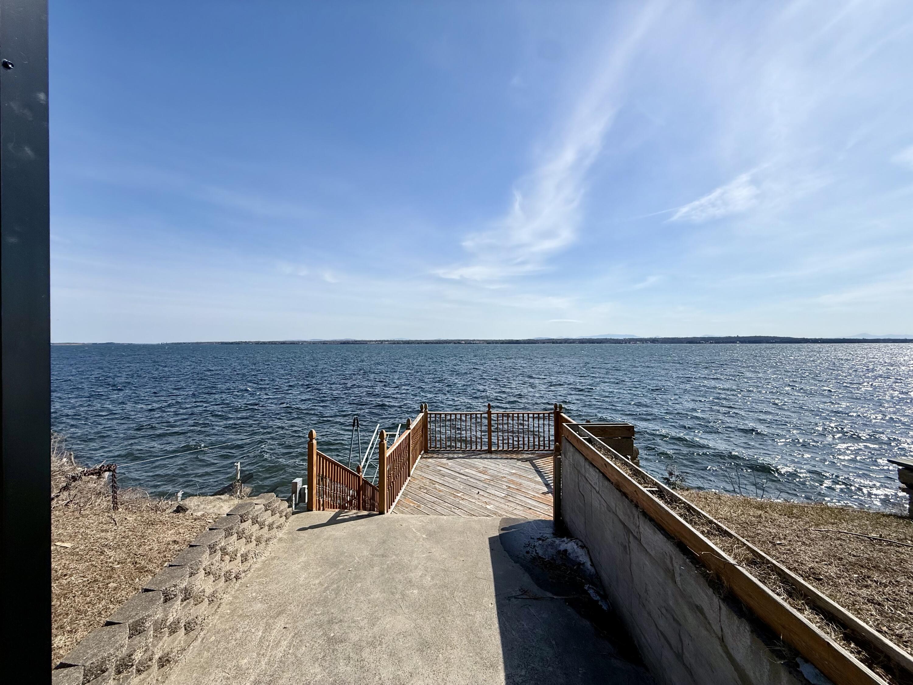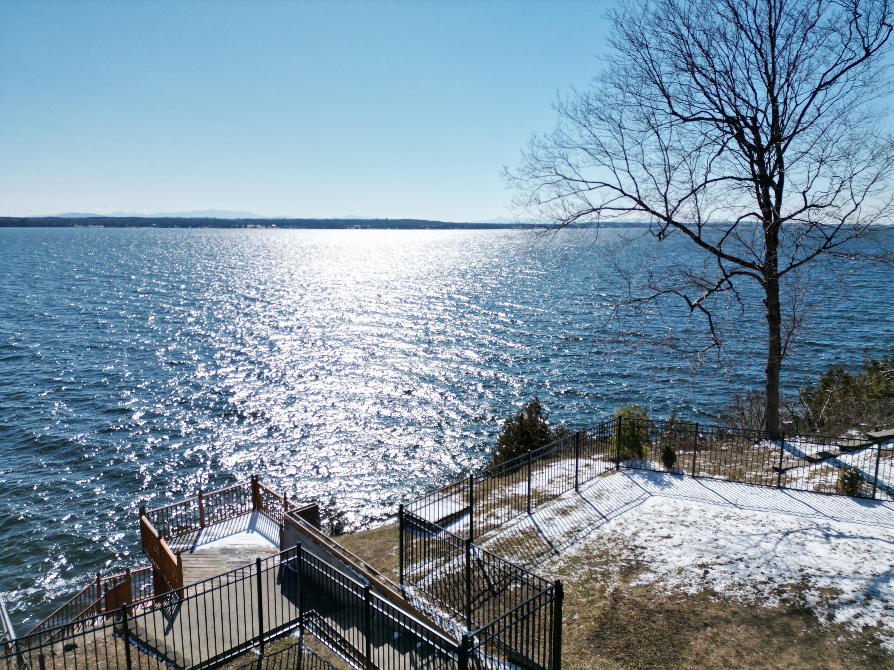 Experience the best of lakefront living on the shores of Lake Champlain, where every day feels like a retreat and every space is designed for both relaxed living and unforgettable entertaining. The first floor welcomes you with elegant Italian tile flooring and a spacious living room centered around a cozy fireplace, all framed by stunning lake views. Expansive glass doors open to a porch, creating a seamless indoor-outdoor flow--perfect for morning coffee by the water or hosting guests at sunset. The kitchen is a true gathering space, featuring quartz countertops, a gas stovetop, and double wall ovens, all open to the dining area with breathtaking views of the lake and surrounding mountains. Large sliding doors lead to the deck, making entertaining effortless while embracing the beauty of waterfront living. A first-floor bedroom, half bath with new vanity and sink, and a convenient new full bath with laundry complete this level. Upstairs, new hardwood flooring enhances a bright and inviting family room with sliding doors that lead to a spacious upper deck--an ideal spot to unwind and take in panoramic lake views. The primary suite offers a private retreat with its own bathroom and a generous walk-in closet. Two additional bedrooms and a full bath provide ample space for everyday living or guests. Lake access stairs lead to dock and solar powered hydraulic boat lift. New septic system. See feature sheet for all upgrades. Close to Ferry to Vermont. Home has audio/video surveillance.
