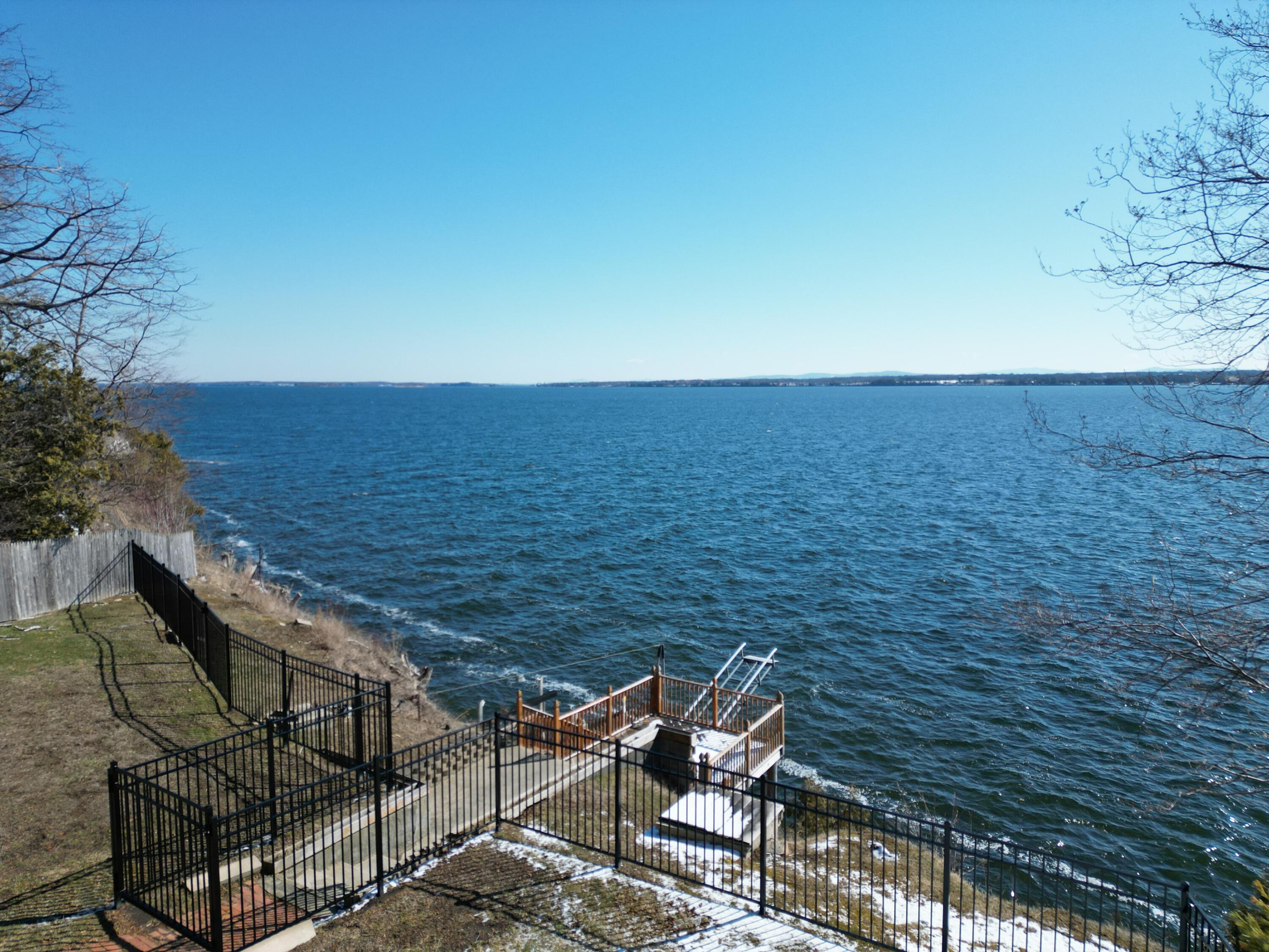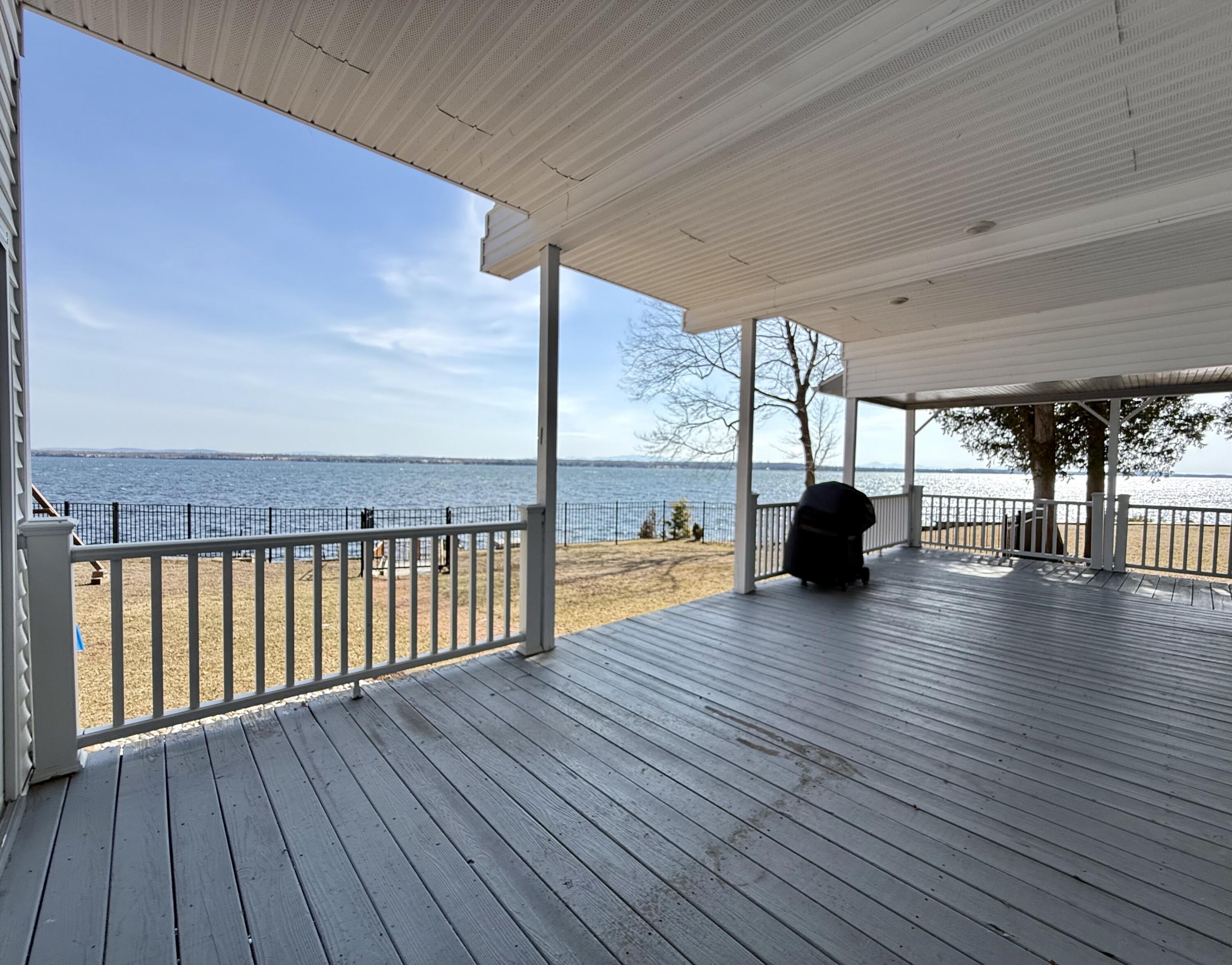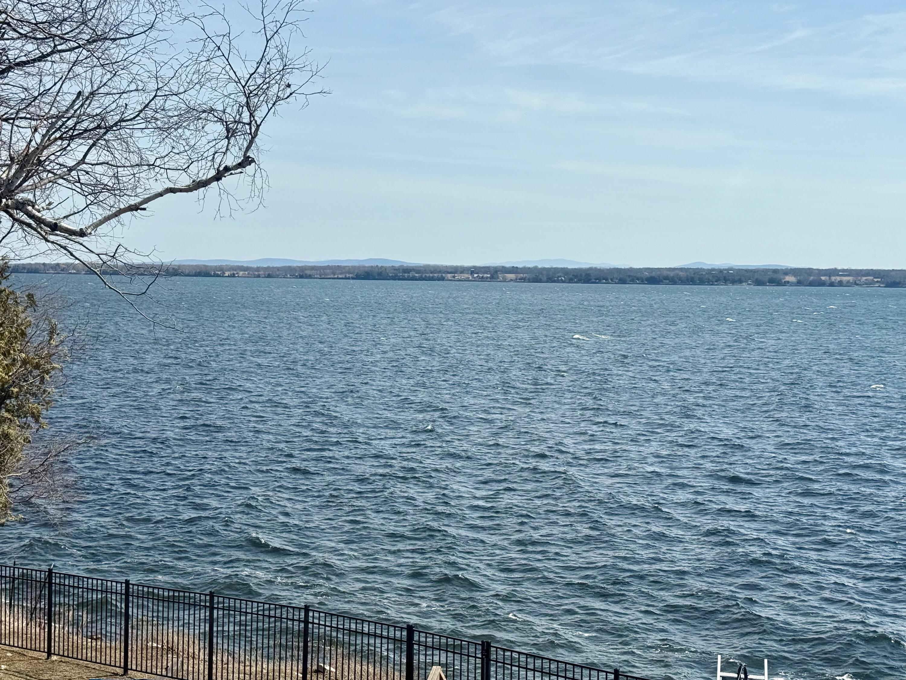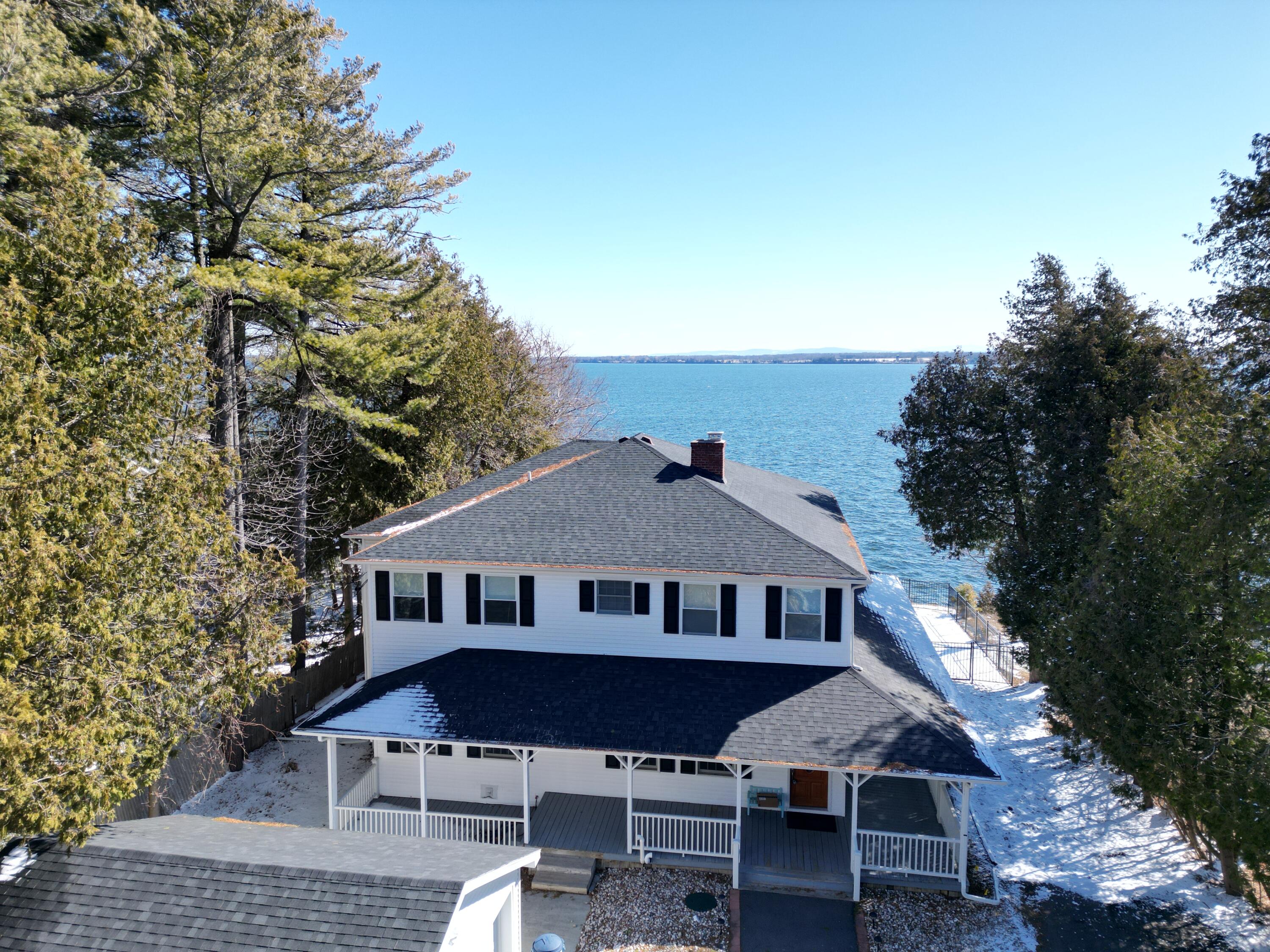 Experience the best of lakefront living on the shores of Lake Champlain, where every day feels like a retreat and every space is designed for both relaxed living and unforgettable entertaining. The first floor welcomes you with elegant Italian tile flooring and a spacious living room centered around a cozy fireplace, all framed by stunning lake views. Expansive glass doors open to a porch, creating a seamless indoor-outdoor flow--perfect for morning coffee by the water or hosting guests at sunset. The kitchen is a true gathering space, featuring quartz countertops, a gas stovetop, and double wall ovens, all open to the dining area with breathtaking views of the lake and surrounding mountains. Large sliding doors lead to the deck, making entertaining effortless while embracing the beauty of waterfront living. A first-floor bedroom, half bath with new vanity and sink, and a convenient new full bath with laundry complete this level. Upstairs, new hardwood flooring enhances a bright and inviting family room with sliding doors that lead to a spacious upper deck--an ideal spot to unwind and take in panoramic lake views. The primary suite offers a private retreat with its own bathroom and a generous walk-in closet. Two additional bedrooms and a full bath provide ample space for everyday living or guests. Lake access stairs lead to dock and solar powered hydraulic boat lift. New septic system. See feature sheet for all upgrades. Close to Ferry to Vermont. Home has audio/video surveillance.