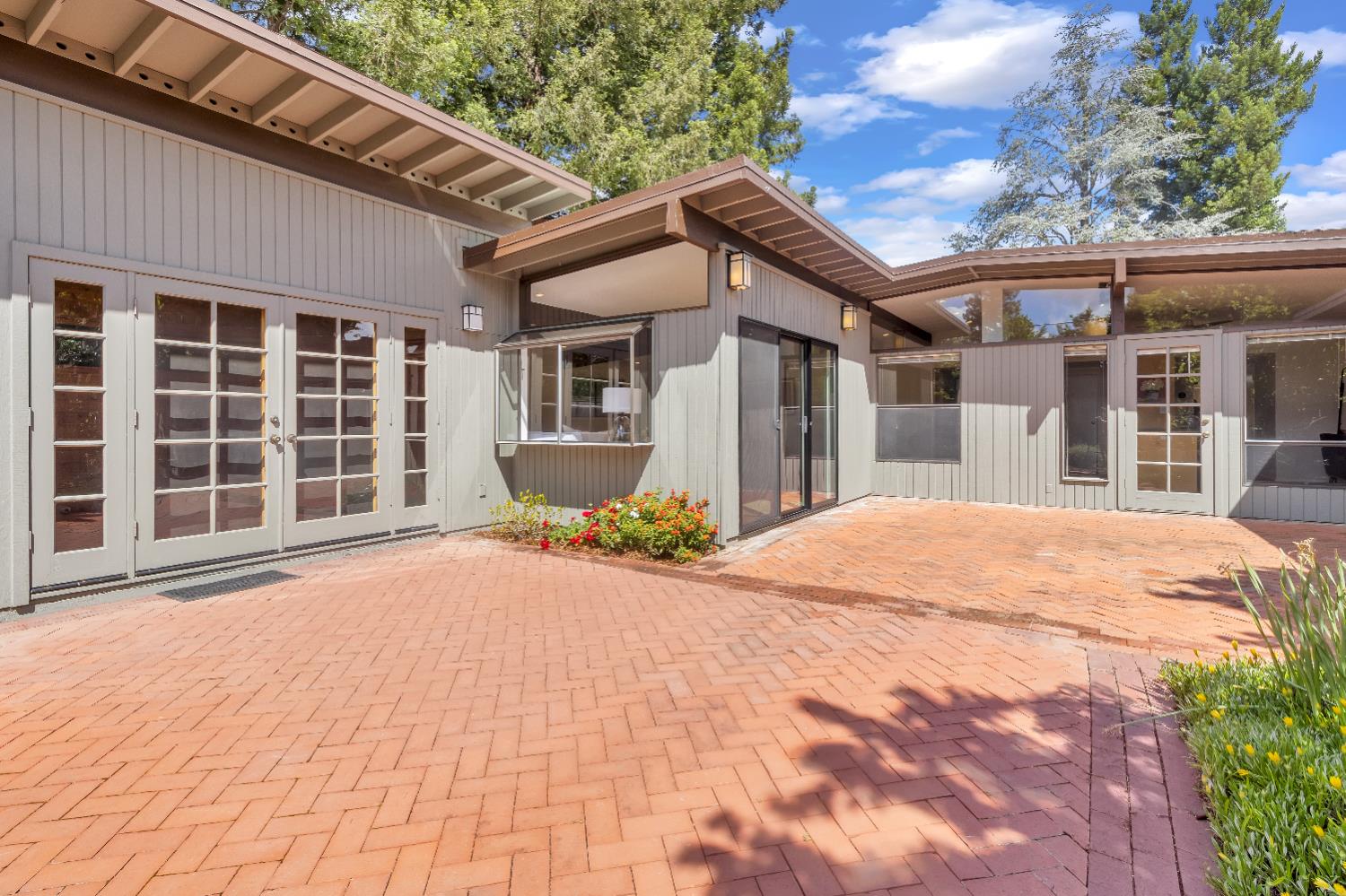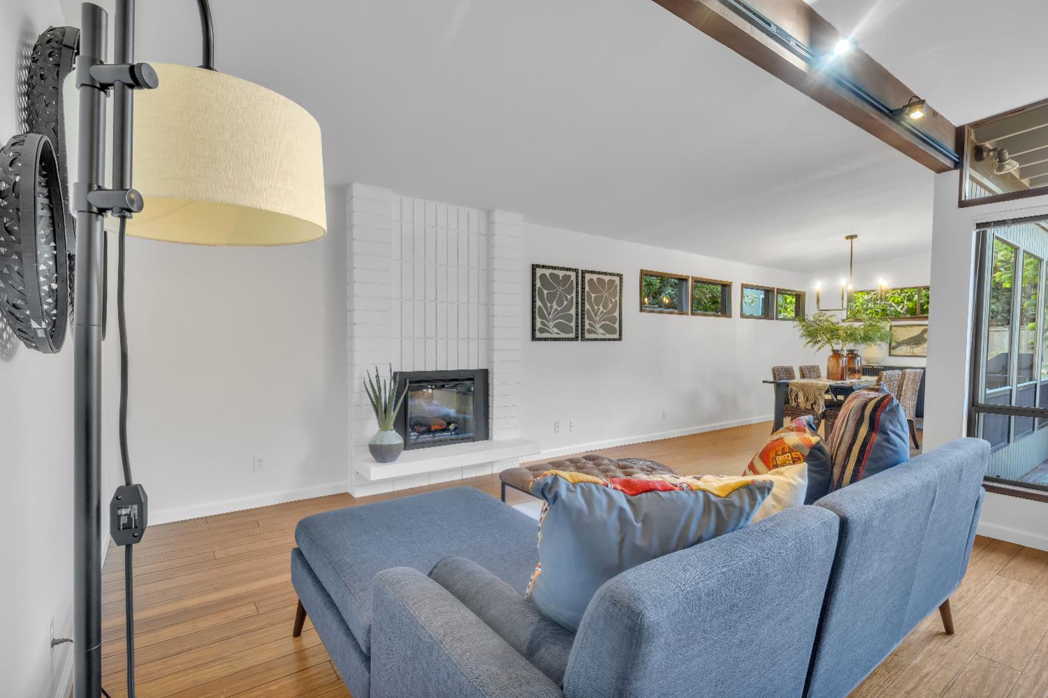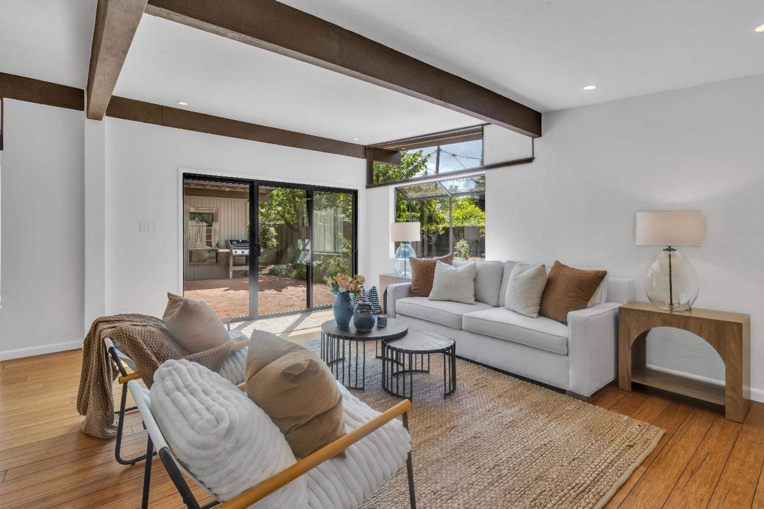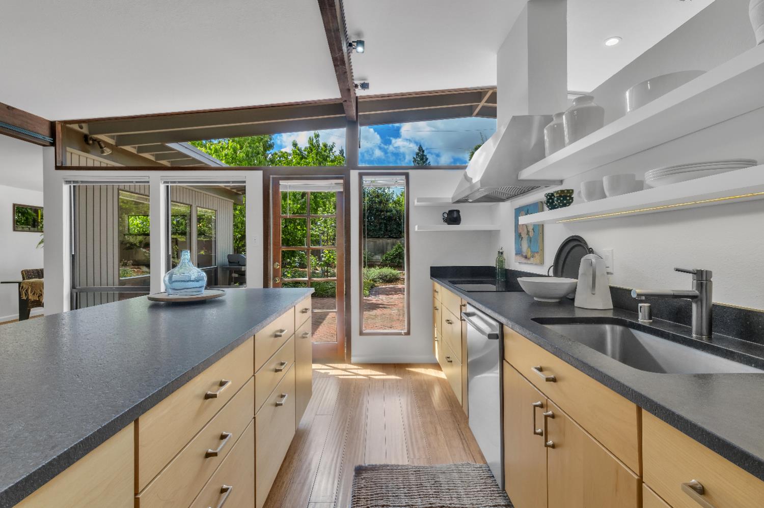 A signature Streng Brothers mid-century modern design, ideally located in one of Daviss most sought-after neighborhoods along the Davis Bike Loop - just a short walk to Willett and Cesar Chavez Elementary and offering quick access to UC Davis and downtown. This 4-bedroom, 2-bathroom home spans 2,151 square feet, showcasing the timeless architectural elements Streng homes are known for. Floor-to-ceiling windows and skylights flood the interior with natural light, creating a seamless connection between indoor and outdoor living. The functional layout includes both formal living and family rooms, offering flexibility for entertaining and everyday living. The remodeled kitchen features leathered granite countertops and an upgraded induction cooktop - perfect for those who love to cook. A raised hearth fireplace with a new insert anchors the living space, adding warmth and character. The spacious primary suite serves as a private retreat, complete with a walk-in closet and a beautifully remodeled bathroom. Secondary bedrooms are generously sized with ample closet space, and a large indoor laundry and utility room adds everyday convenience. Upgrades include interior and exterior paint, a new roof, energy-efficient heat pump, and an owned 5.6 kW solar system for improved efficiency and sustainability. The backyard offers incredible versatility, featuring a large, finished space ideal for a workshop, craft studio, or potential hot tub room. An attached one-car garage provides additional storage. Combining iconic mid-century design, thoughtful updates, and an unbeatable location, this home is a rare opportunity to own a true Davis classic.