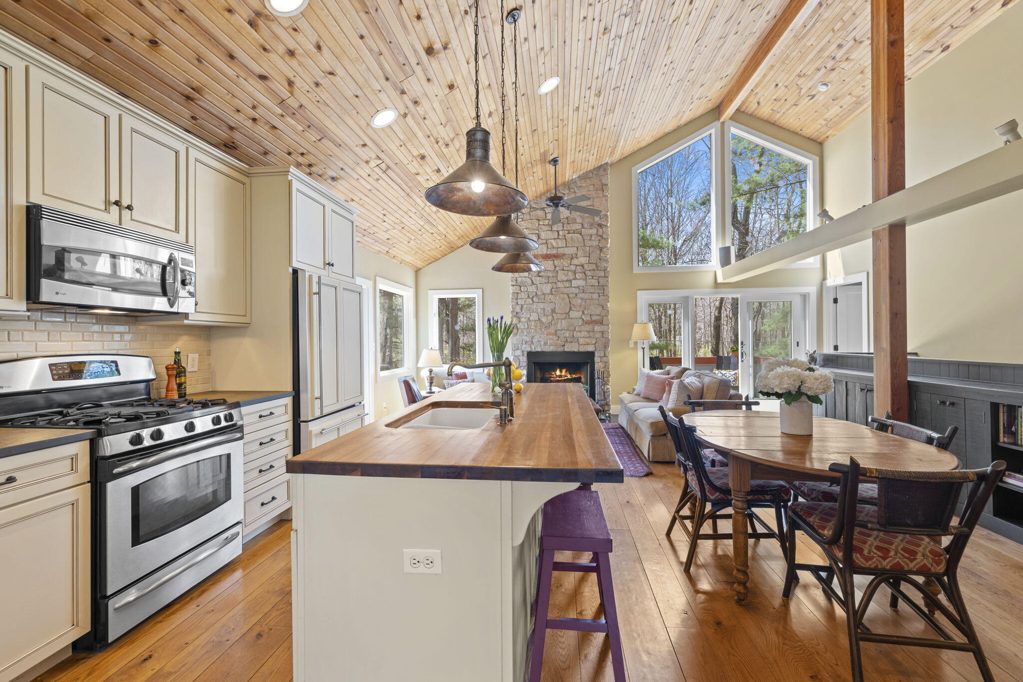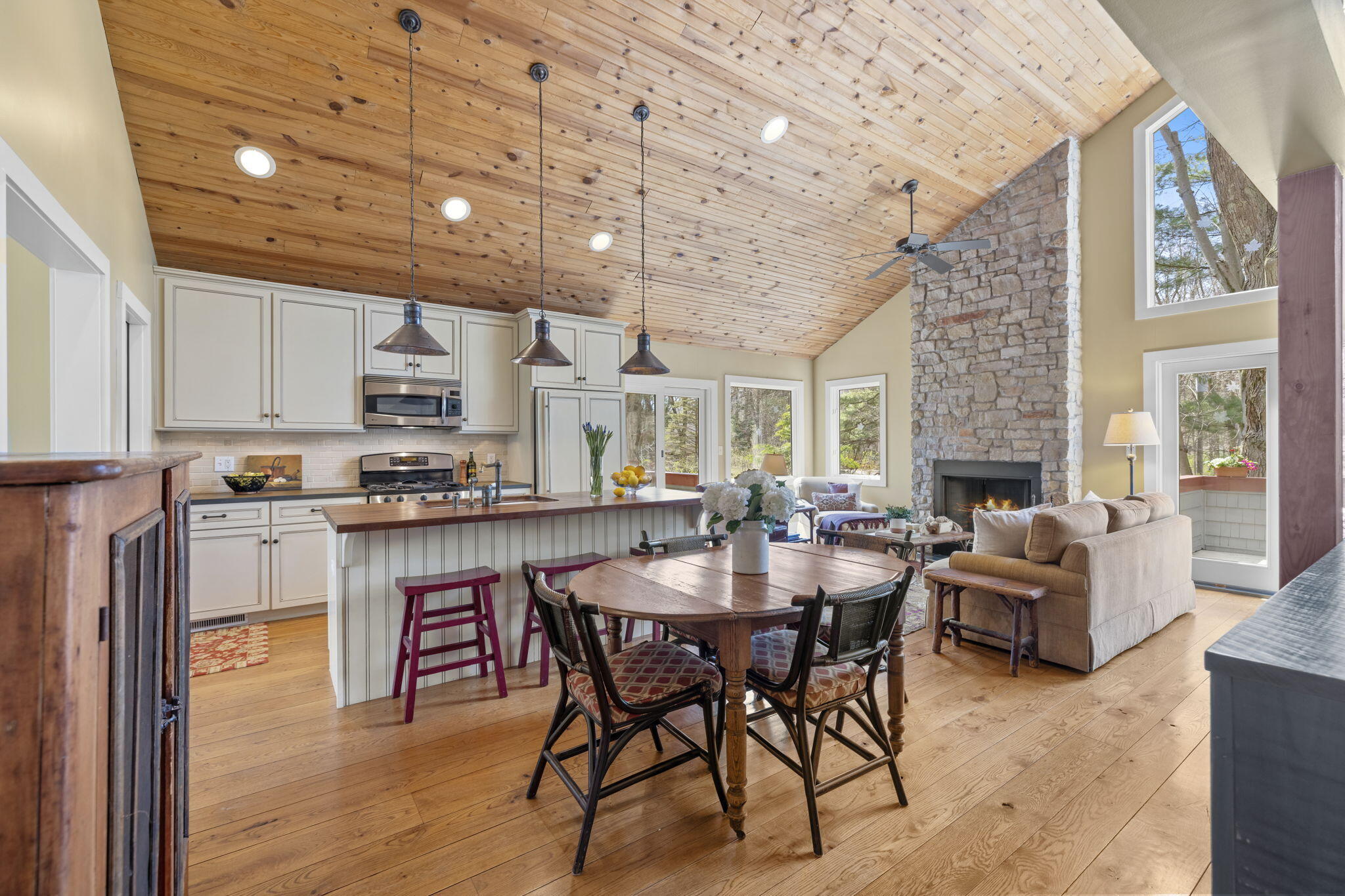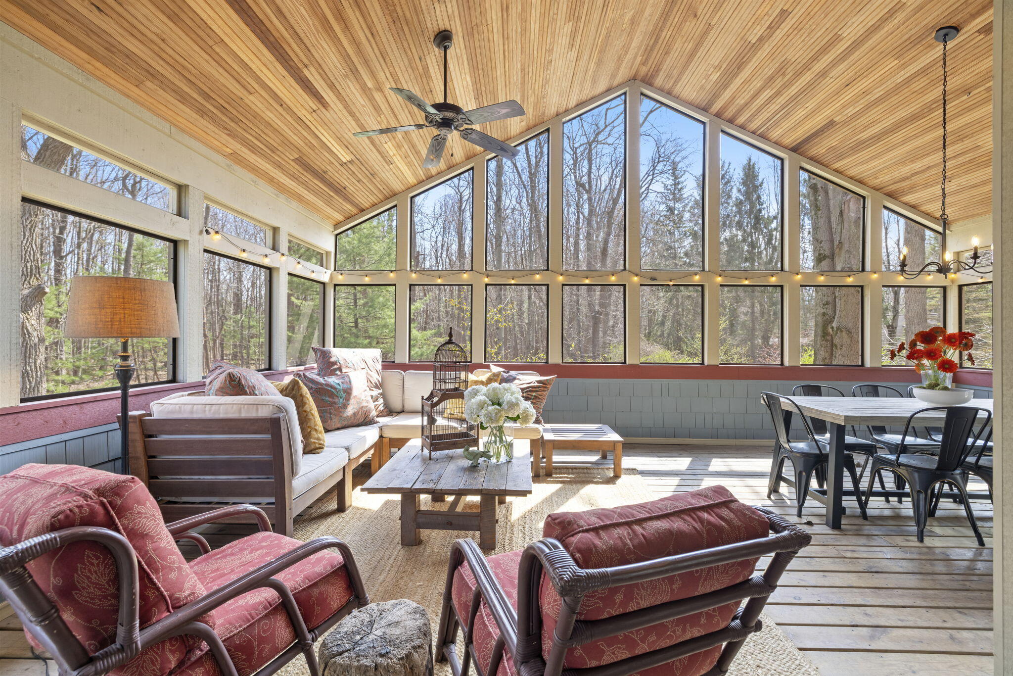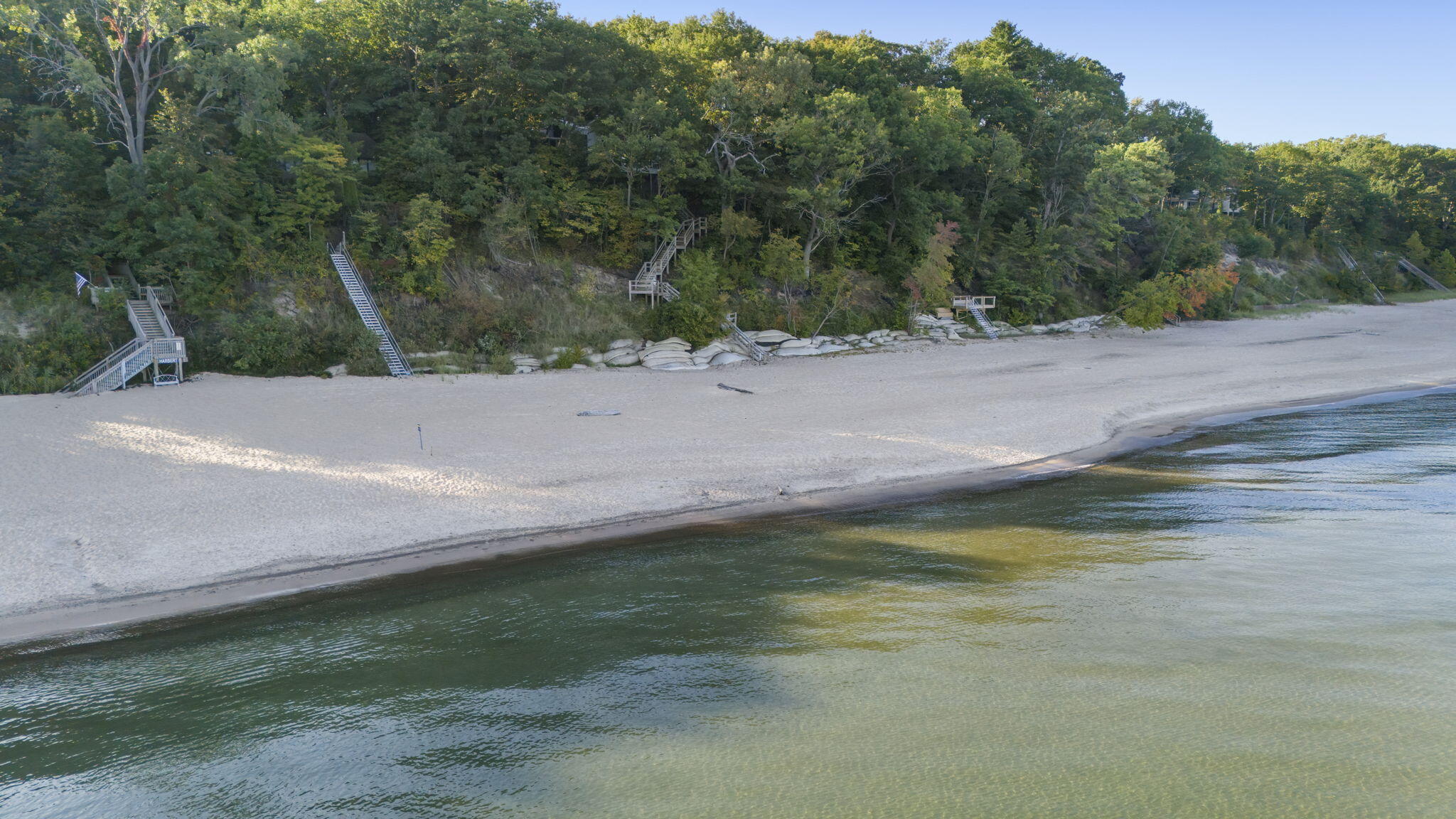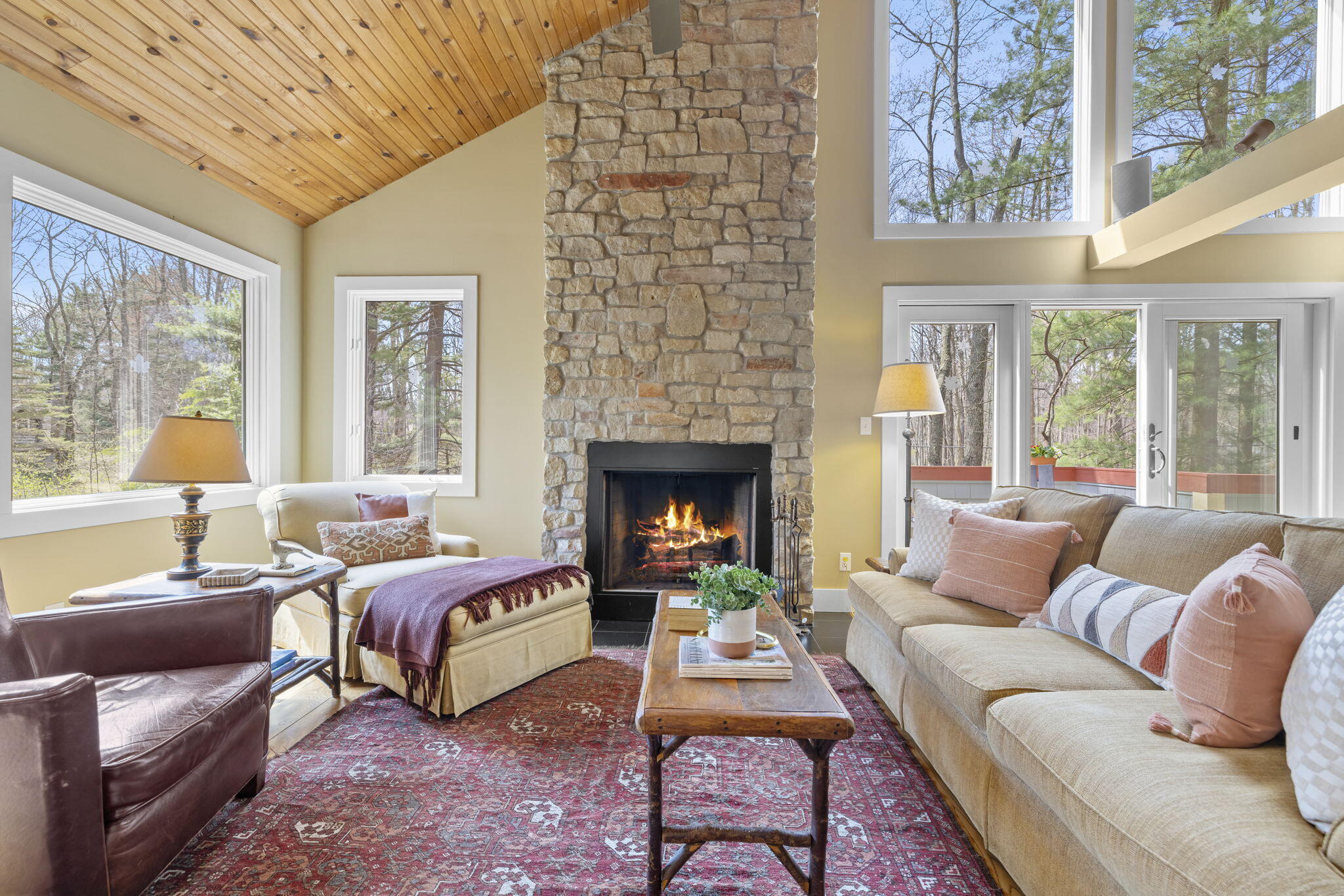 Tucked among the trees in the heart of Harbert, this distinctive Tree House retreat offers privacy, style, and proximity to Lake Michigan, less than 2,500 feet from beach access. Designed for indoor-outdoor living, the home features a dramatic treetop screened porch, vaulted ceilings, wood floors, and a fireplace anchoring the main living spaces, including both a living room and family room.
