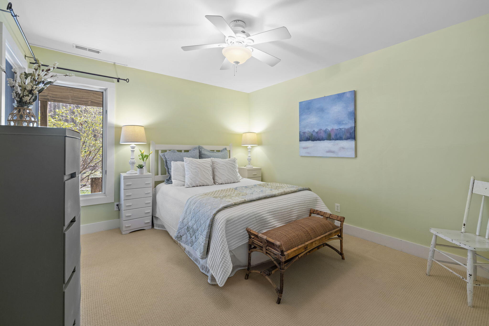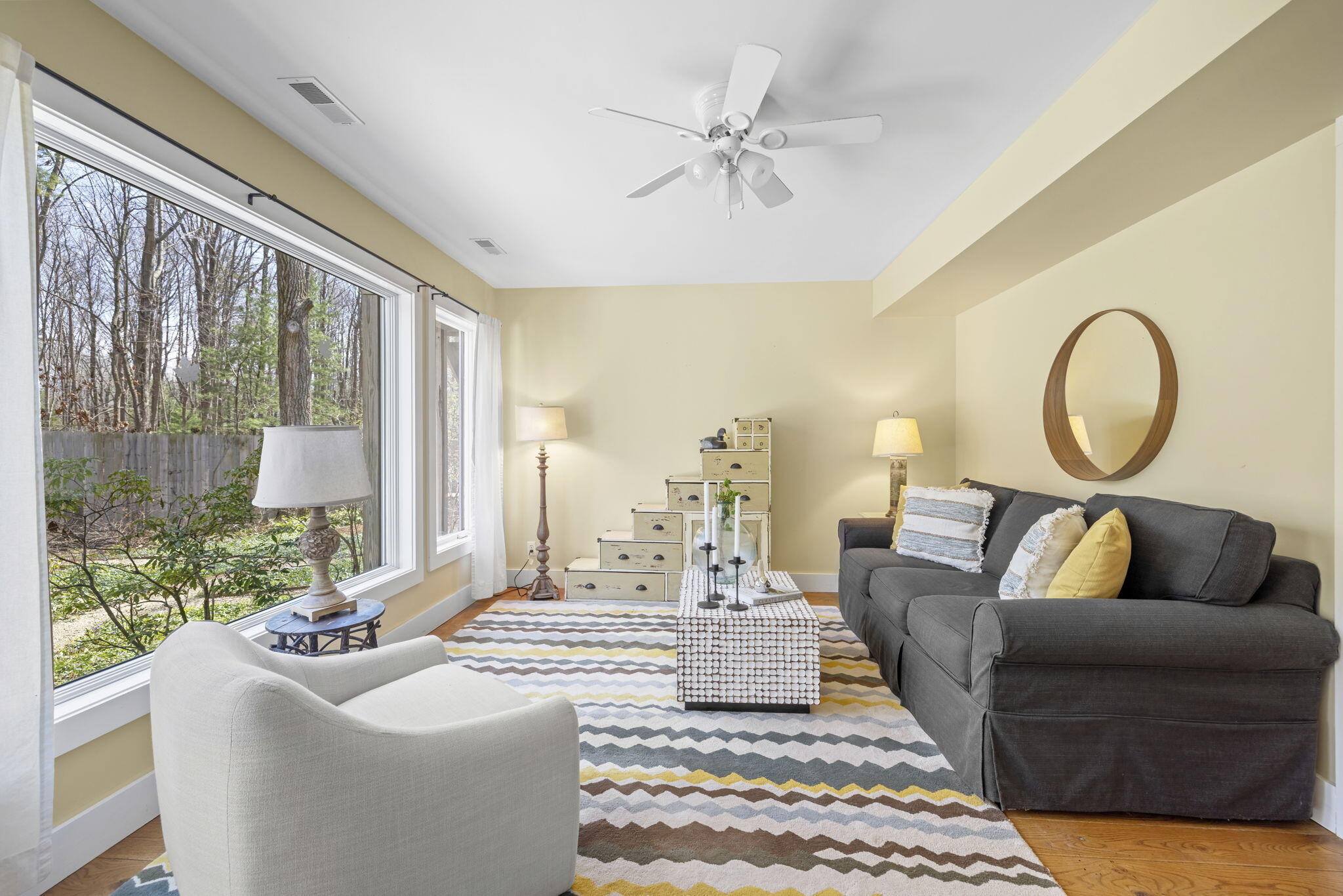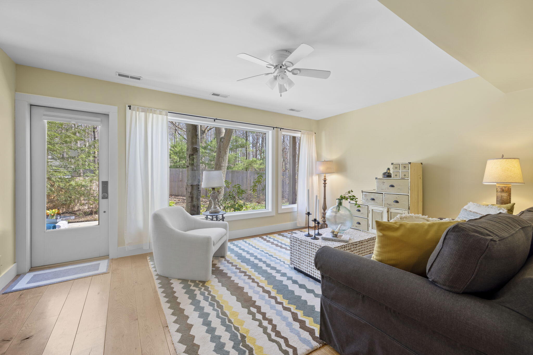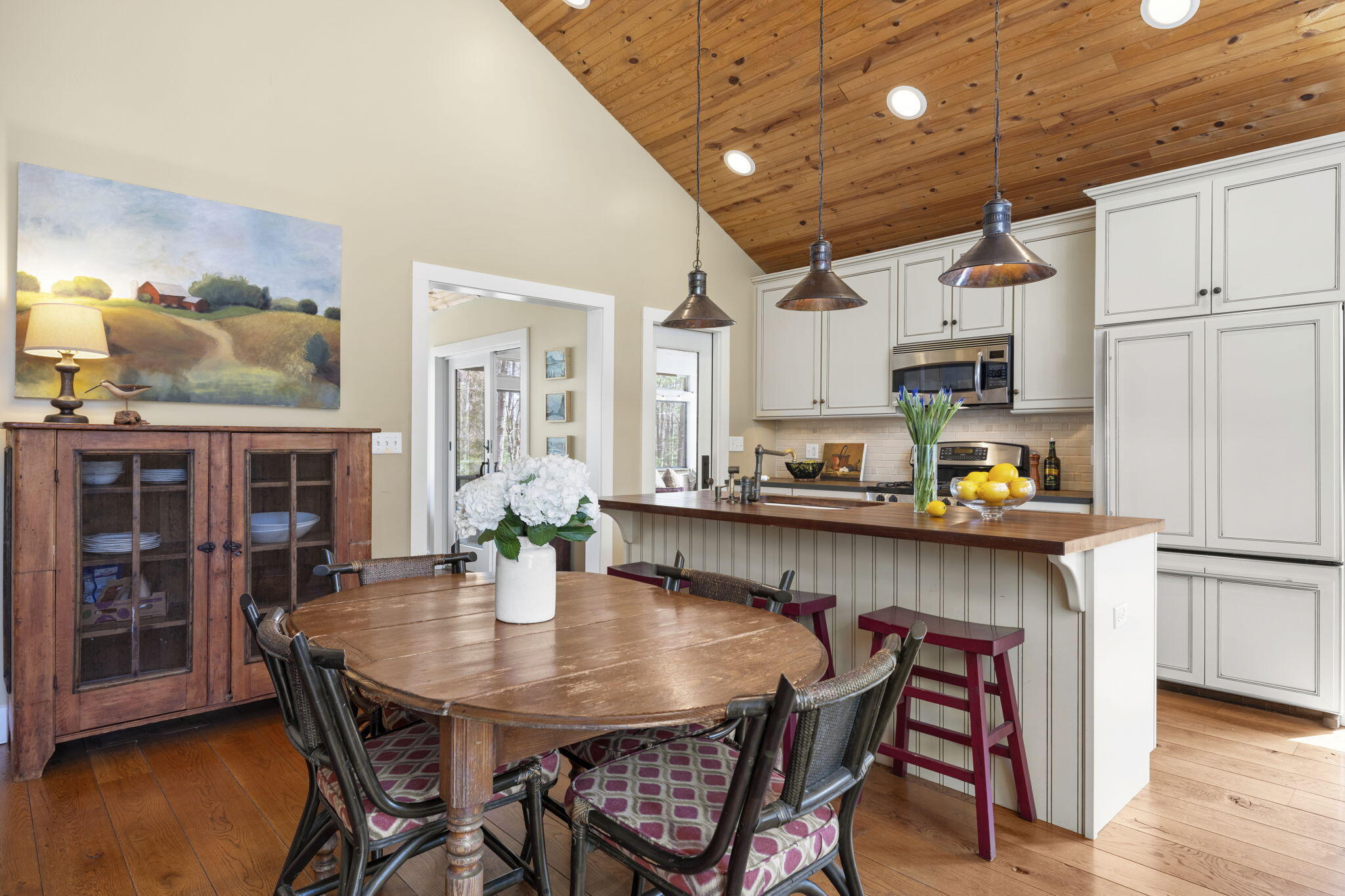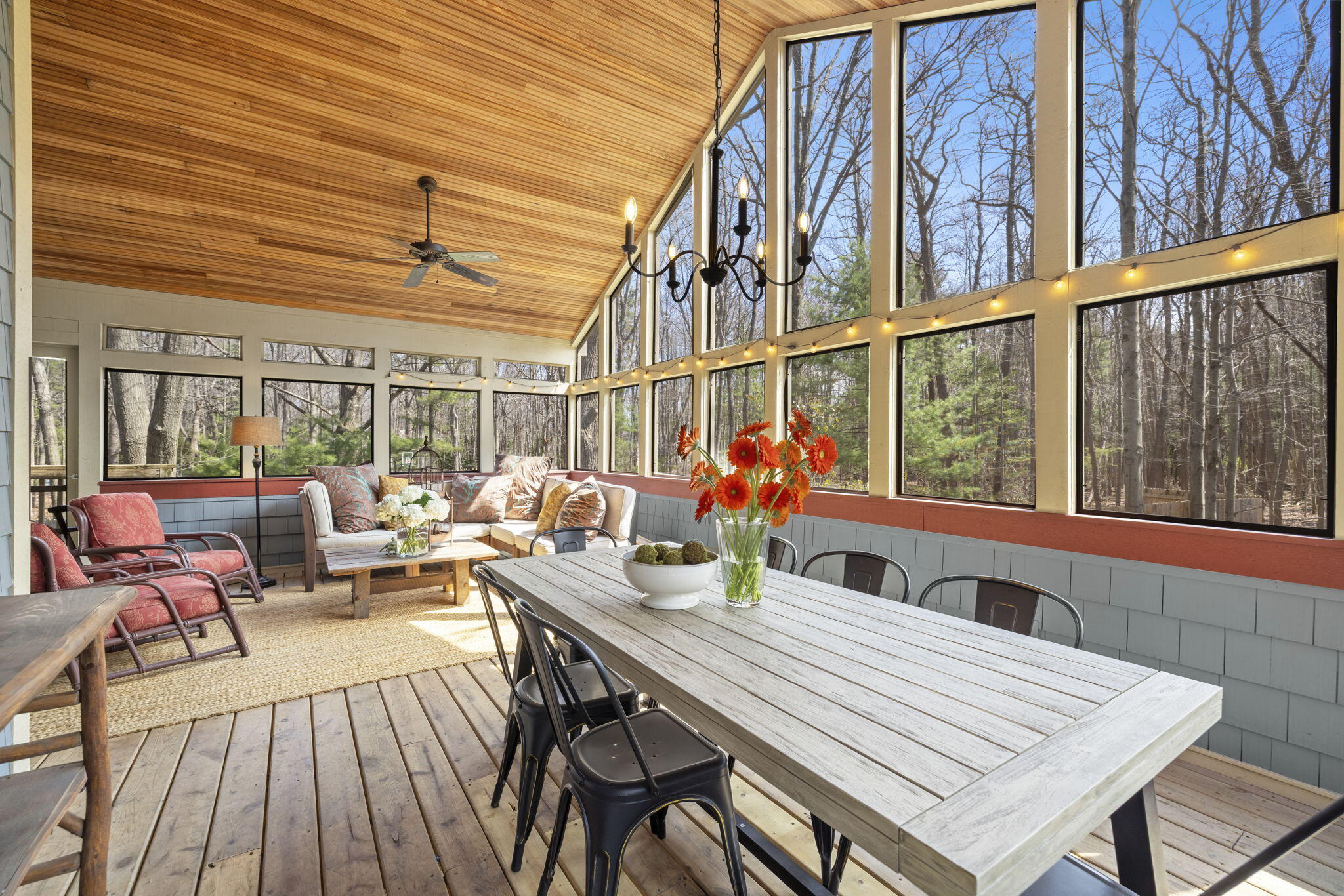 Tucked among the trees in the heart of Harbert, this distinctive Tree House retreat offers privacy, style, and proximity to Lake Michigan, less than 2,500 feet from beach access. Designed for indoor-outdoor living, the home features a dramatic treetop screened porch, vaulted ceilings, wood floors, and a fireplace anchoring the main living spaces, including both a living room and family room.