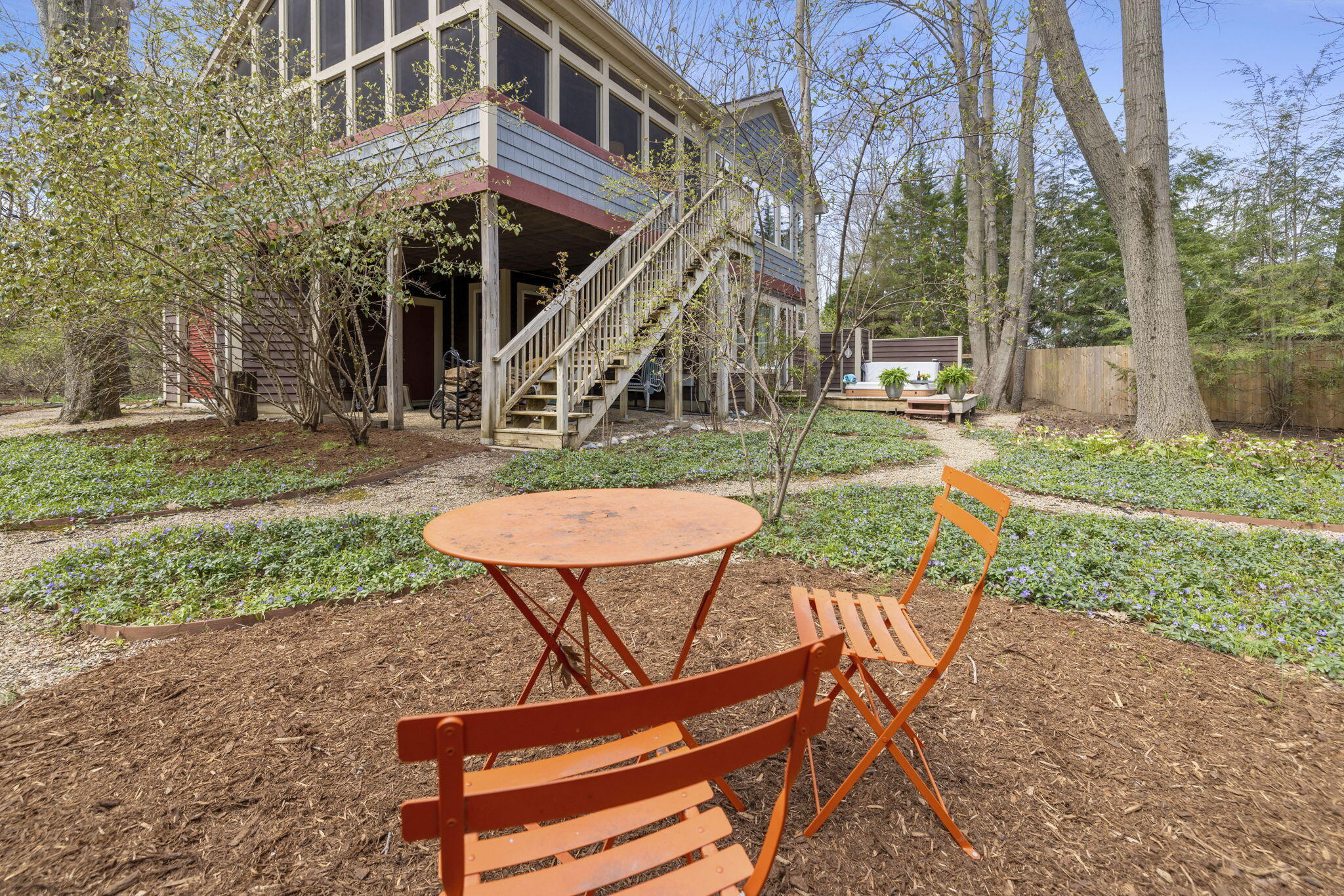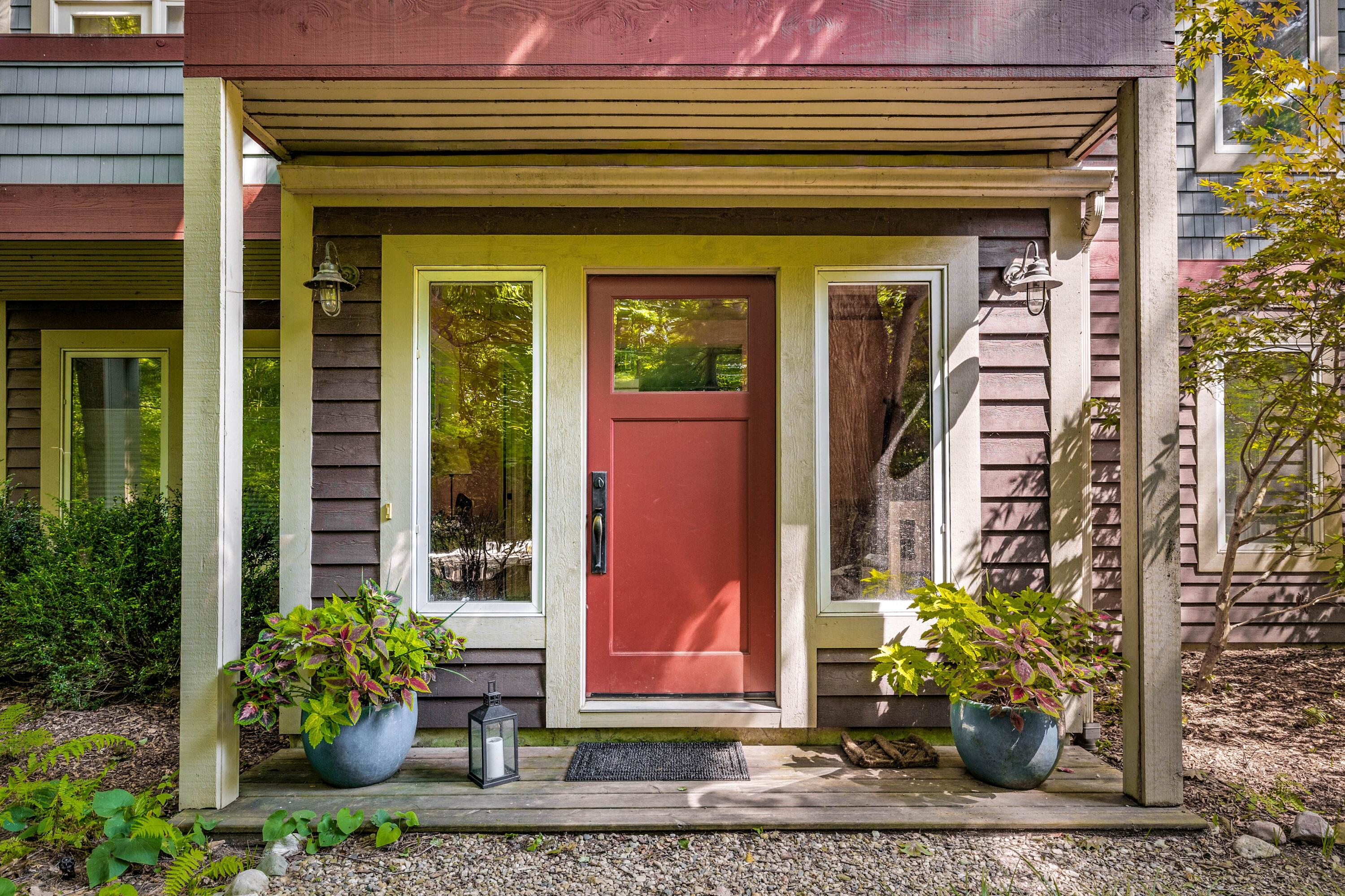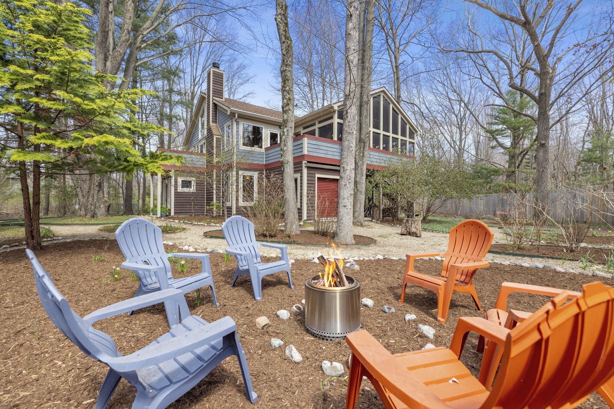 Tucked among the trees in the heart of Harbert, this distinctive Tree House retreat offers privacy, style, and proximity to Lake Michigan, less than 2,500 feet from beach access. Designed for indoor-outdoor living, the home features a dramatic treetop screened porch, vaulted ceilings, wood floors, and a fireplace anchoring the main living spaces, including both a living room and family room. With five bedrooms and four-and-a-half baths, there is room for hosting, highlighted by an en suite flex space ideal as a fifth bedroom, office, gym, or second family room. Outdoor amenities include a hot tub, outdoor shower, storage shed, and room for a pool. Located near local favorites, including a nearby coffee shop, and just half a block from the Red Arrow Trail bike/walking path, this home offers easy access to all that Harbor Country has to offer.
