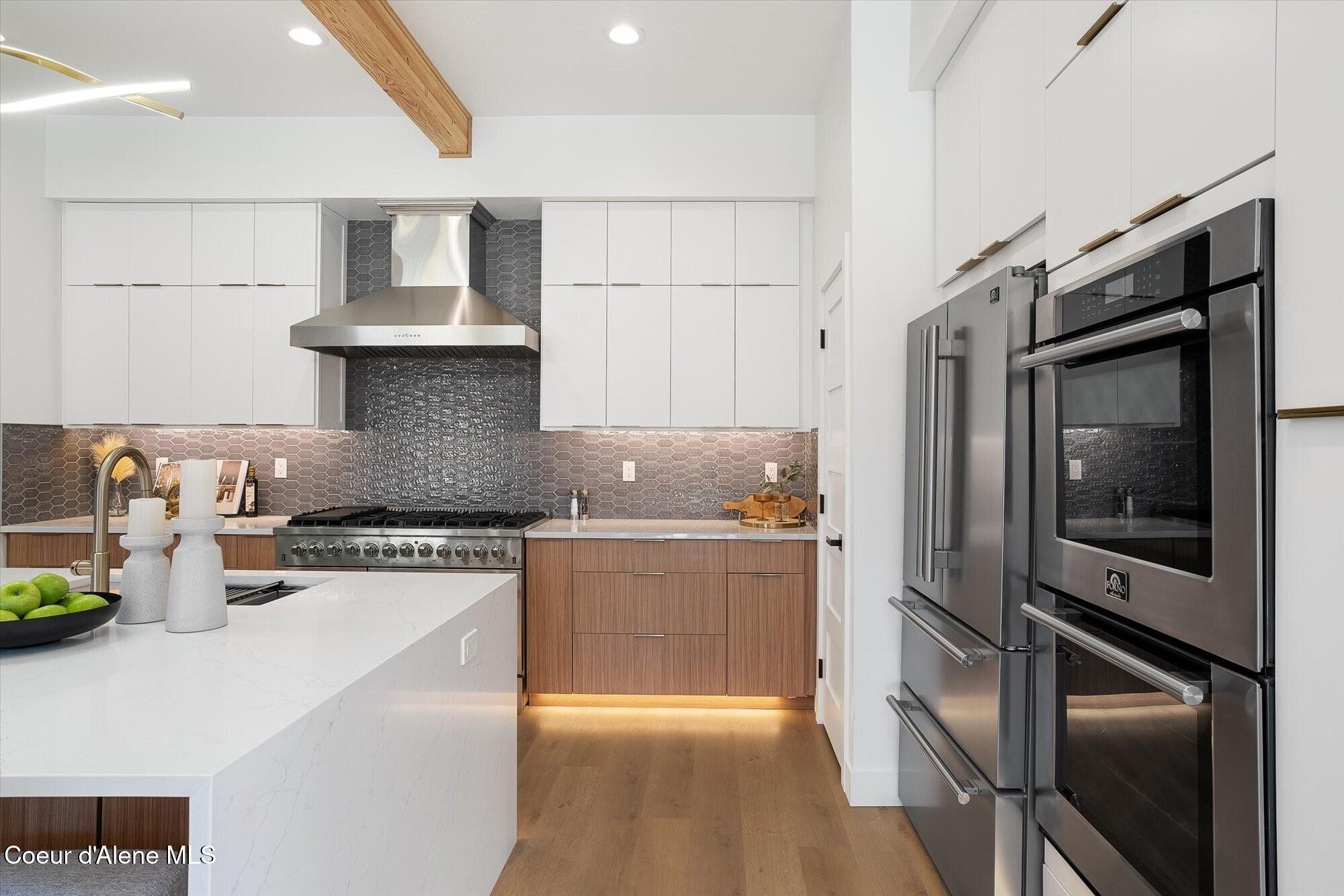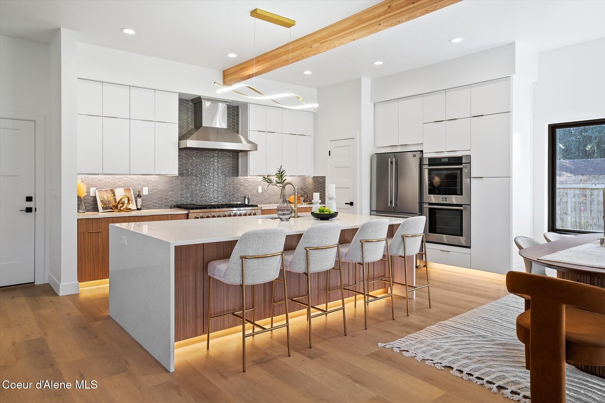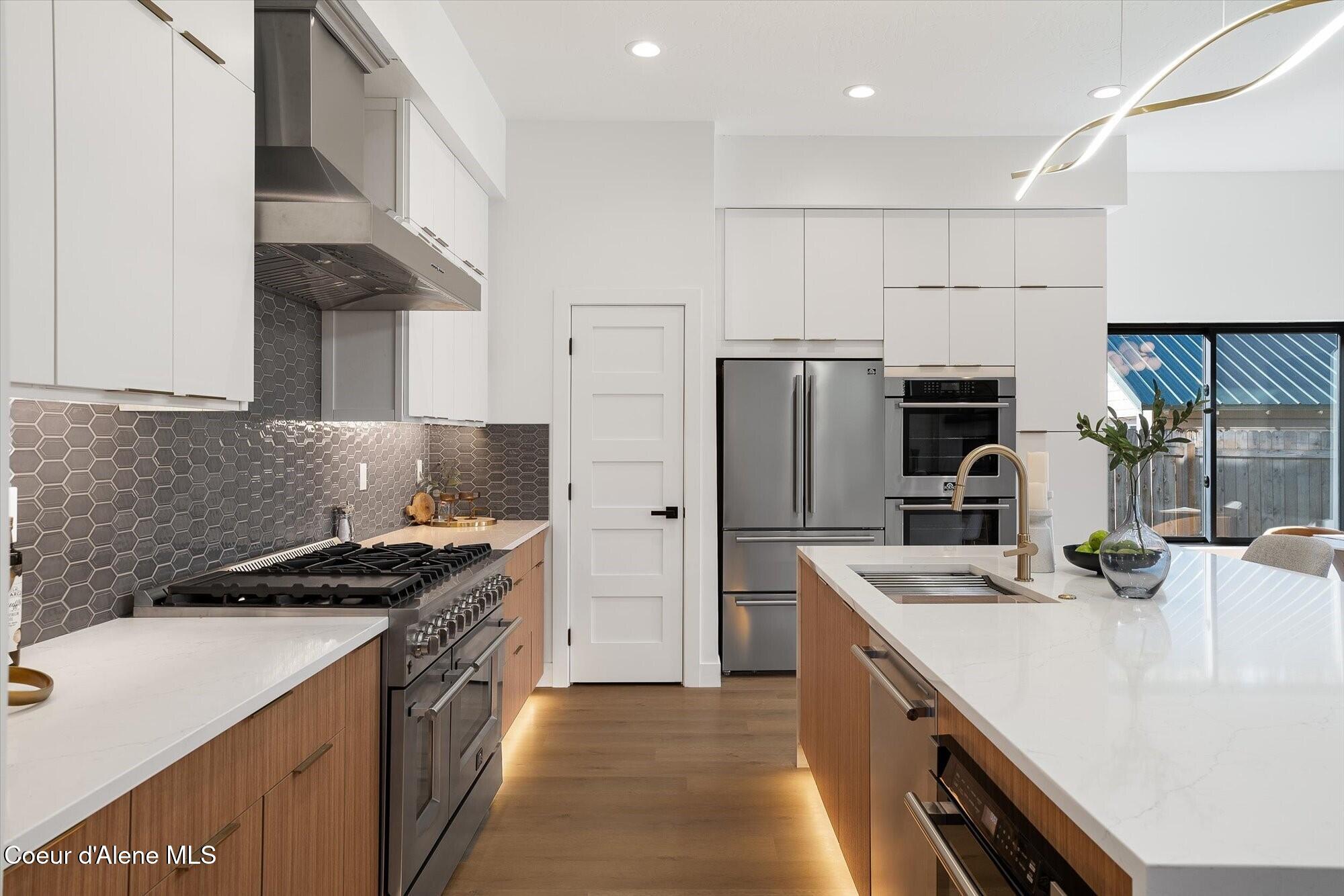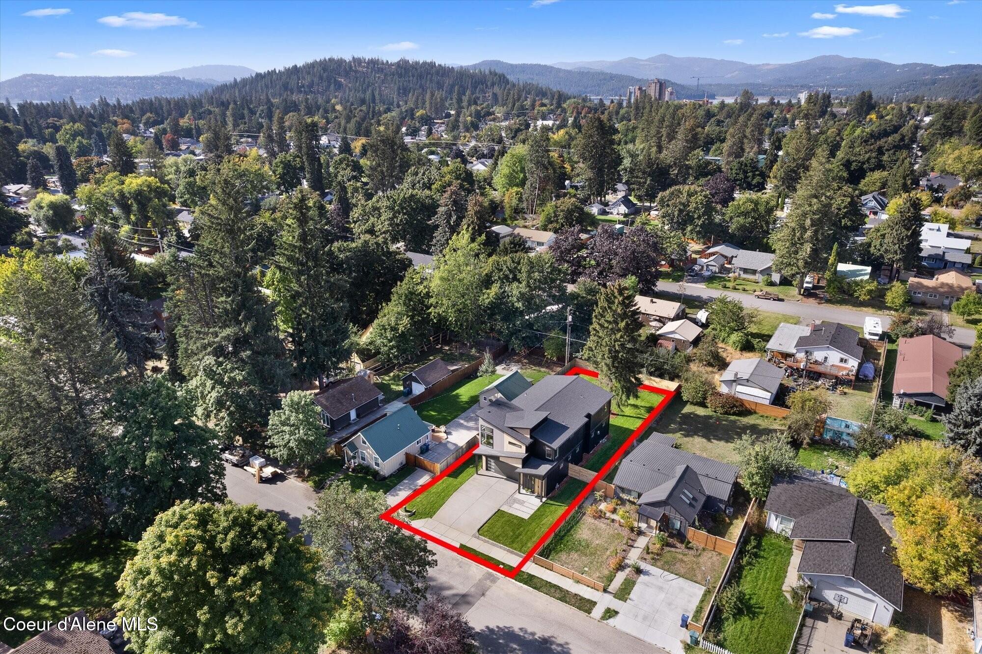 Modern 4 bed, 2.5 bath home spanning 2,953 sq ft, set on a quiet street just minutes from downtown Coeur d'Alene. Clean design, high ceilings, and an open main living area that works as well for everyday living as it does for hosting. The kitchen is the centerpiece of this home with a quartz waterfall island, high end stainless steel appliances including a 36'' gas range oven, double wall ovens, built in refrigerator, and ample storage spaces. Restful owner's suite with ensuite spa like bathroom complete with soaking tub, tile shower, dual vanities, and a large walk-in closet. Upper level guest bedrooms, bathroom, and laundry center offer privacy away from the master suite, each room filled with natural light. Act now! The outdoor living spaces are dialed in and ready for hosting your next event or family gathering. With professional landscaping, pavers, new decking, hot tub, and fencing, step into a low-maintenance setup that's ready to enjoy. Oversized back yard great for pets, and offers room to grow with potential for a future ADU. Walk to Sherman Ave for dinner or coffee, and you're minutes to the lake, golf, beaches, and Tubbs Hill. Strong location, clean home, and flexible use, ideal for full-time living, a seasonal place, or an investment with short-term rental appeal.