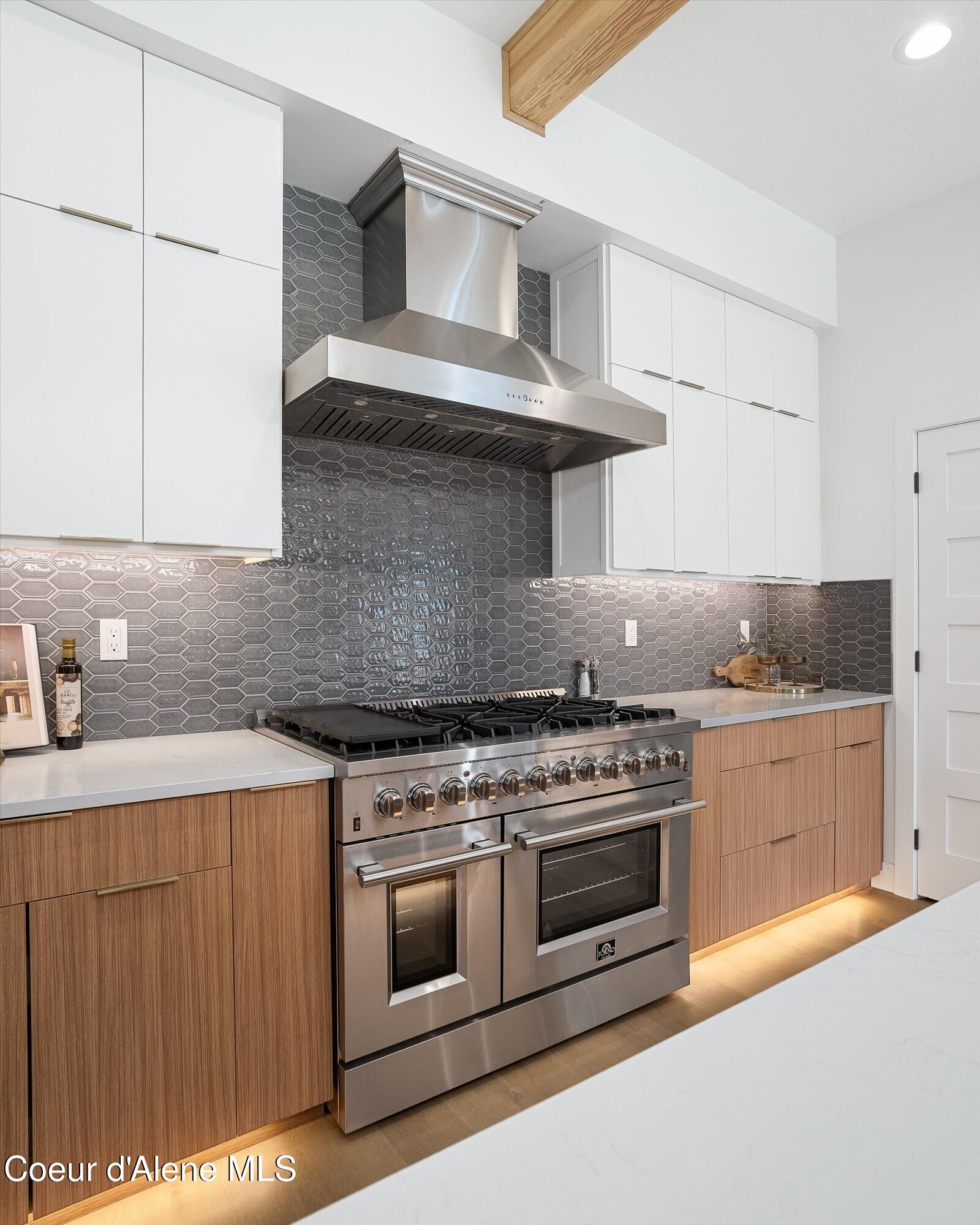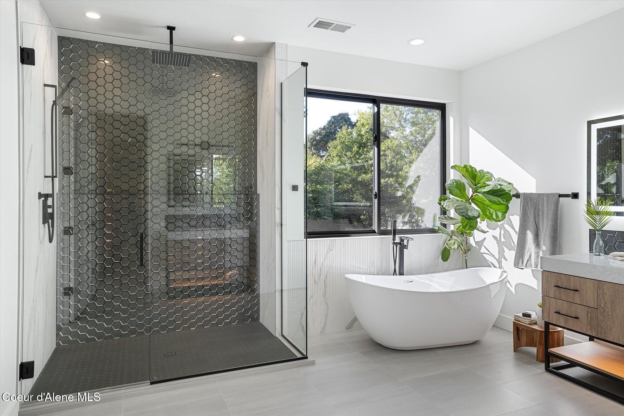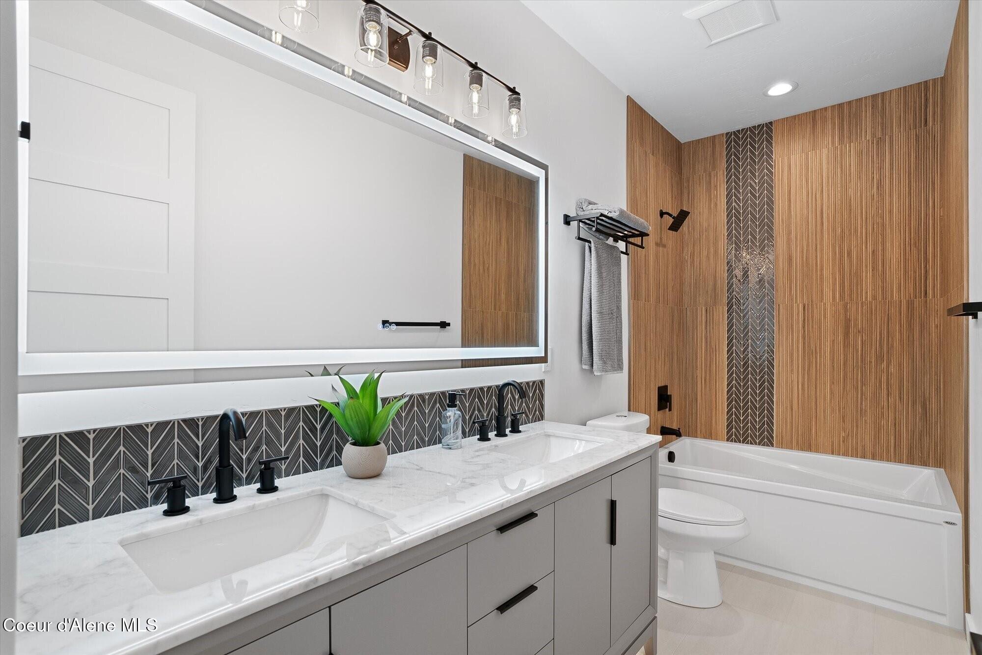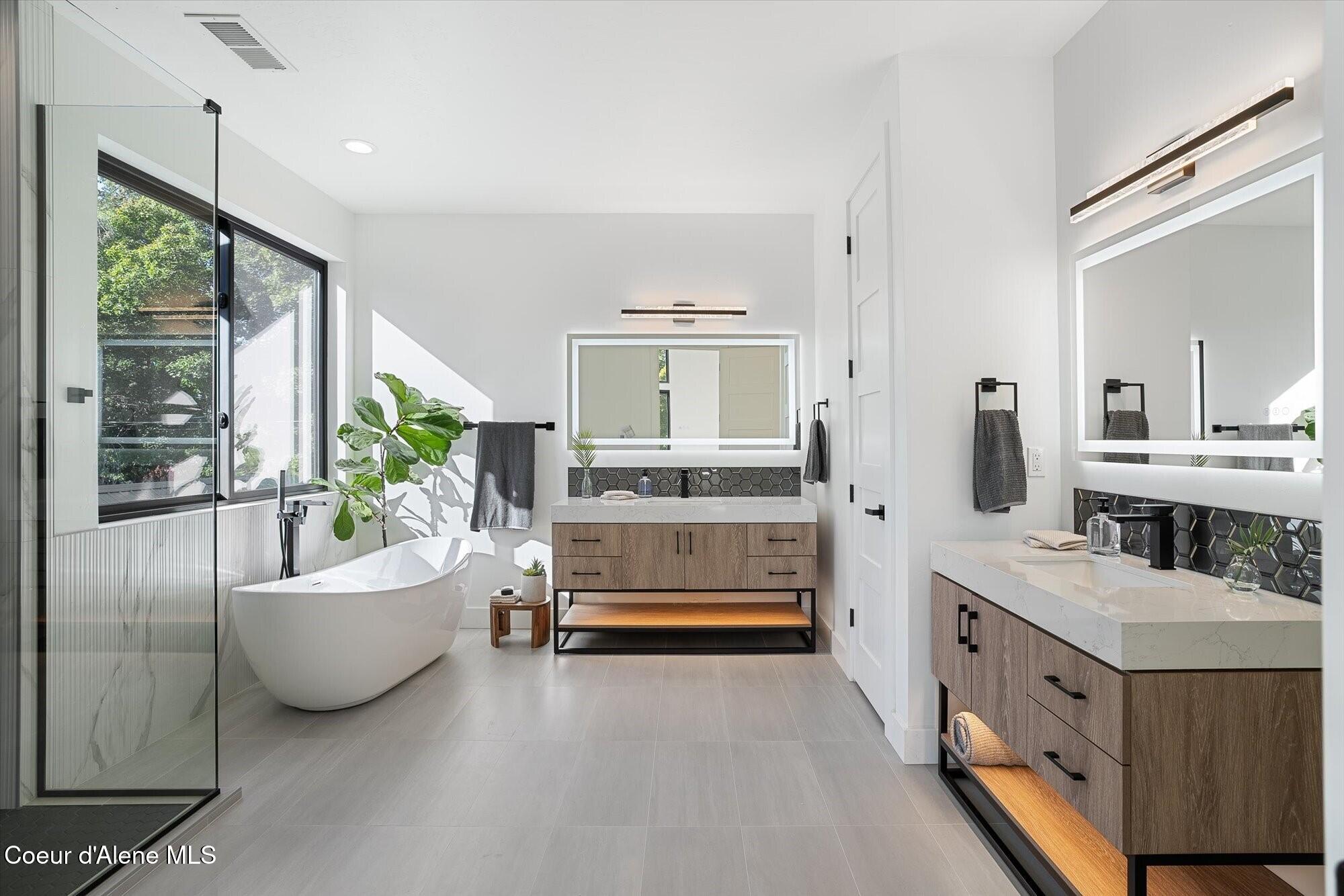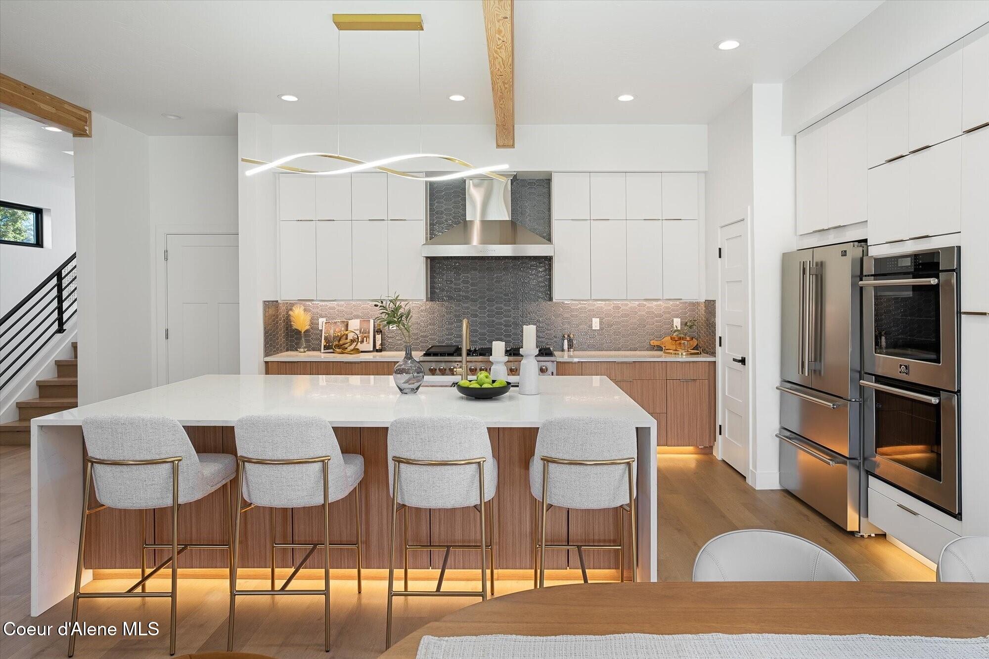 Modern 4 bed, 2.5 bath home spanning 2,953 sq ft, set on a quiet street just minutes from downtown Coeur d'Alene. Clean design, high ceilings, and an open main living area that works as well for everyday living as it does for hosting. The kitchen is the centerpiece of this home with a quartz waterfall island, high end stainless steel appliances including a 36'' gas range oven, double wall ovens, built in refrigerator, and ample storage spaces. Restful owner's suite with ensuite spa like bathroom complete with soaking tub, tile shower, dual vanities, and a large walk-in closet. Upper level guest bedrooms, bathroom, and laundry center offer privacy away from the master suite, each room filled with natural light. Act now! The outdoor living spaces are dialed in and ready for hosting your next event or family gathering. With professional landscaping, pavers, new decking, hot tub, and fencing, step into a low-maintenance setup that's ready to enjoy. Oversized back yard great for pets, and offers room to grow with potential for a future ADU. Walk to Sherman Ave for dinner or coffee, and you're minutes to the lake, golf, beaches, and Tubbs Hill. Strong location, clean home, and flexible use, ideal for full-time living, a seasonal place, or an investment with short-term rental appeal.