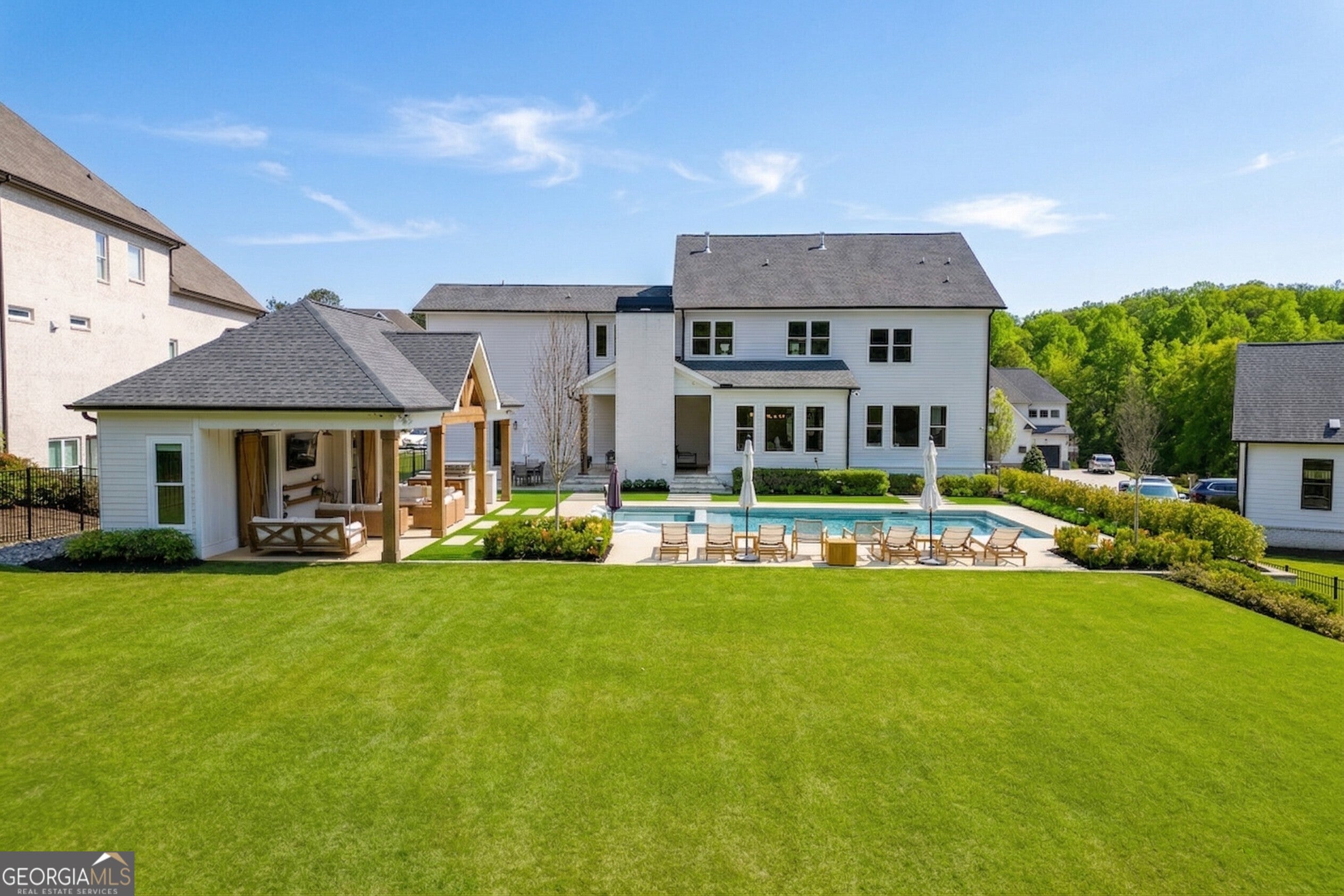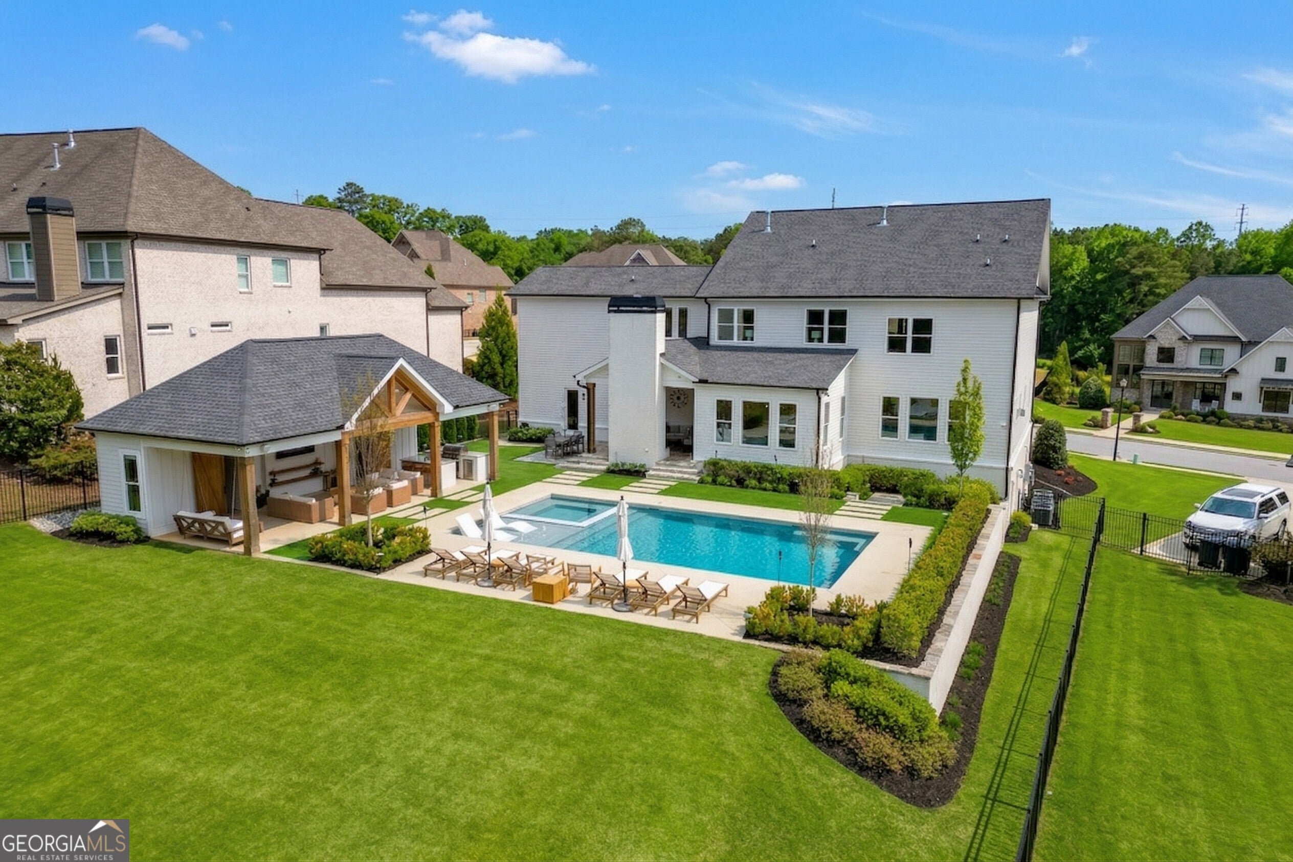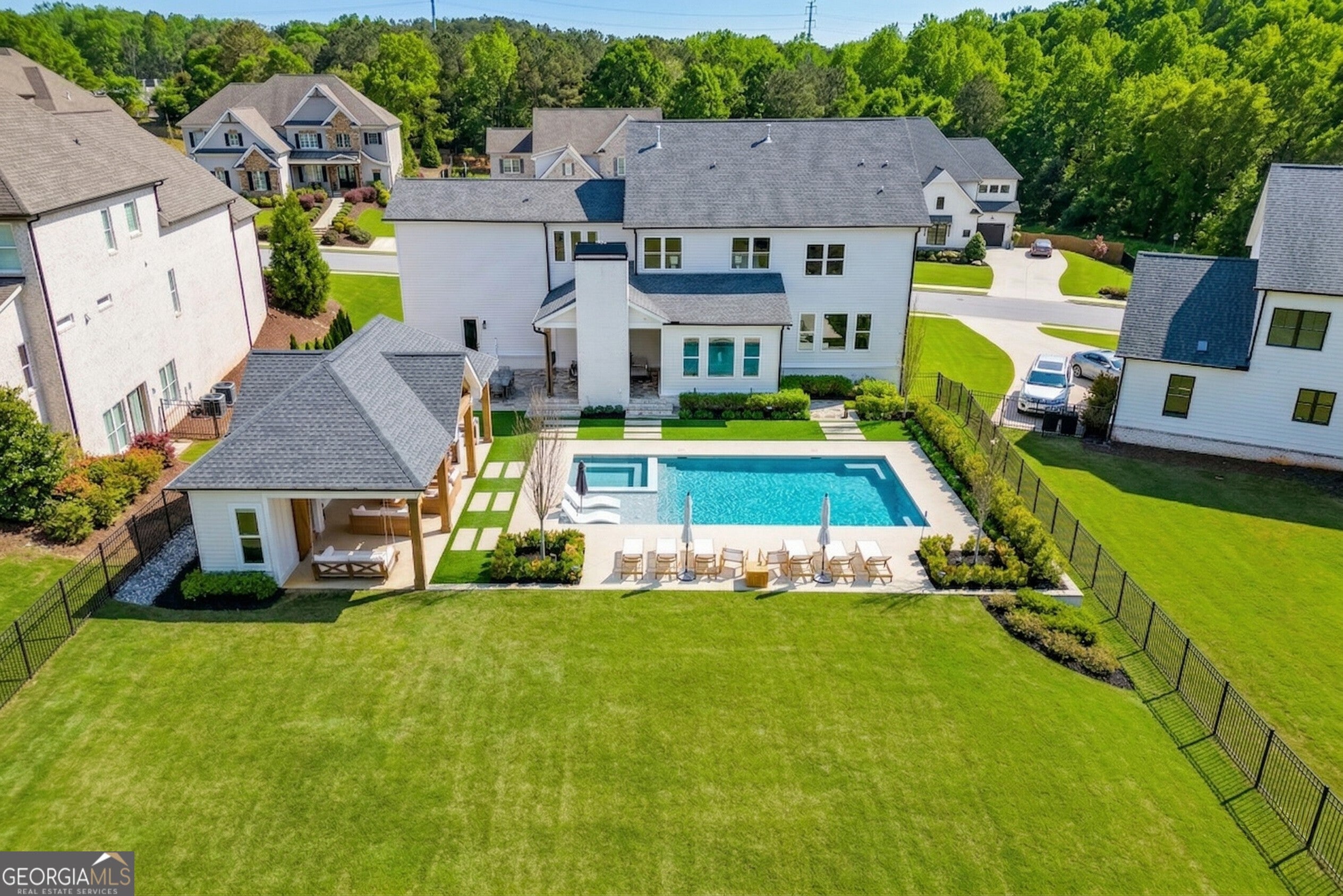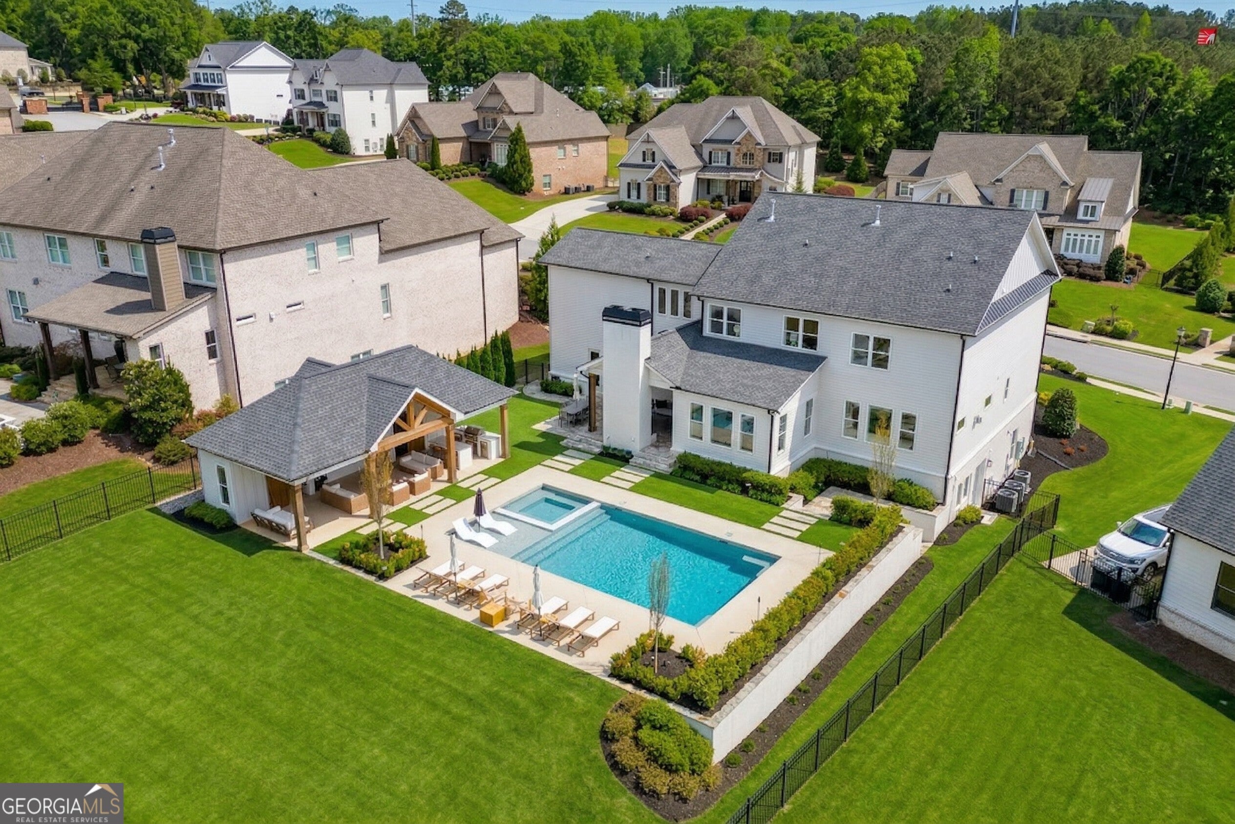 Incredible describes this opportunity on a nearly new custom-built home with a finished basement, gunite pool, hot tub, huge pool pavilion with bathroom and grilling station on one of the best private level lots in the City of Buford, tucked away in a beautiful, gated community! This open concept floor plan offers a large kitchen with loads of custom-built cabinetry, oversized island, quartz countertops, double ovens, gas cook-top, drawer-level microwave, and a huge walk-in pantry with wood shelving. Stained coffered ceiling beams extend from the kitchen to the family room. The large breakfast room is loaded with windows for maximum daylight. Family room with granite surround fireplace and built-in cabinet bases with transom windows above. Spacious office off the foyer with plenty of natural daylight, shiplap accent wall, and corner barn doors. Guest suite on the main floor with a walk-in closet and a private bath with a walk-in shower. Powder room tucked off the rear hallway for guest privacy. Drop zone area with bench seating and cubbies, along with a separate friends entry door off the rear hallway. Hardwood floors throughout the main level, except the main level guest suite. Split stairway with horizontal metal pickets leads upstairs where the landing features a loft/flex space with hardwoods. Oversized master suite with tray ceiling. Luxurious master bath features a large walk-in shower with dual showerheads, separate soaking tub, his and hers vanities, and an enormous walk-in closet with built-in hanging and adjustable shelving plus dressing island. Three additional spacious secondary bedrooms, all with walk-ins & private baths. The upstairs laundry room has a sink basin and wall cabinets. Professionally finished terrace level with a complete in-law suite featuring a kitchen with custom cabinets, floating shelves with accent lighting, a large island and quartz c-tops. Family/media room with surround sound and pre-wired for a projector. Stained ceiling beams extend from the kitchen to the family room. Custom gym with built-ins and wall mirrors. Separate office with French doors and built-ins. Guest bedroom with full bath featuring a stand-up shower. An additional powder room that has a cabinet paneled washer/dryer niche to keep out of sight. Hardwood floors throughout. There is also a playroom area under the stairs. The outdoor entertainment area is an incredible space that includes a rear covered porch with a fireplace and flagstone floor covering, an additional open flagstone patio area for larger gatherings, heated saltwater pool with hot tub and tanning ledge surrounded by an artificial turf perimeter. The large pool pavilion has a vaulted media area, a built-in grilling station with stainless steel accessories and sink, a powder room bath, and a large storage room for pool items. Additionally, you have a huge level rear yard that is so hard to find, plus extensive landscaping. Numerous additional details featuring 10 ceilings on the main level with 8 doors, four-sided brick, 3-car garage with oversized driveway, fully automated blinds, leak-detection and camera systems, tankless water heater, water-filtration system, built-in speakers, irrigation, landscape lighting, and so much more. This home has been incredibly maintained with no expense spared so dont miss it!