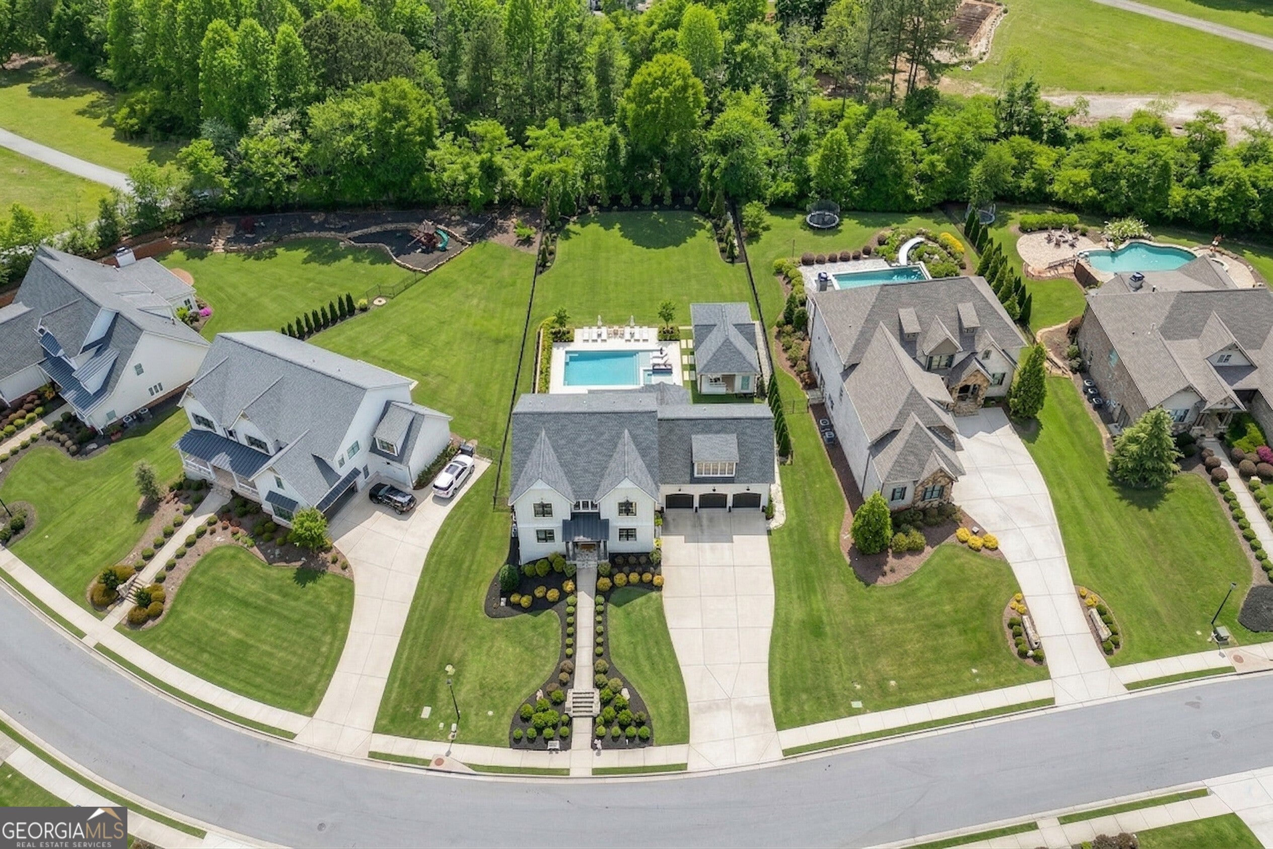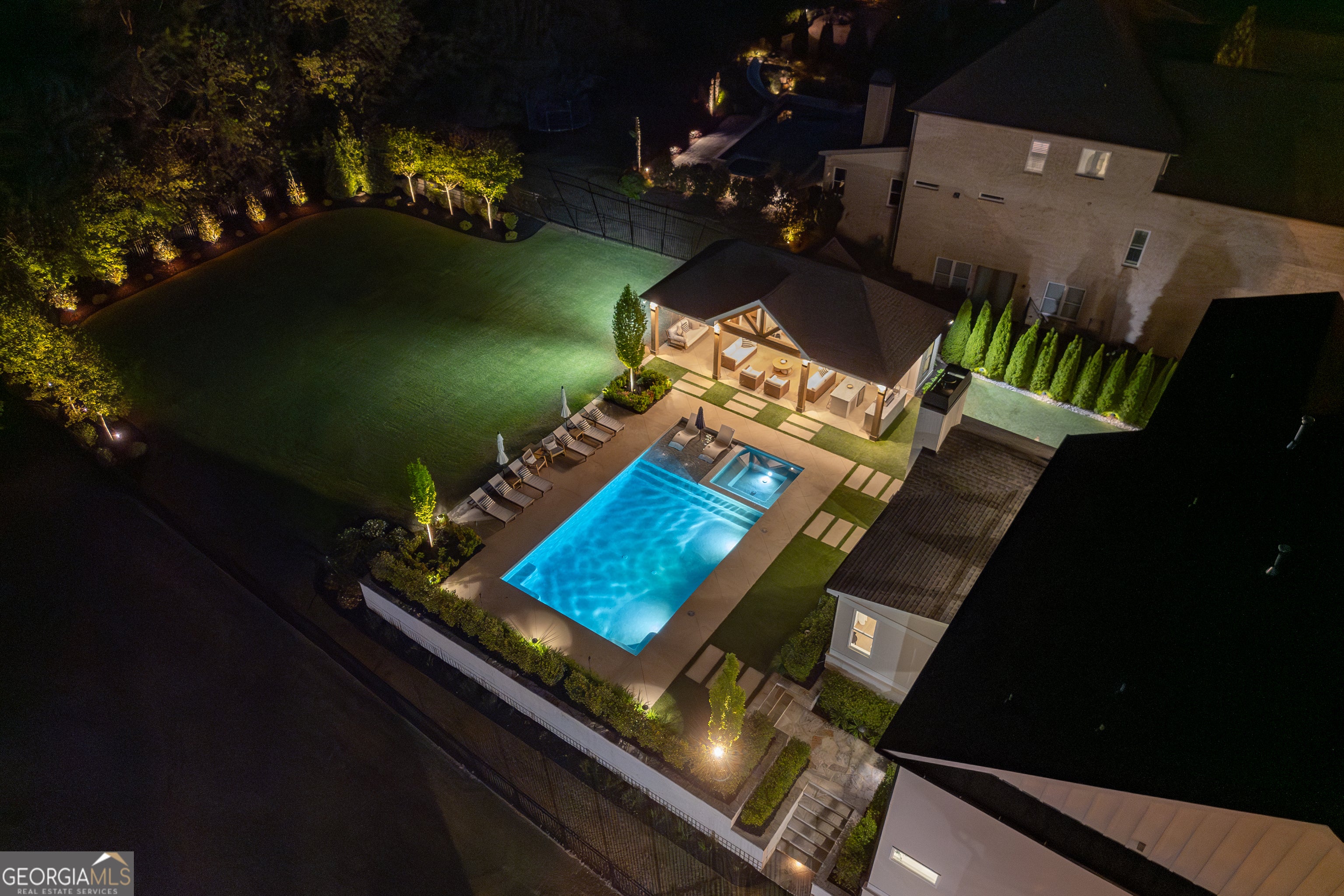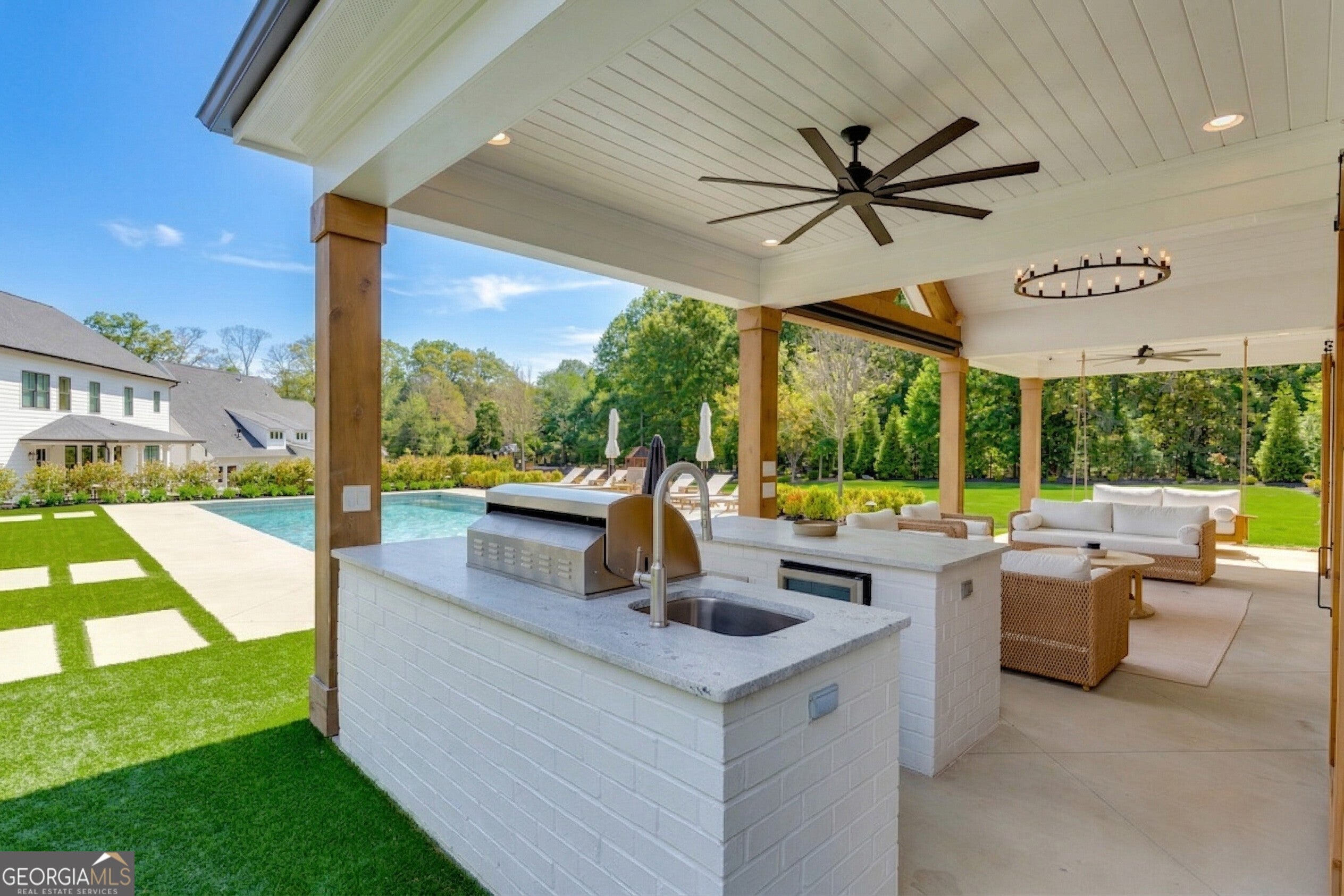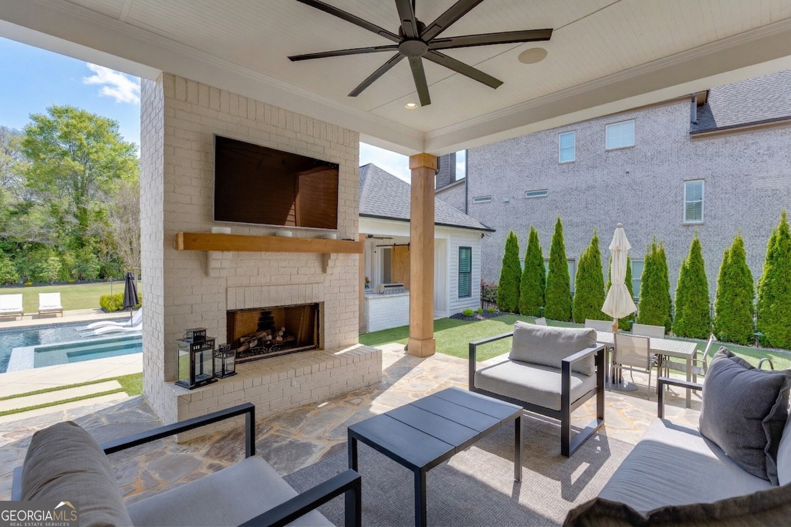 Incredible describes this opportunity on a nearly new custom-built home with a finished basement, gunite pool, hot tub, huge pool pavilion with bathroom and grilling station on one of the best private level lots in the City of Buford, tucked away in a beautiful, gated community! This open concept floor plan offers a large kitchen with loads of custom-built cabinetry, oversized island, quartz countertops, double ovens, gas cook-top, drawer-level microwave, and a huge walk-in pantry with wood shelving. Stained coffered ceiling beams extend from the kitchen to the family room. The large breakfast room is loaded with windows for maximum daylight. Family room with granite surround fireplace and built-in cabinet bases with transom windows above. Spacious office off the foyer with plenty of natural daylight, shiplap accent wall, and corner barn doors. Guest suite on the main floor with a walk-in closet and a private bath with a walk-in shower. Powder room tucked off the rear hallway for guest privacy. Drop zone area with bench seating and cubbies, along with a separate friends entry door off the rear hallway. Hardwood floors throughout the main level, except the main level guest suite. Split stairway with horizontal metal pickets leads upstairs where the landing features a loft/flex space with hardwoods. Oversized master suite with tray ceiling. Luxurious master bath features a large walk-in shower with dual showerheads, separate soaking tub, his and hers vanities, and an enormous walk-in closet with built-in hanging and adjustable shelving plus dressing island. Three additional spacious secondary bedrooms, all with walk-ins & private baths. The upstairs laundry room has a sink basin and wall cabinets. Professionally finished terrace level with a complete in-law suite featuring a kitchen with custom cabinets, floating shelves with accent lighting, a large island and quartz c-tops. Family/media room with surround sound and pre-wired for a projector. Stained ceiling beams extend from the kitchen to the family room. Custom gym with built-ins and wall mirrors. Separate office with French doors and built-ins. Guest bedroom with full bath featuring a stand-up shower. An additional powder room that has a cabinet paneled washer/dryer niche to keep out of sight. Hardwood floors throughout. There is also a playroom area under the stairs. The outdoor entertainment area is an incredible space that includes a rear covered porch with a fireplace and flagstone floor covering, an additional open flagstone patio area for larger gatherings, heated saltwater pool with hot tub and tanning ledge surrounded by an artificial turf perimeter. The large pool pavilion has a vaulted media area, a built-in grilling station with stainless steel accessories and sink, a powder room bath, and a large storage room for pool items. Additionally, you have a huge level rear yard that is so hard to find, plus extensive landscaping. Numerous additional details featuring 10 ceilings on the main level with 8 doors, four-sided brick, 3-car garage with oversized driveway, fully automated blinds, leak-detection and camera systems, tankless water heater, water-filtration system, built-in speakers, irrigation, landscape lighting, and so much more. This home has been incredibly maintained with no expense spared so dont miss it!