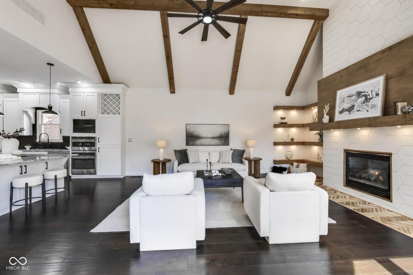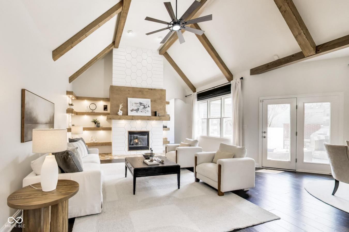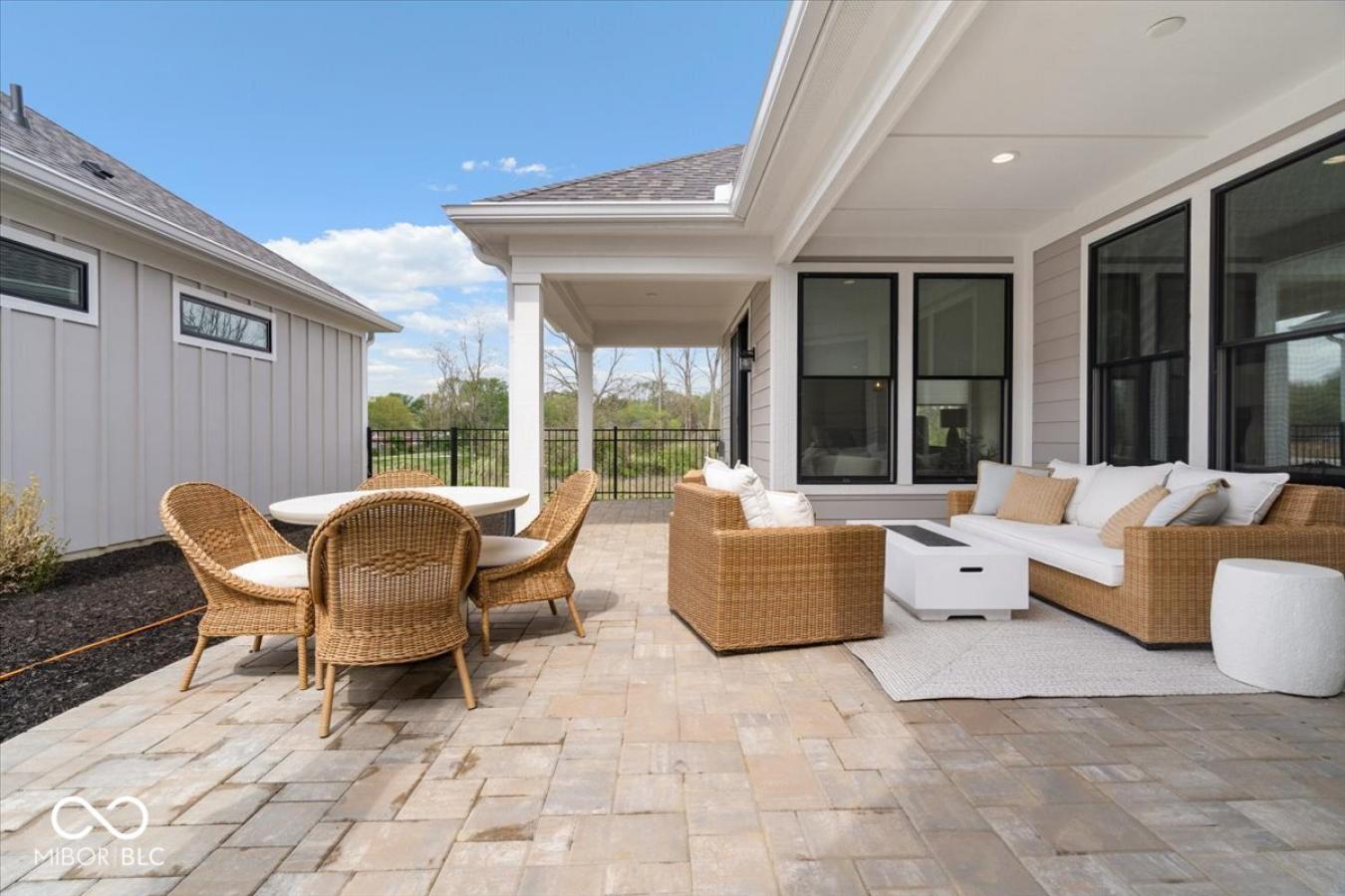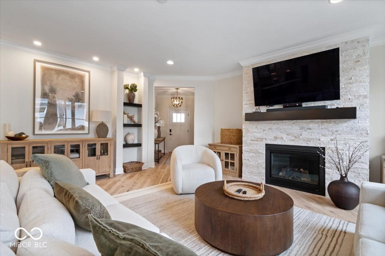 Tucked in the heart of the Village of West Clay, 12621 Treaty Line Street blends charming luxury and thoughtful design with an open, flowing layout ideal for everyday living and entertaining. A grand staircase makes a striking first impression, while the beautifully updated office with custom cabinetry sits just off the entry, offering a refined and functional workspace. The kitchen serves as the heart of the home, featuring an oversized center island perfect for gathering, handcrafted cabinetry, granite countertops, custom backsplash, and a spacious walk-in pantry tucked behind sleek sliding doors. The great room impresses with soaring ceilings, wood accent beams, and a gas fireplace, creating a warm, inviting space. Step outside to a private stone patio designed for entertaining, complete with a wood-burning fireplace, tranquil water feature, and stylish cabinet designed to protect your outdoor TV. The main-level primary suite offers a peaceful retreat with updated flooring, a tray ceiling, and custom built-in shelves, along with a spa-inspired bathroom featuring a soaking tub, separate shower, and large walk-in closet. Upstairs, two spacious bedrooms share an updated Jack-and-Jill bath featuring separate vanities, while at the back of the house, a private and versatile upstairs fourth bedroom/loft with its own full bathroom provides respite for guests or an in-law suite and a second office. The finished lower level expands your living space with a large recreation area, a bar for entertaining, an additional flex room ideal for a guest bedroom or a gym, and a renovated full bathroom with an added shower and updated finishes. The oversized garage holds 3 cars, features epoxy floors, built-in shelving, and a service/access door. Located just steps from Herman Wells Park, Nimitz Park, and the Provost Pool, as well as an array of shops, salons, dining, and community amenities, this Village of WestClay home offers the perfect blend of lifestyle, location, and livability.