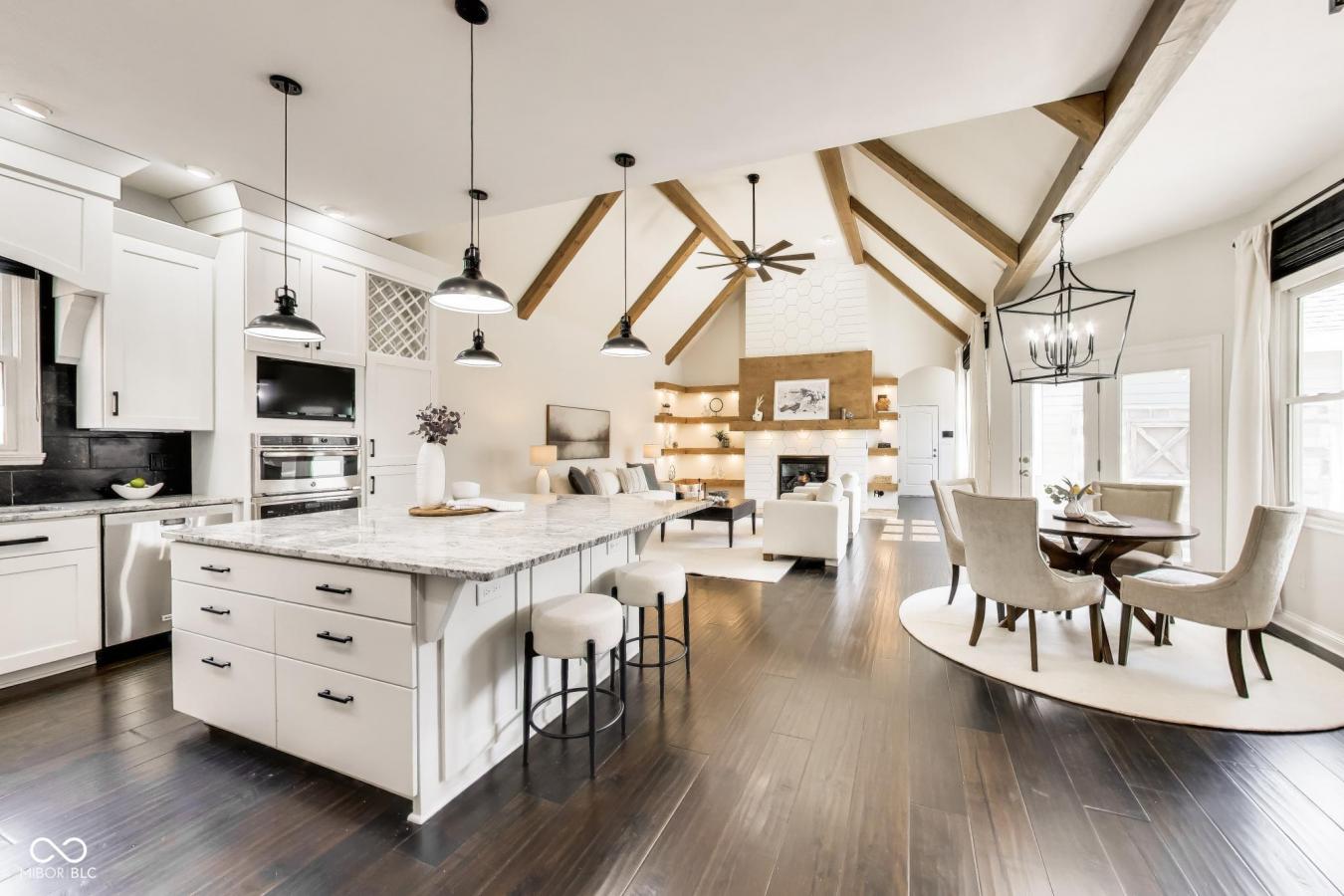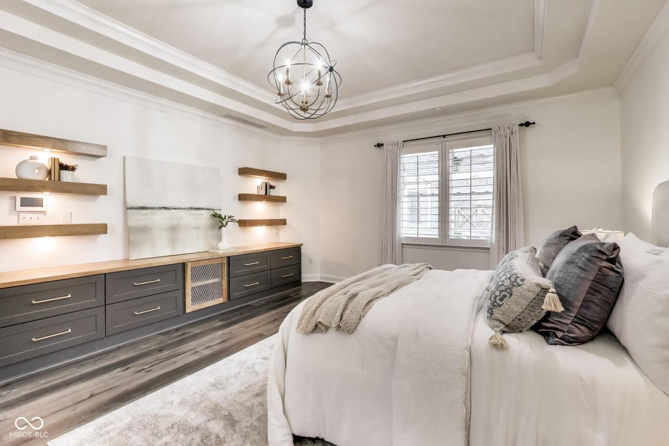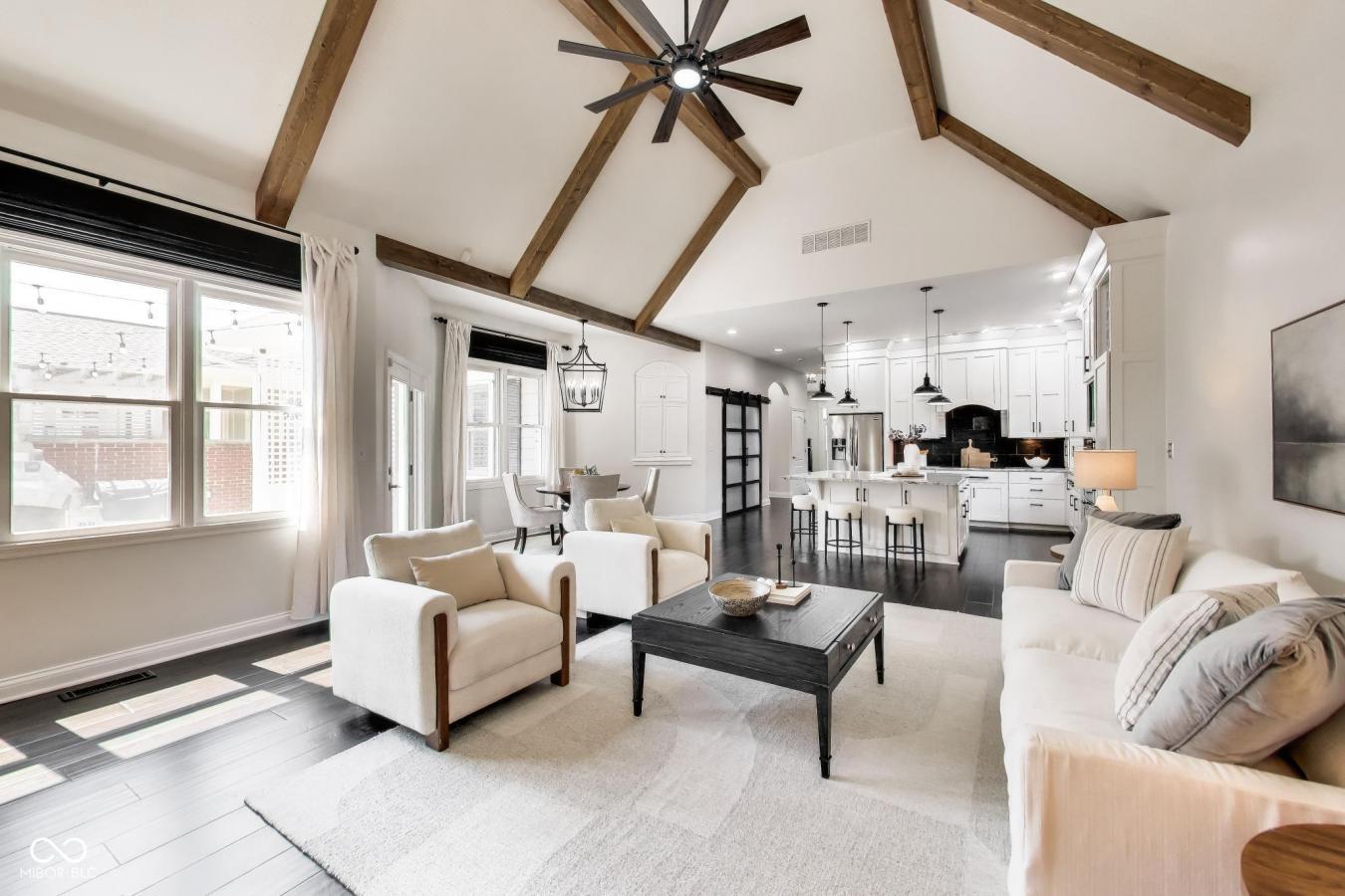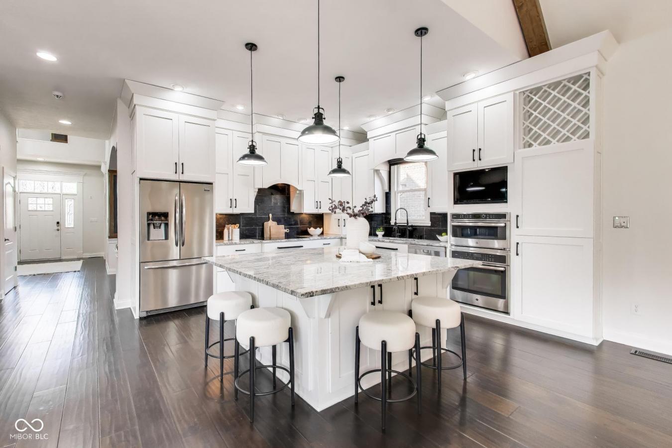 Tucked in the heart of the Village of West Clay, 12621 Treaty Line Street blends charming luxury and thoughtful design with an open, flowing layout ideal for everyday living and entertaining. A grand staircase makes a striking first impression, while the beautifully updated office with custom cabinetry sits just off the entry, offering a refined and functional workspace. The kitchen serves as the heart of the home, featuring an oversized center island perfect for gathering, handcrafted cabinetry, granite countertops, custom backsplash, and a spacious walk-in pantry tucked behind sleek sliding doors. The great room impresses with soaring ceilings, wood accent beams, and a gas fireplace, creating a warm, inviting space. Step outside to a private stone patio designed for entertaining, complete with a wood-burning fireplace, tranquil water feature, and stylish cabinet designed to protect your outdoor TV. The main-level primary suite offers a peaceful retreat with updated flooring, a tray ceiling, and custom built-in shelves, along with a spa-inspired bathroom featuring a soaking tub, separate shower, and large walk-in closet. Upstairs, two spacious bedrooms share an updated Jack-and-Jill bath featuring separate vanities, while at the back of the house, a private and versatile upstairs fourth bedroom/loft with its own full bathroom provides respite for guests or an in-law suite and a second office. The finished lower level expands your living space with a large recreation area, a bar for entertaining, an additional flex room ideal for a guest bedroom or a gym, and a renovated full bathroom with an added shower and updated finishes. The oversized garage holds 3 cars, features epoxy floors, built-in shelving, and a service/access door. Located just steps from Herman Wells Park, Nimitz Park, and the Provost Pool, as well as an array of shops, salons, dining, and community amenities, this Village of WestClay home offers the perfect blend of lifestyle, location, and livability.