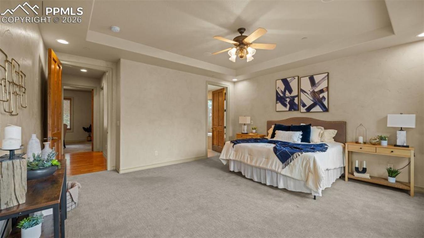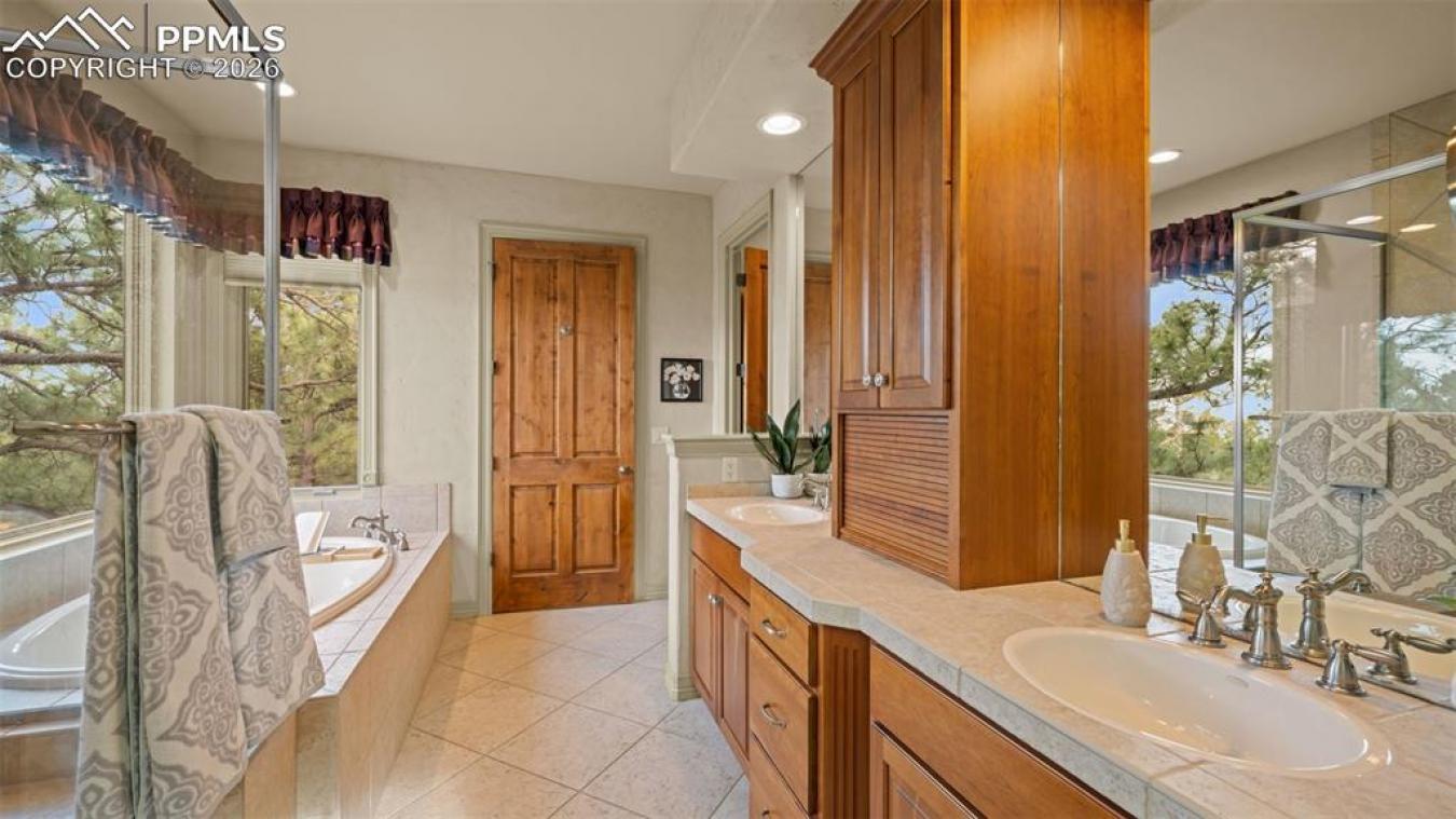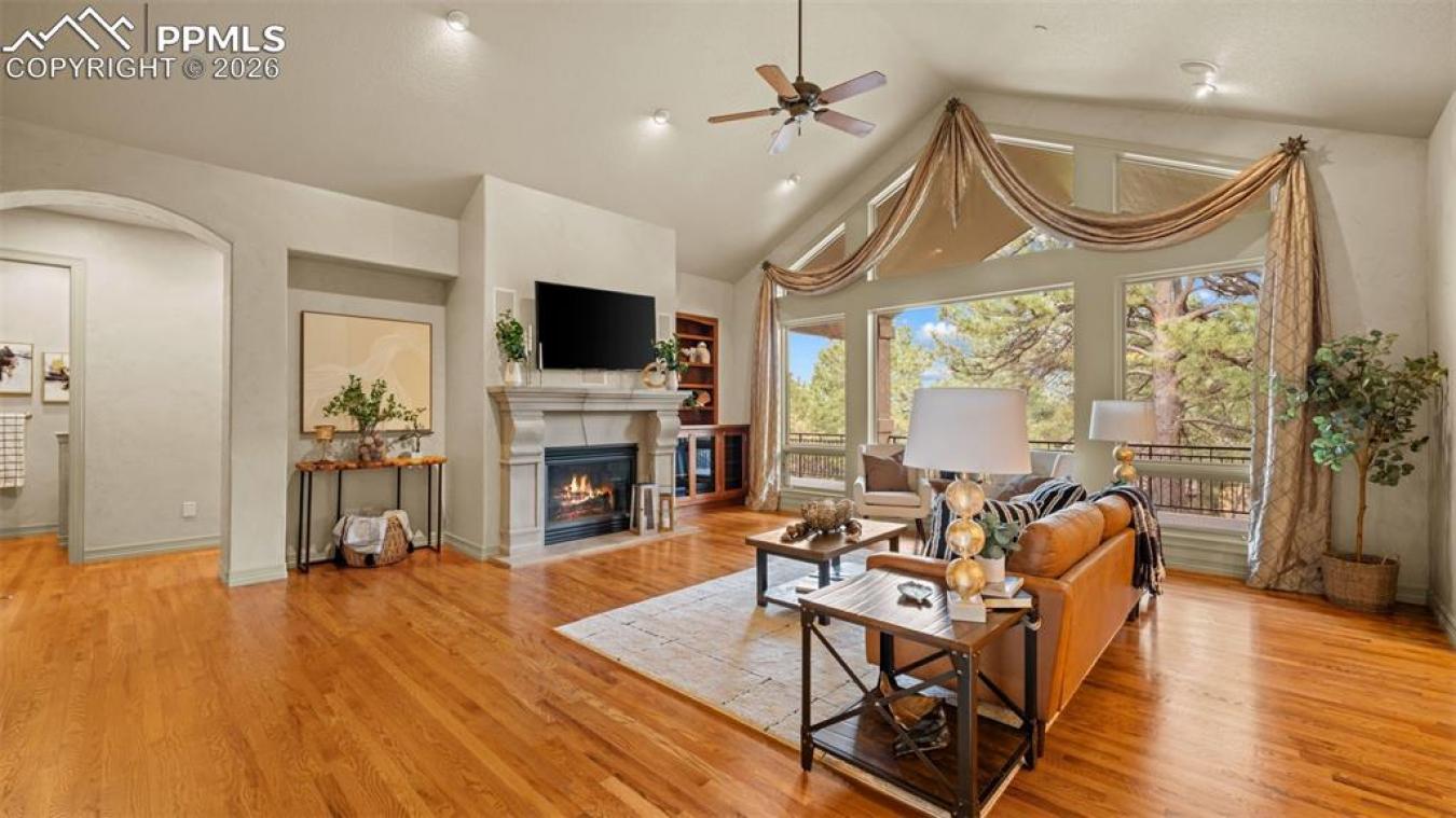 Nestled in the prestigious Stonecliff community, this exceptional ranch-style home offers luxury living with breathtaking mountain and city views on a 0.63-acre lot. With over 4,400 finished square feet, this home features 4 bedrooms, 3 bathrooms, and a thoughtfully designed layout ideal for both everyday living and entertaining. The main level welcomes you with a spacious great room featuring vaulted ceilings, built-ins, and a gas fireplace, along with a formal dining area. The gourmet kitchen is the heart of the home, offering stone countertops, a large island, a breakfast bar, natural wood cabinetry, a Sub-Zero refrigerator, and a walk-in pantry. The primary suite provides a private retreat with a walk-in closet, sitting area, walk-out access, remote control blinds, and a luxurious 5-piece bath with a jetted tub, double vanity, and separate shower. A second main-level bedroom and convenient laundry room complete the main floor. The finished walk-out basement expands your living space with a large family room featuring a second fireplace, wet bar, and built-ins, along with two additional bedrooms, a full bath, a glass-enclosed sunroom, and a second living area or flex space-perfect for guests, entertaining, or multi-generational living. Outdoor living is just as impressive with a large composite and covered patio surrounded by mature landscaping and scenic views. Additional highlights include a 3-car oversized garage, radiant floor heating, central A/C, a sprinkler system, and a workshop area. Located within Cheyenne Mountain School District 12 and close to parks, trails, and The Broadmoor, this home offers an exceptional blend of space, views, and Colorado luxury living.