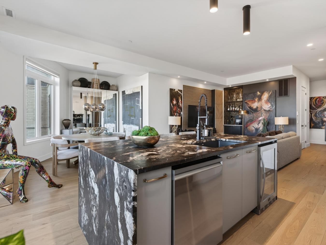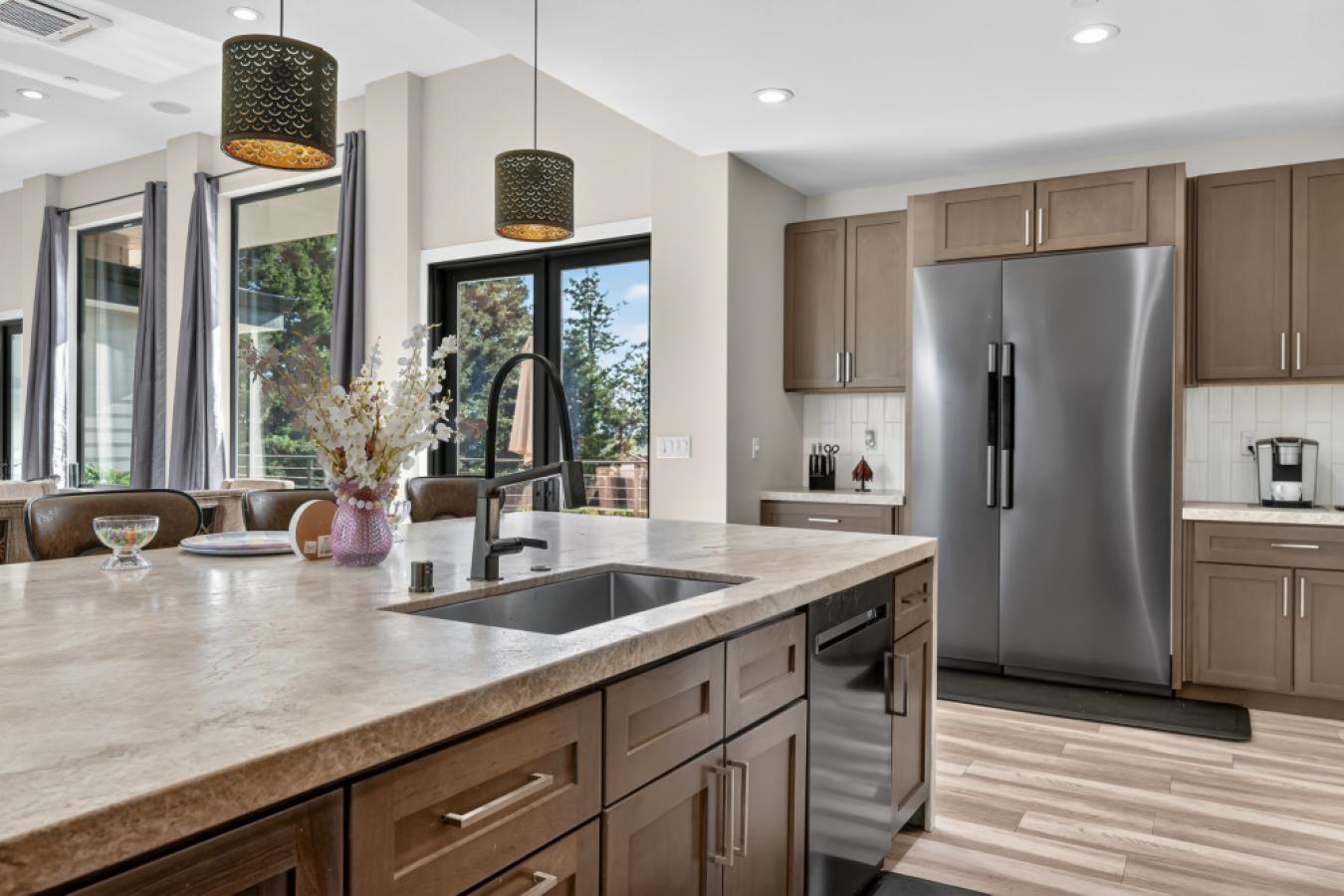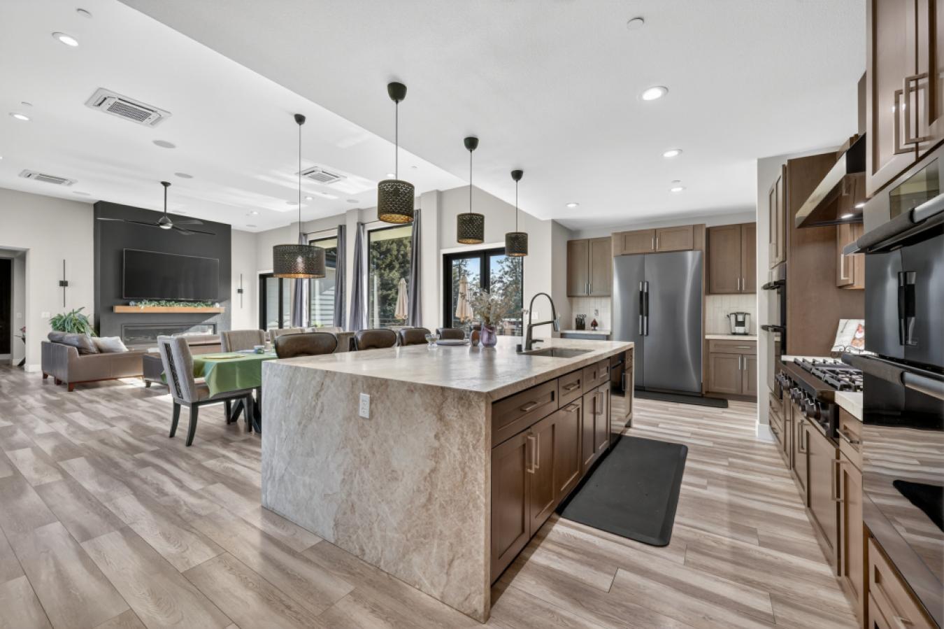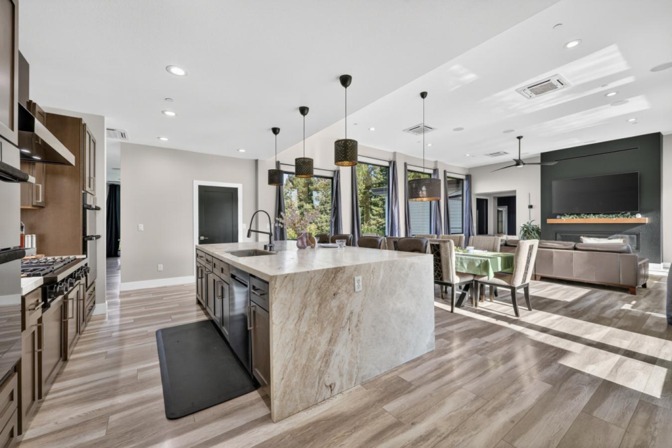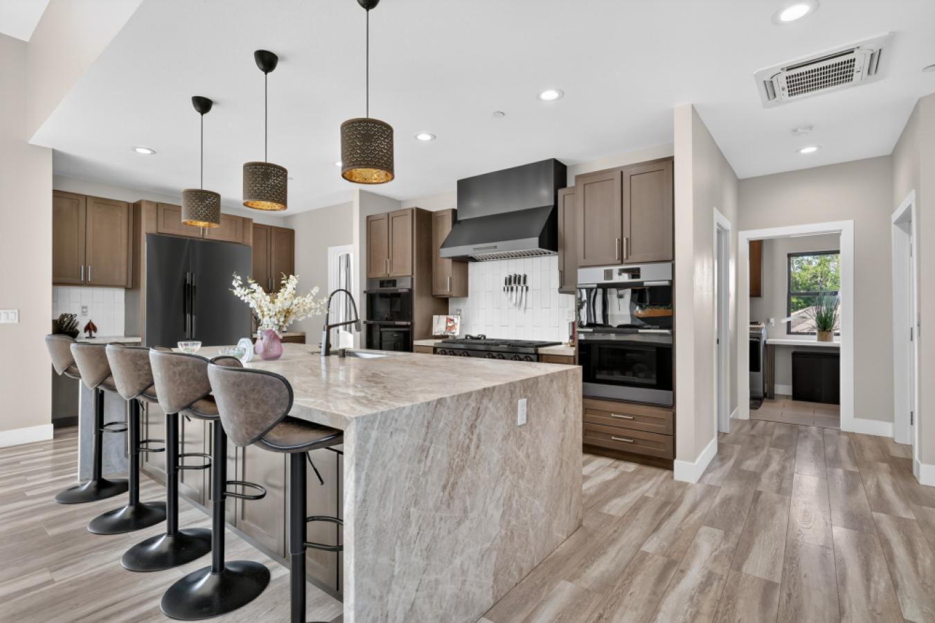 Step through the front door and you immediately feel this is a home where intention meets artistry. Sunlight pours through **Milgard Ultra Series windows**, dancing across carefully curated spaces, while a striking solid metal entry sets the tone for the craftsmanship found within. At the center of it all, the kitchen invites connection.