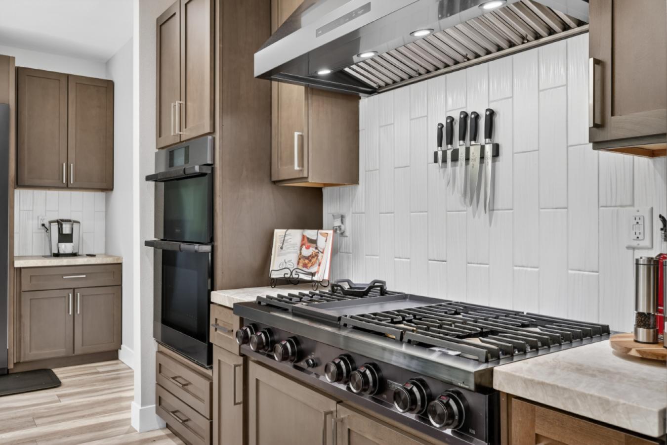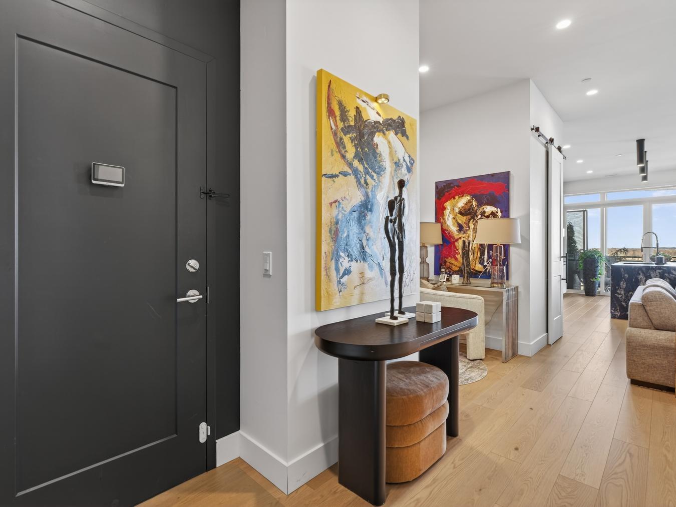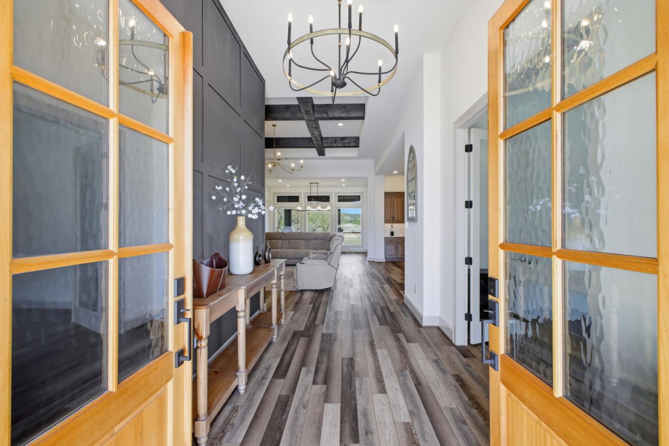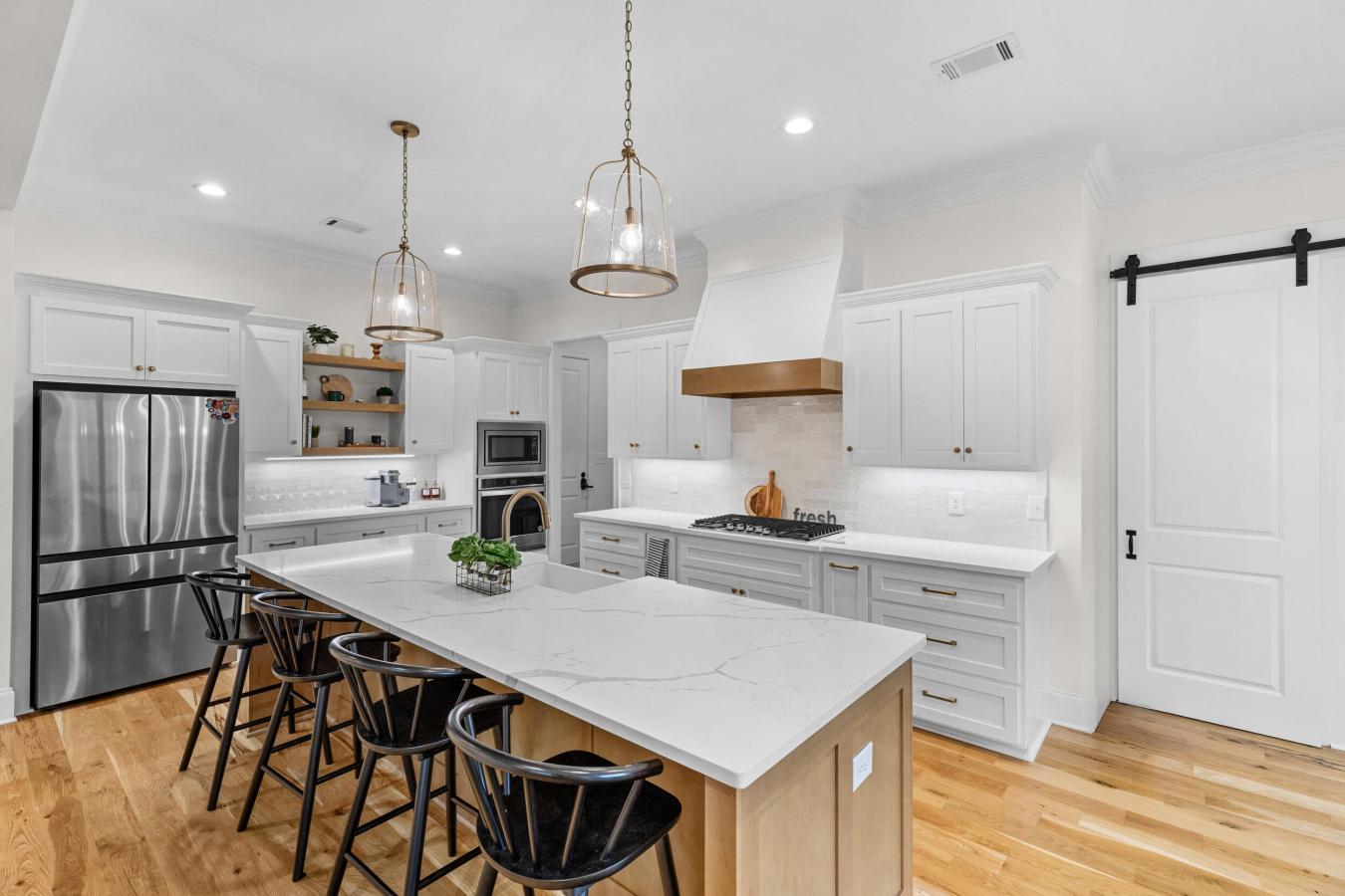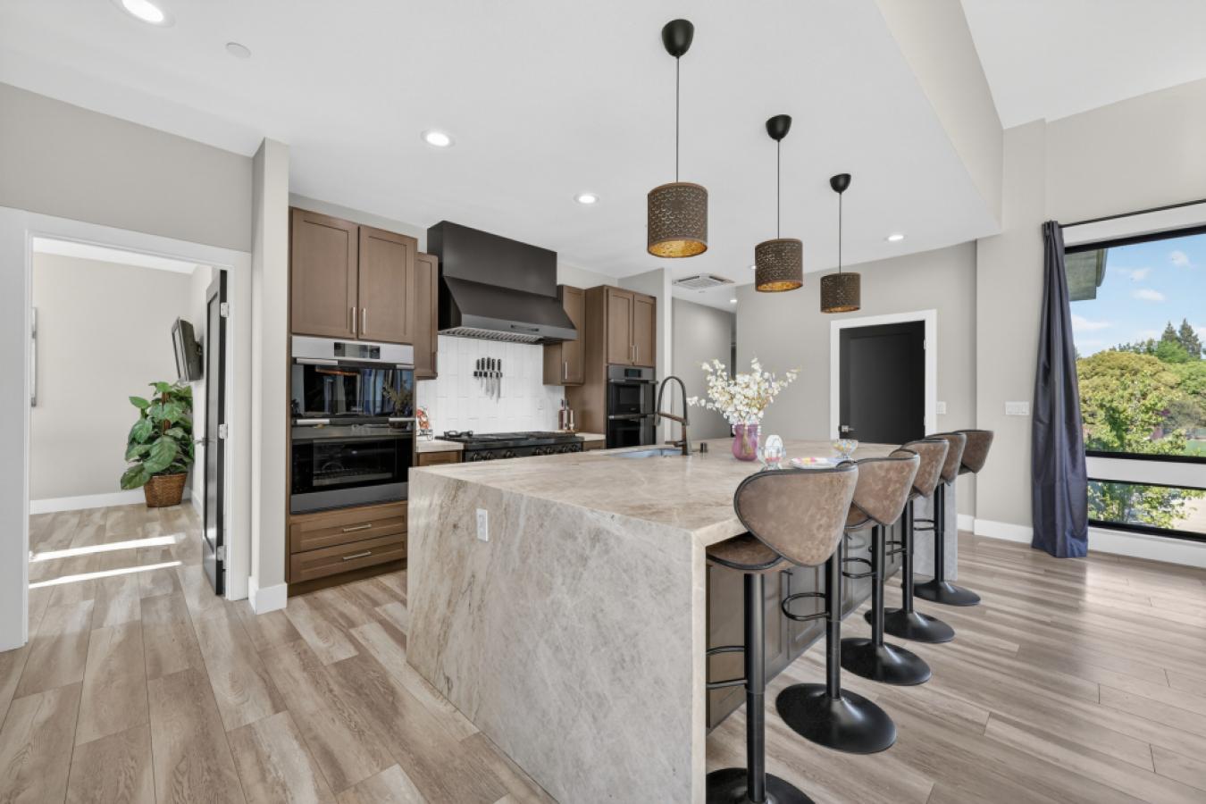 Step through the front door and you immediately feel this is a home where intention meets artistry. Sunlight pours through **Milgard Ultra Series windows**, dancing across carefully curated spaces, while a striking solid metal entry sets the tone for the craftsmanship found within. At the center of it all, the kitchen invites connection.