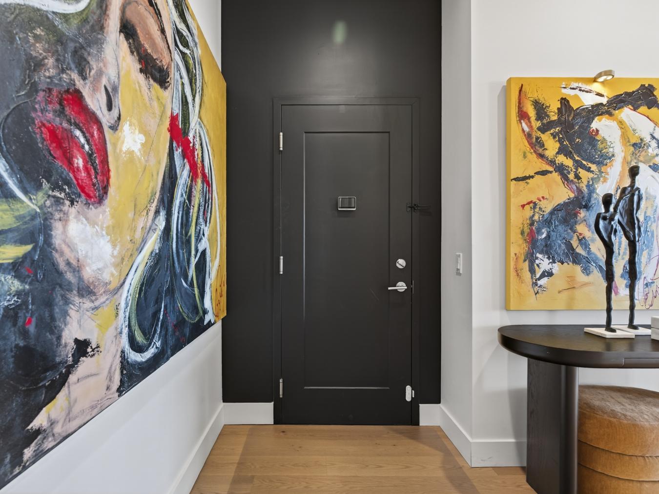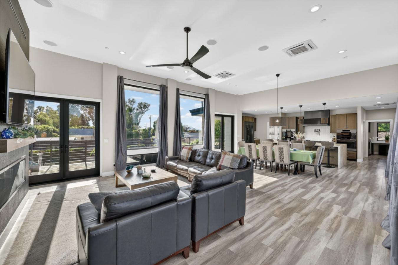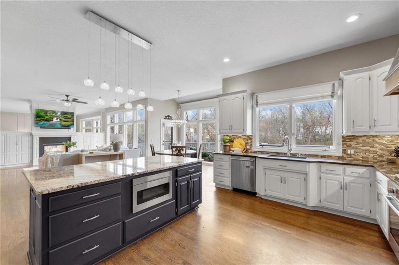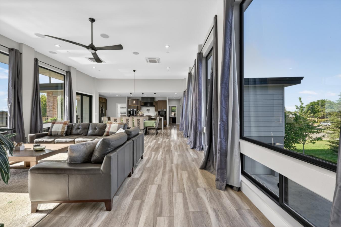 Step through the front door and you immediately feel this is a home where intention meets artistry. Sunlight pours through **Milgard Ultra Series windows**, dancing across carefully curated spaces, while a striking solid metal entry sets the tone for the craftsmanship found within. At the center of it all, the kitchen invites connection.