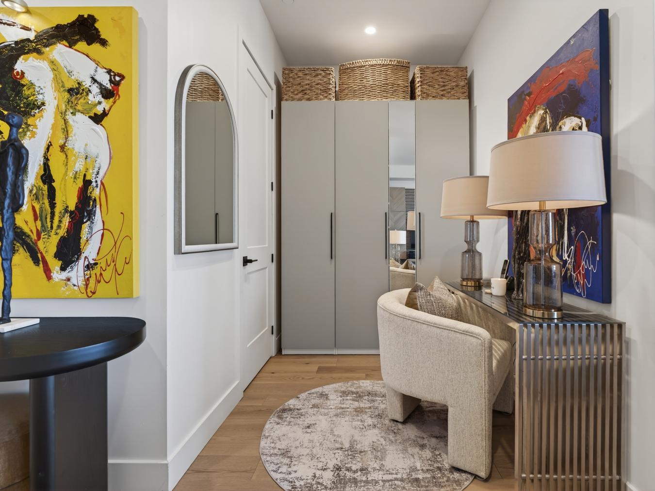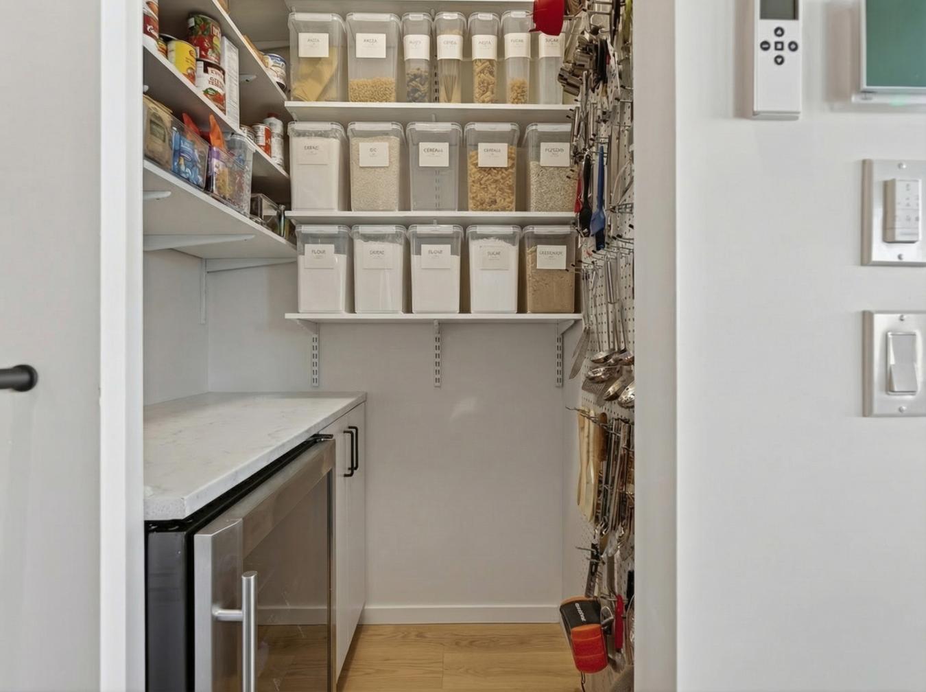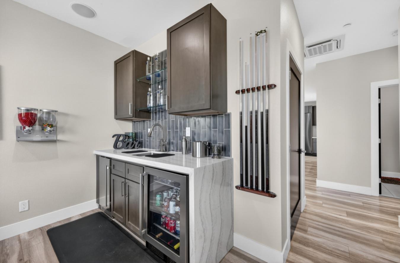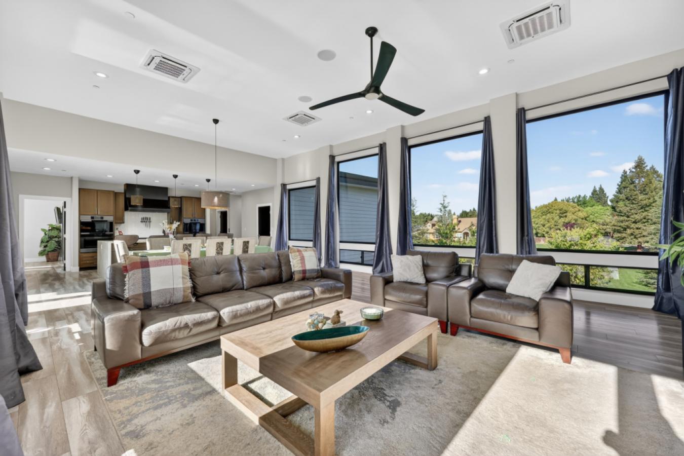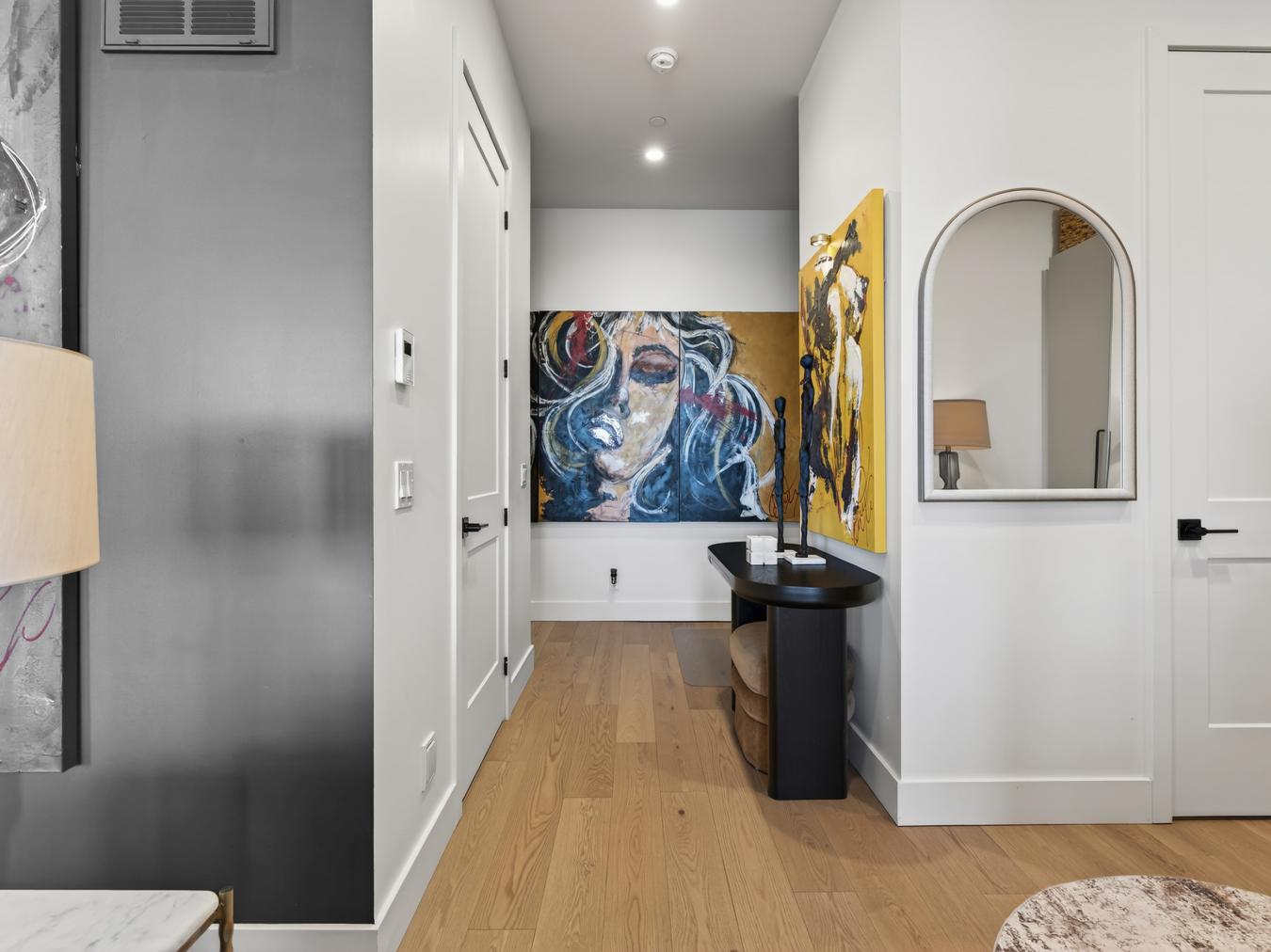 Step through the front door and you immediately feel this is a home where intention meets artistry. Sunlight pours through **Milgard Ultra Series windows**, dancing across carefully curated spaces, while a striking solid metal entry sets the tone for the craftsmanship found within. At the center of it all, the kitchen invites connection.