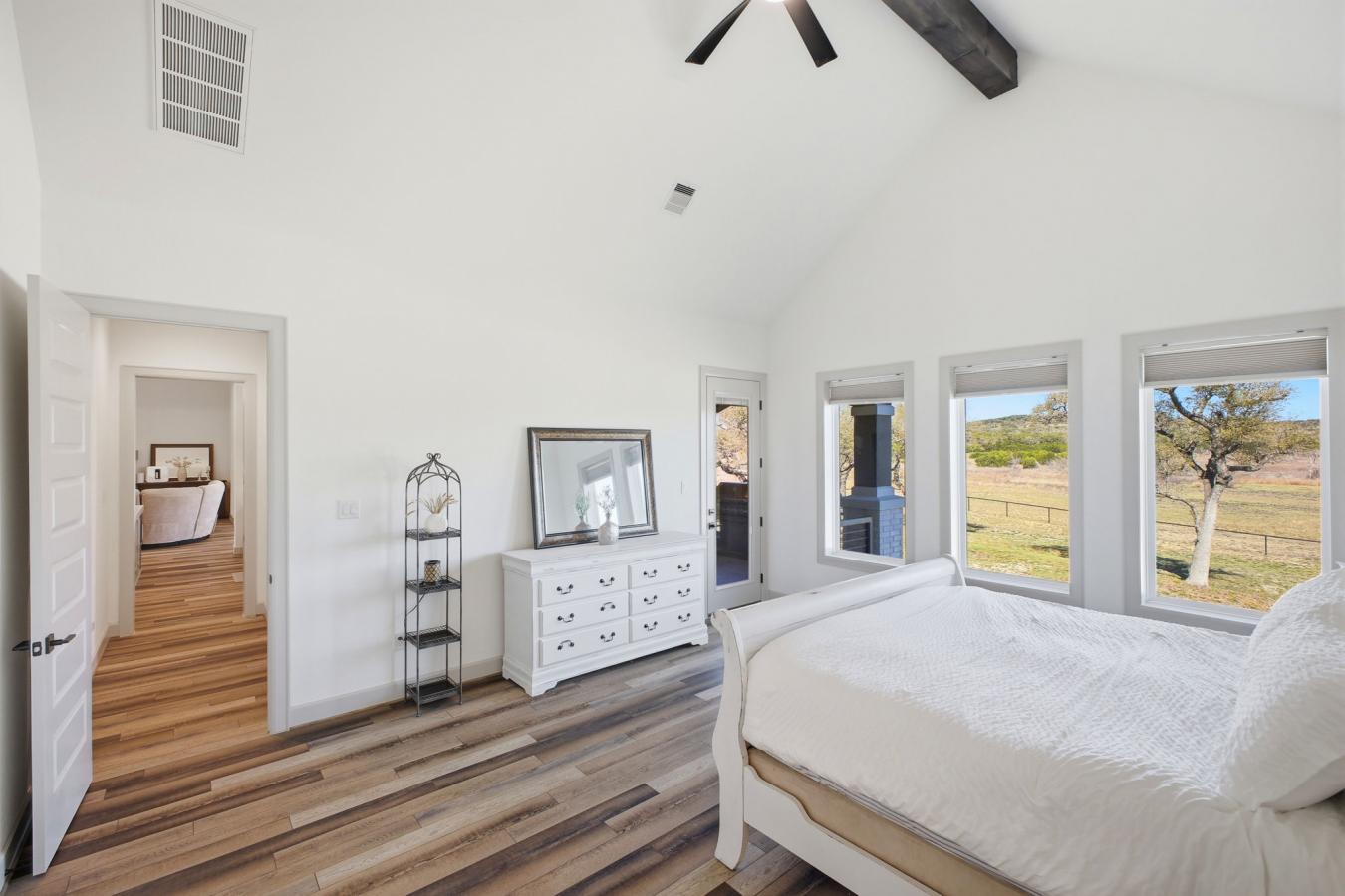 Luxury Hill Country home on 5 acres in Spring Branch, TX, with privacy and no rear neighbors. This 5-bedroom, 5.5-bathroom home offers 5,173 sq ft and includes two primary suites, one downstairs and one upstairs with a private balcony overlooking the backyard.