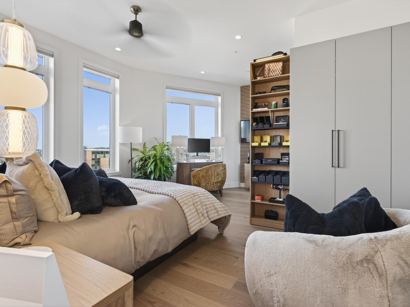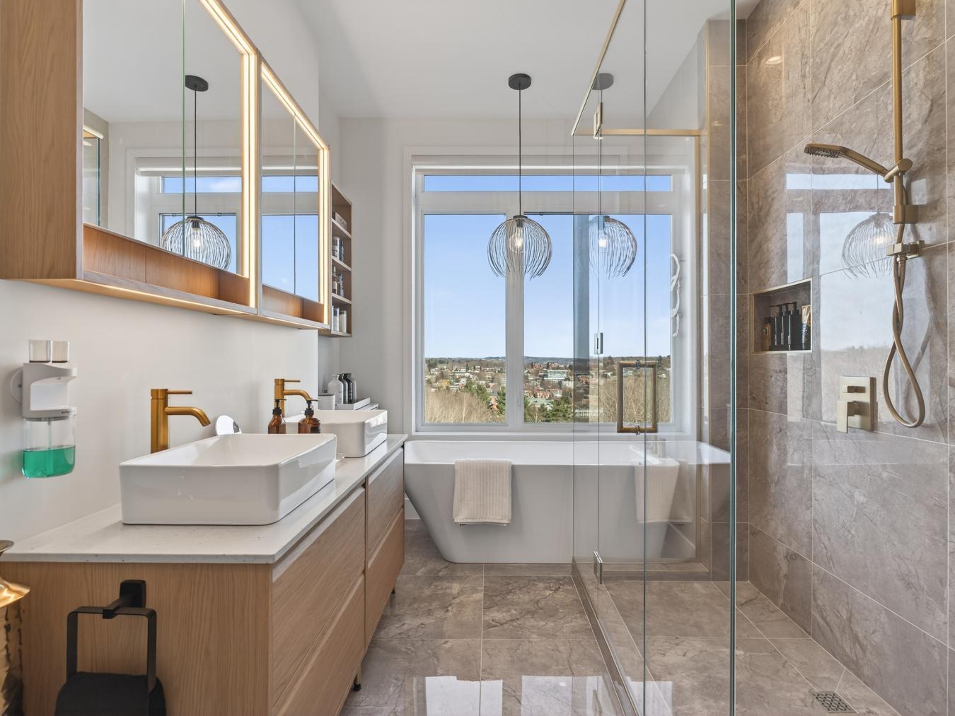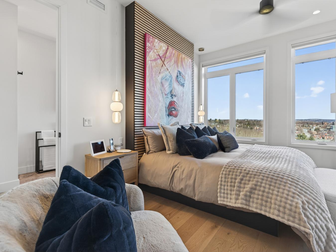 Designed from the ground up, this two-level condo offers an exceptional residential experience. Impressive volumes, premium materials, a spectacular kitchen, and a light-filled living area open onto a vast terrace with panoramic views of Sherbrooke. Upstairs, two refined bedrooms are arranged around an elegant bathroom, accessible from both sides, complemented by an adjacent laundry room designed for everyday convenience. A unique space where design, comfort, and aesthetics come together in perfect harmony.