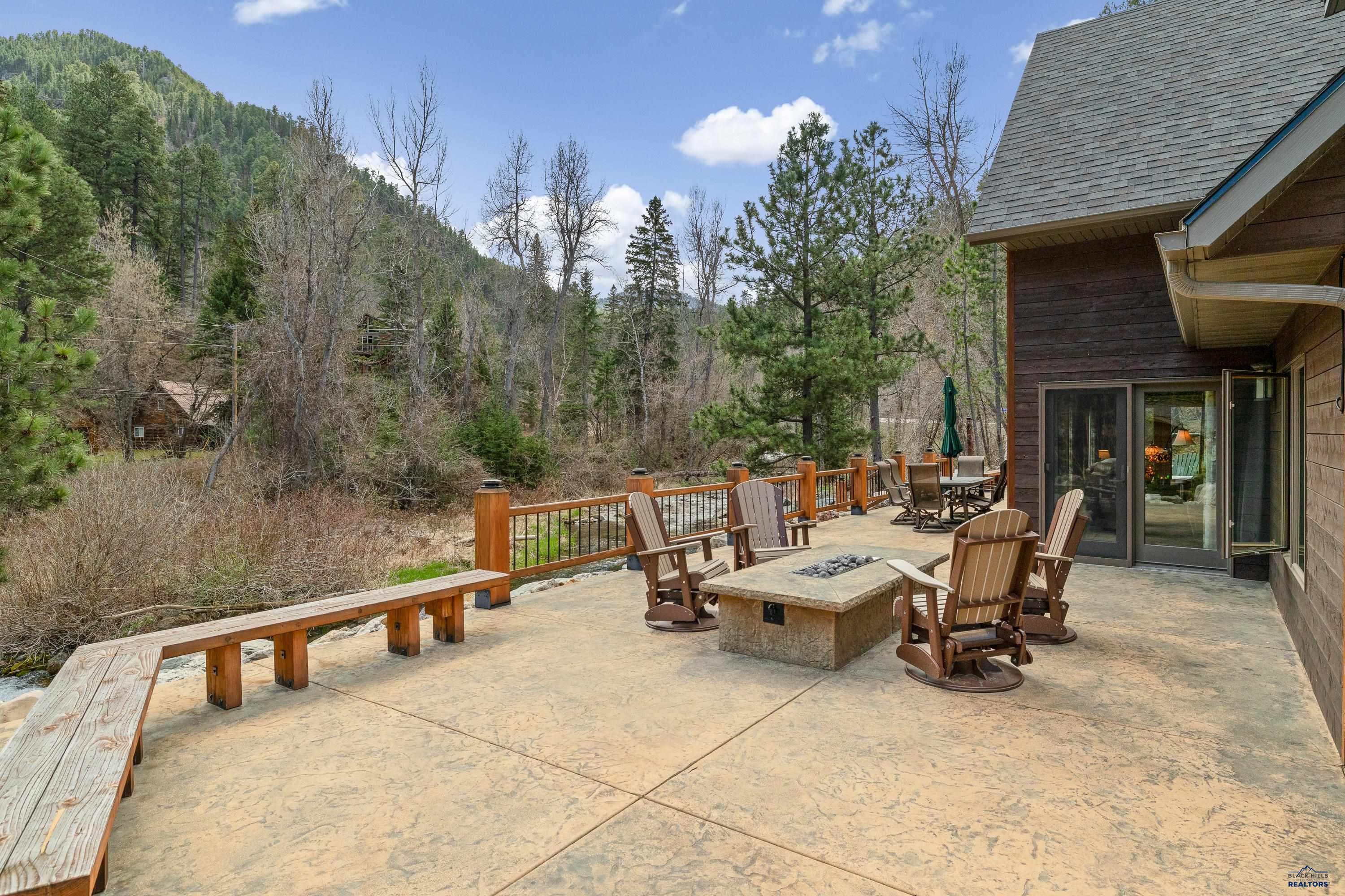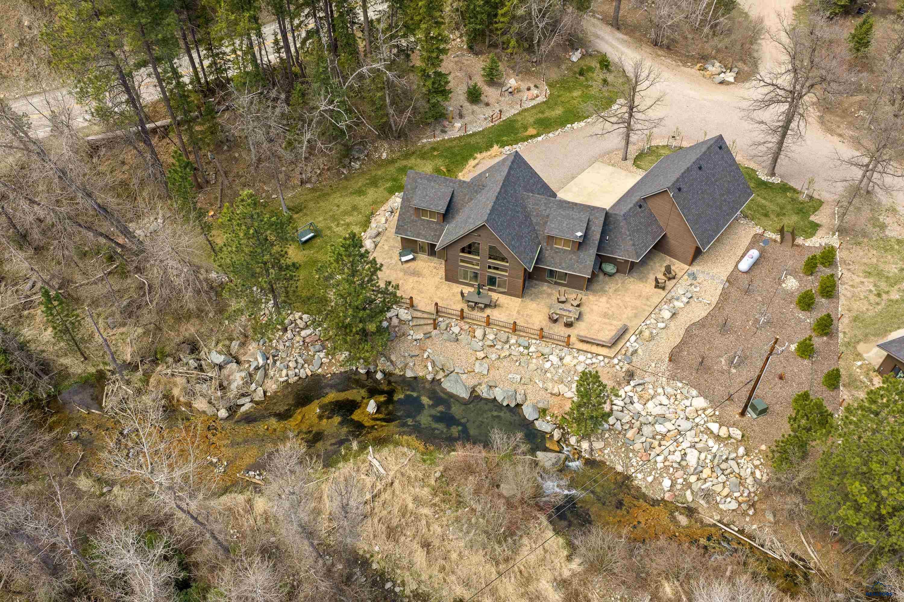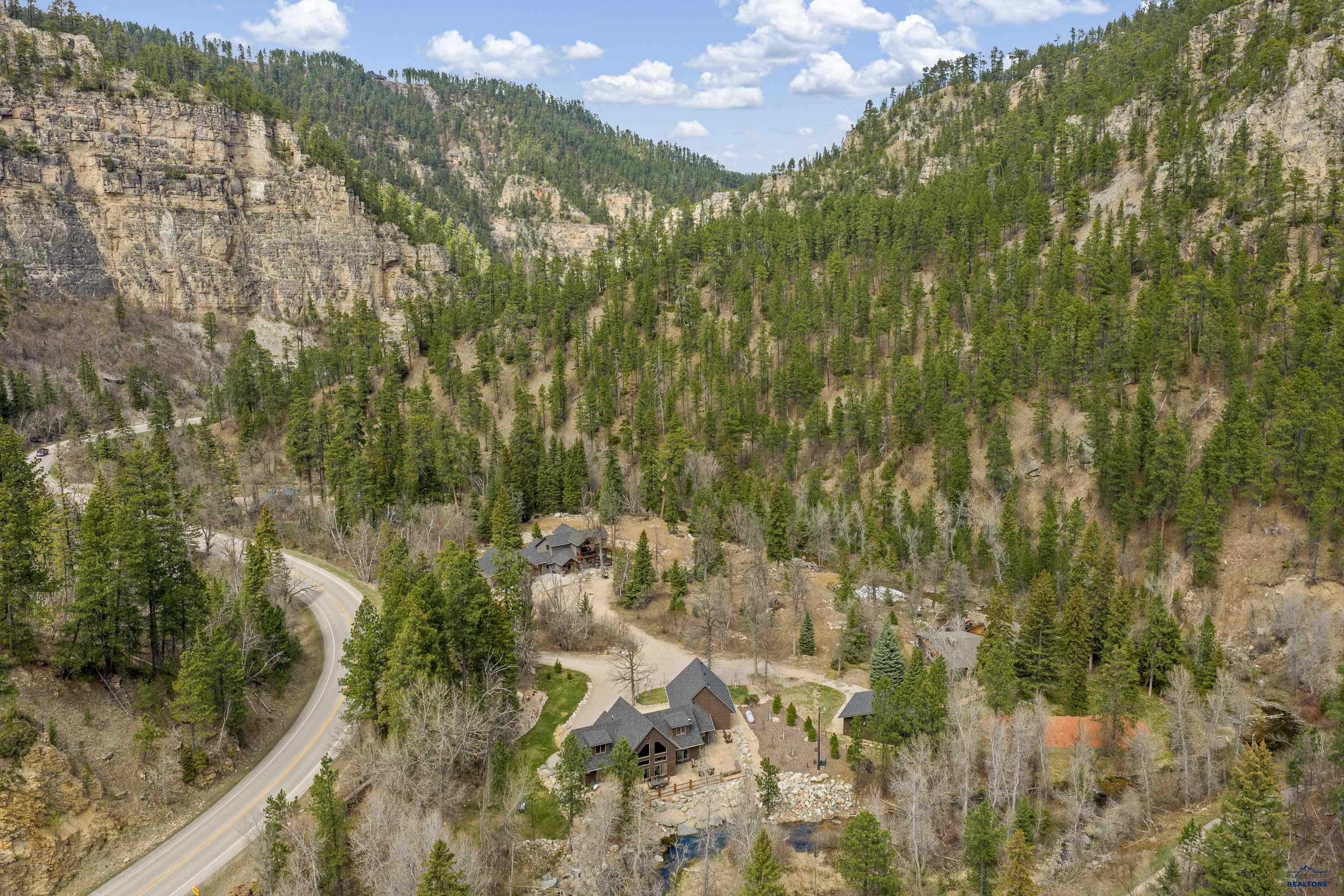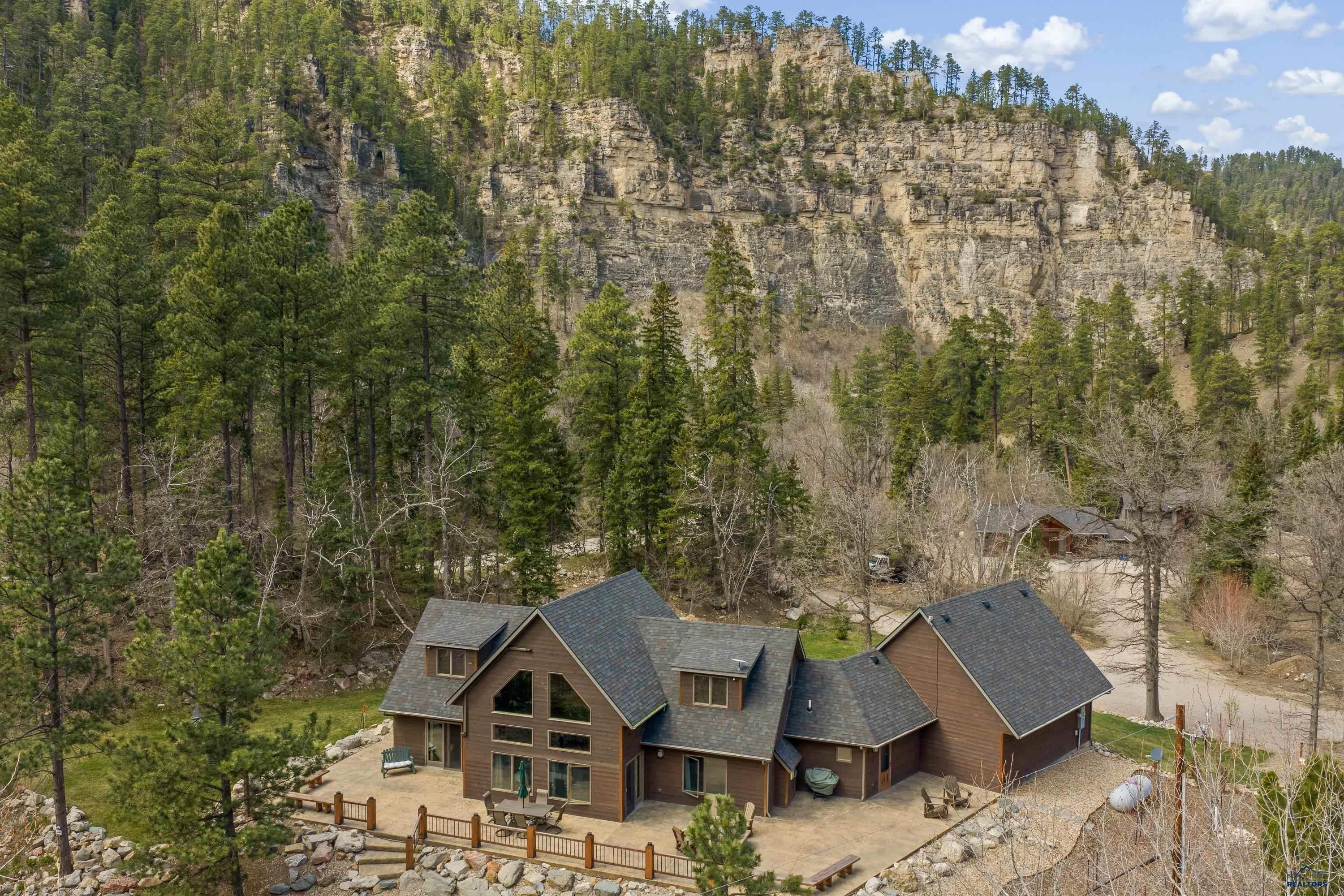 Absolute creekside perfection in Spearfish Canyon! These properties rarely become available and this is a true Black Hills treasure. This stunning and serene home offers peace and tranquility, yet has easy access to Spearfish which is just 5 minutes away. Rustic timber beams welcome you to the front porch. The soaring vaulted tongue and groove ceilings with its wall of windows perfectly frames the view of the canyon and creek. The master suite is located on the main floor and features a pellet stove, walk-in closet, jetted tub, and tile shower. Step onto the impressive patio areas from either the living room or the master bedroom and immerse yourself in the incredible beauty of Spearfish Canyon and Spearfish Creek. Just off the living room is the kitchen and dining area. The heated tile floors, cozy gas fireplace, gorgeous granite and tile backsplash, and built in desk area offers the perfect combination of function and beauty. The thoughtful layout offers two spacious bedrooms in the upper level, a full bathroom with heated tile floors, and plenty of storage closets. Access to the attached heated garage is through the spacious laundry room. There is a charming family room located above the garage. This property has maximized the beauty of the canyon with impressive landscaping and a built in firepit. This home was built with high quality materials and is in impeccable condition.