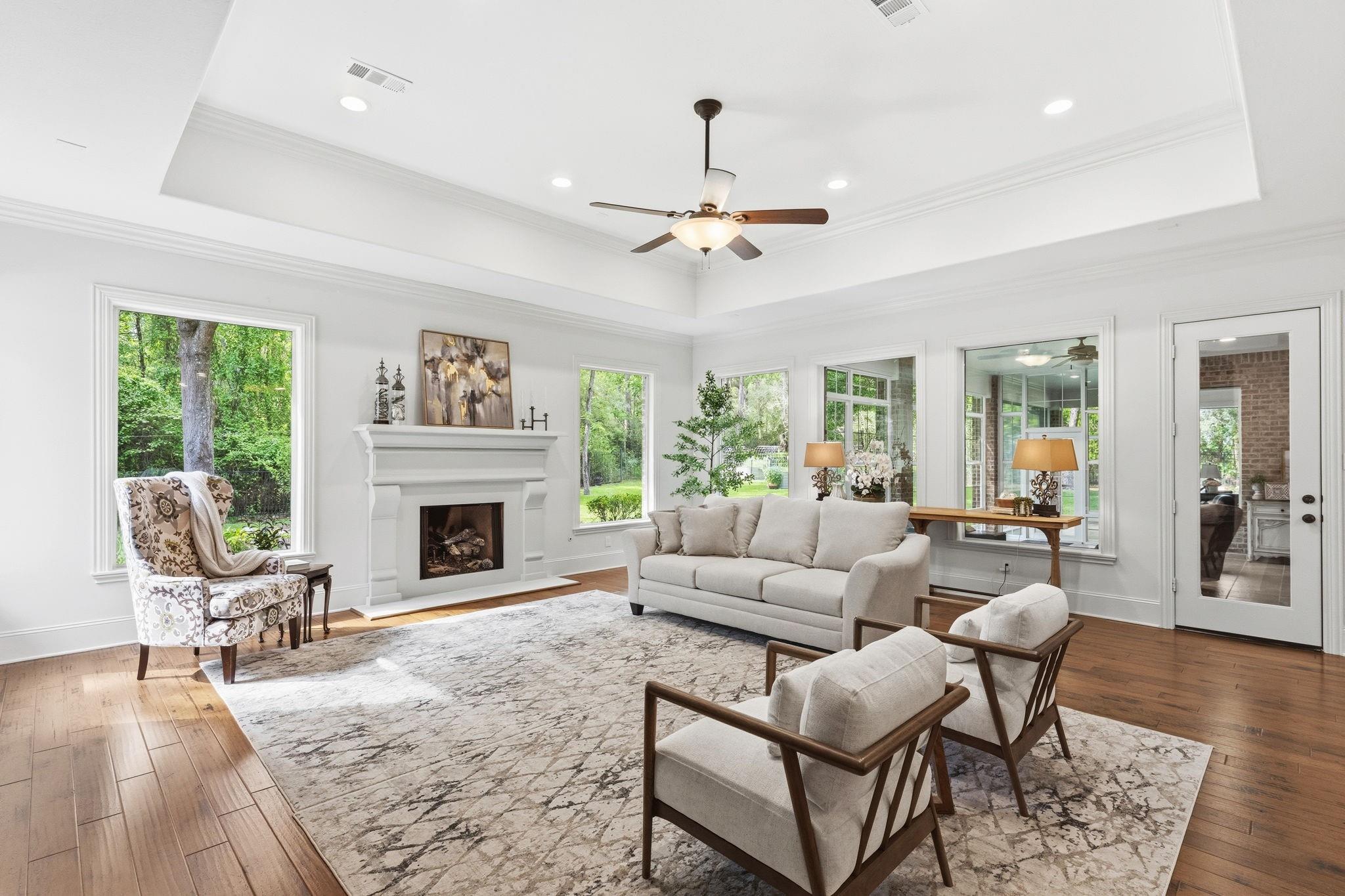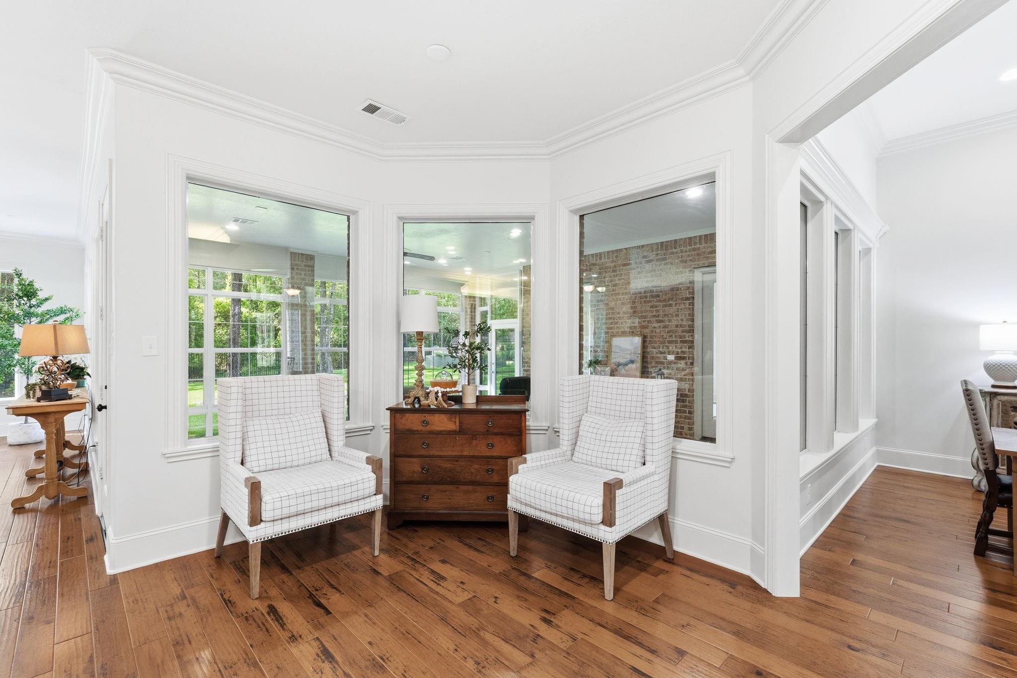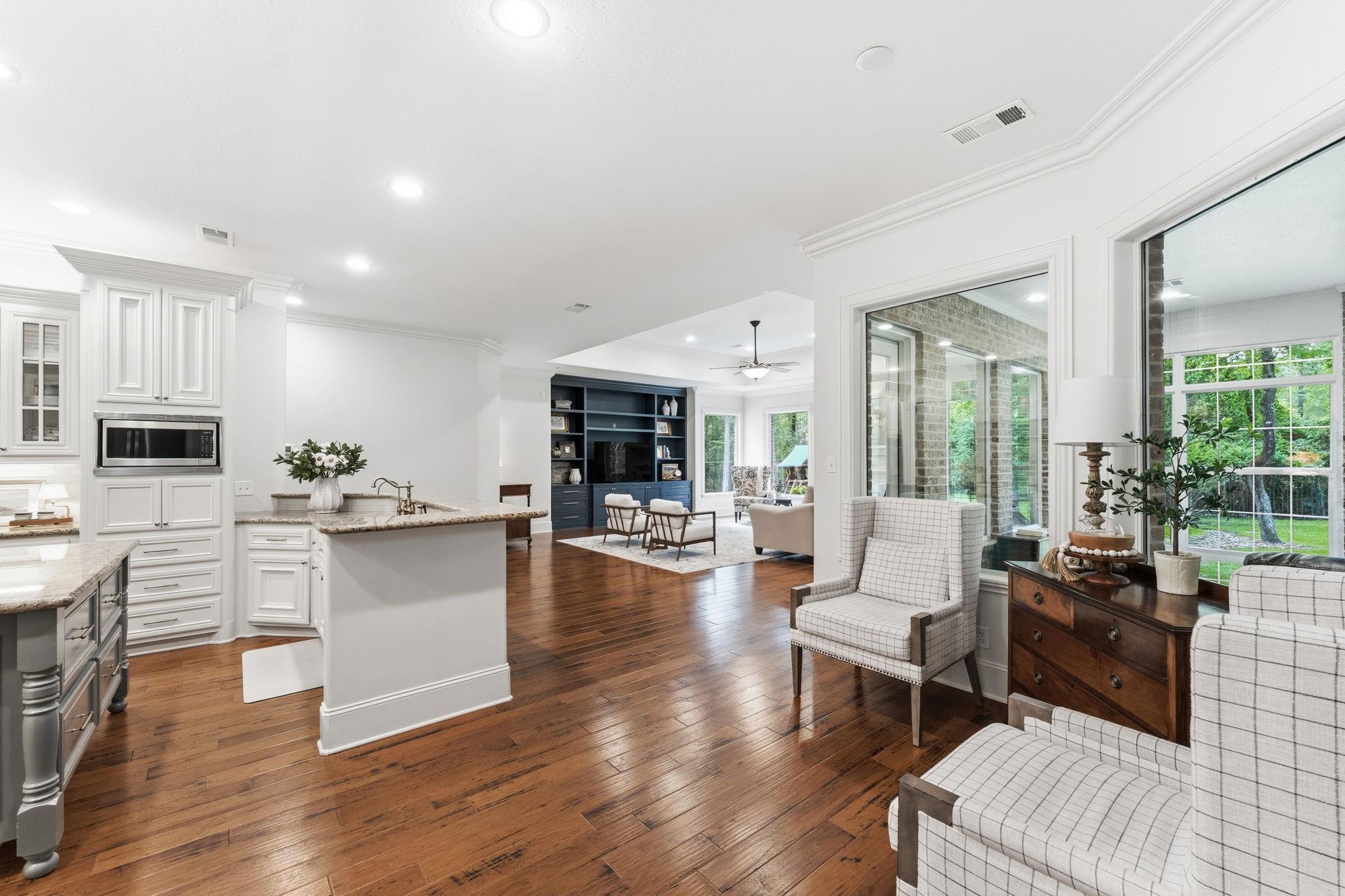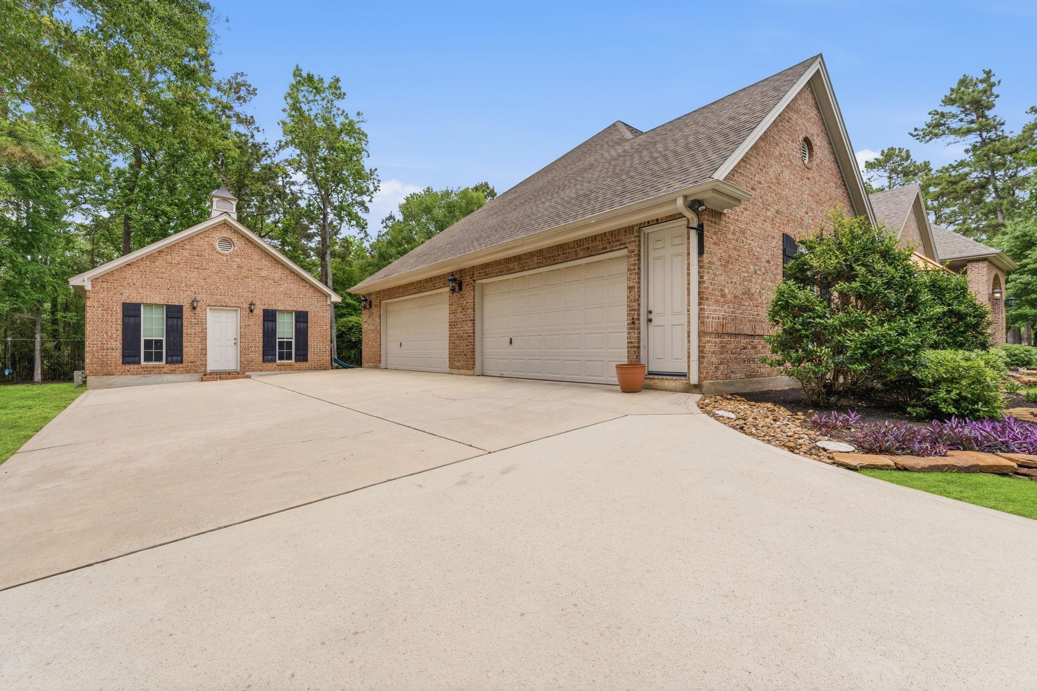 GORGEOUS sprawling 1-story situated on 2 beautiful acres, fully enclosed w/ a 6 ft wrought iron fence offering privacy & peace of mind w/no back neighbors! Step inside to find real wood floors, oversized windows, custom built ins, and a lay-out that flows effortlessly! The Kitchen opens to the Living & Dining areas--perfect for gathering & entertaining while Bedrooms & Living spaces remain spacious & airy. Natural light is beyond abundant throughout! Enjoy seeing the wildlife from your heated & cooled Sunroom (not included in SF) offering a serene space to relax & enjoy the views year-round. This home has been meticulously cared for & it shows! The Primary Suite is a true retreat w/ shiplap walls, a freestanding soaking tub & separate shower. Charming detached school house with its own mini-split provides flexibility for a creative studio, or easily converted into a guest house with the water well located just behind! Heated & cooled TX basement for maximum storage! DONT MISS IT!