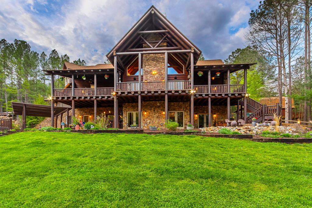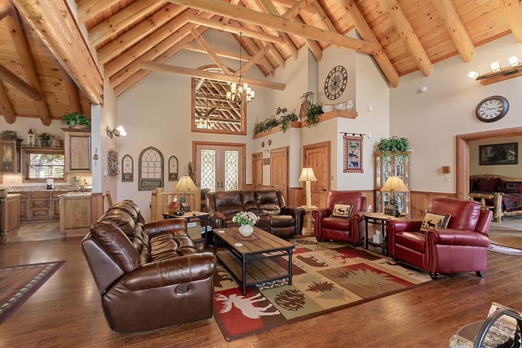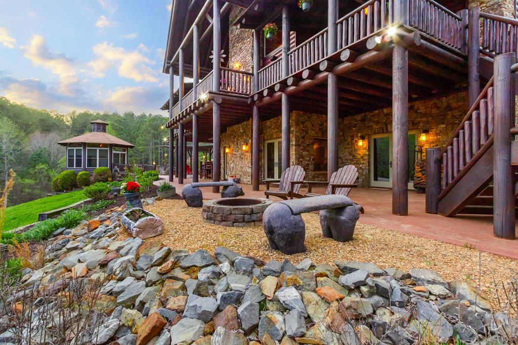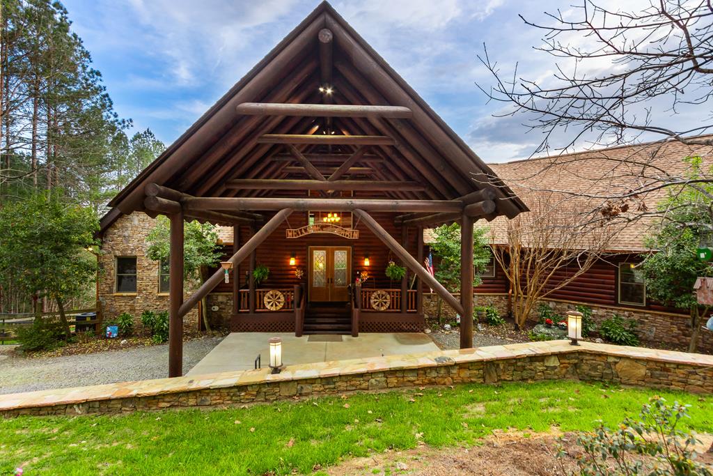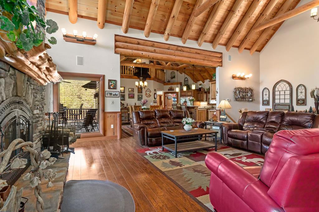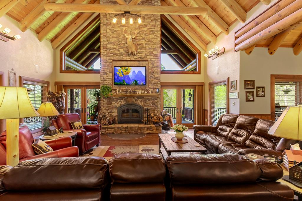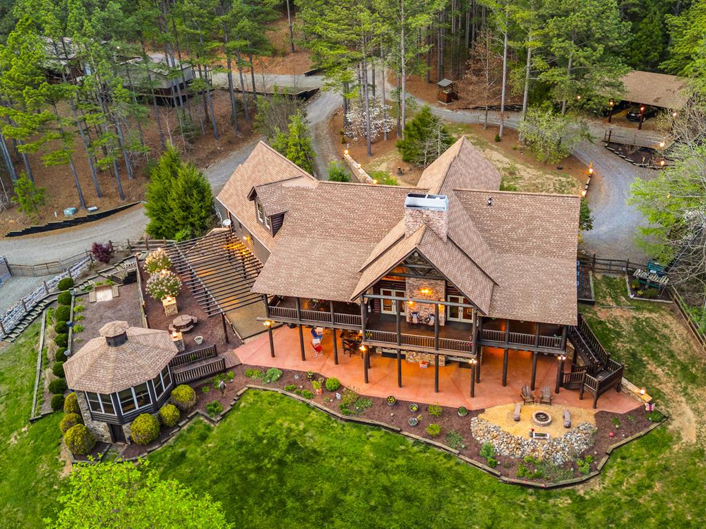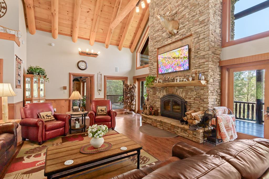 EXPERIENCE LUXURY MOUNTAIN ESTATE LIVING AT ITS FINEST on just over four private, wooded acres. This exceptional log and stone home blends rustic elegance with high-end custom craftsmanship, offering 4 bedrooms, 3 full bathrooms, 2 half bathrooms, and multiple versatile bonus rooms.From the moment you enter, youre greeted by soaring vaulted ceilings with exposed beams and impeccable attention to detail at every turn. The home features TWO stunning floor-to-ceiling stacked stone fireplaces, creating warm and inviting gathering spaces. A private elevator provides convenience across levels, while a dedicated media room and integrated security system add both comfort and peace of mind. Outdoors, the estate is thoughtfully equipped with an impressive array of outbuildings, including a highly customized two-story office ideal for remote work or creative pursuits, an RV carport complete with a dump station, a 2-bay garage, and an additional 3-bay garage offering abundant storage and workspace. A greenhouse, pump house, and a beautifully crafted log gazebo housing an 8-person hot tub further elevate the propertys appeal. In addition is a fully equipped outdoor kitchen, a cozy fire pit area, and a garden complete with planter boxes and mature fruit treesperfect for both relaxation and sustainable living. This remarkable estate offers too many features to fully capturecomprehensive documentation is available detailing the extensive upgrades and amenities. A rare opportunity to own a truly distinctive mountain retreat.