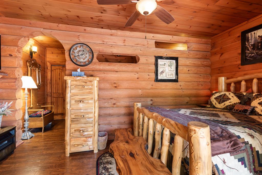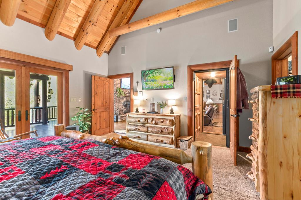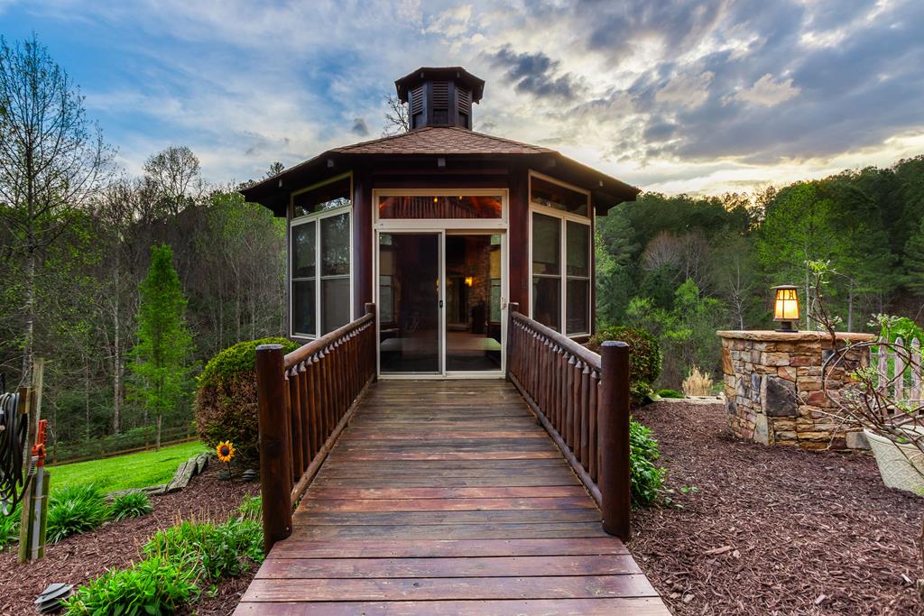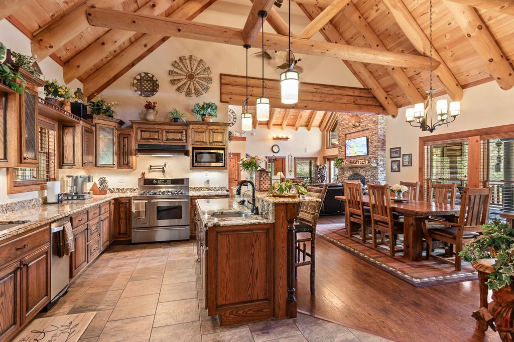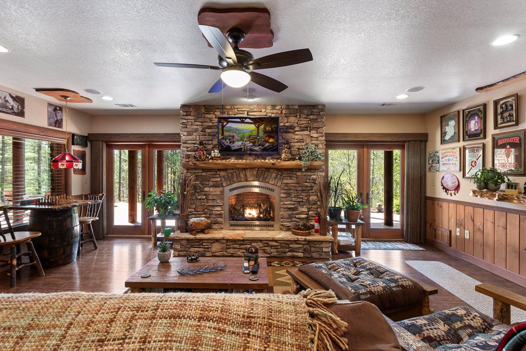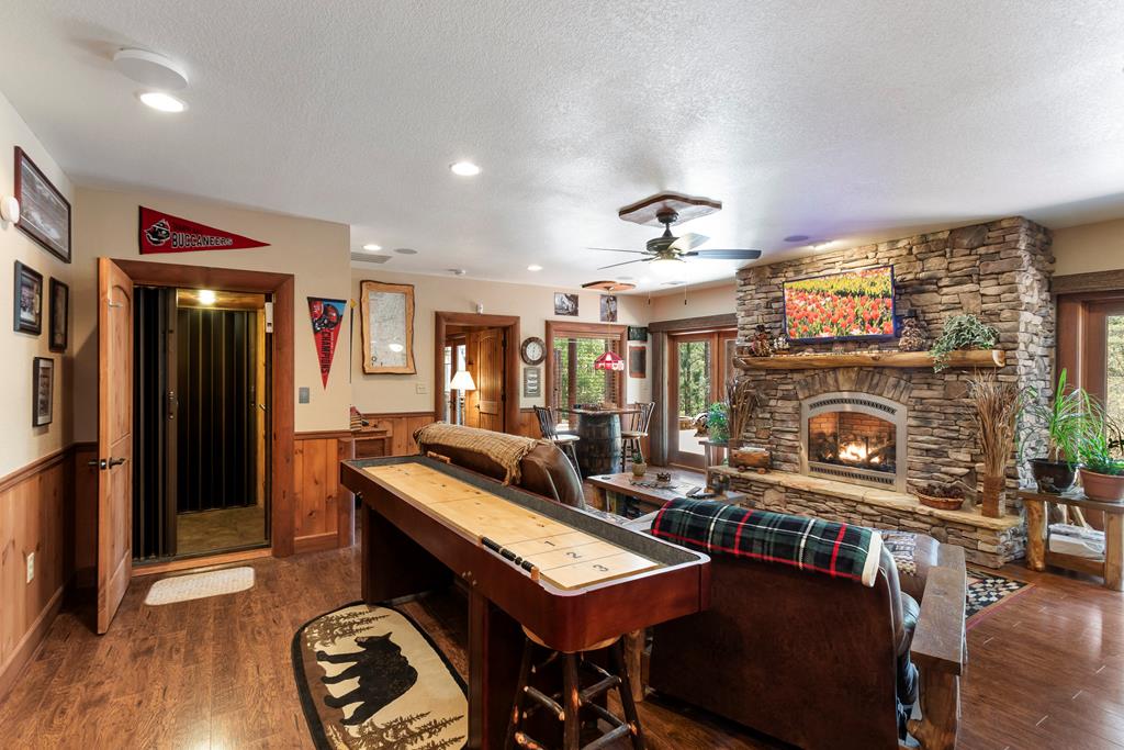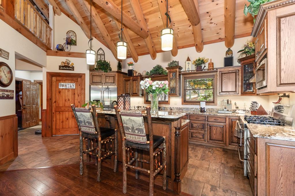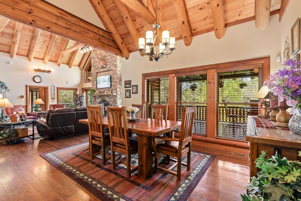 EXPERIENCE LUXURY MOUNTAIN ESTATE LIVING AT ITS FINEST on just over four private, wooded acres. This exceptional log and stone home blends rustic elegance with high-end custom craftsmanship, offering 4 bedrooms, 3 full bathrooms, 2 half bathrooms, and multiple versatile bonus rooms.From the moment you enter, youre greeted by soaring vaulted ceilings with exposed beams and impeccable attention to detail at every turn. The home features TWO stunning floor-to-ceiling stacked stone fireplaces, creating warm and inviting gathering spaces. A private elevator provides convenience across levels, while a dedicated media room and integrated security system add both comfort and peace of mind. Outdoors, the estate is thoughtfully equipped with an impressive array of outbuildings, including a highly customized two-story office ideal for remote work or creative pursuits, an RV carport complete with a dump station, a 2-bay garage, and an additional 3-bay garage offering abundant storage and workspace. A greenhouse, pump house, and a beautifully crafted log gazebo housing an 8-person hot tub further elevate the propertys appeal. In addition is a fully equipped outdoor kitchen, a cozy fire pit area, and a garden complete with planter boxes and mature fruit treesperfect for both relaxation and sustainable living. This remarkable estate offers too many features to fully capturecomprehensive documentation is available detailing the extensive upgrades and amenities. A rare opportunity to own a truly distinctive mountain retreat.