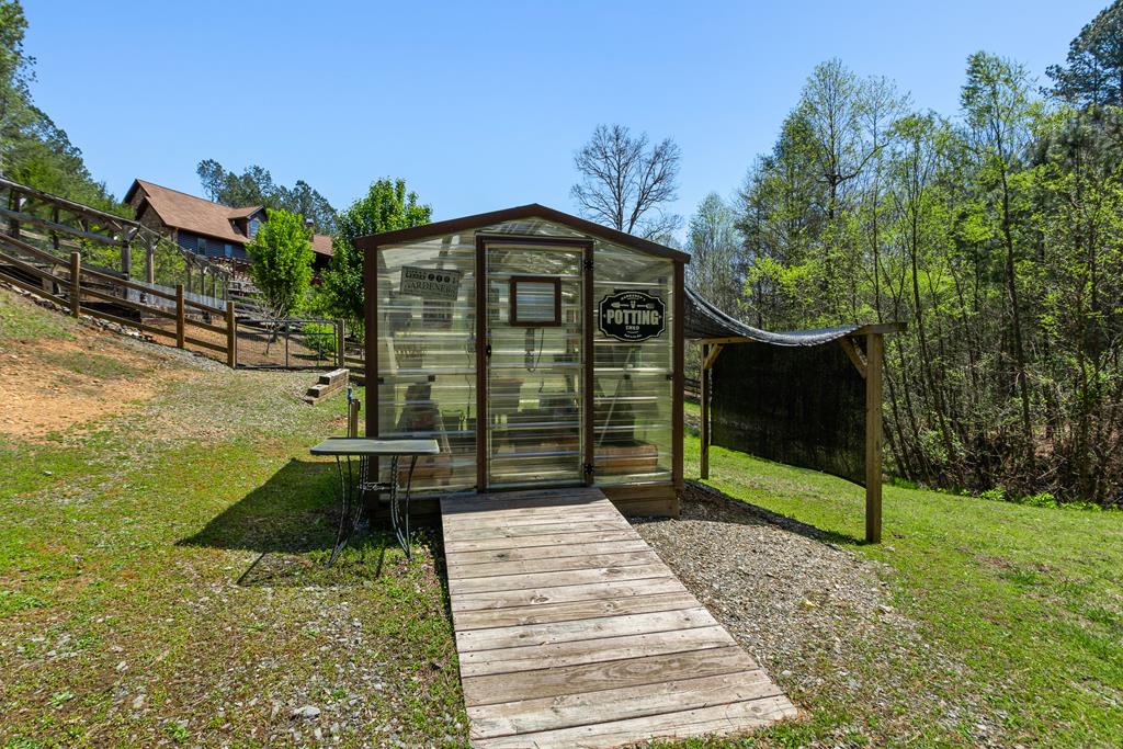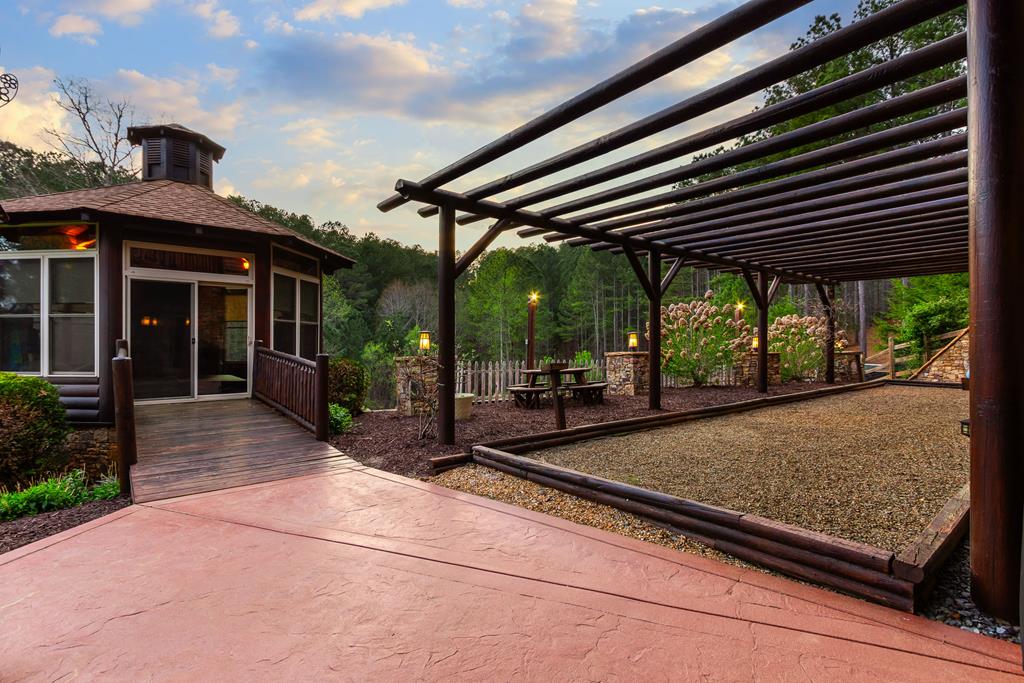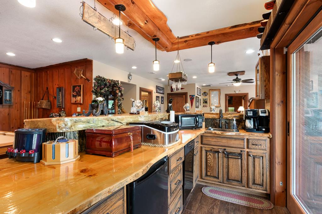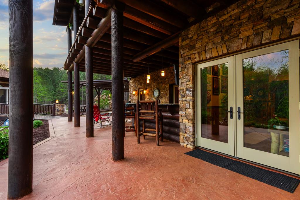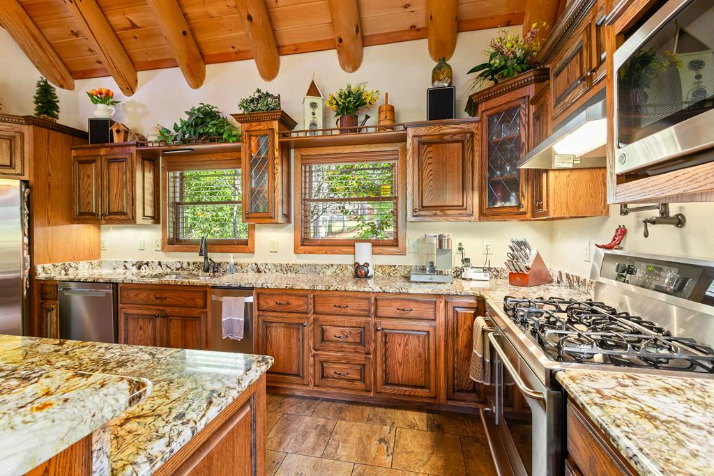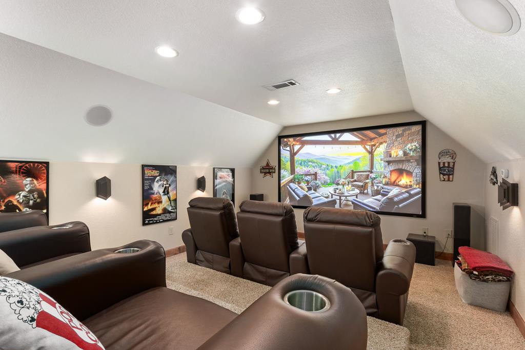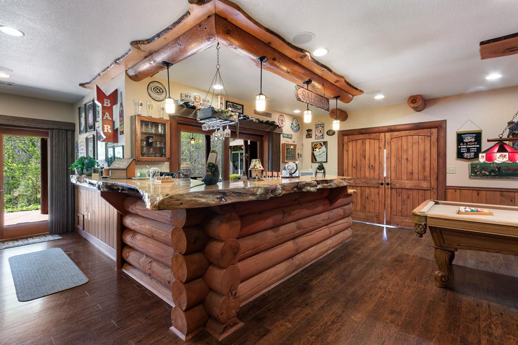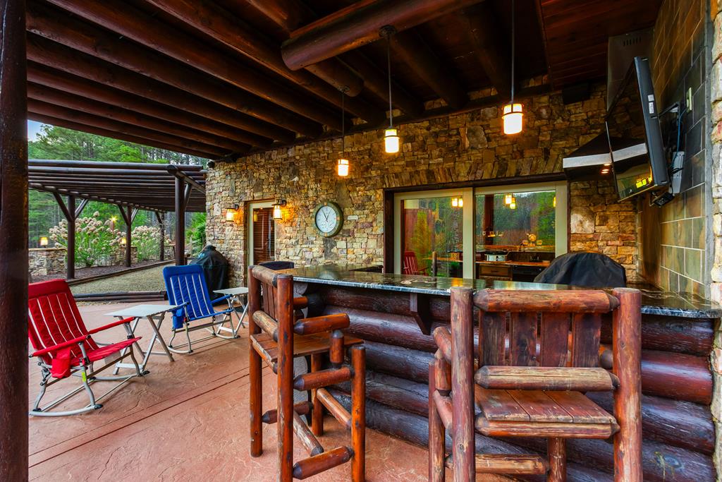 EXPERIENCE LUXURY MOUNTAIN ESTATE LIVING AT ITS FINEST on just over four private, wooded acres. This exceptional log and stone home blends rustic elegance with high-end custom craftsmanship, offering 4 bedrooms, 3 full bathrooms, 2 half bathrooms, and multiple versatile bonus rooms.From the moment you enter, youre greeted by soaring vaulted ceilings with exposed beams and impeccable attention to detail at every turn. The home features TWO stunning floor-to-ceiling stacked stone fireplaces, creating warm and inviting gathering spaces. A private elevator provides convenience across levels, while a dedicated media room and integrated security system add both comfort and peace of mind. Outdoors, the estate is thoughtfully equipped with an impressive array of outbuildings, including a highly customized two-story office ideal for remote work or creative pursuits, an RV carport complete with a dump station, a 2-bay garage, and an additional 3-bay garage offering abundant storage and workspace. A greenhouse, pump house, and a beautifully crafted log gazebo housing an 8-person hot tub further elevate the propertys appeal. In addition is a fully equipped outdoor kitchen, a cozy fire pit area, and a garden complete with planter boxes and mature fruit treesperfect for both relaxation and sustainable living. This remarkable estate offers too many features to fully capturecomprehensive documentation is available detailing the extensive upgrades and amenities. A rare opportunity to own a truly distinctive mountain retreat.
