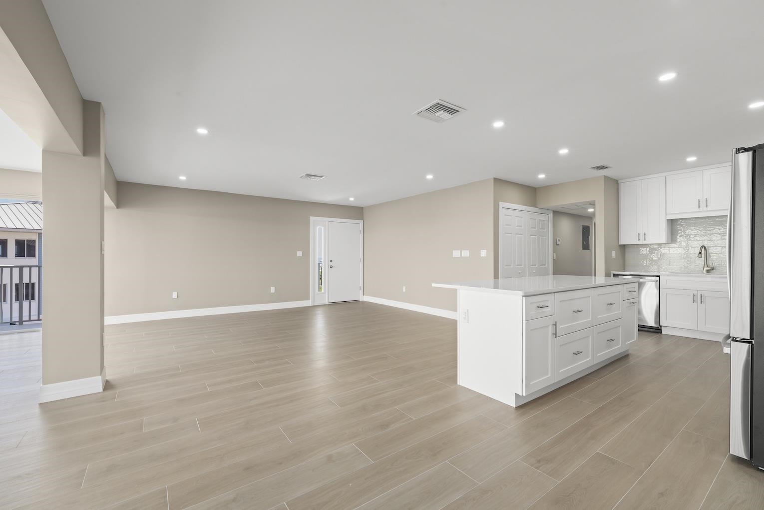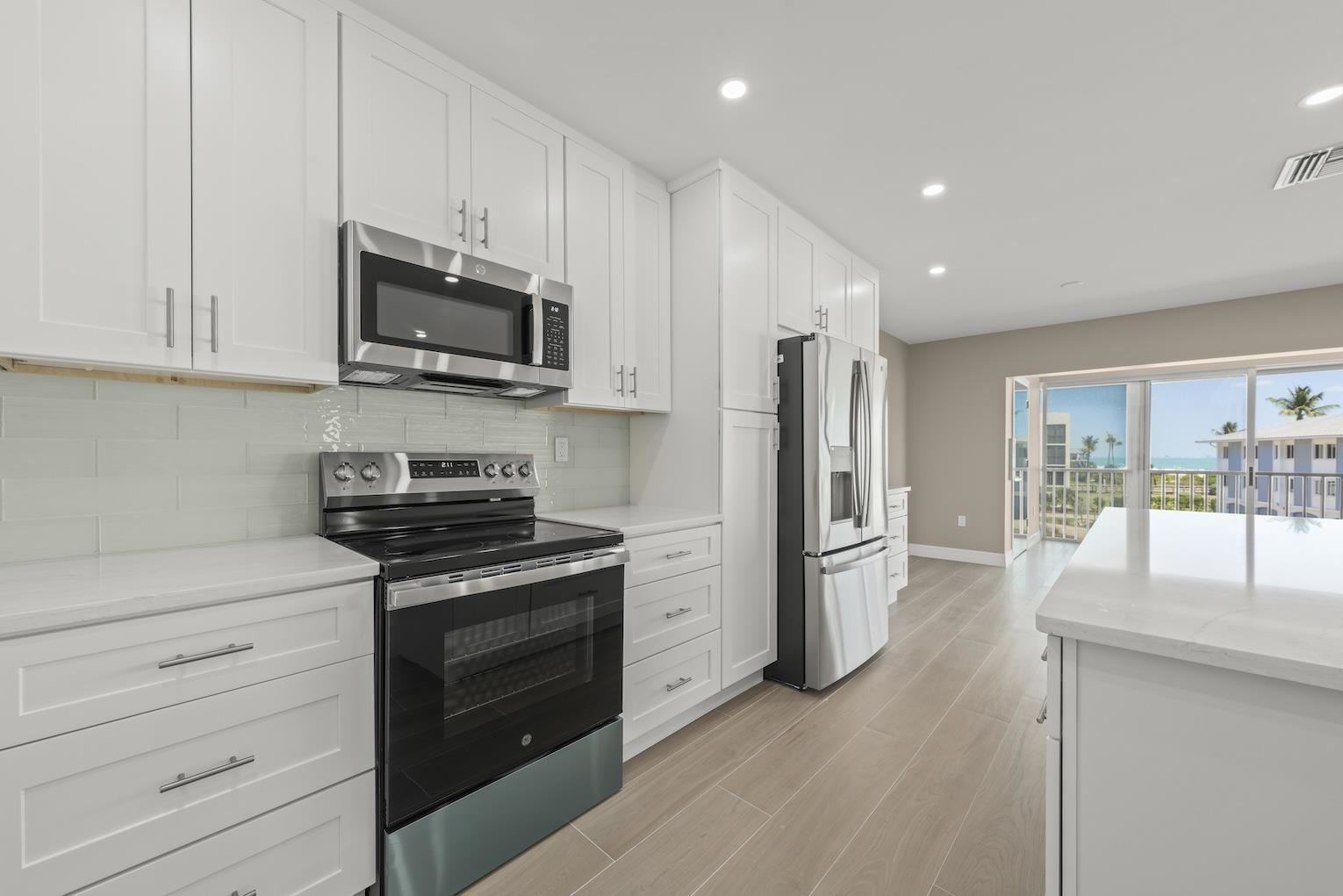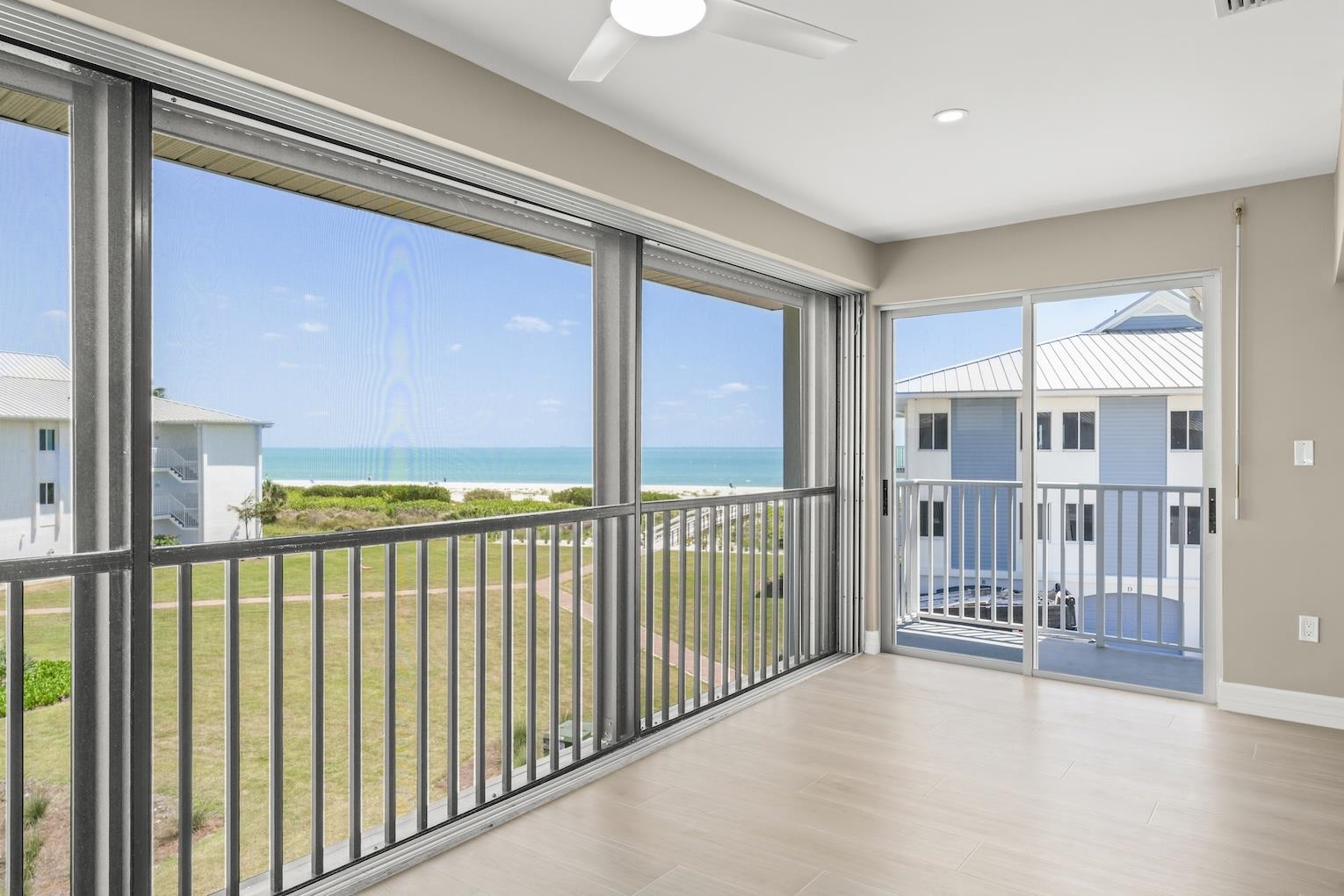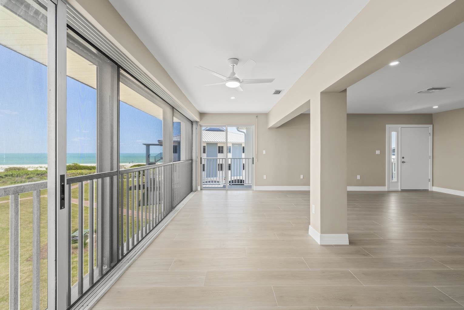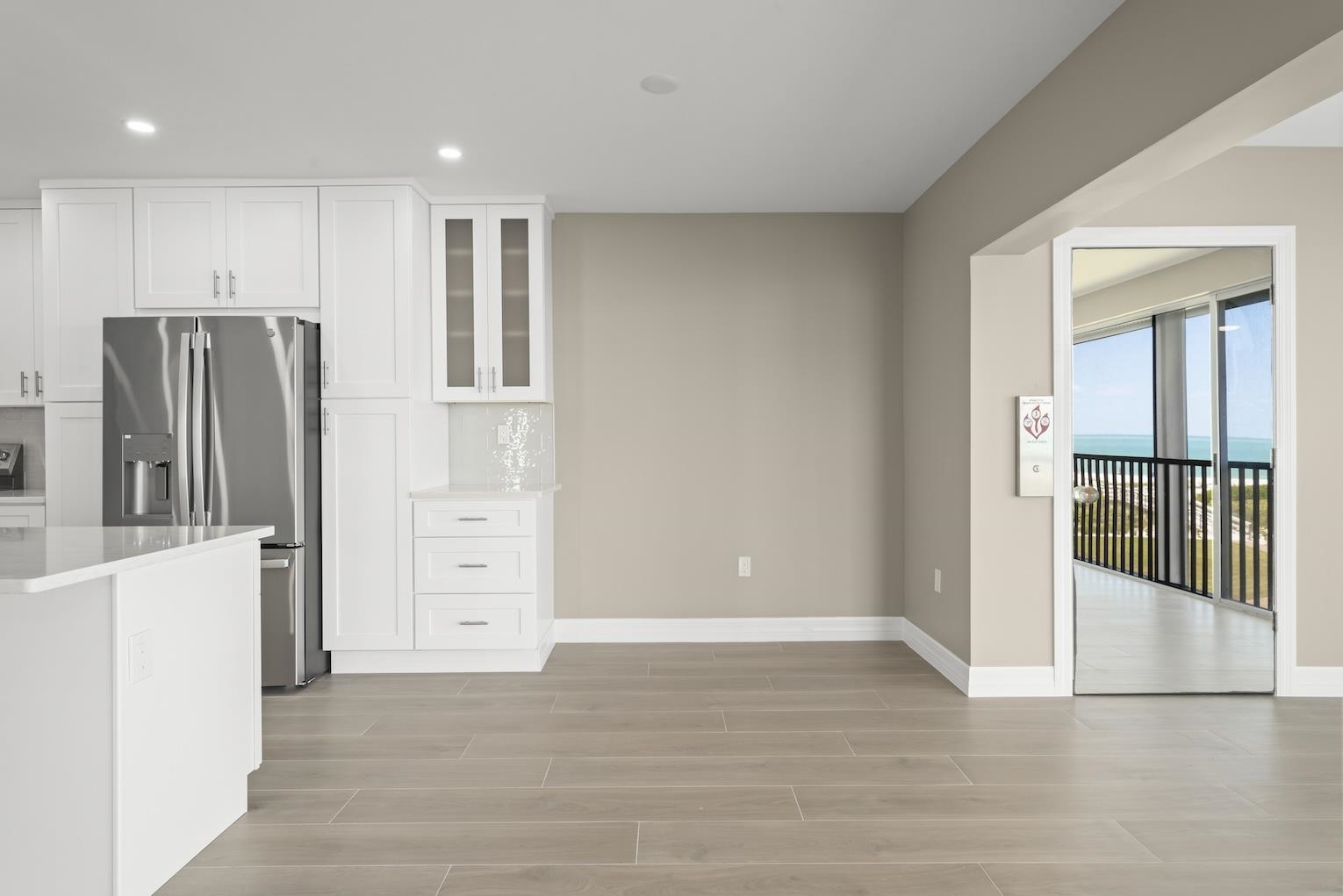Perched on the top floor in a desirable corner location, this beautifully remodeled residence at Sunset South offers sweeping gulf views, exceptional privacy, and effortless coastal elegance. Located in Building 14—one of only five buildings in the community with a private elevator—this rare feature provides direct home access from the ground-floor garage to your enclosed lanai, creating a seamless and exclusive arrival experience. Gorgeous Gulf views set the tone for this desirable two-bedroom, two-bath condominium, ideally positioned to capture stunning natural light, serene coastal vistas, and lush, manicured landscaping. The sweeping open floor plan is perfectly designed for relaxed everyday living and effortless entertaining. Open concept living, kitchen, and dining areas are filled with natural light and finished with wide ceramic plank flooring, and recessed lighting, creating a sophisticated atmosphere throughout. Walls of windows in the glass-enclosed lanai overlook the tranquil setting and the gulf, while pocketing sliding glass doors fully open the great room and kitchen to inviting sea breezes and panoramic views of the gulf. The reconfigured, high-end kitchen is both functional and striking, featuring quartz countertops, custom wood cabinetry with soft-close doors and drawers, a counter-height center island with seating for four, a dedicated coffee bar, stainless steel appliances, and a stunning crystal subway tile backsplash. Porcelain tile flooring, designed to resemble natural wood, runs seamlessly throughout the residence. The handsome primary suite offers a peaceful retreat with abundant natural light, Gulf views, and an oversized walk-in closet outfitted with a premium organizational system. The spa-inspired primary bath features dual quartz vanities and a tub and shower combination with multiple shower heads. The guest bedroom is equally inviting with multiple windows and a spacious custom closet, while the guest bath showcases a quartz-topped vanity, wood cabinetry, and an oversized walk-in shower with textured tile walls and a distinctive stone floor. Additional features include impact windows, a stack washer and dryer, a private enclosed garage with a large, private storage room with ample space for bikes and beach toys, and access to a beachside pool and clubhouse. Experience the best of Sanibel Island living—where miles of shell-strewn beaches, world-renowned shelling, and abundant wildlife create a true coastal sanctuary. This exceptional residence offers not just a home, but a lifestyle defined by tranquility, natural beauty, and refined island living.
